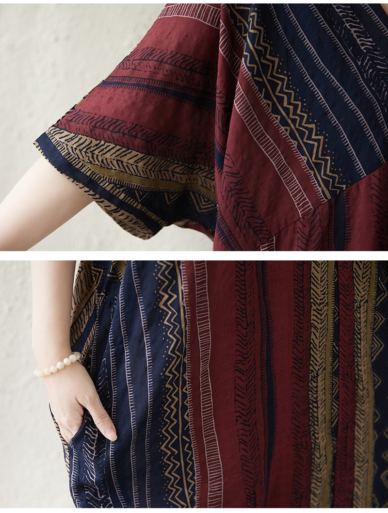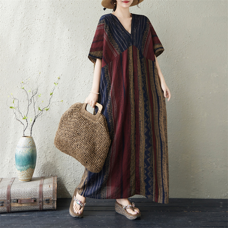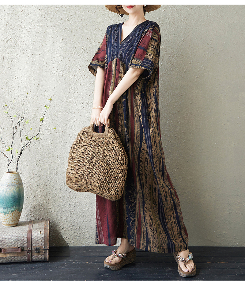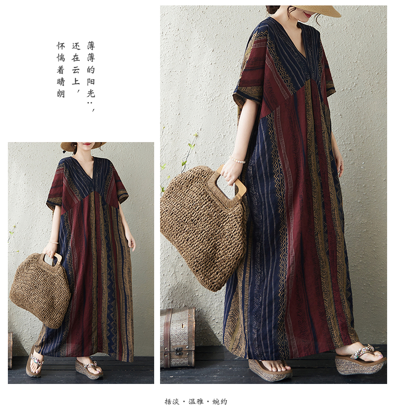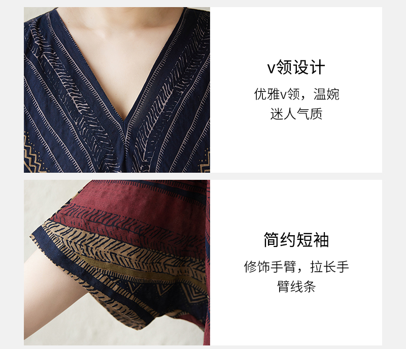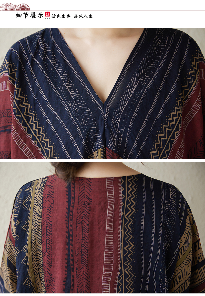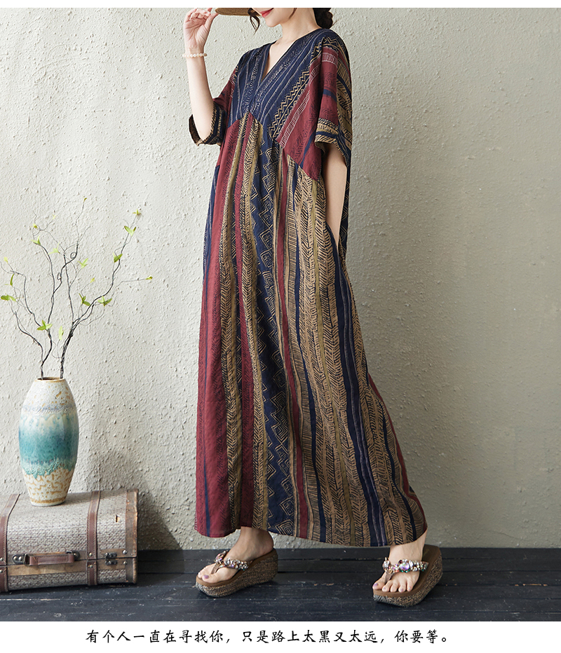 RY3351# 实拍大码原创法式高级感短袖v领薄棉麻印花宽松显瘦连衣裙女夏季