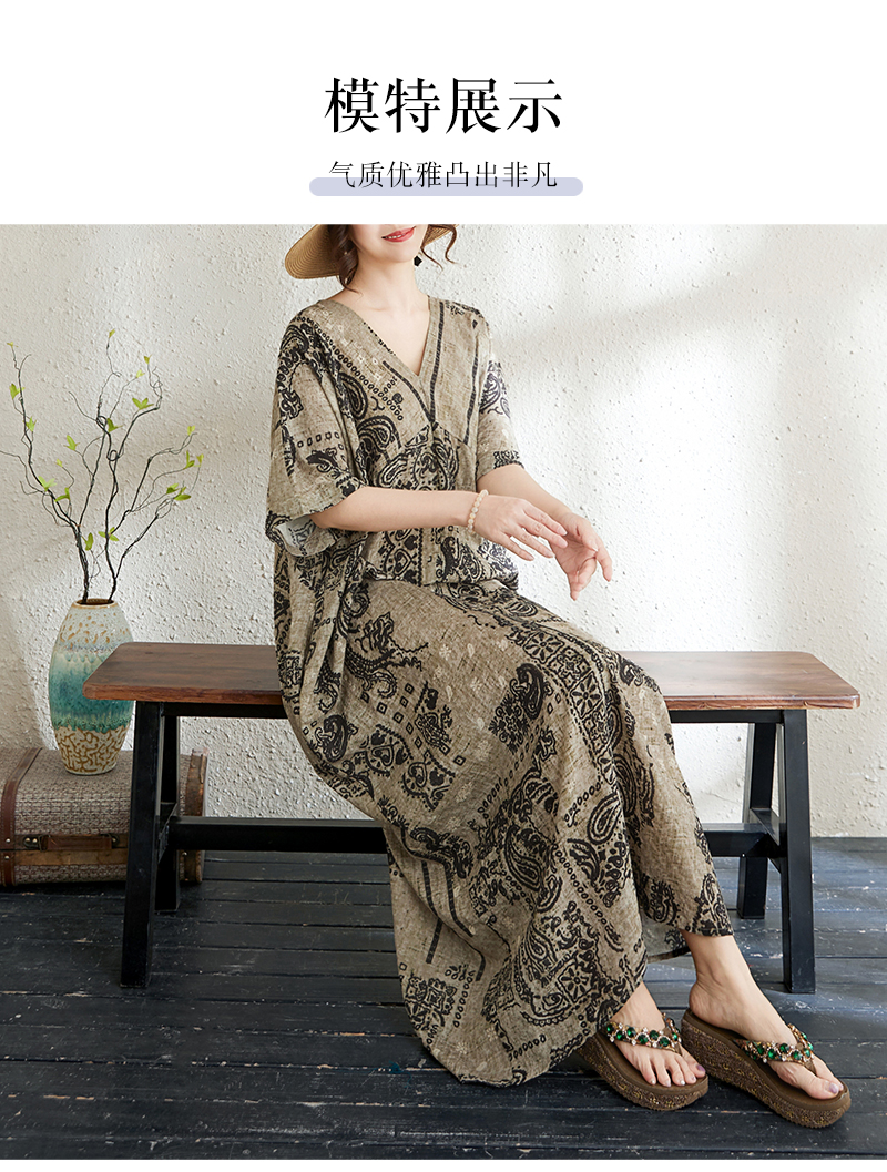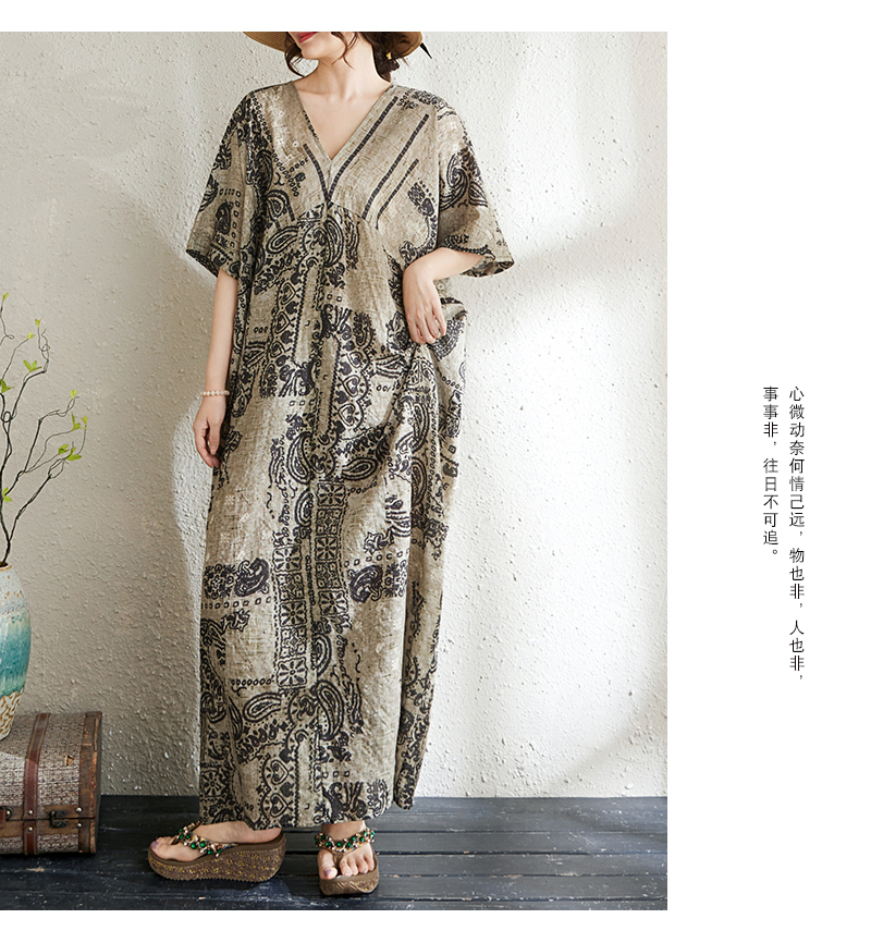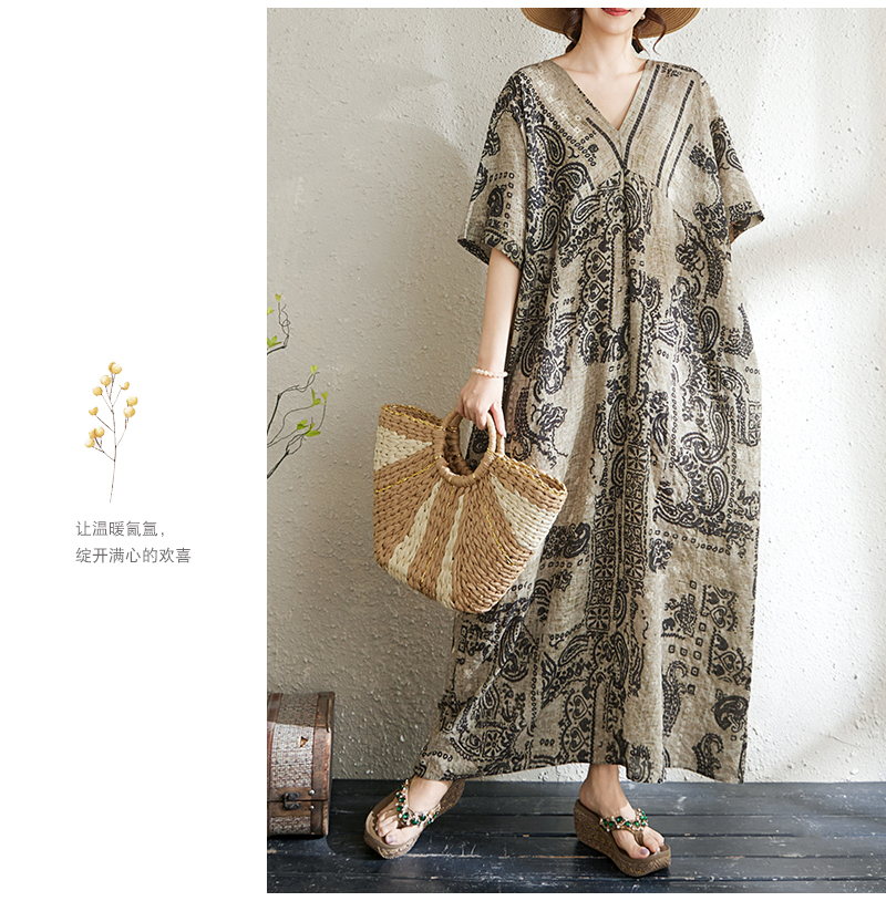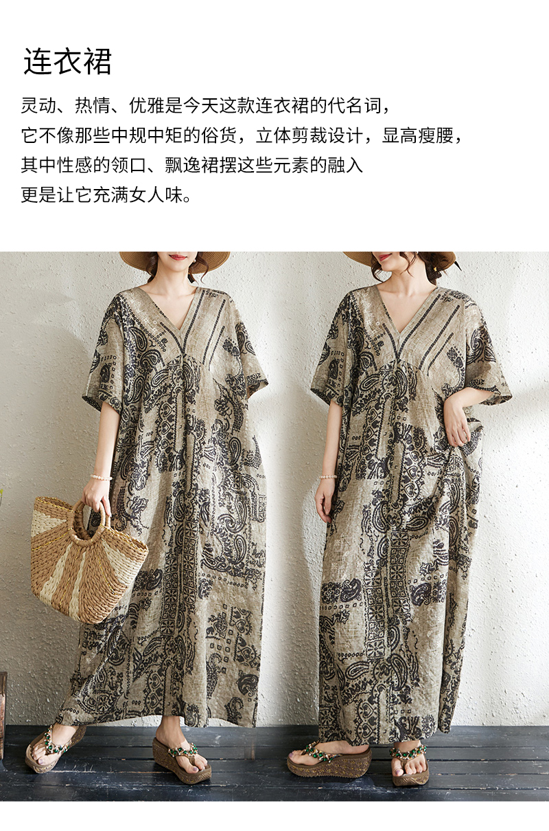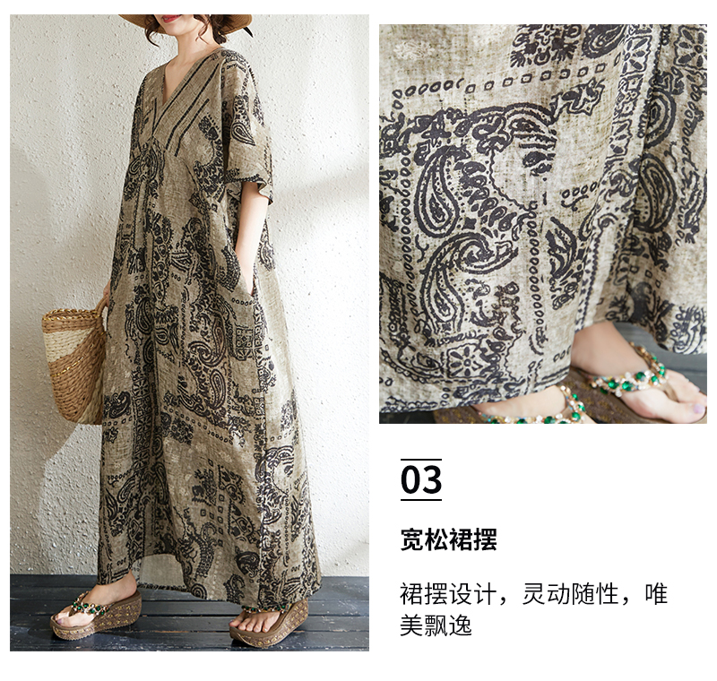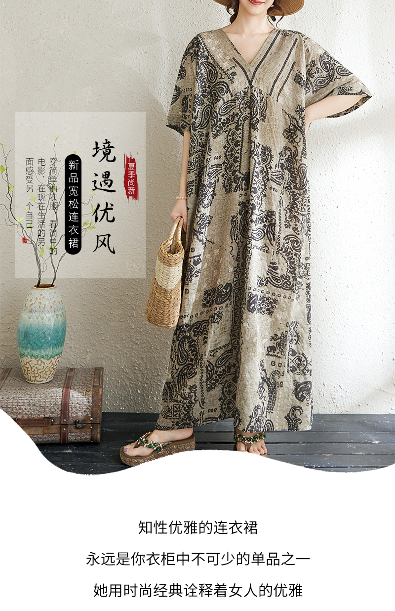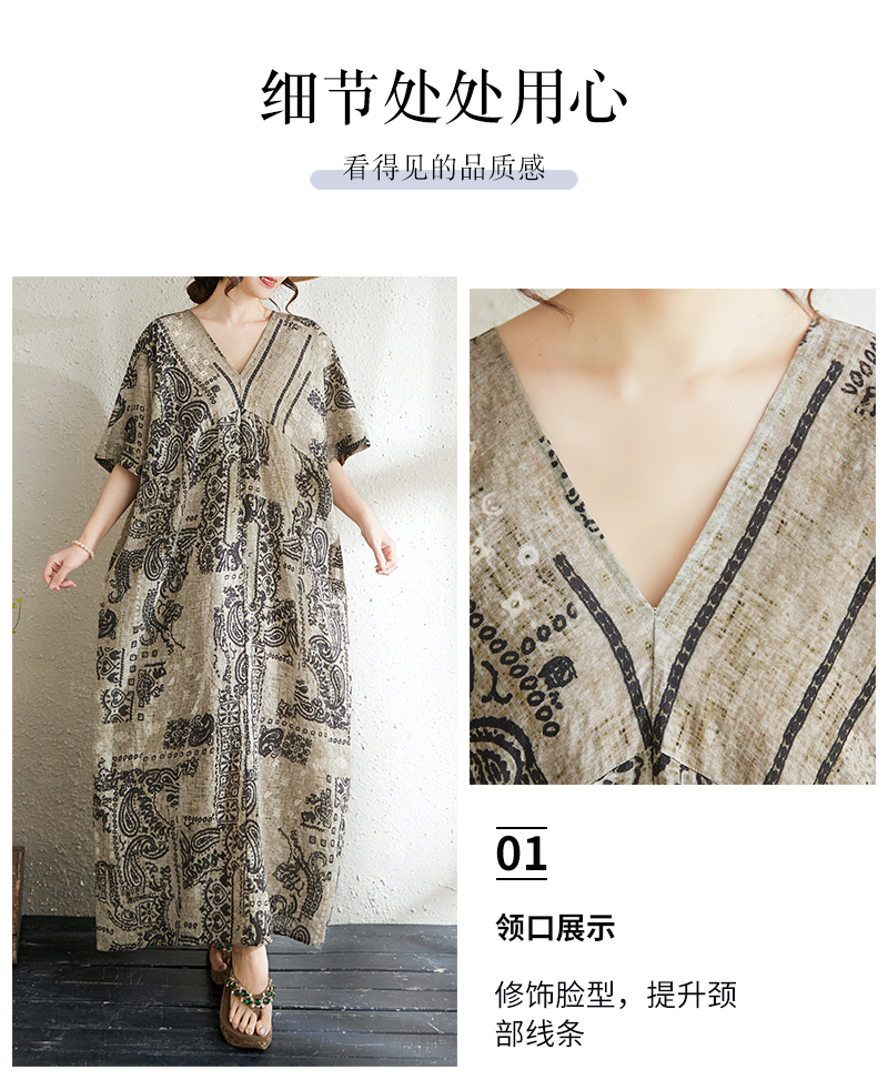 RY3352# 实拍大码原创法式高级感短袖v领薄棉麻印花宽松显瘦连衣裙女夏季
