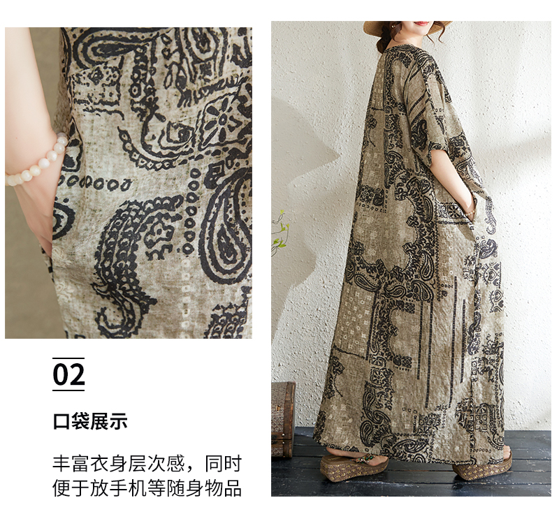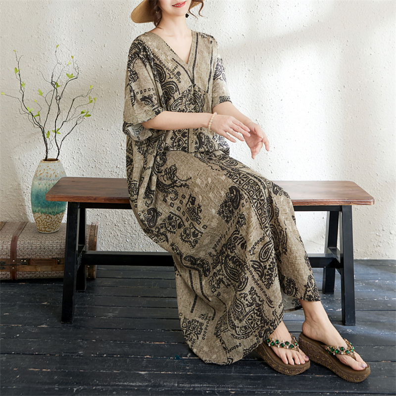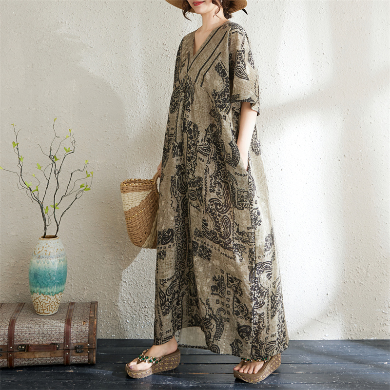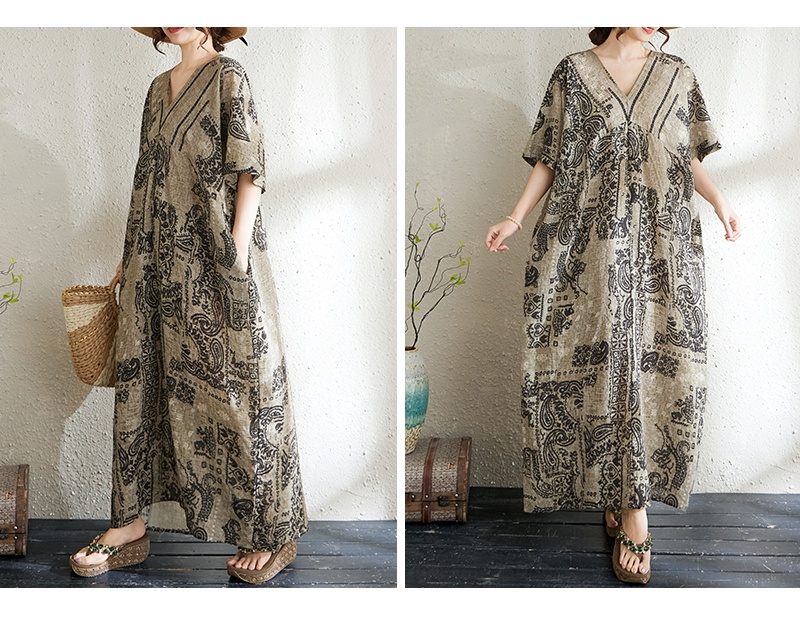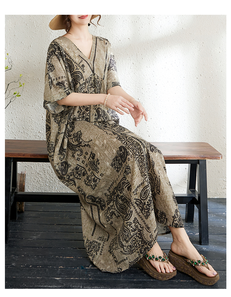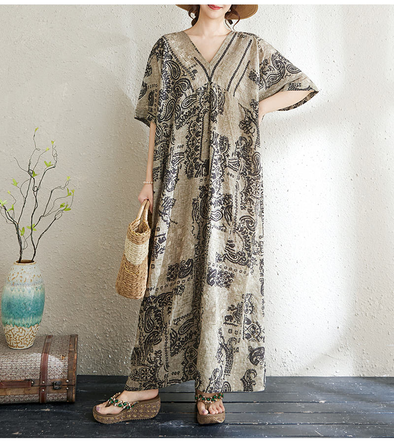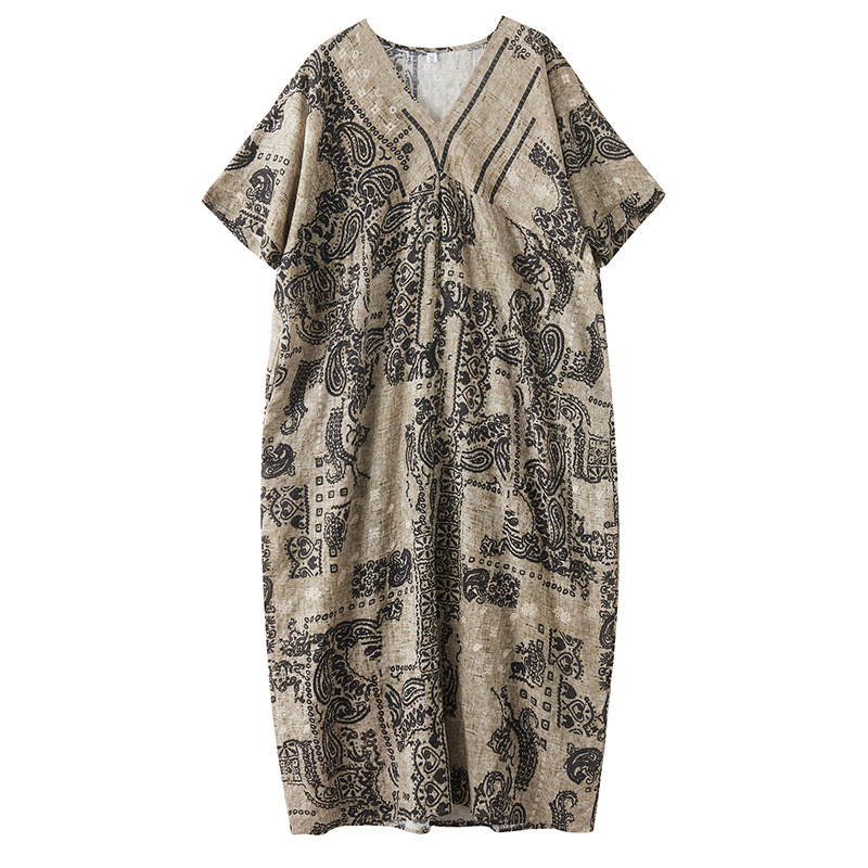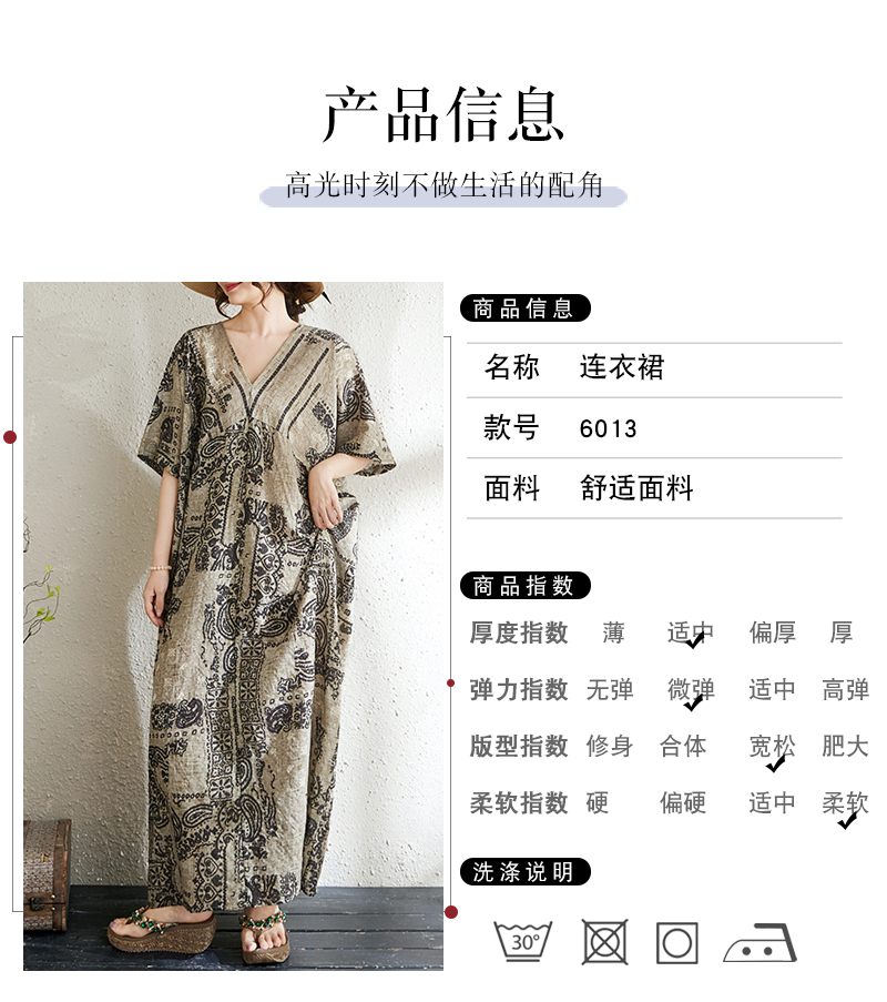 RY3352# 实拍大码原创法式高级感短袖v领薄棉麻印花宽松显瘦连衣裙女夏季