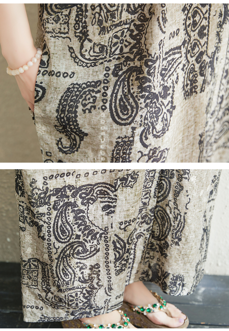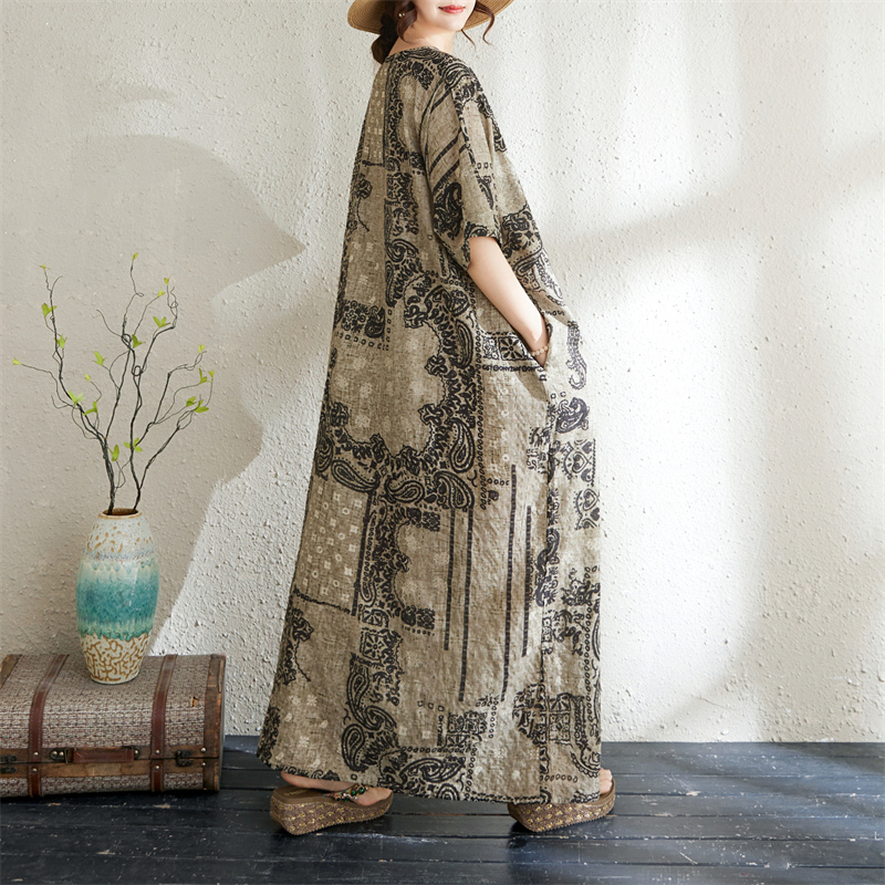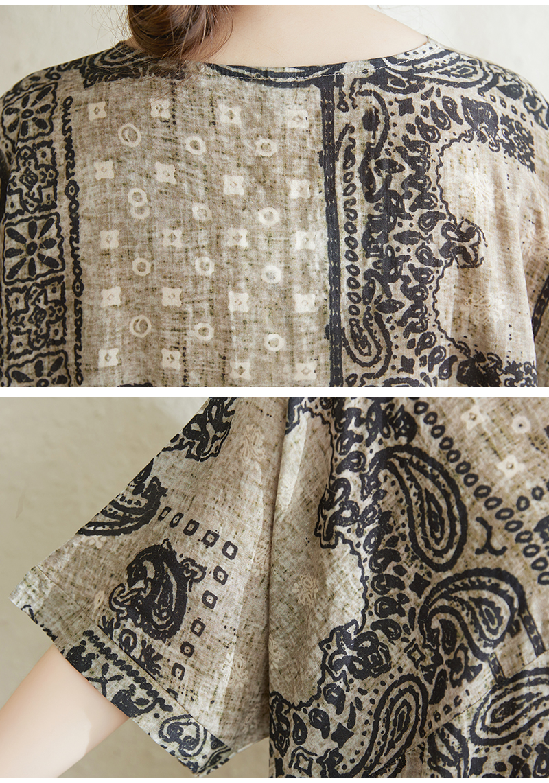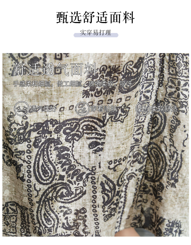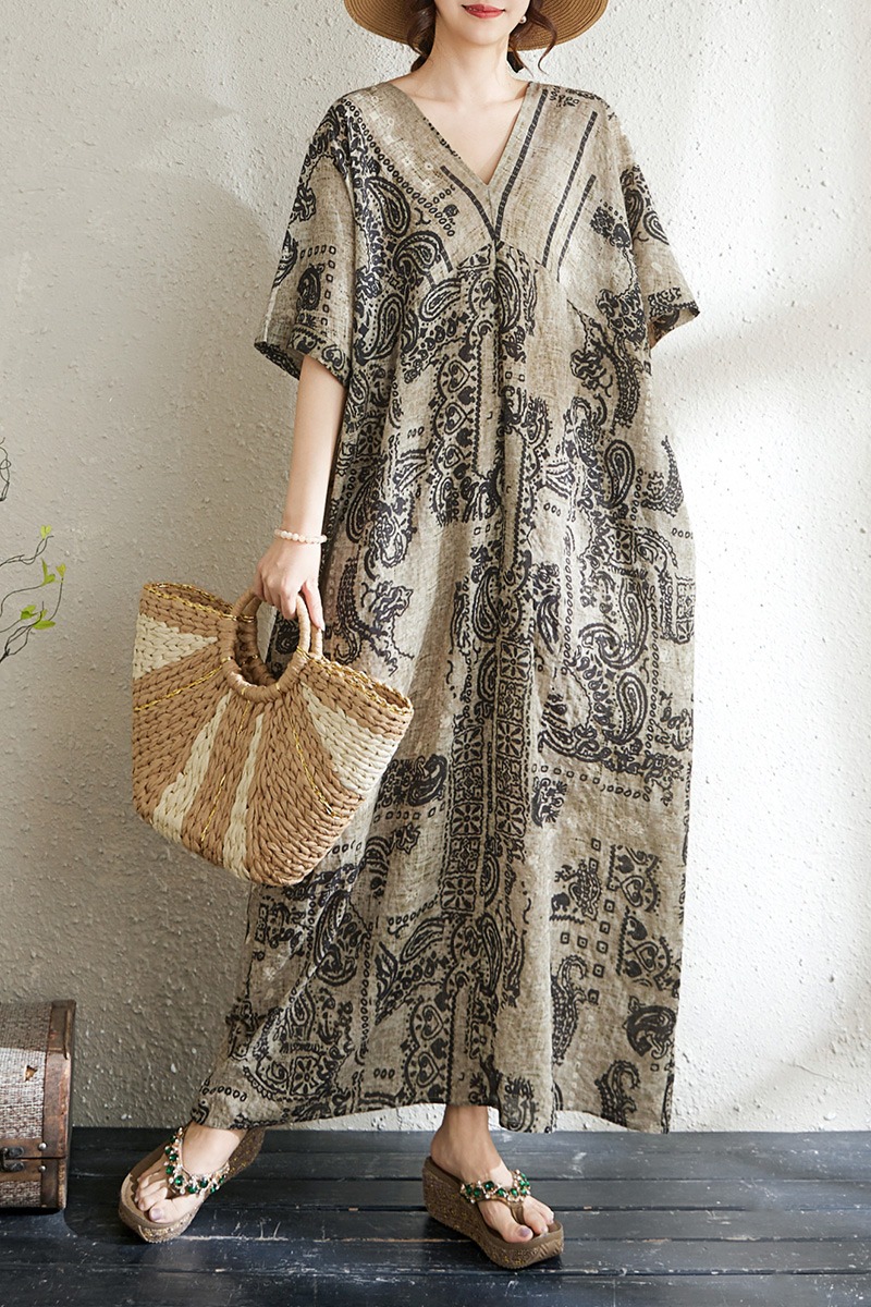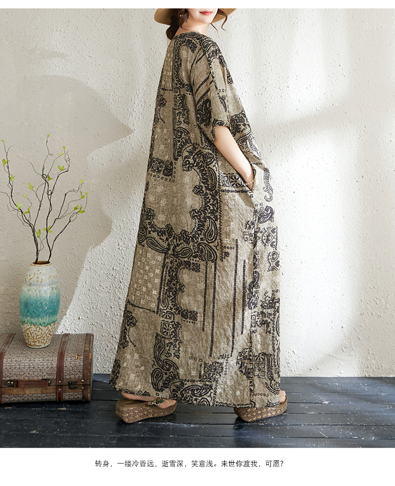 RY3352# 实拍大码原创法式高级感短袖v领薄棉麻印花宽松显瘦连衣裙女夏季