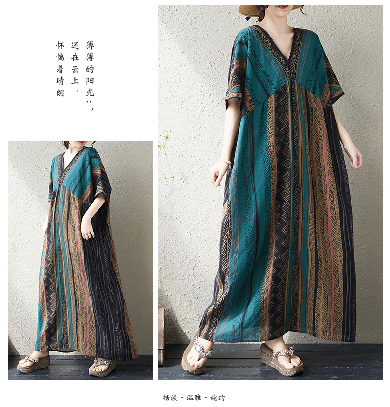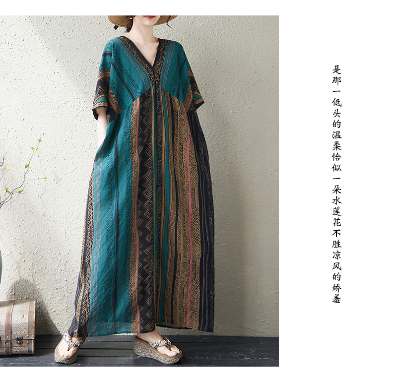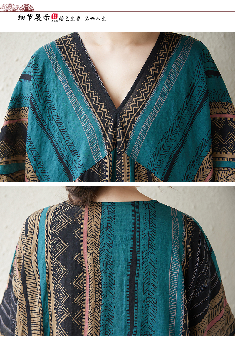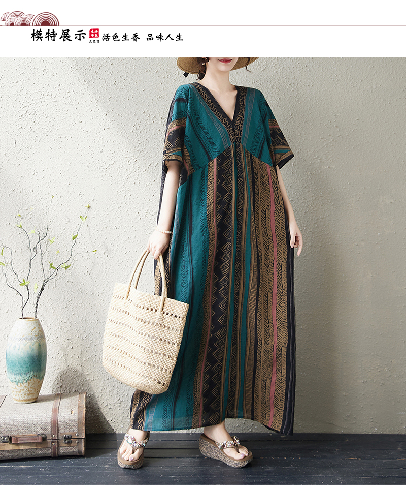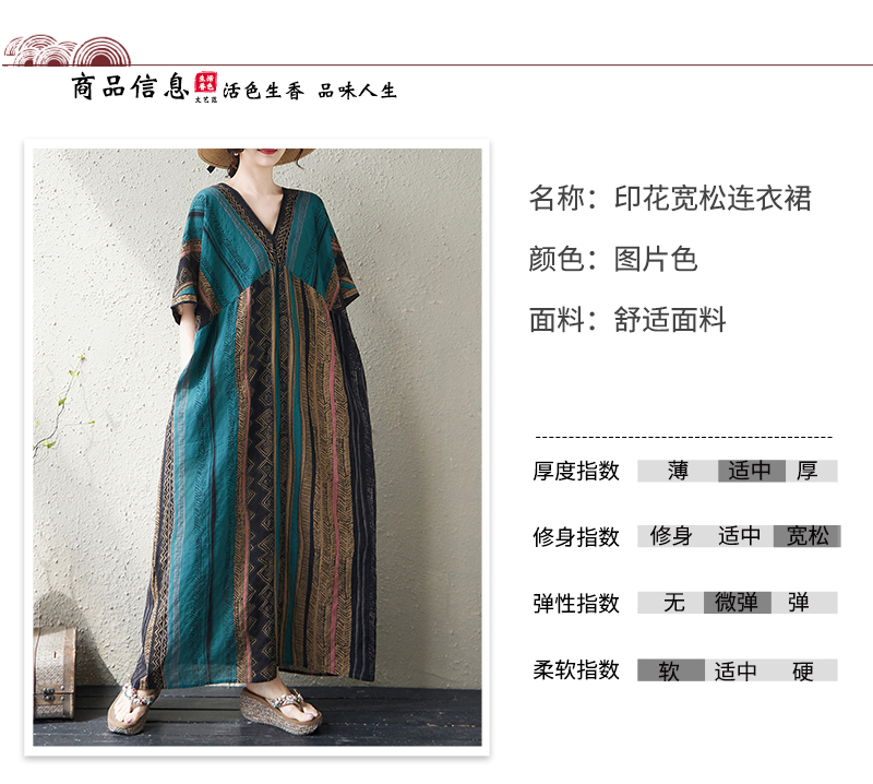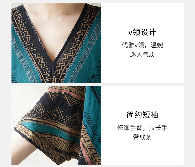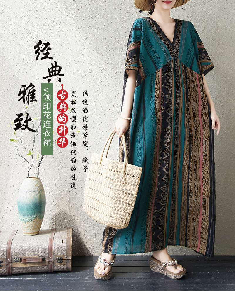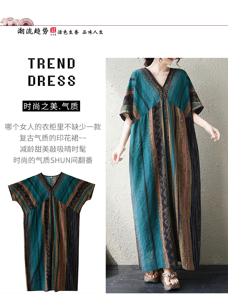 RY3353# 实拍大码原创法式高级感短袖v领薄棉麻印花宽松显瘦连衣裙女夏季