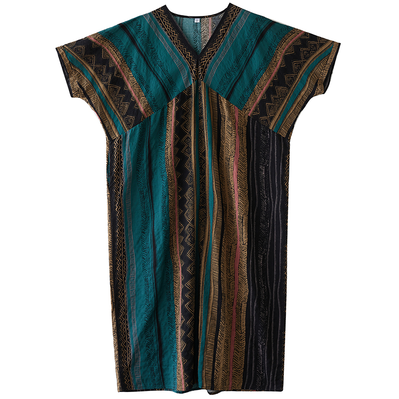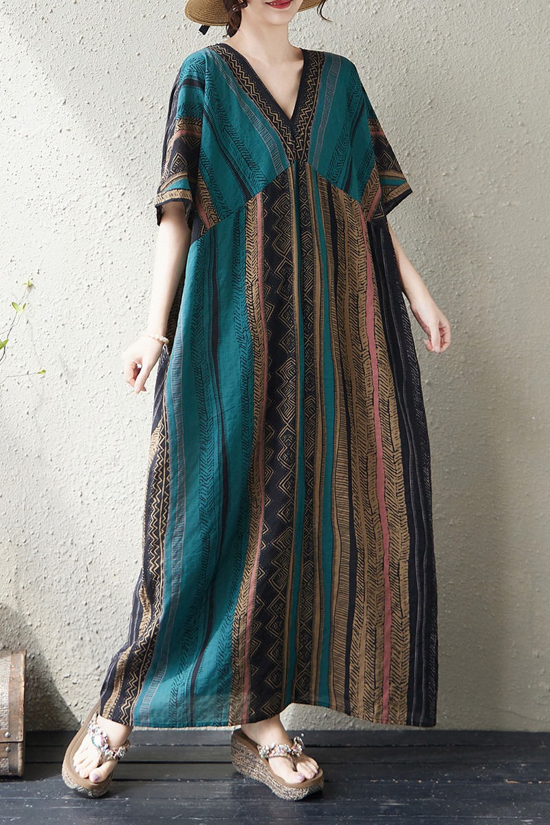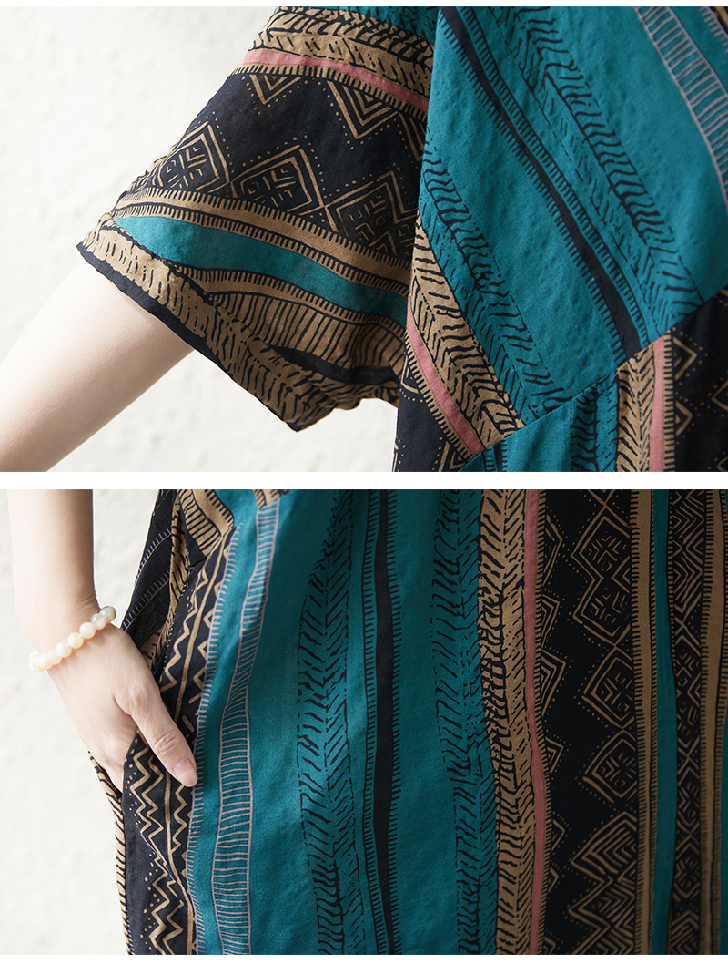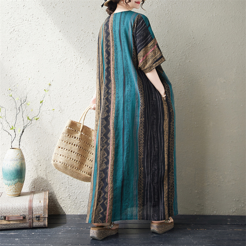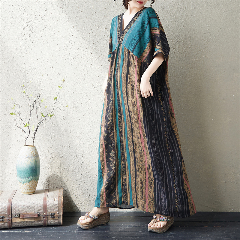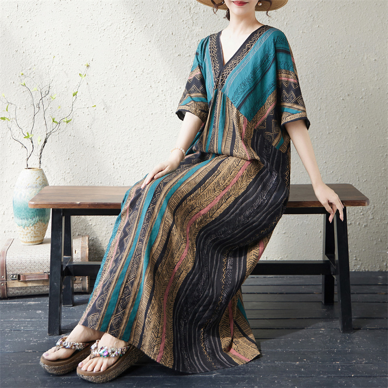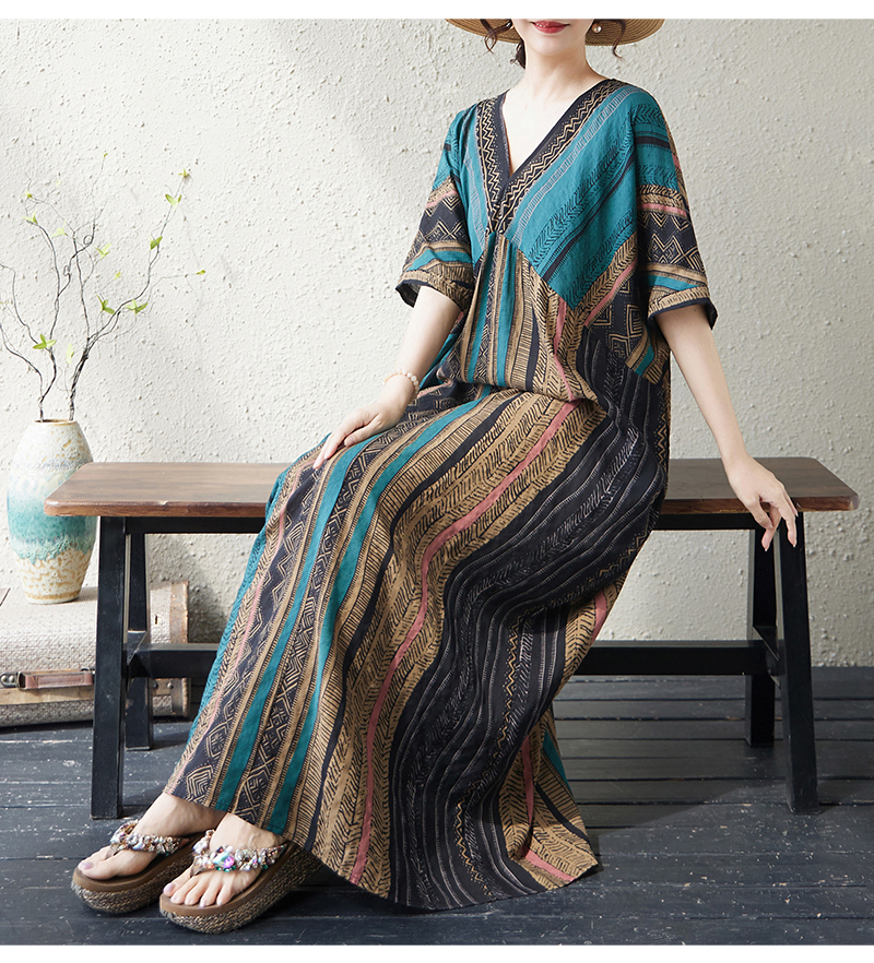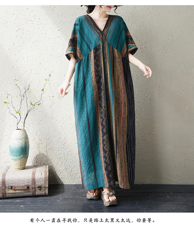 RY3353# 实拍大码原创法式高级感短袖v领薄棉麻印花宽松显瘦连衣裙女夏季