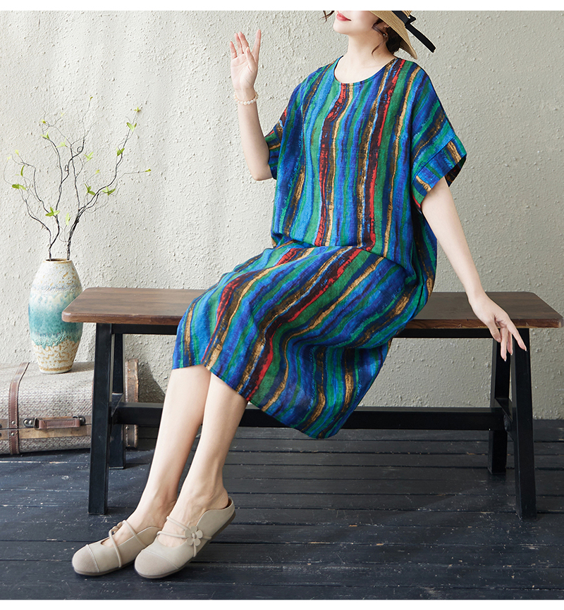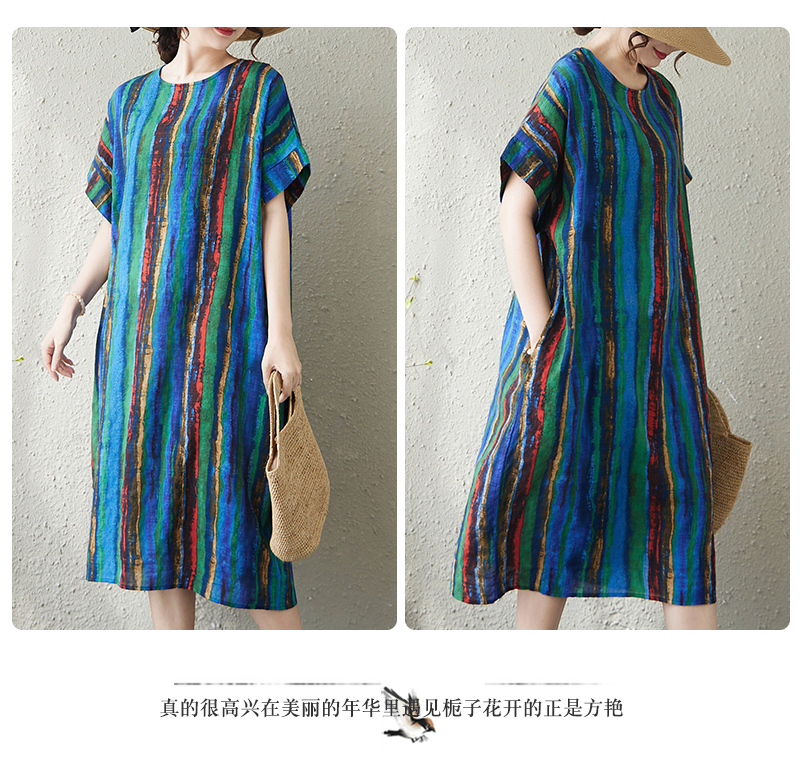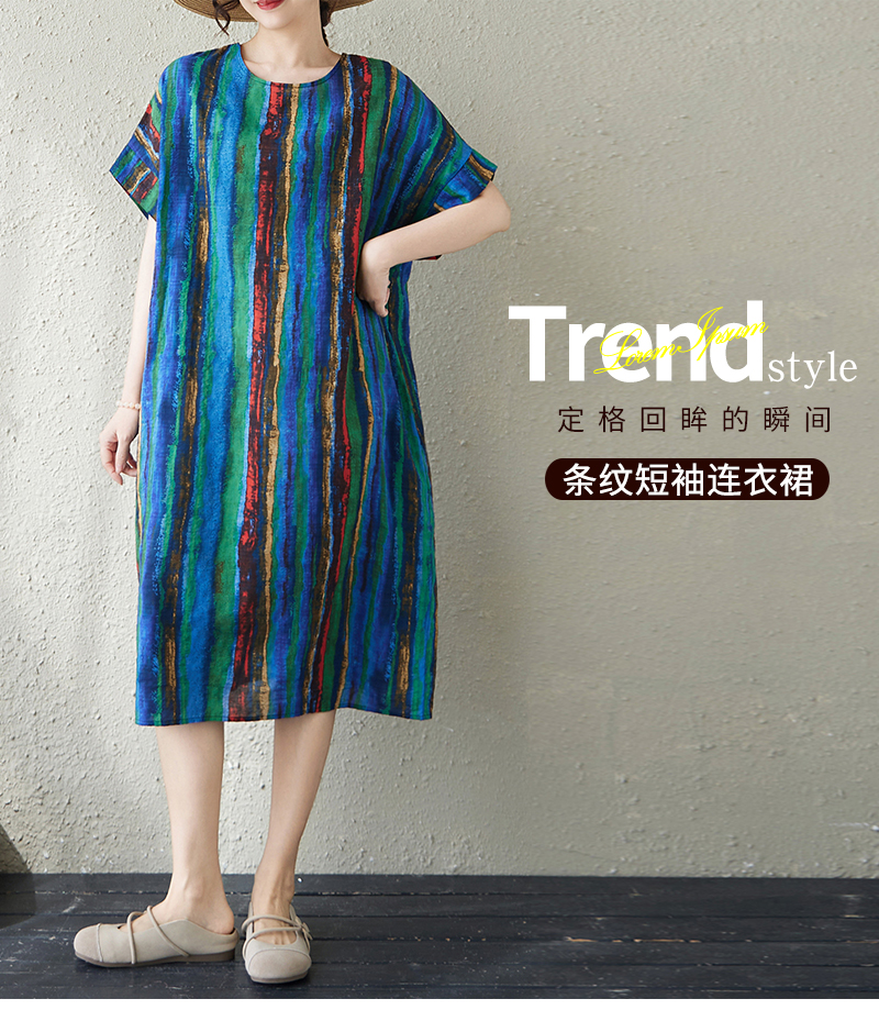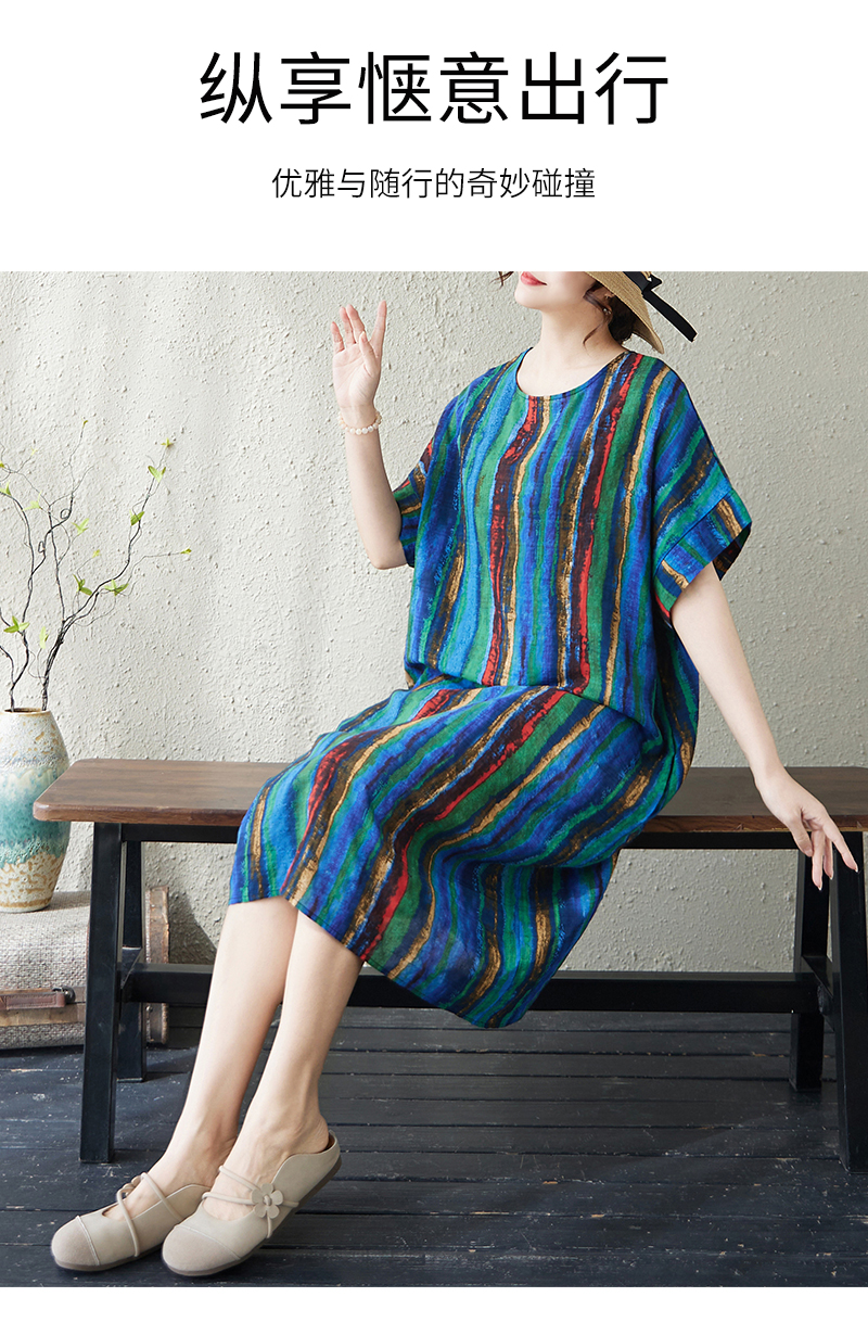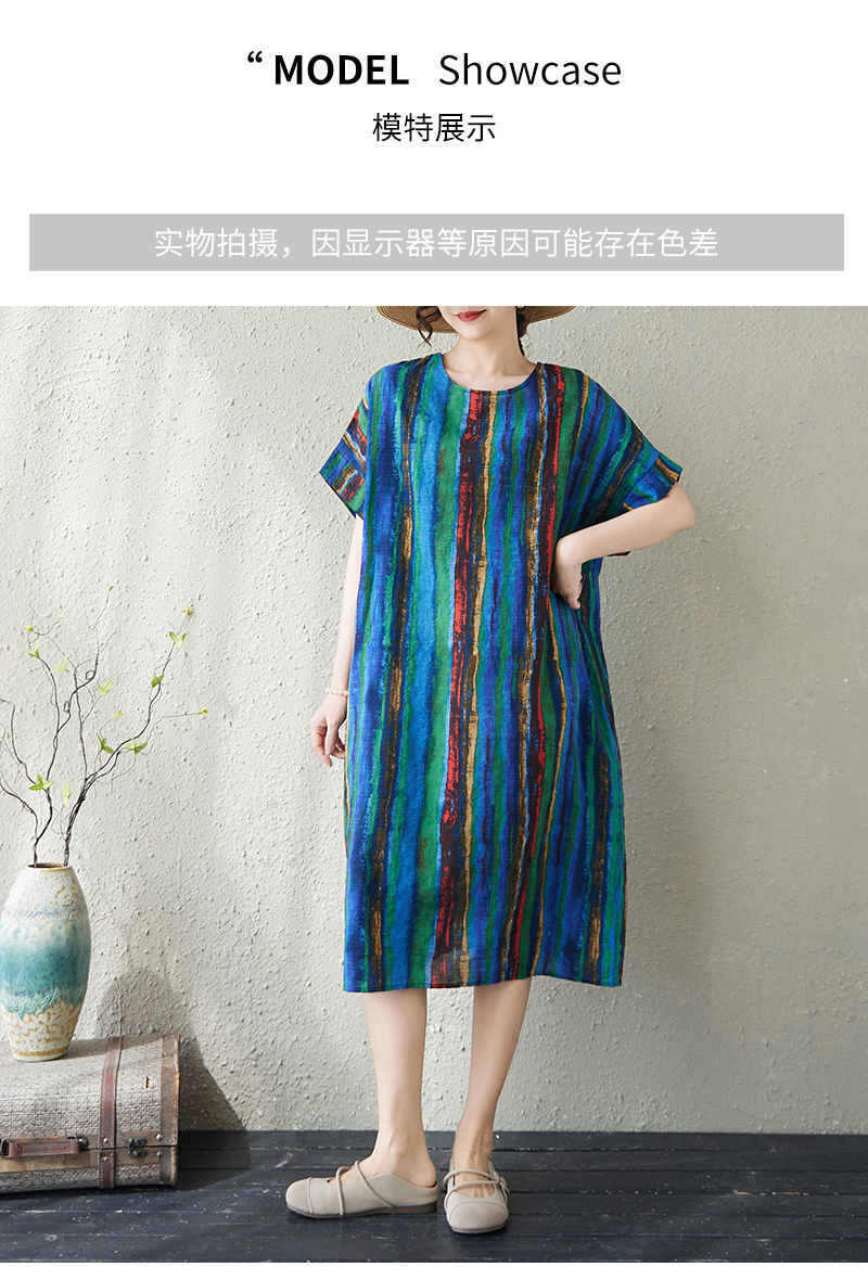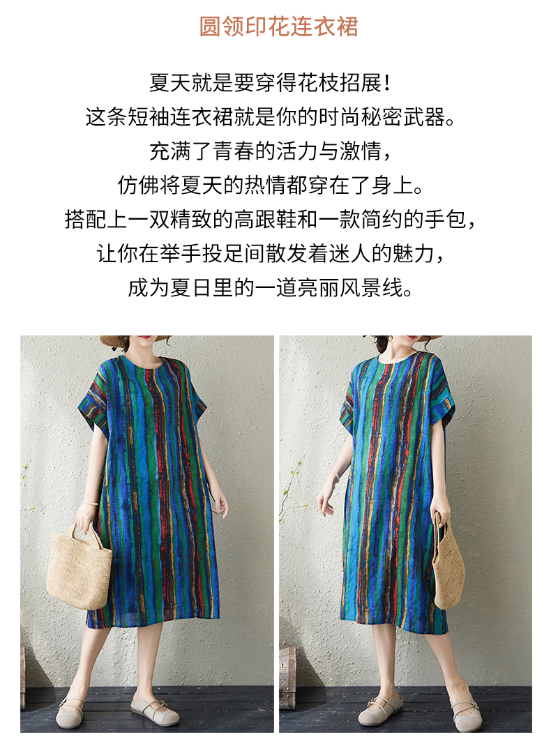 RY3355# 实拍26夏季新款胖mm薄棉麻印花女气质过膝中长款短袖连衣裙文艺女
