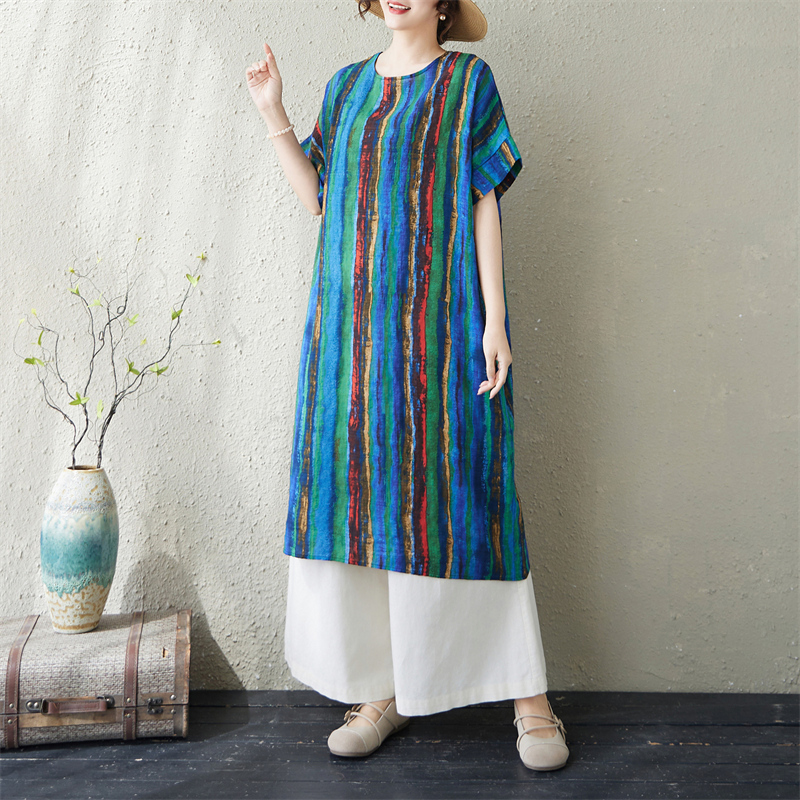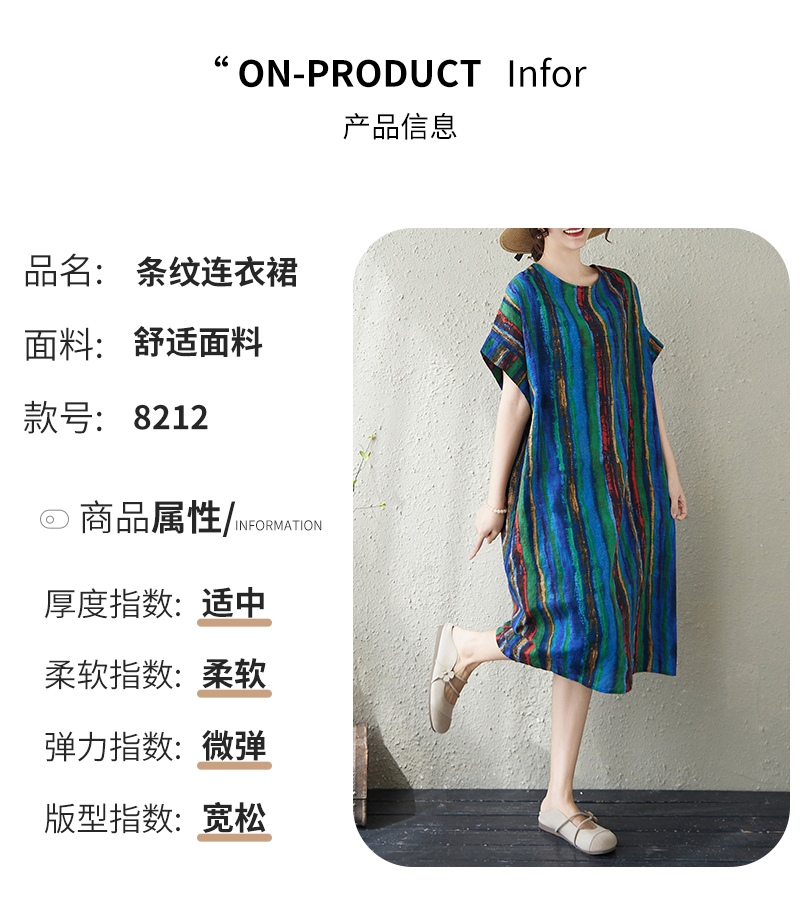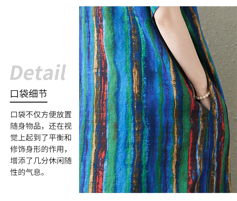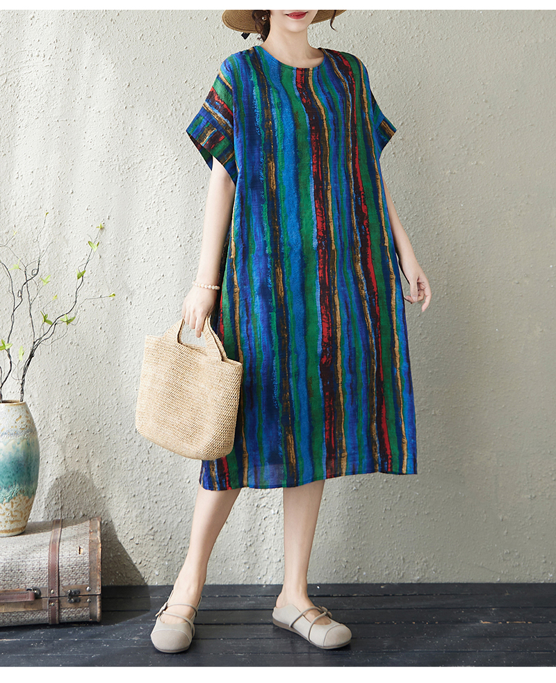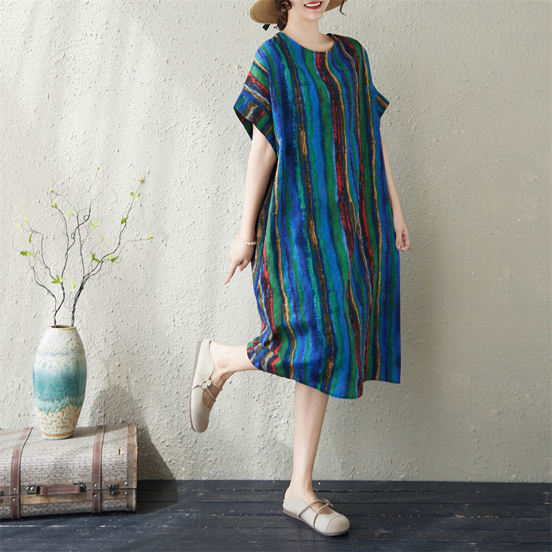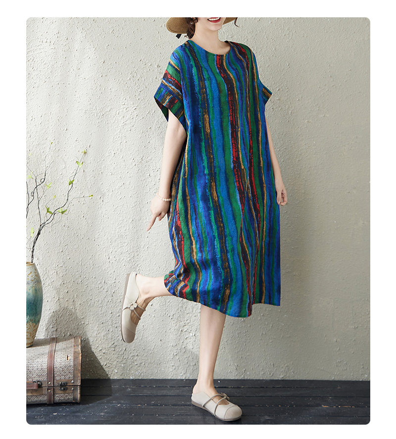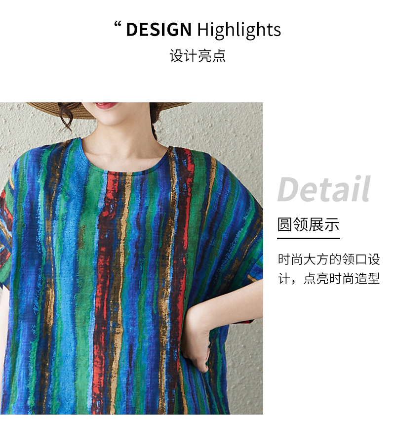 RY3355# 实拍26夏季新款胖mm薄棉麻印花女气质过膝中长款短袖连衣裙文艺女