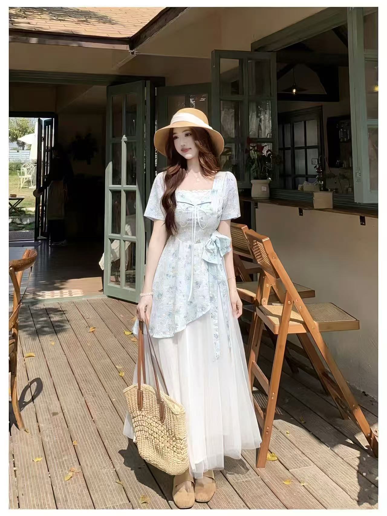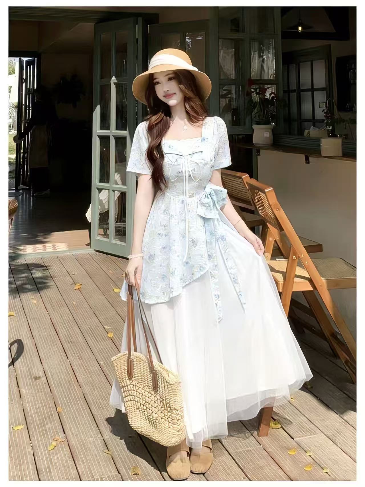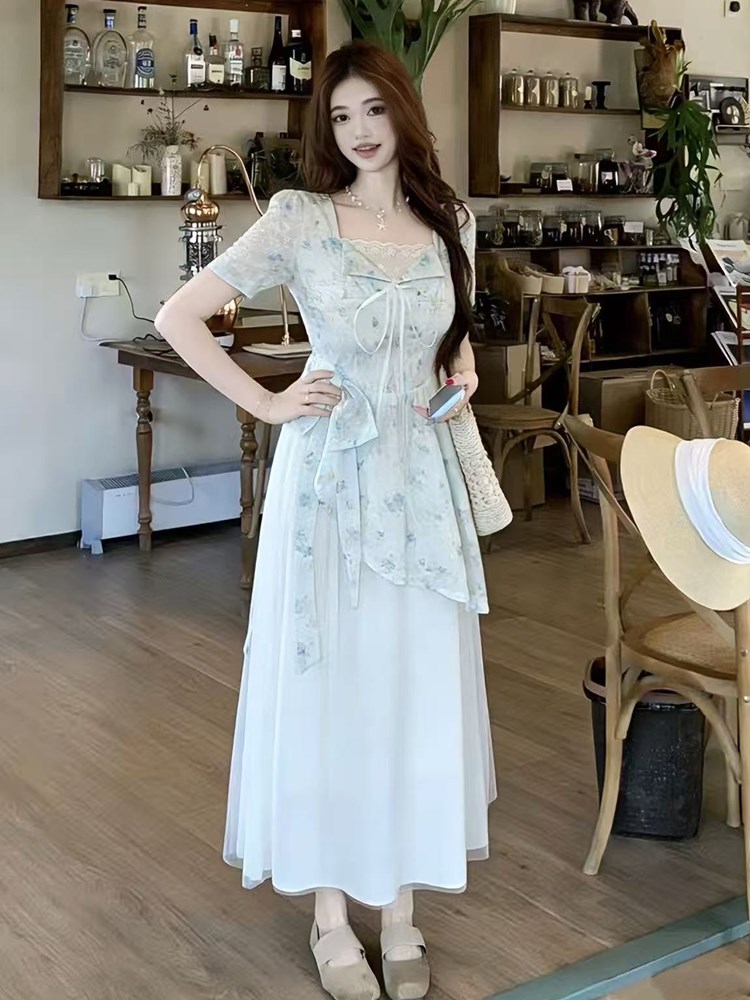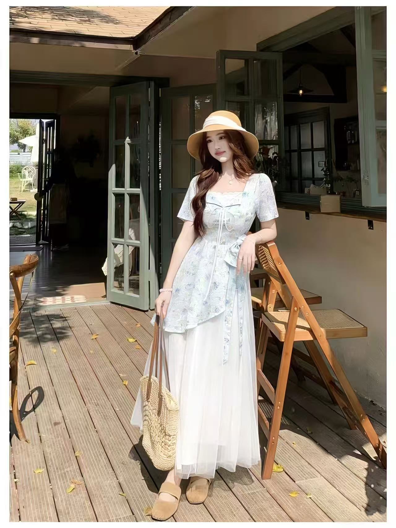 RY3375# 2026夏季新款假两件方领大码设计感拼接网纱甜美蝴蝶结长连衣裙子