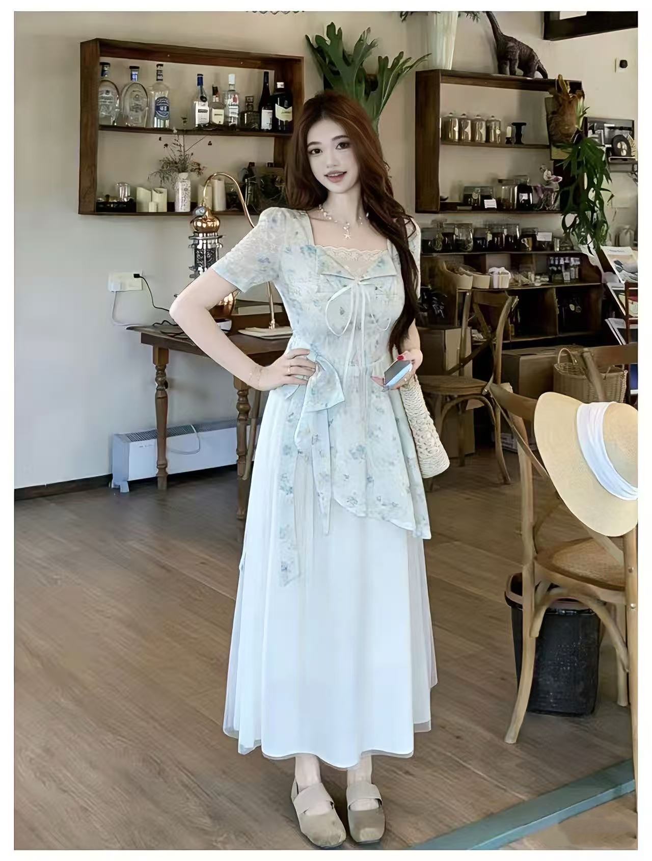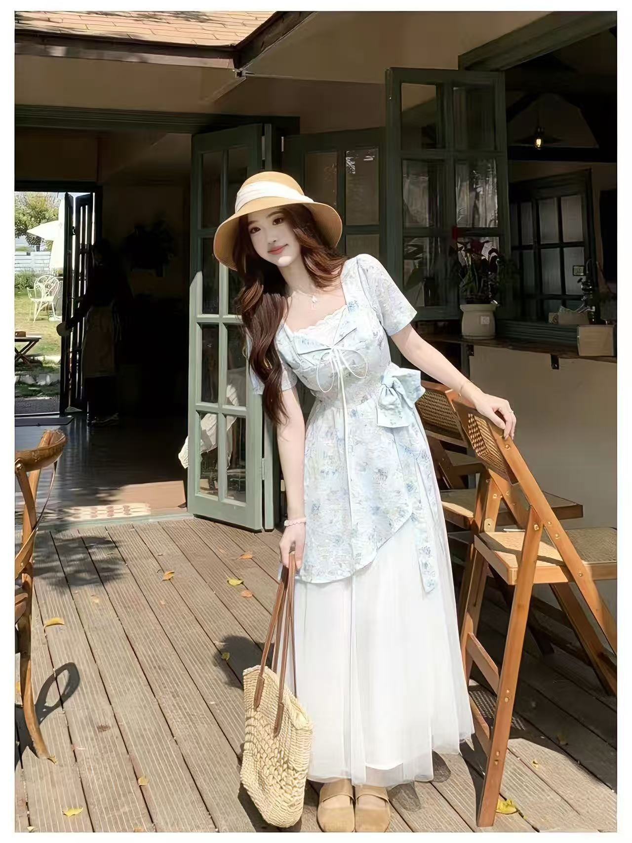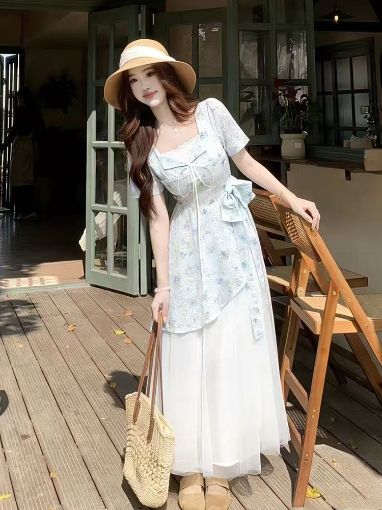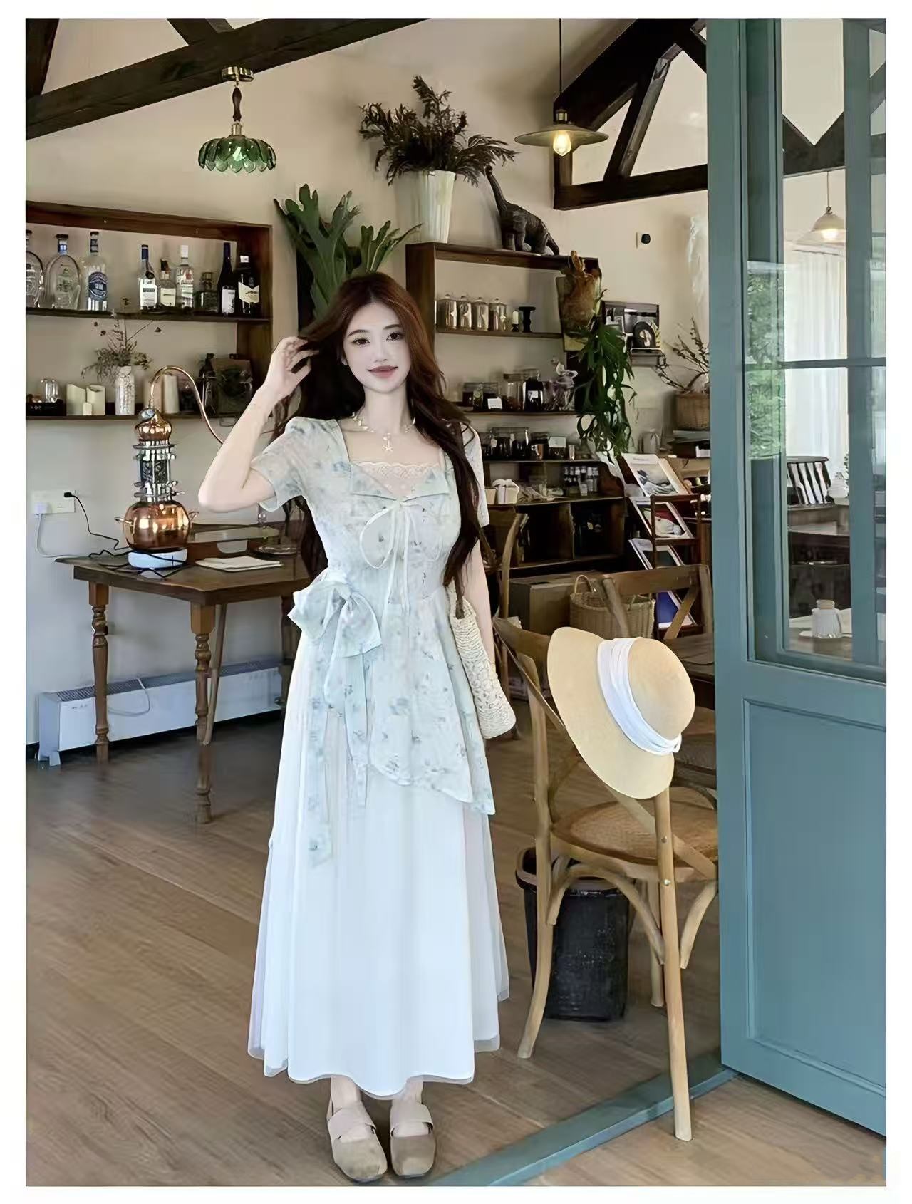 RY3375# 2026夏季新款假两件方领大码设计感拼接网纱甜美蝴蝶结长连衣裙子