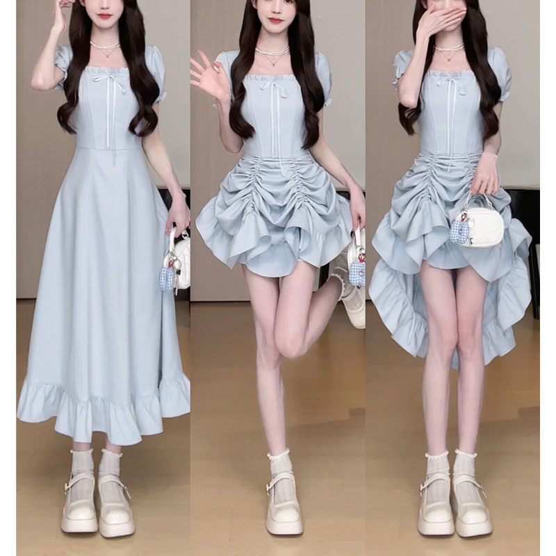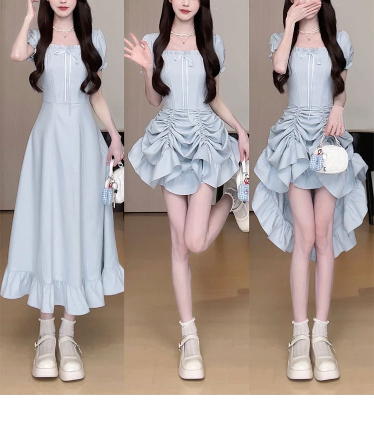 RY3410# 大码法式紫色显白方领短袖连衣裙女夏季胖mm高腰梨形身材显瘦...
