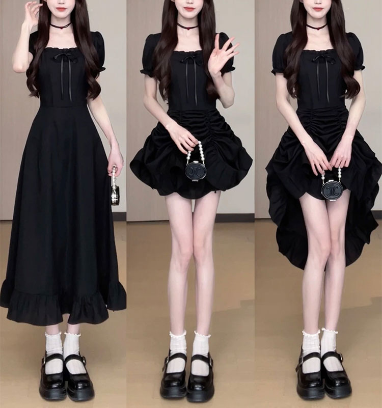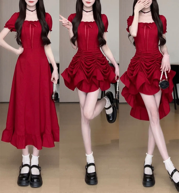 RY3383# 松本丧丧红色方领纯色长裙气质感收腰显瘦连衣裙