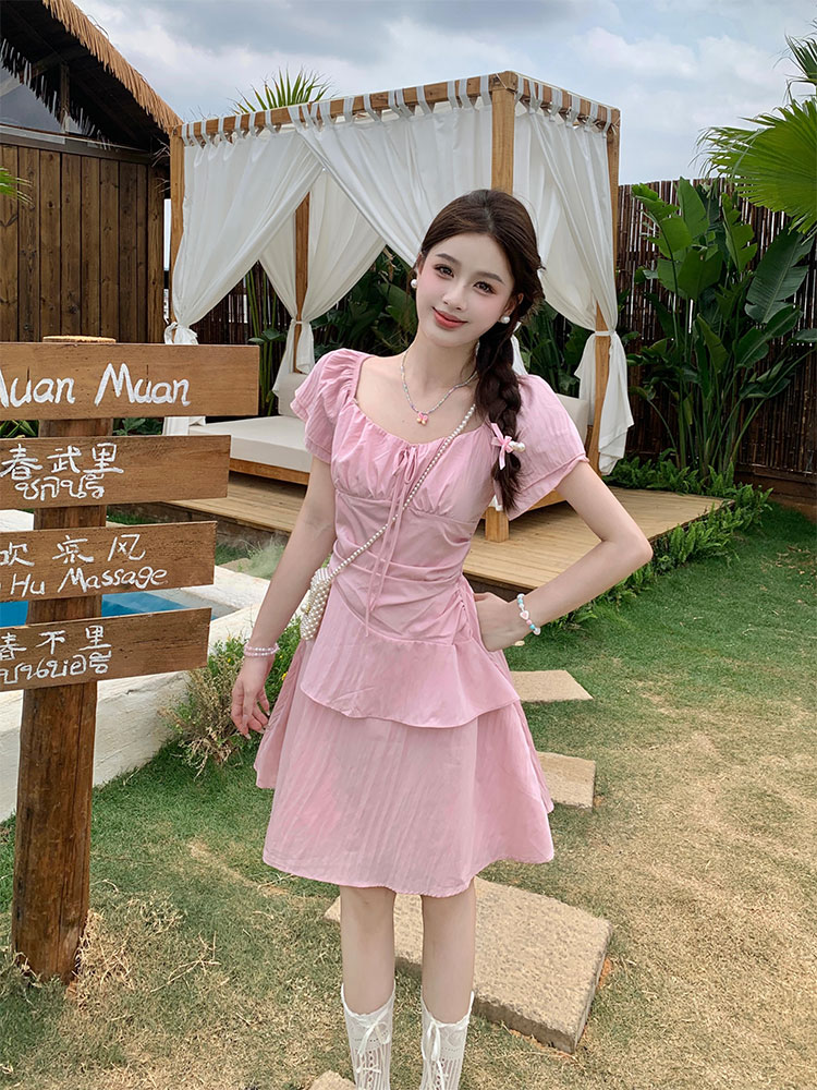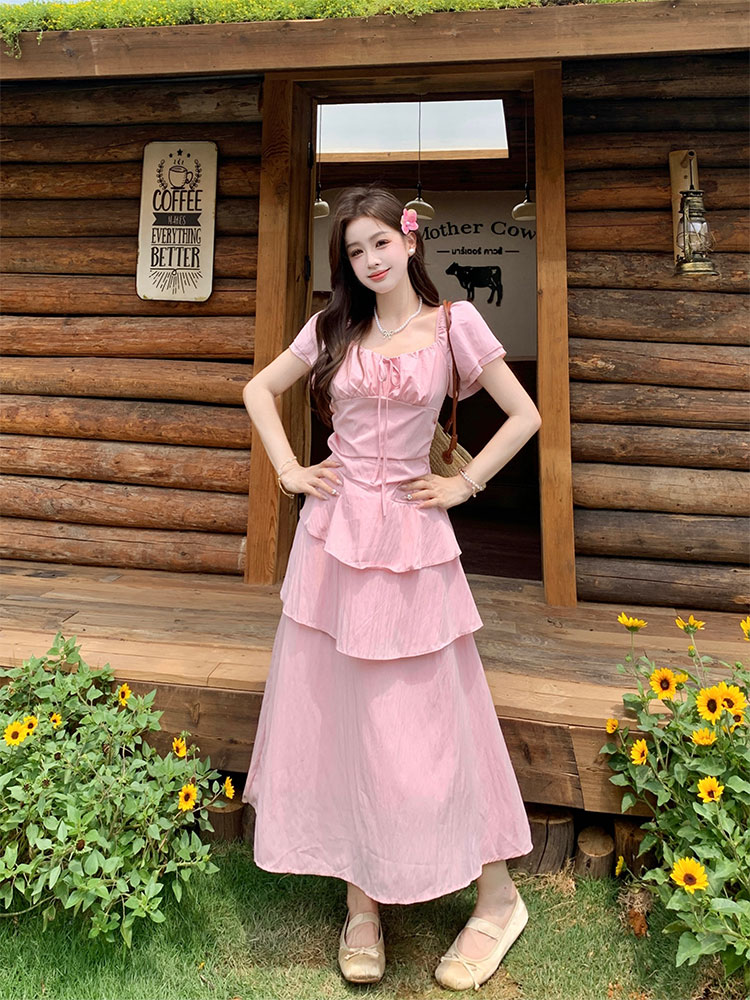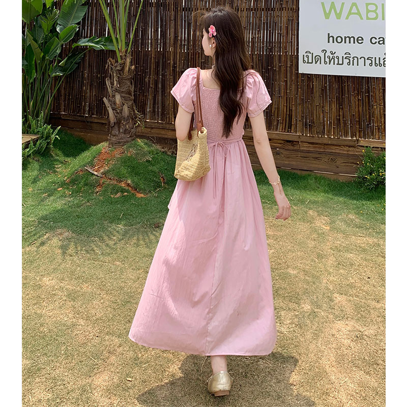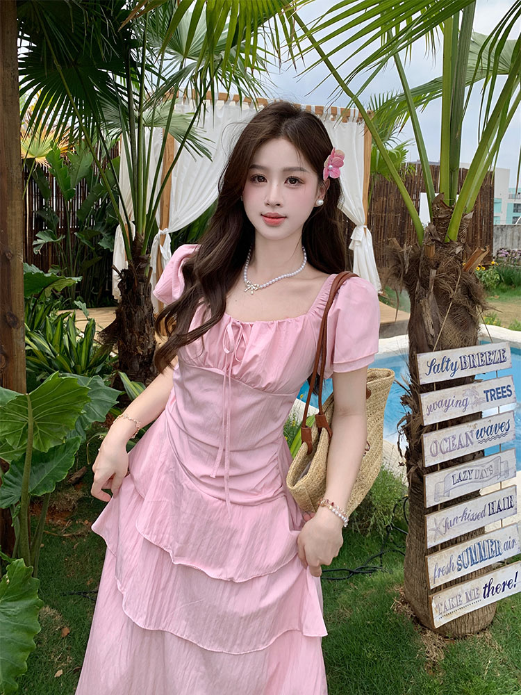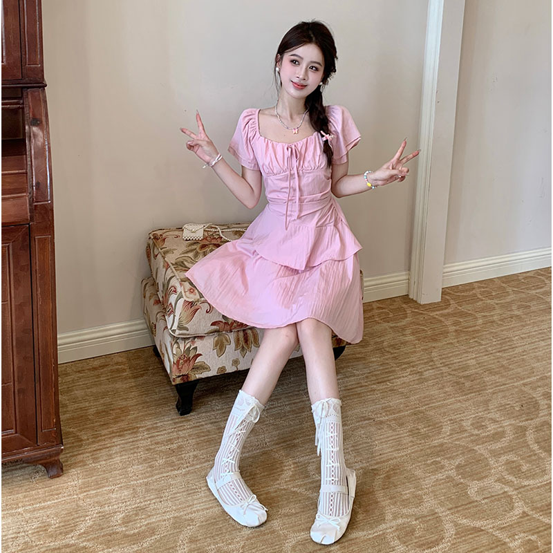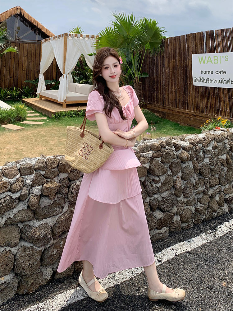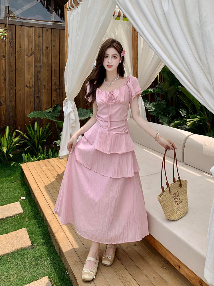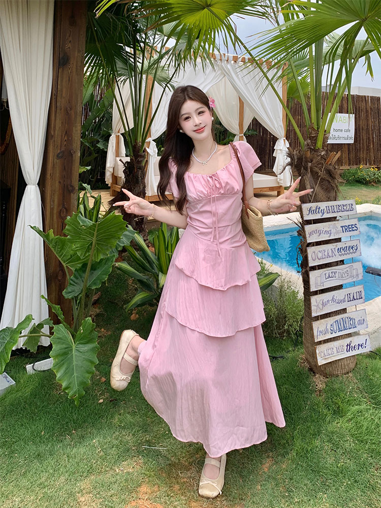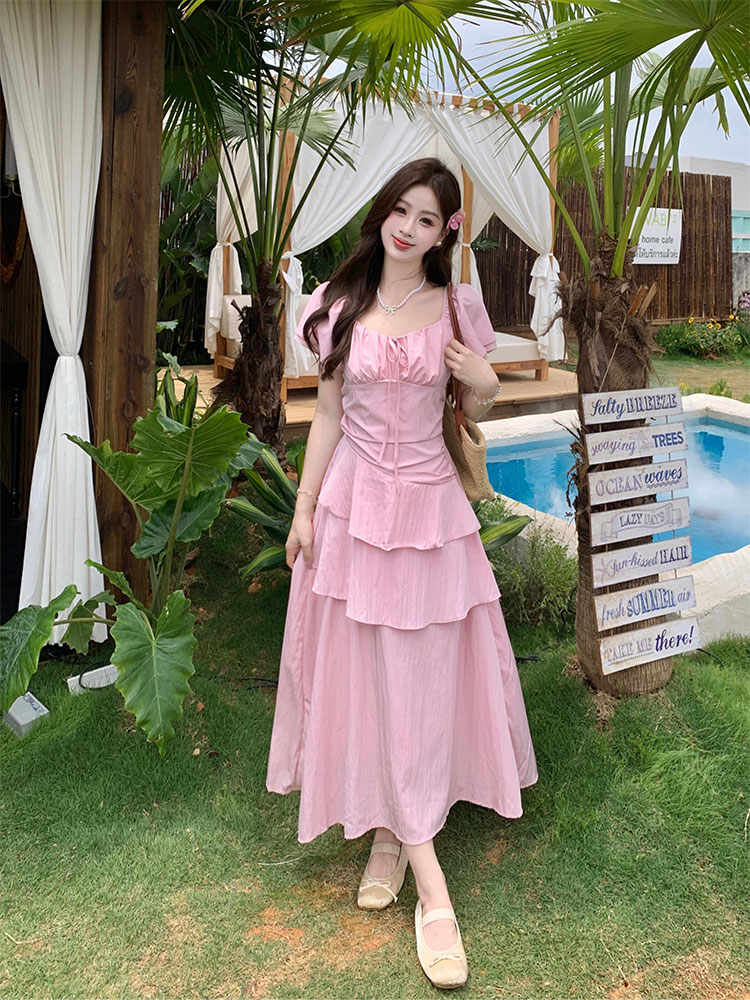RY3385# 实拍~大码蜜桃白茶夏季新款甜美风不规则长款连衣裙收腰显瘦长裙