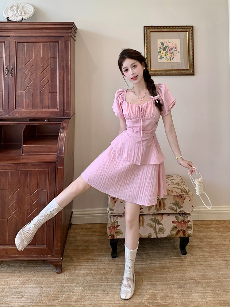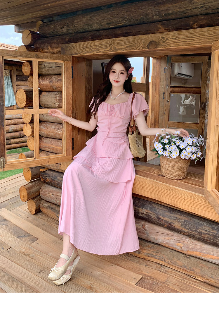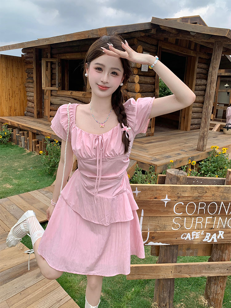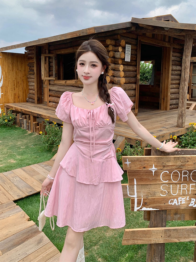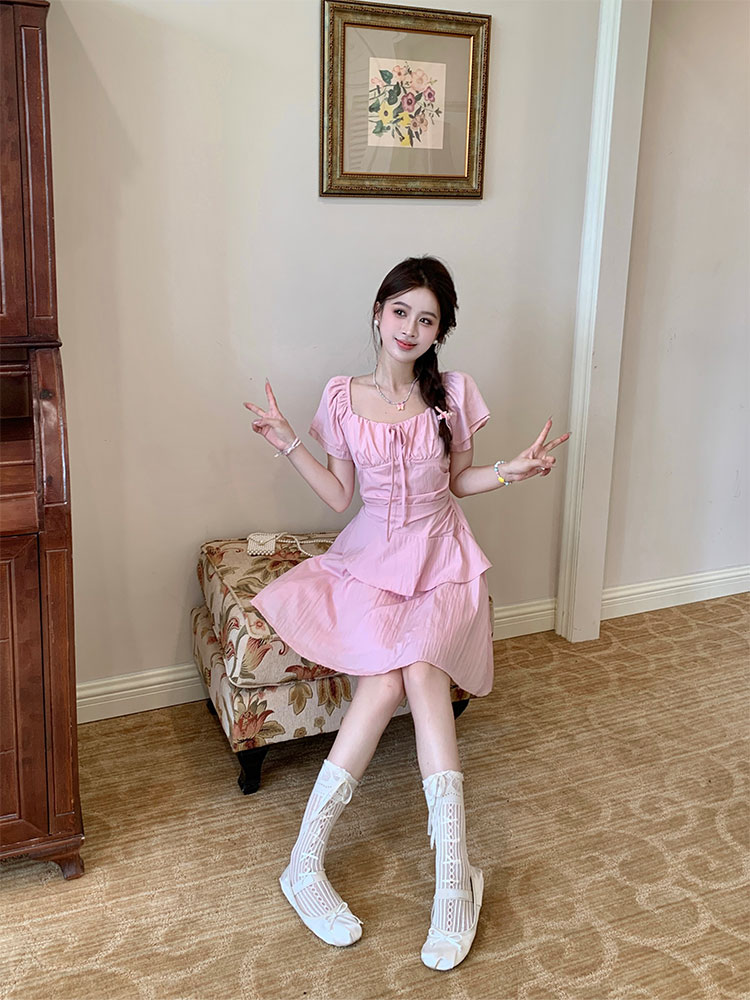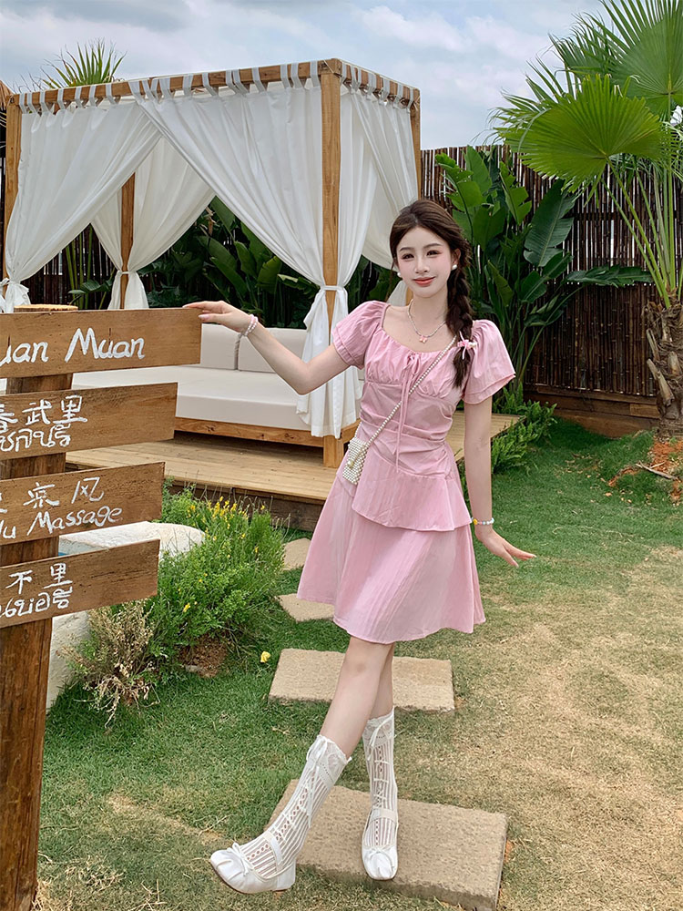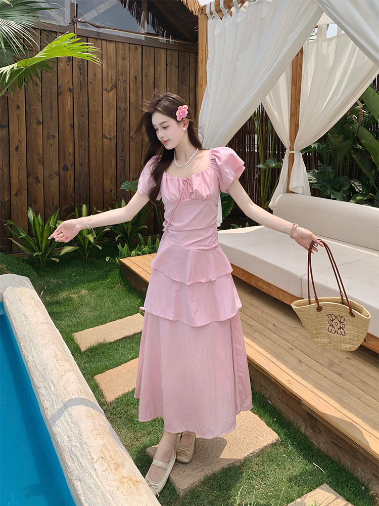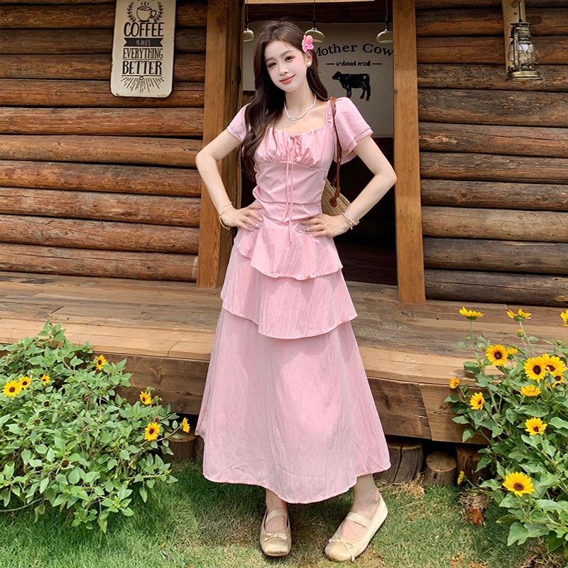 RY3385# 实拍~大码蜜桃白茶夏季新款甜美风不规则长款连衣裙收腰显瘦长裙