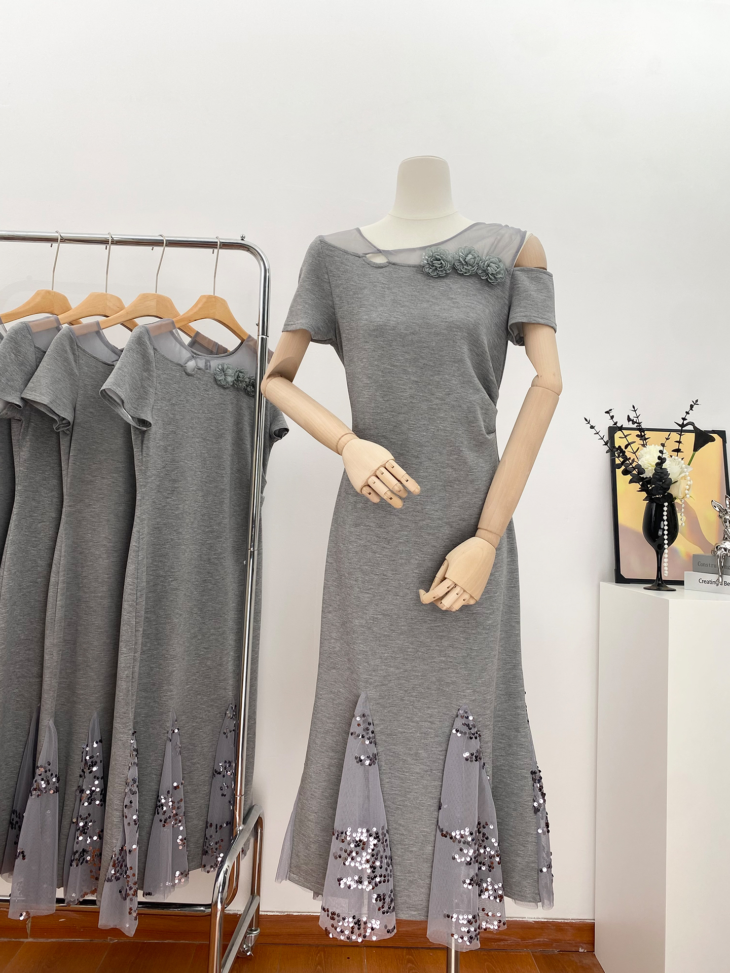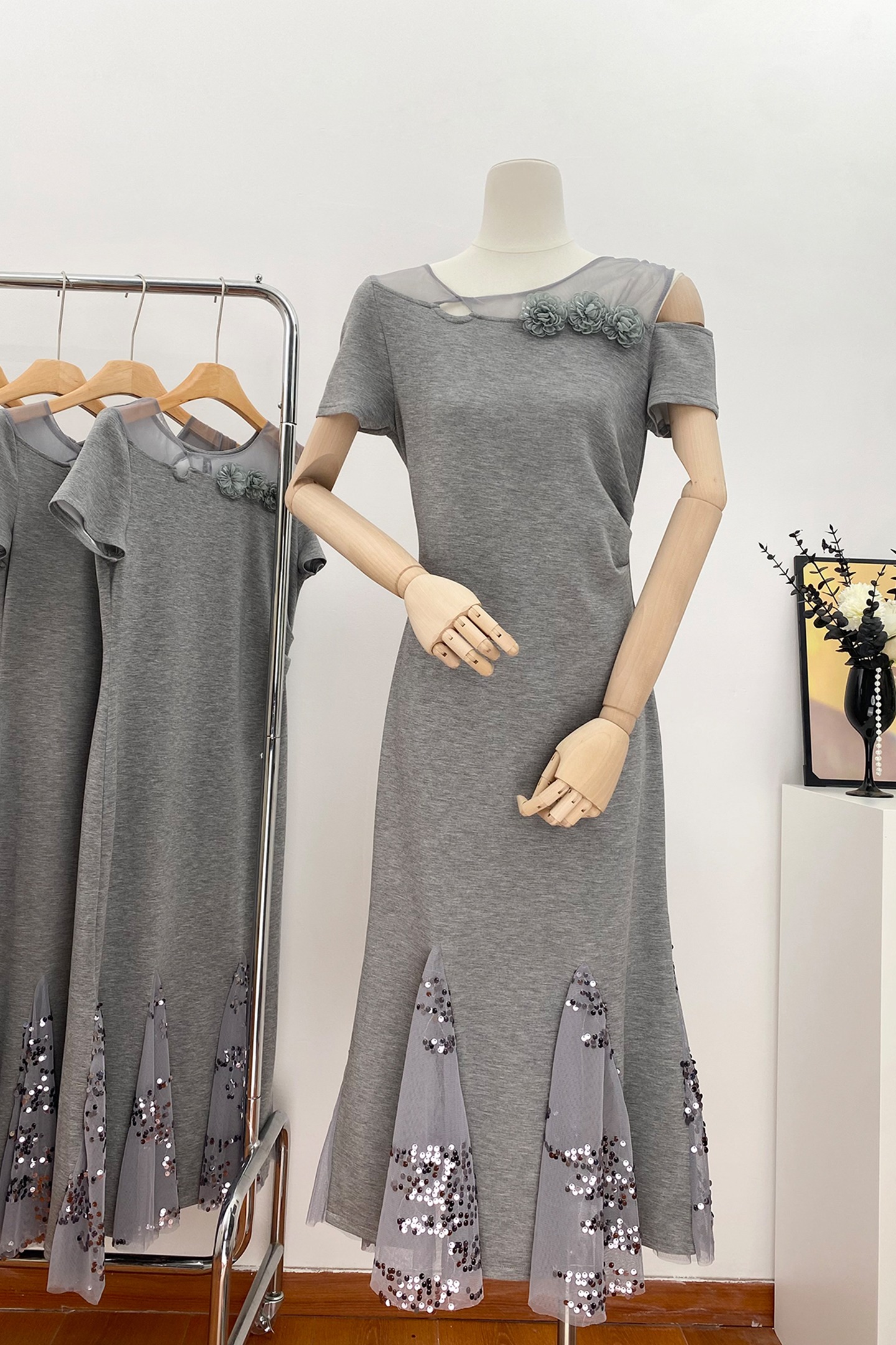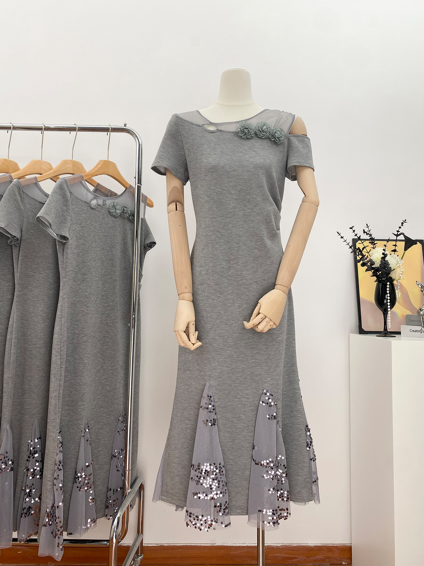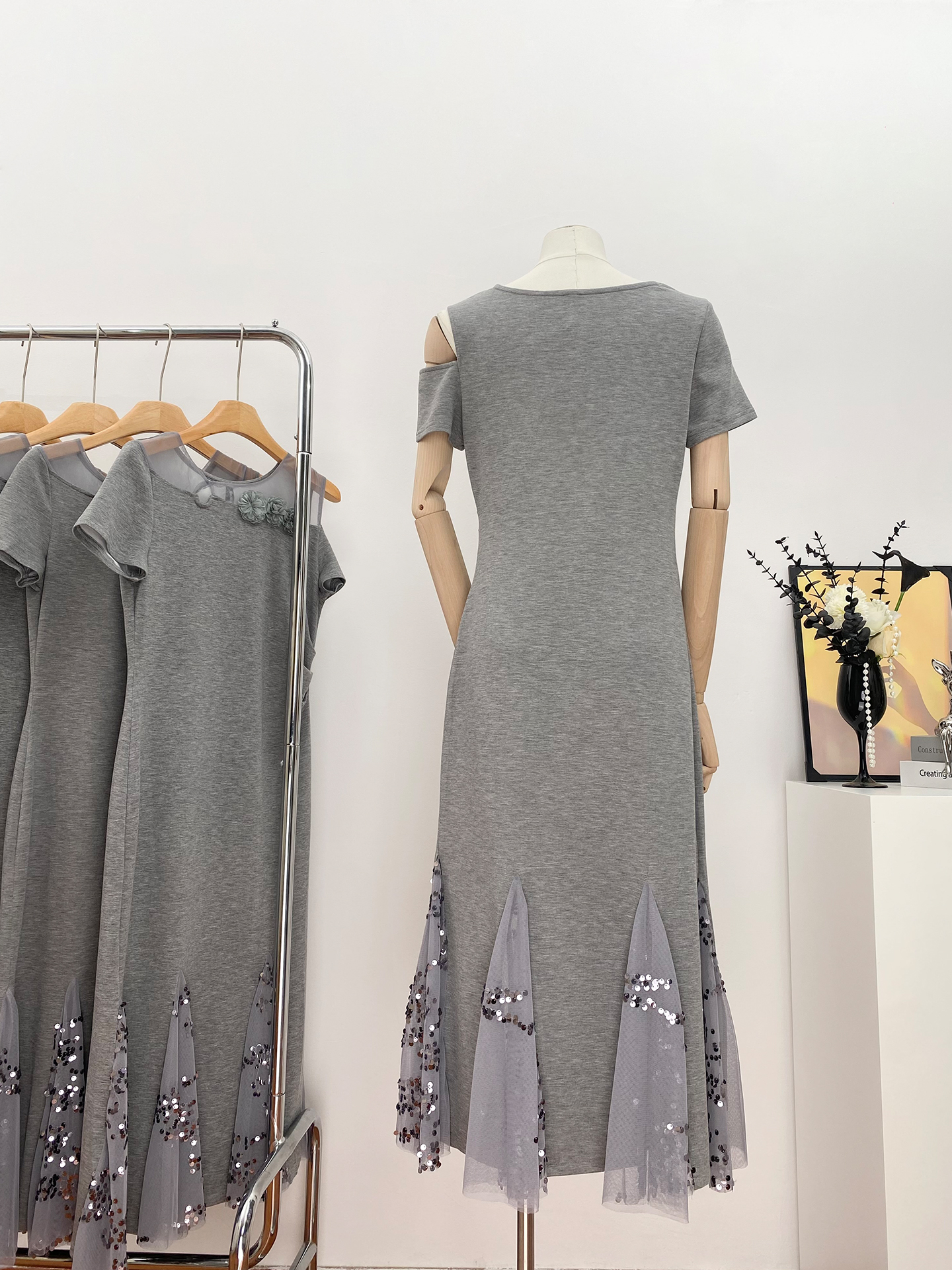 RY3393# 灰色法式露肩连衣裙女2026夏季显瘦减龄超好看独特漂亮高级感裙子