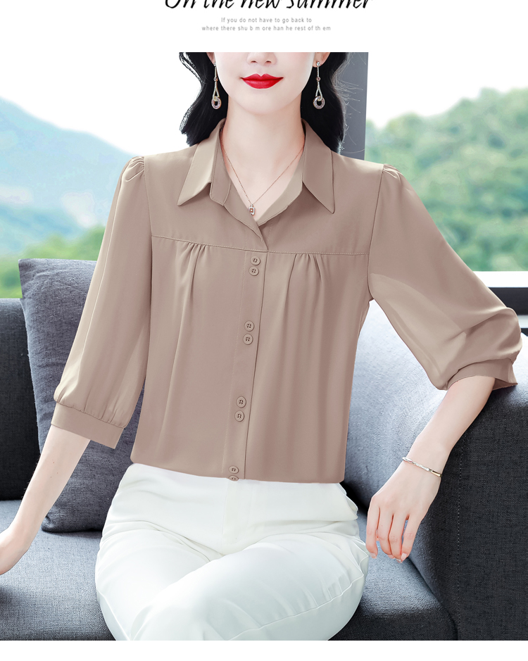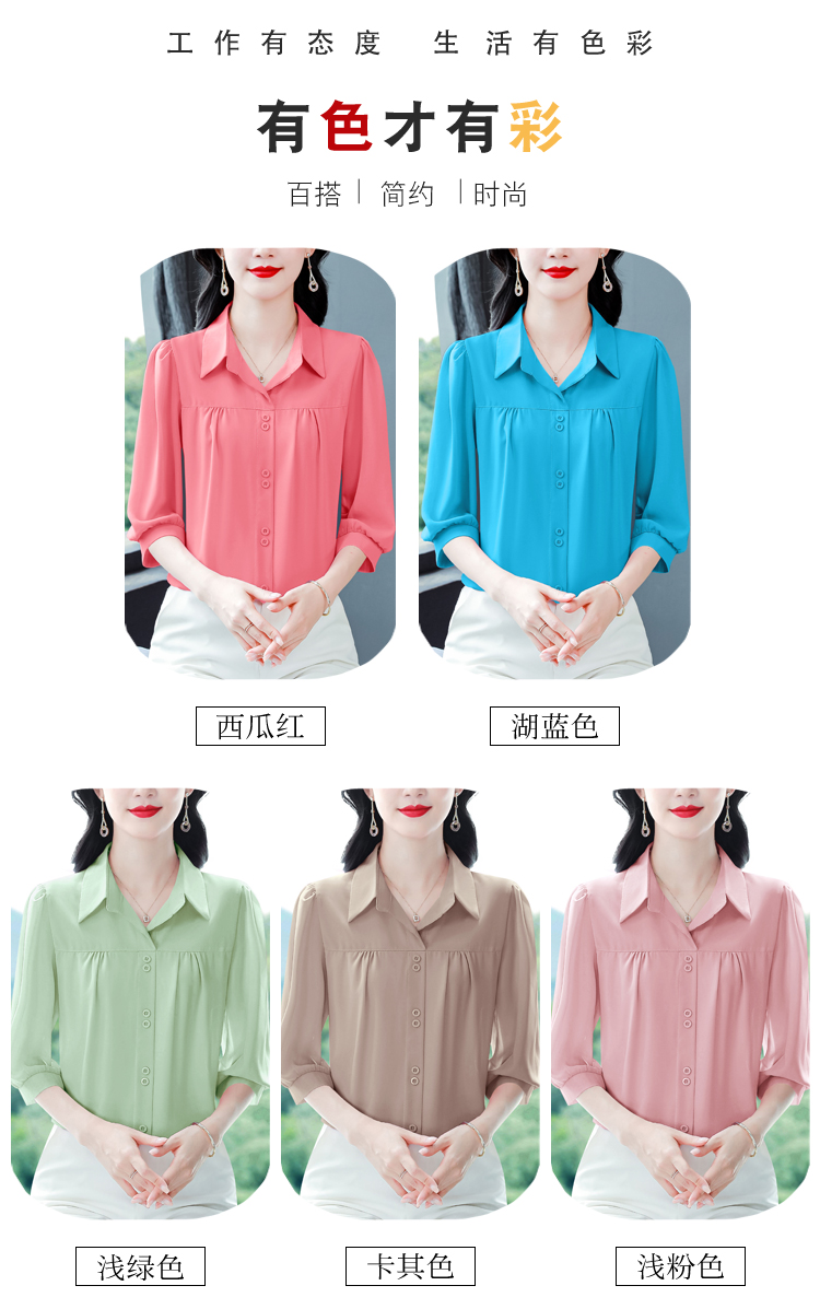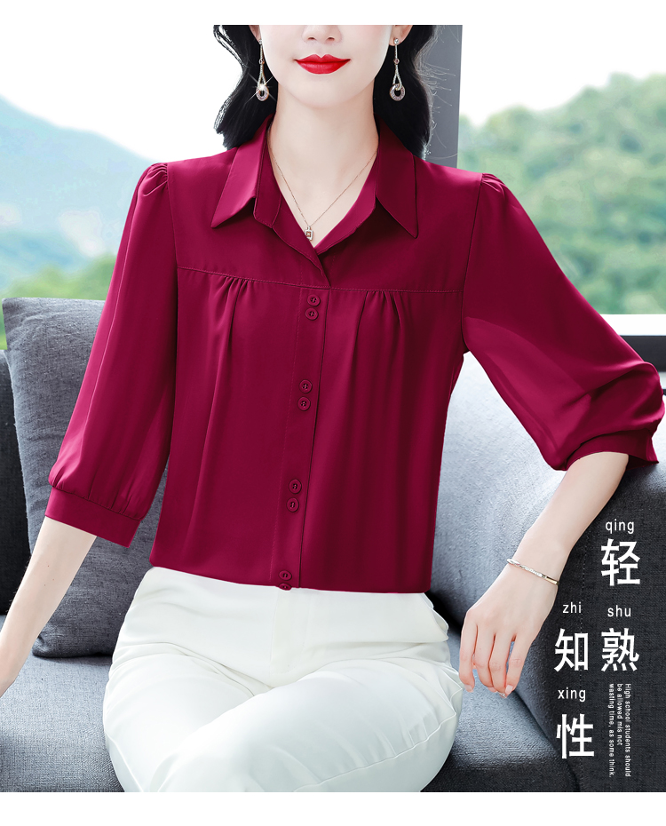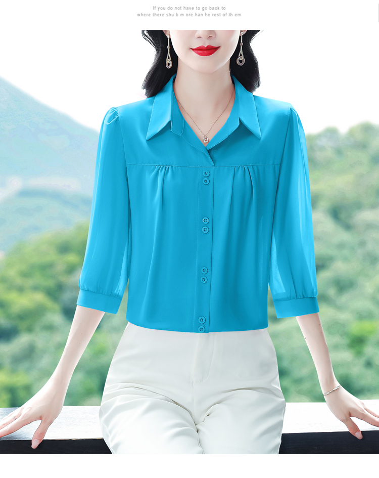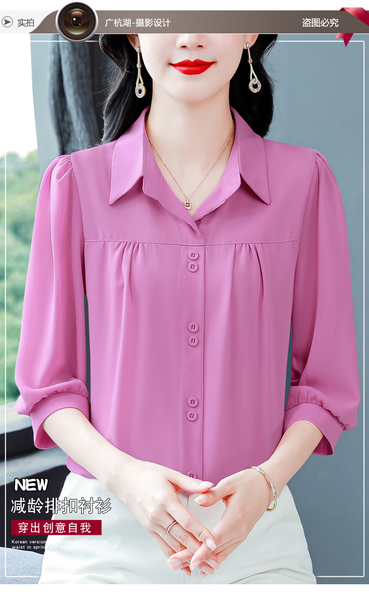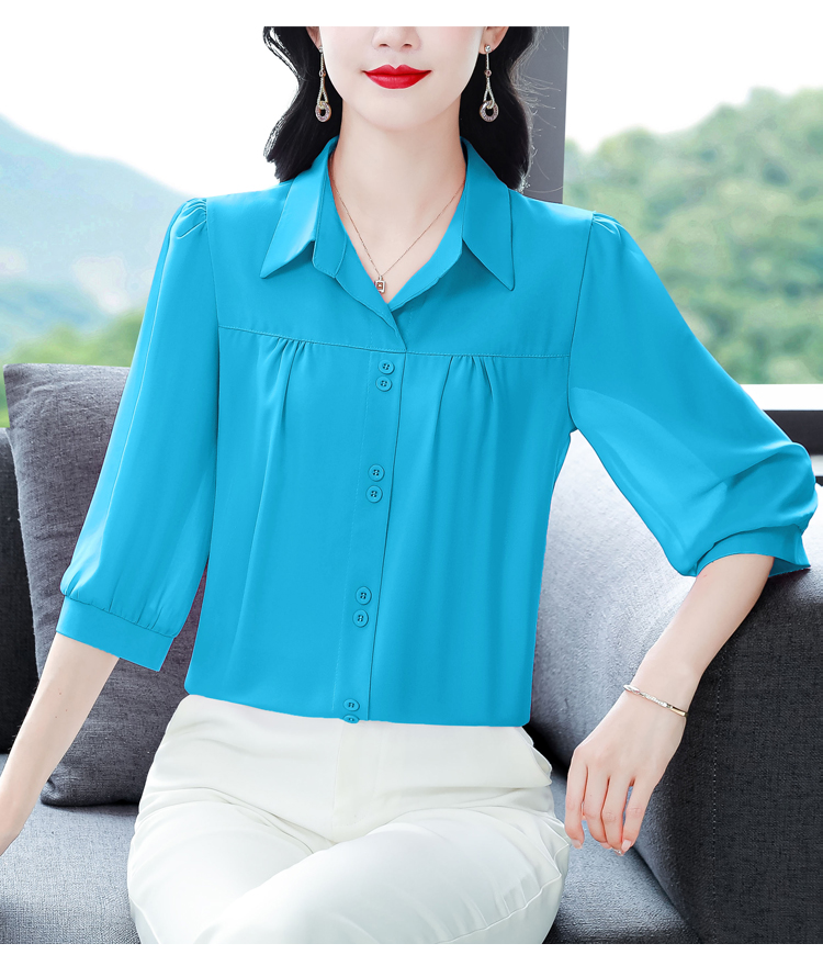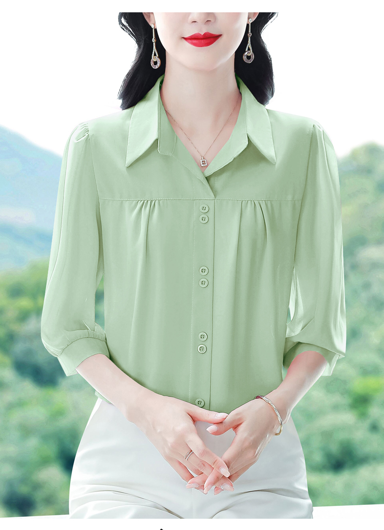 RY3530# 春夏新款七分袖真丝桑蚕丝雪纺翻领开襟衬衫防晒气质显瘦遮肚上...