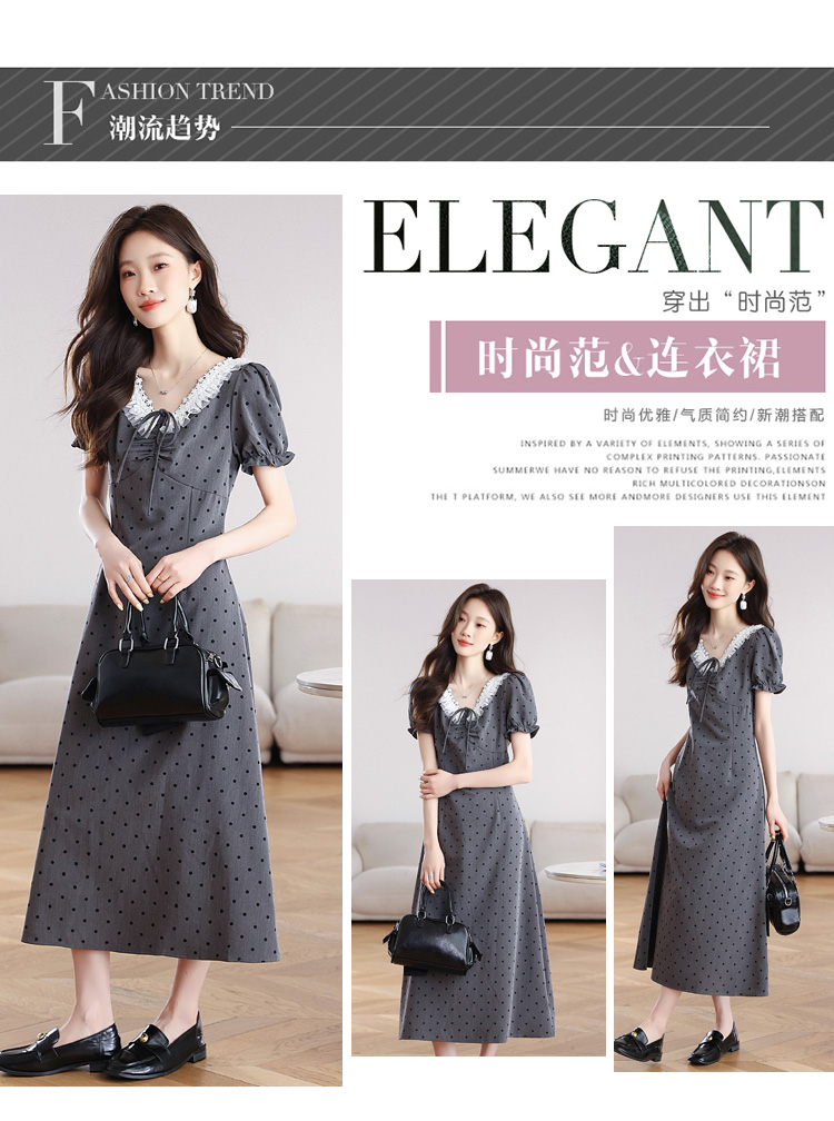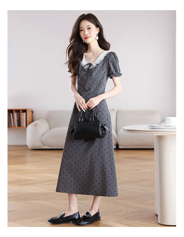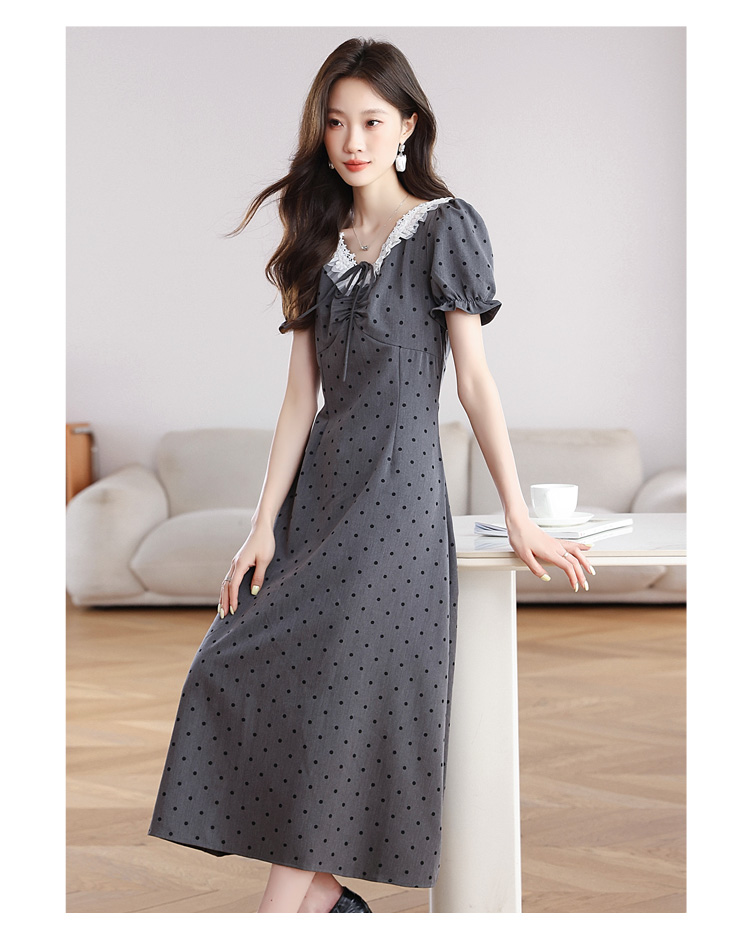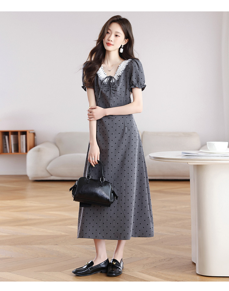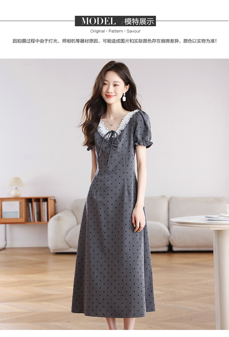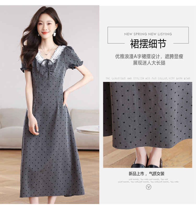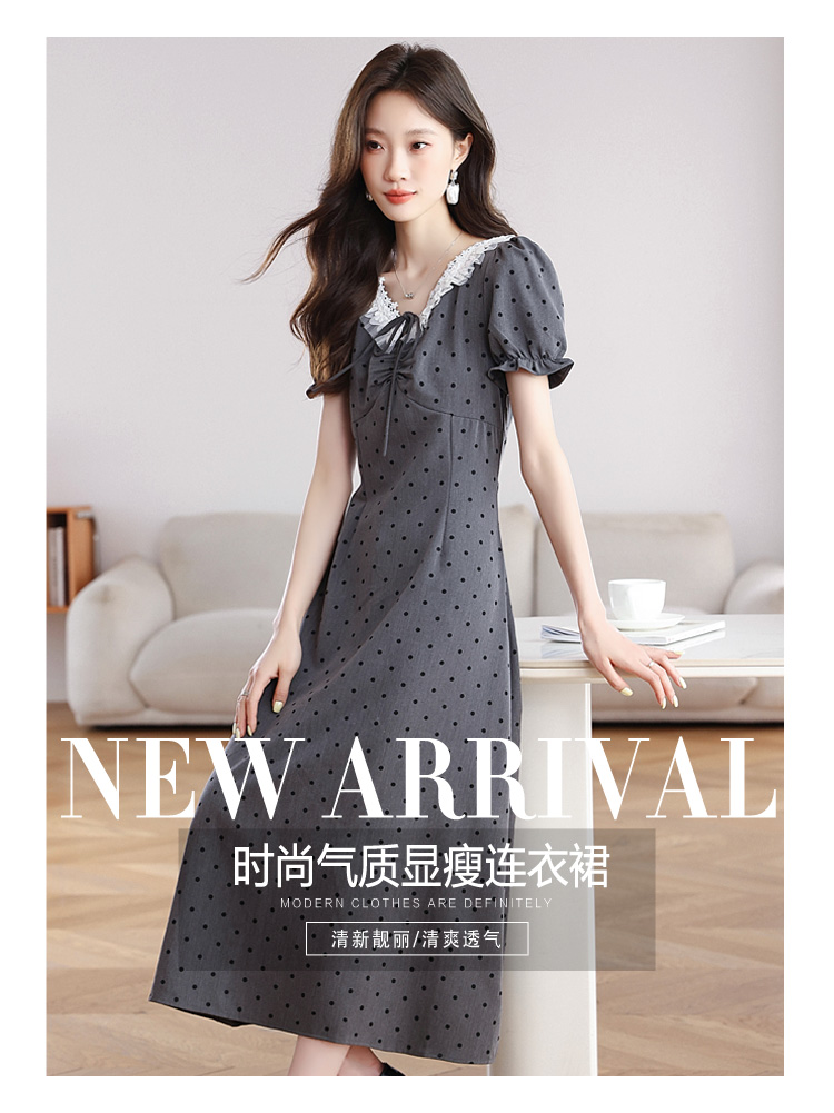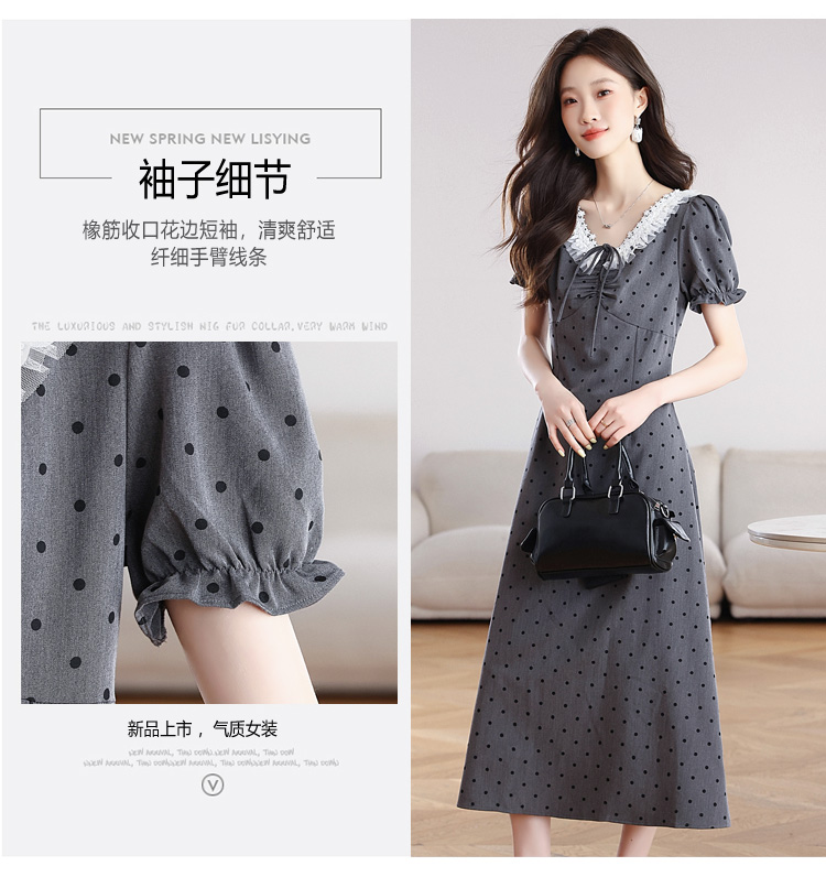 RY3403# 实拍 盐系少女2026灰色连衣裙女夏季梨形收腰设计感波点裙