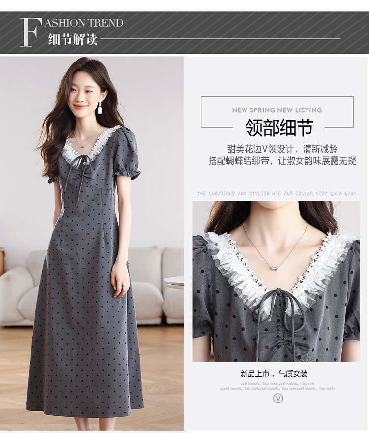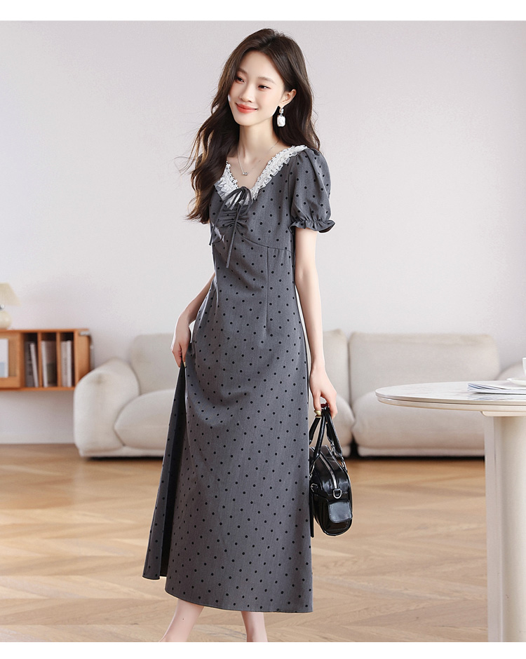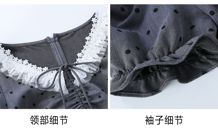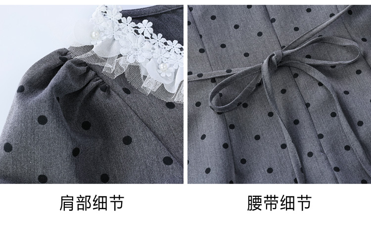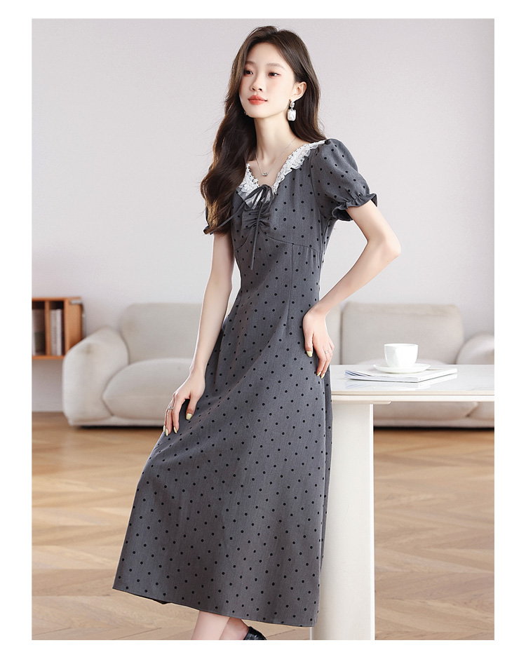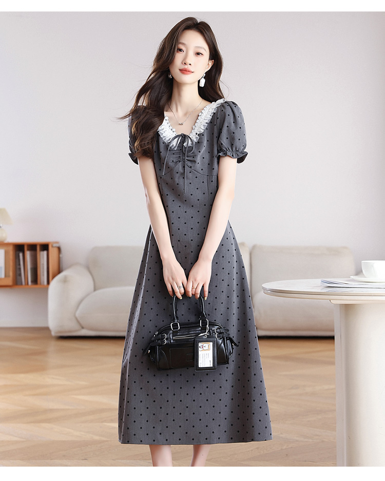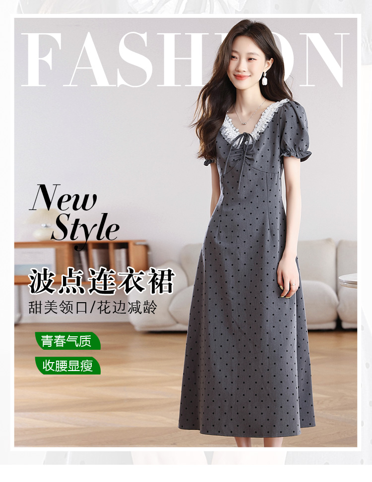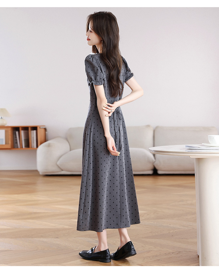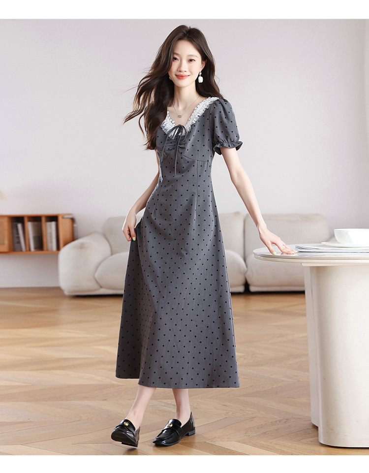 RY3403# 实拍 盐系少女2026灰色连衣裙女夏季梨形收腰设计感波点裙