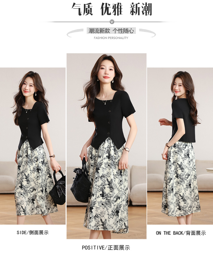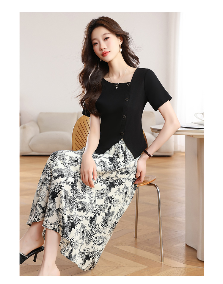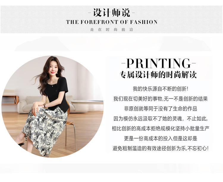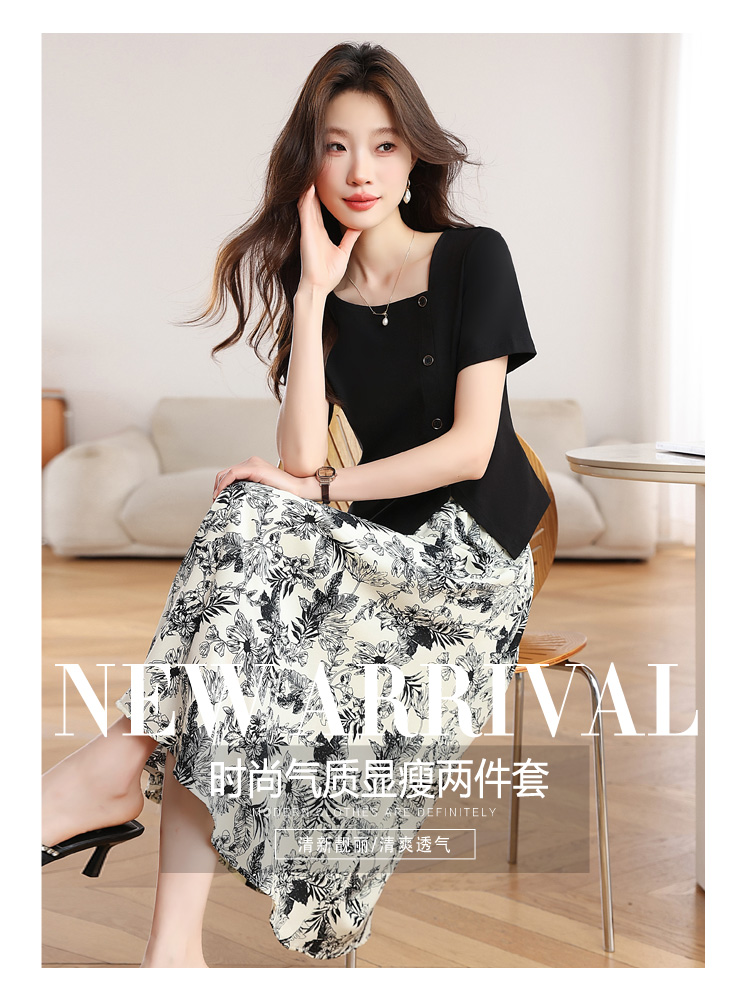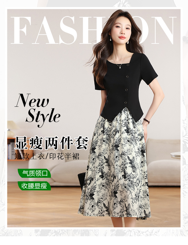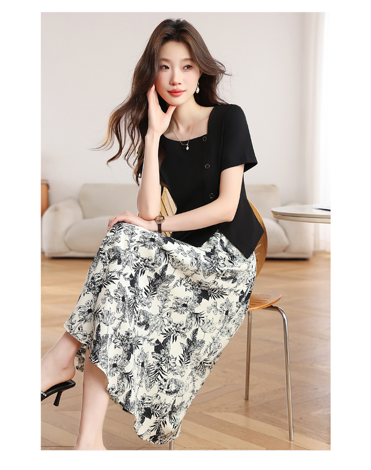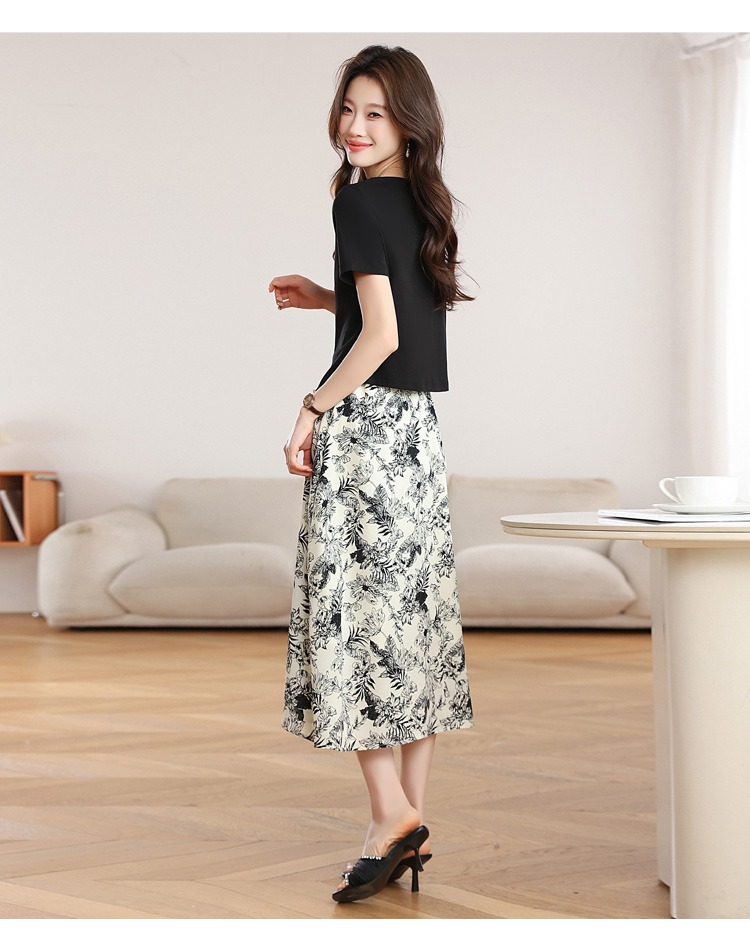RY3408# 实拍 气质国风水墨印花套装女士夏装新款方领T恤半身裙子两件套