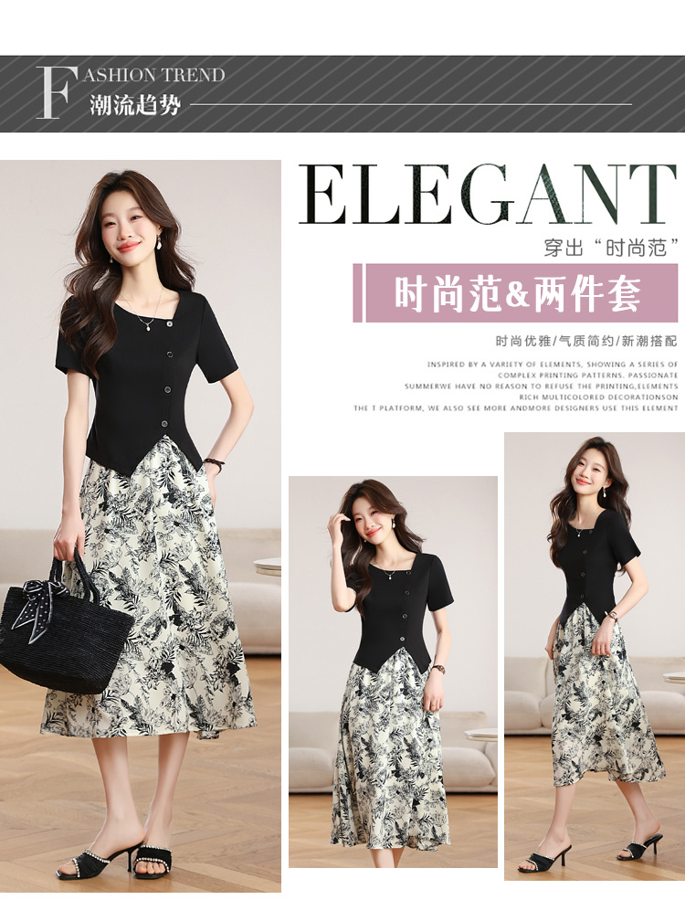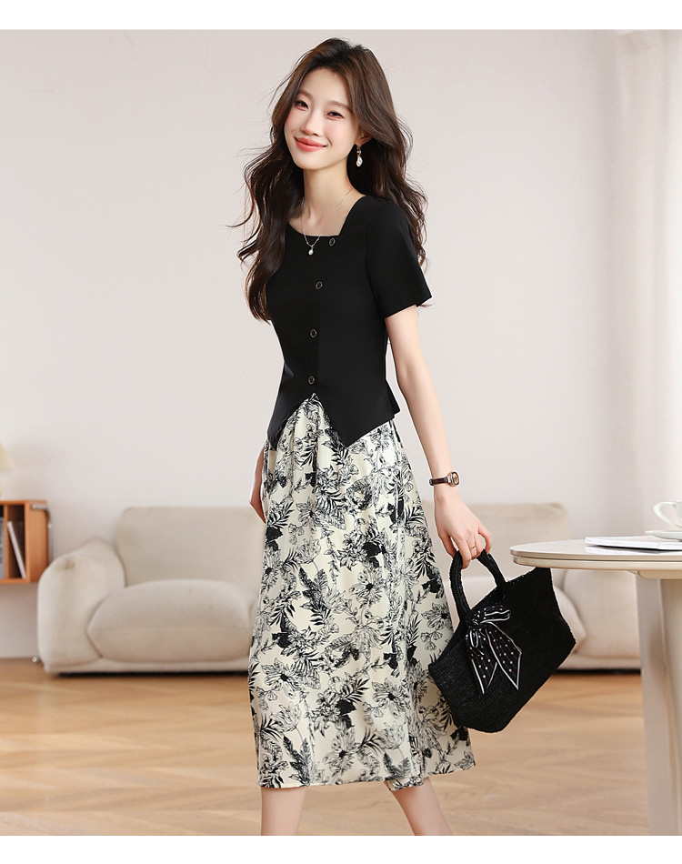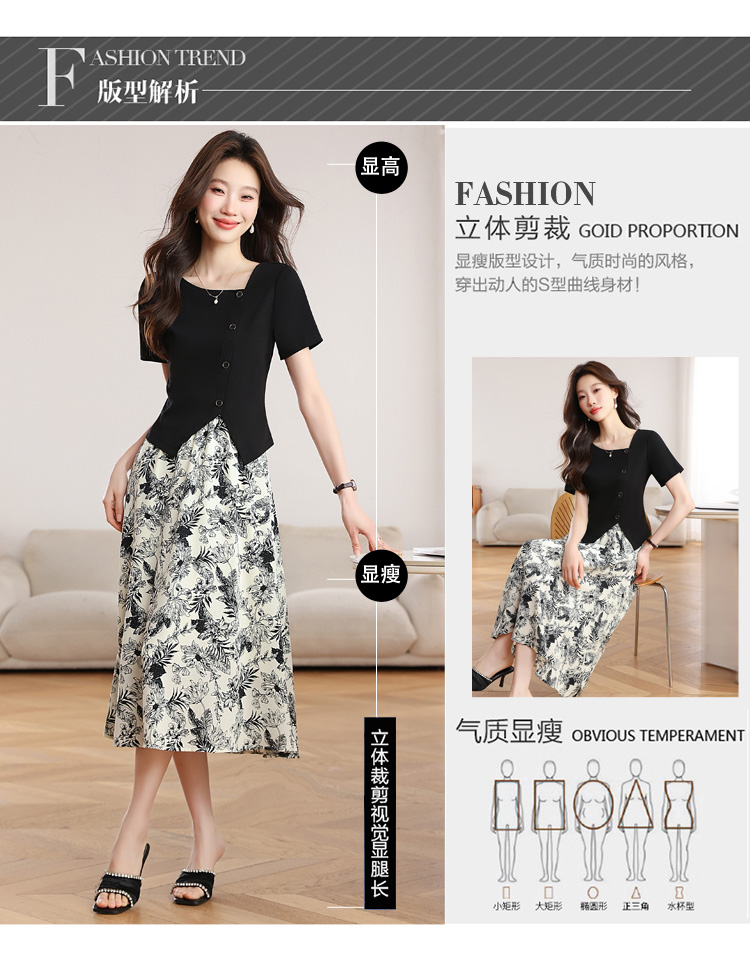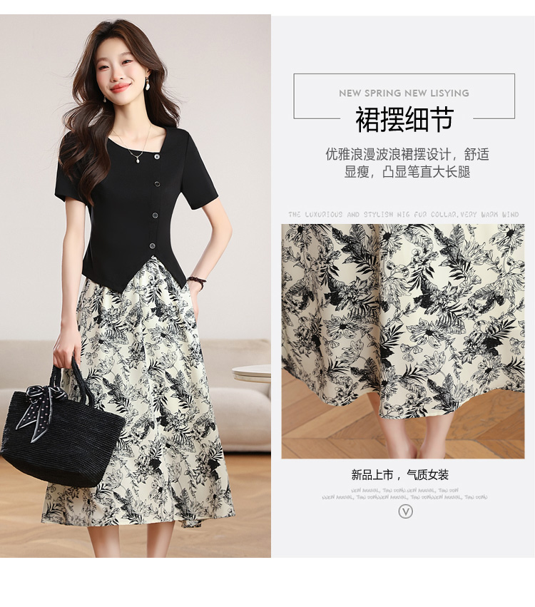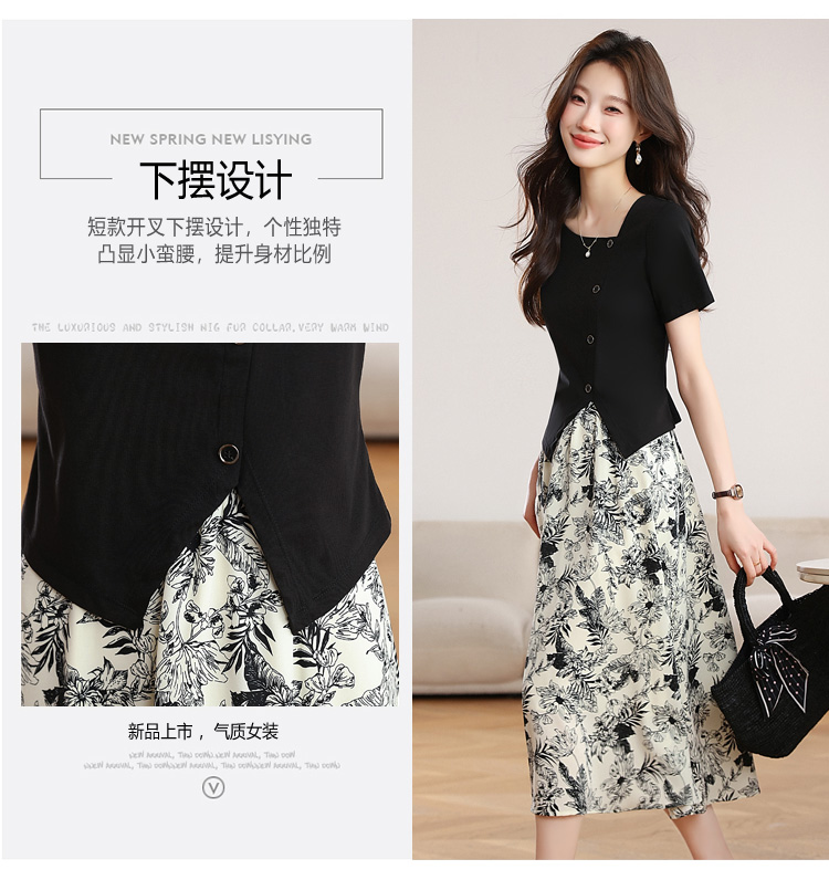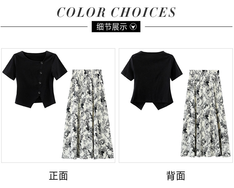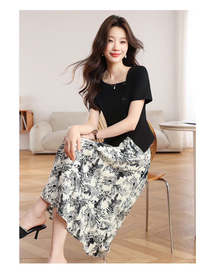 RY3408# 实拍 气质国风水墨印花套装女士夏装新款方领T恤半身裙子两件套