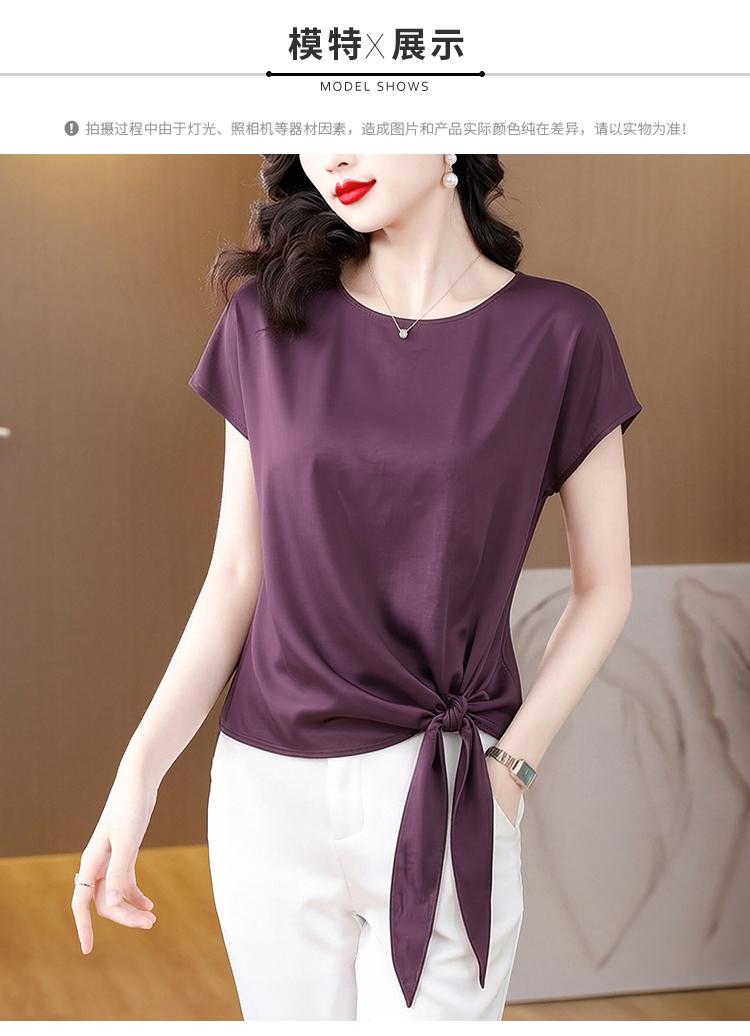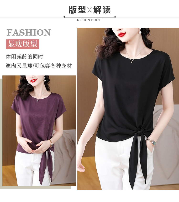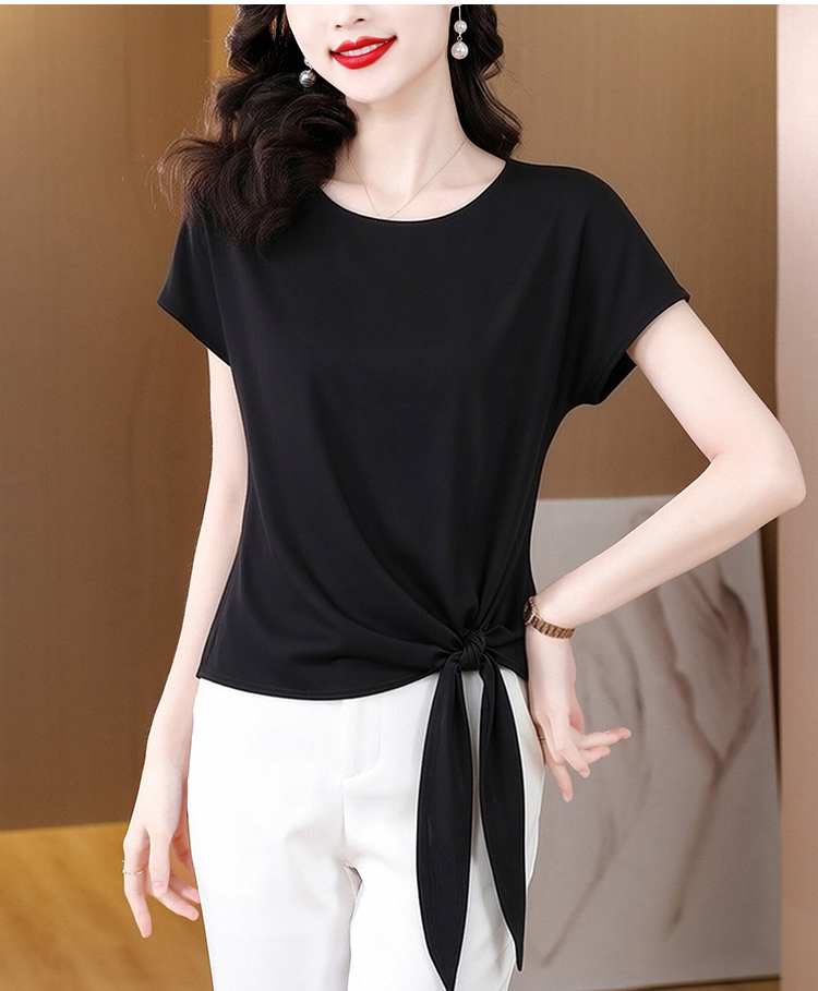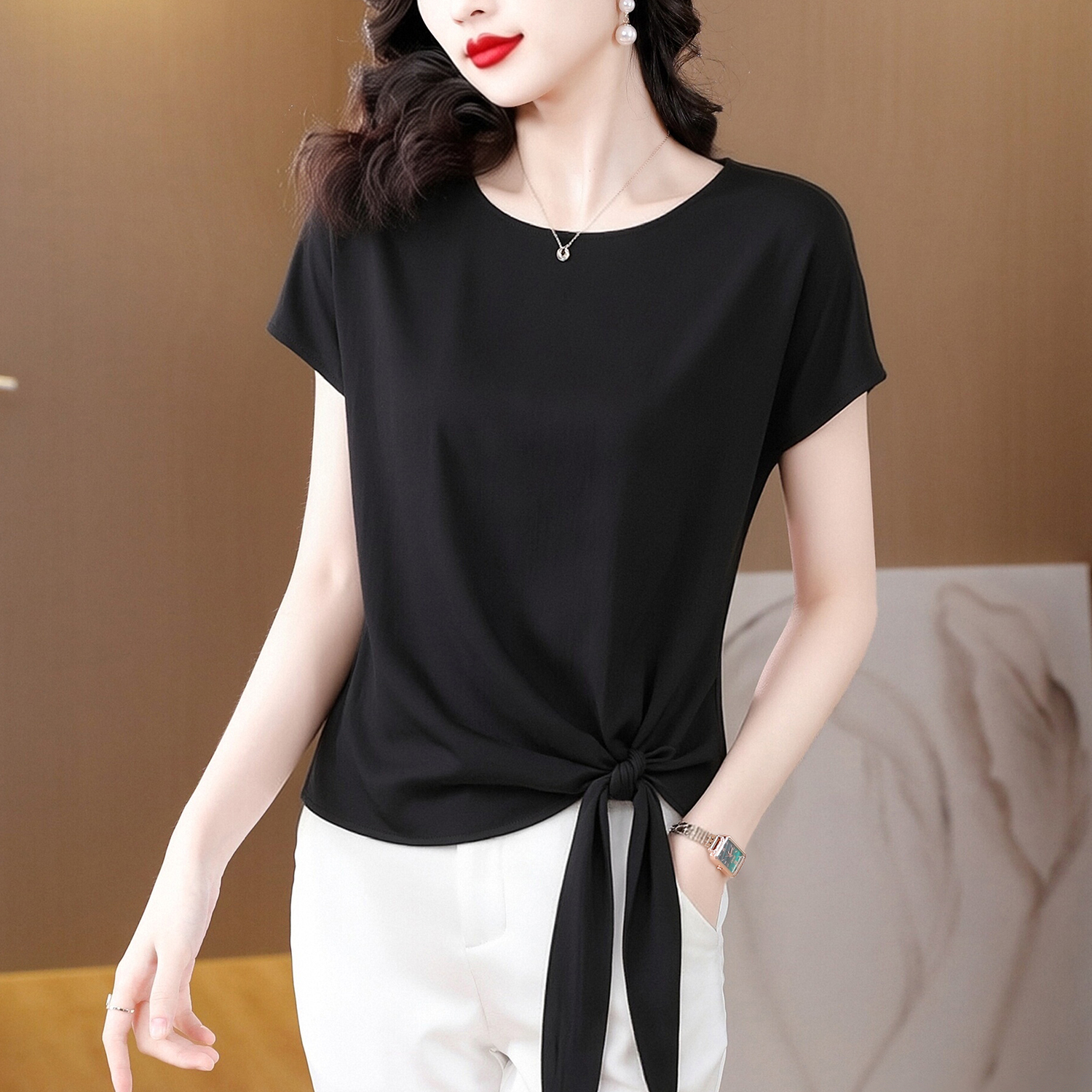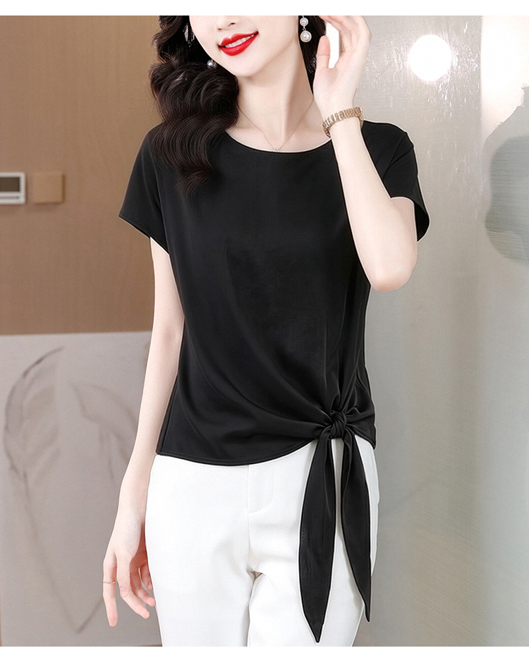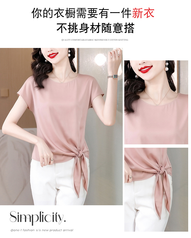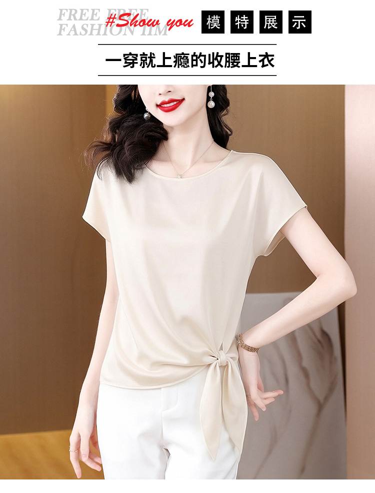 RY3429# 实拍夏季新款韩版时尚简约圆领设计纯色软糯系带收腰短袖上衣女