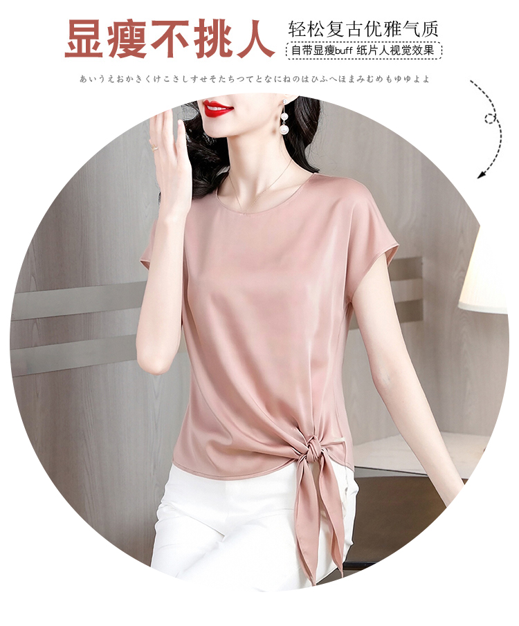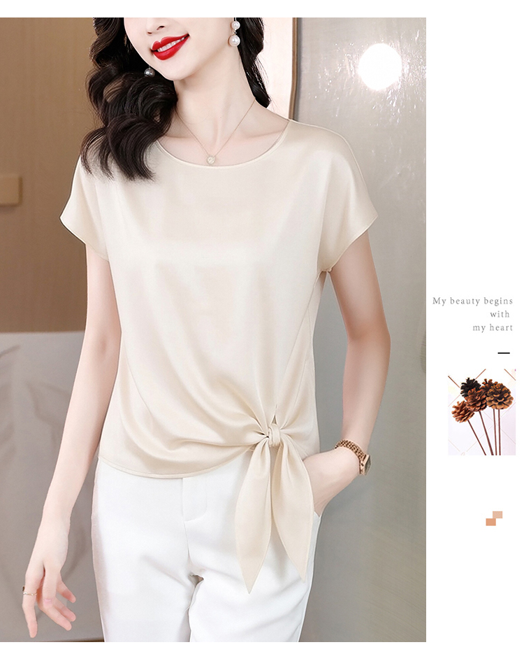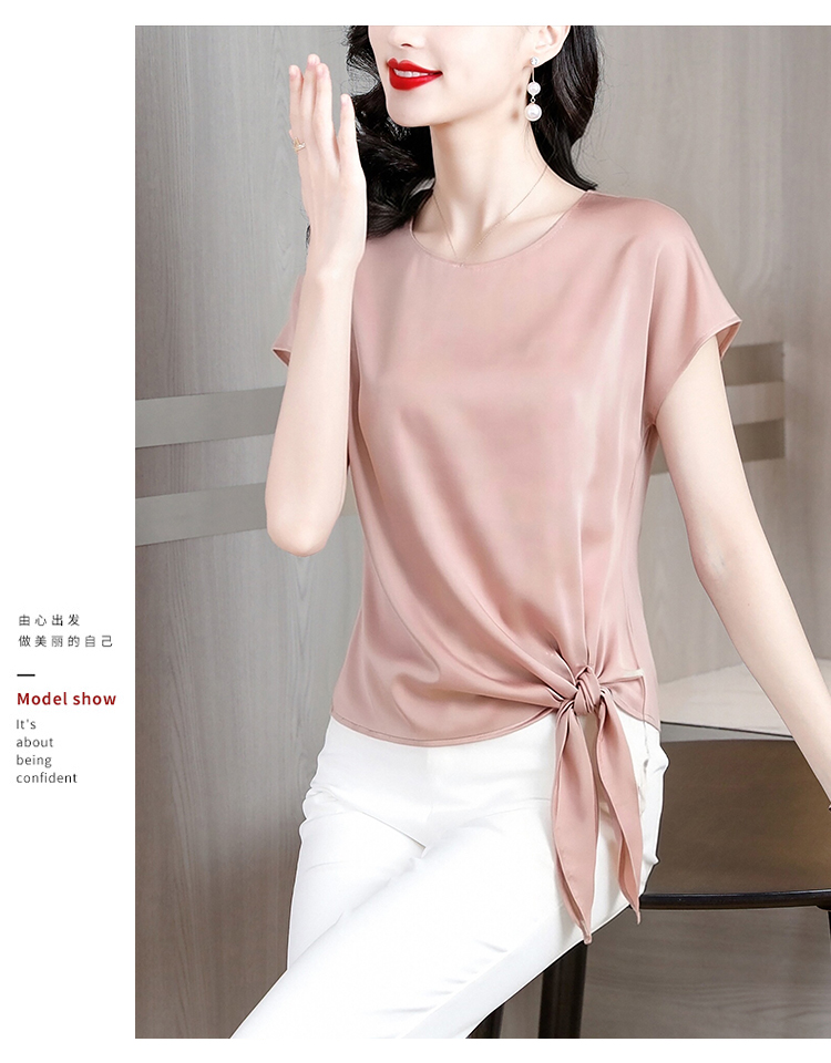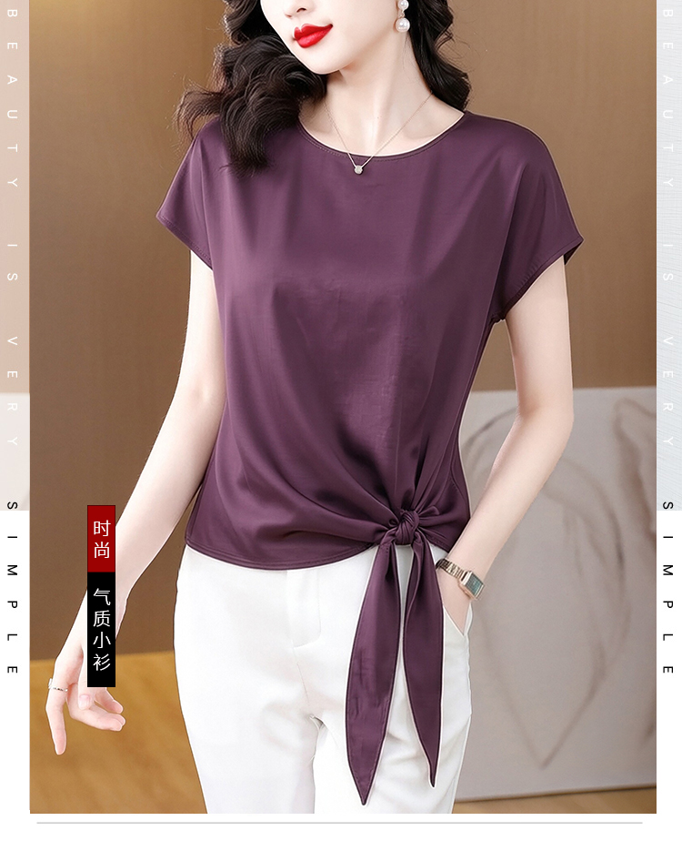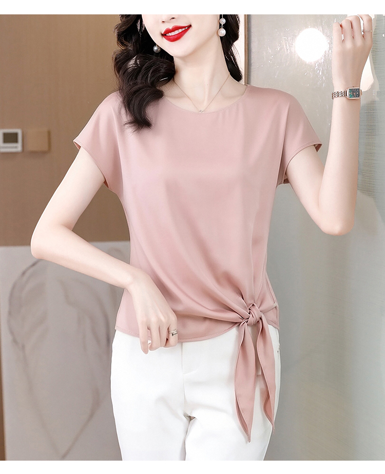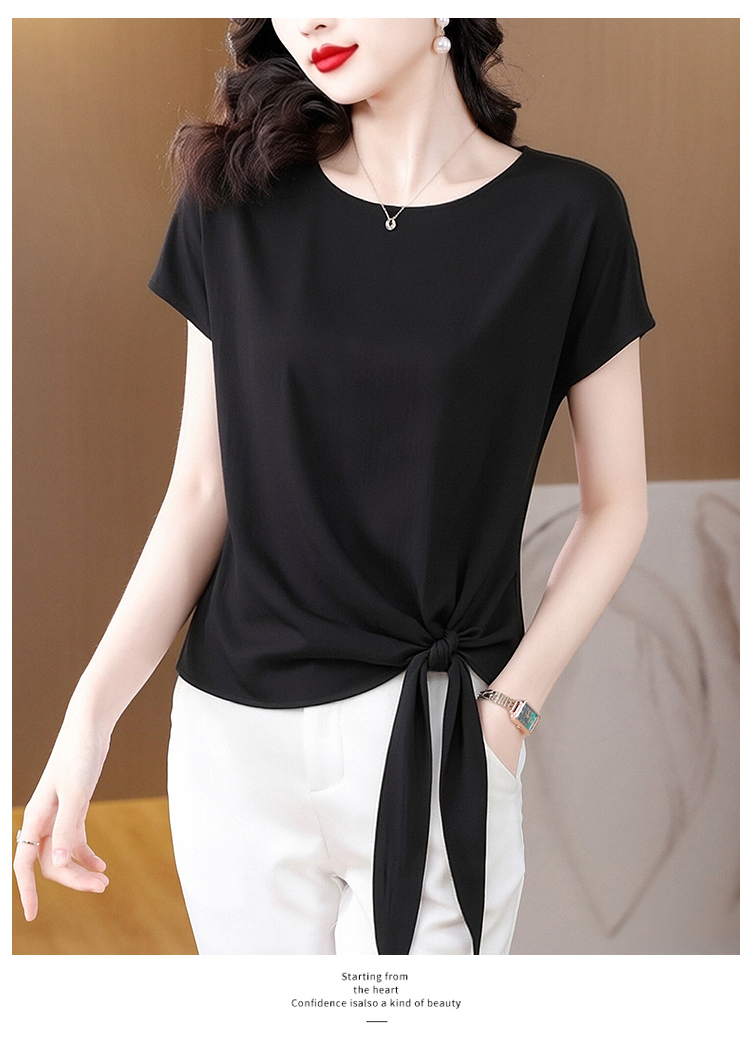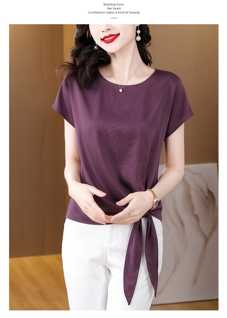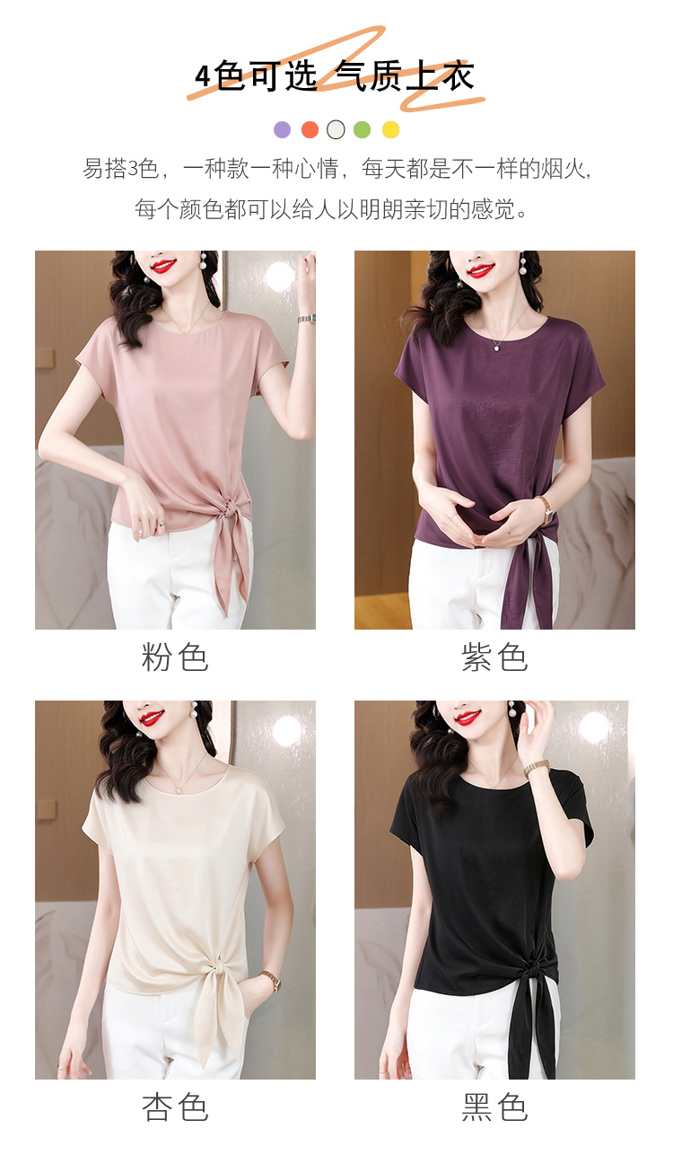 RY3429# 实拍夏季新款韩版时尚简约圆领设计纯色软糯系带收腰短袖上衣女