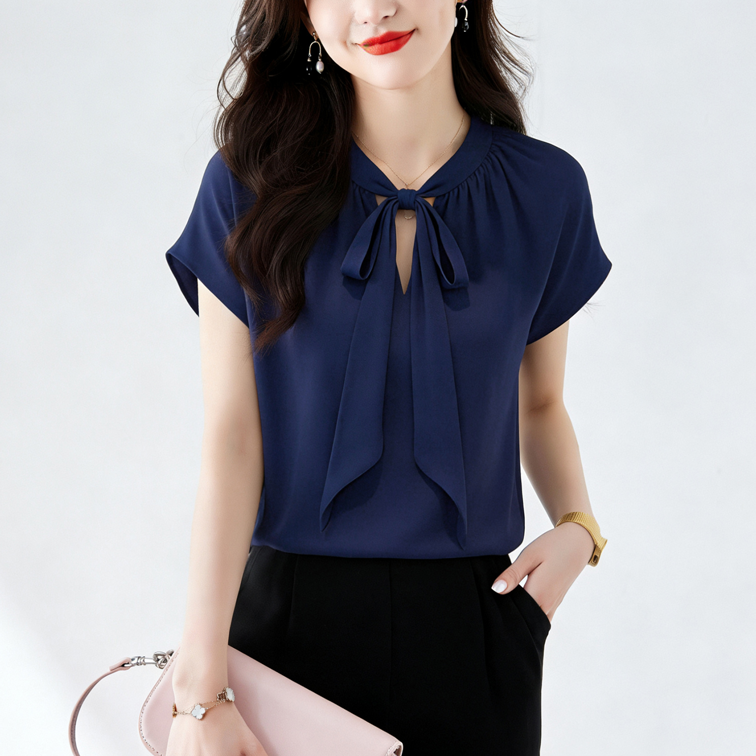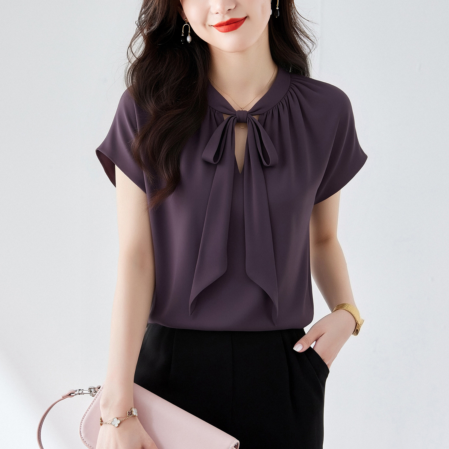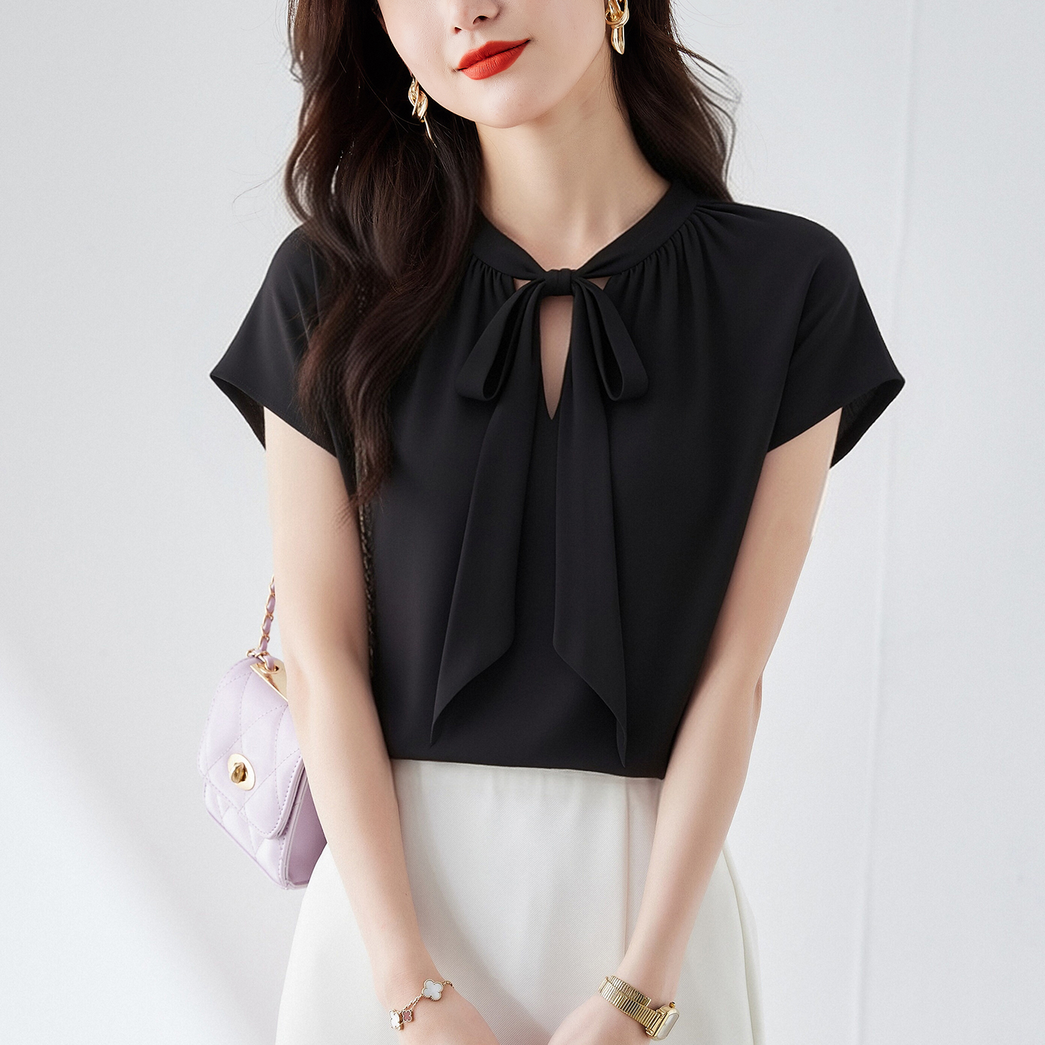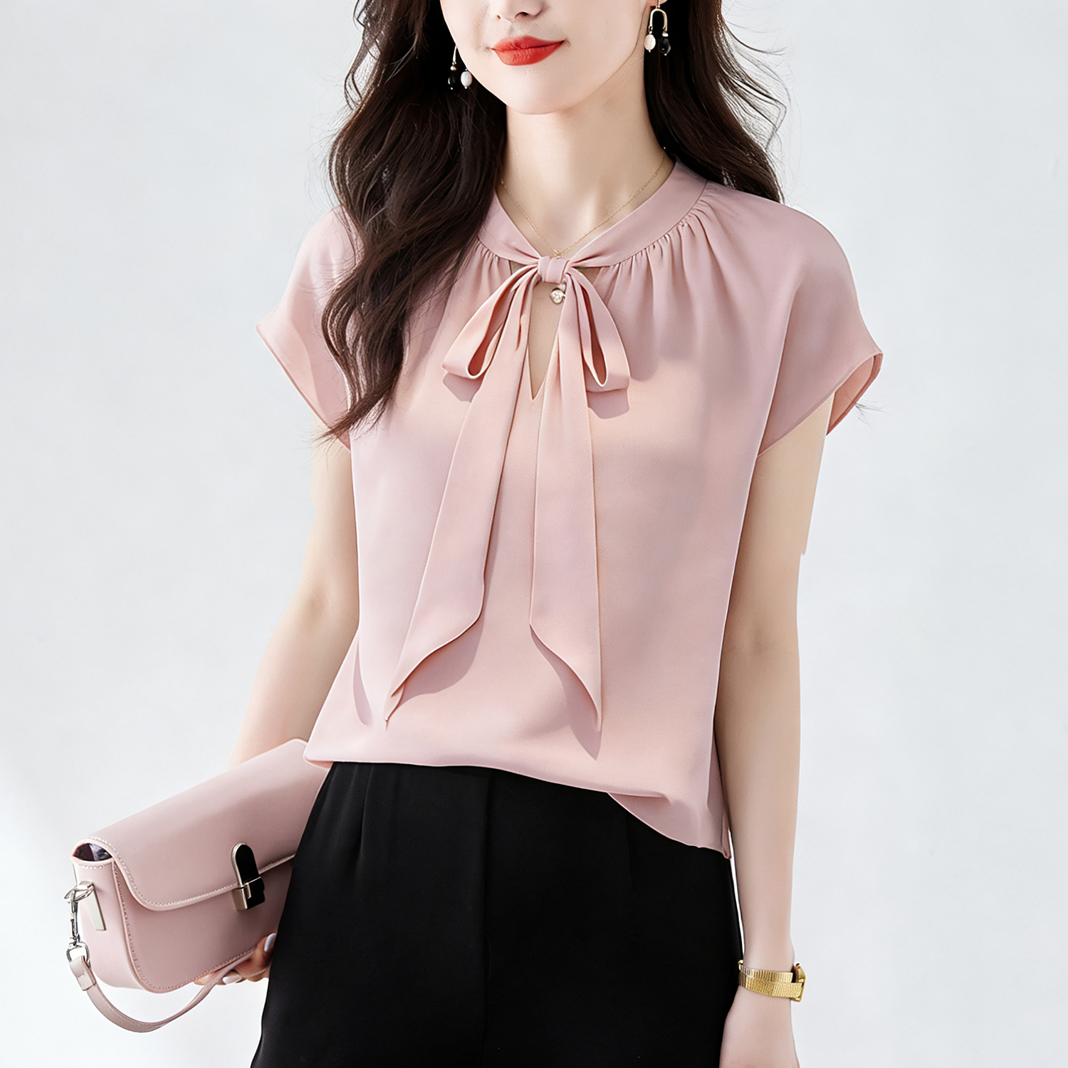 RY3432# 实拍优雅风显白系带雪纺衬衫时髦通勤气质百搭小衫女2026夏季新款