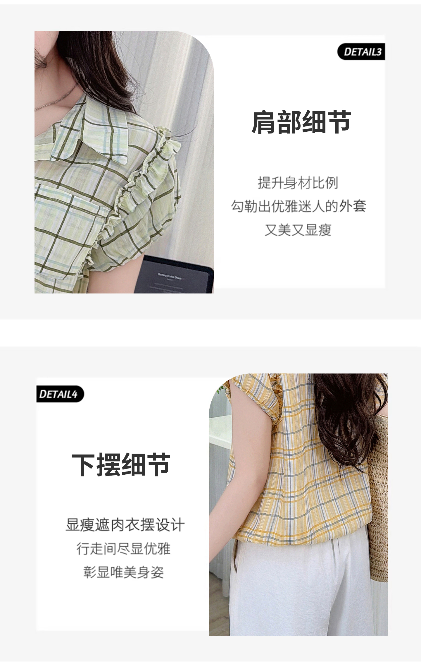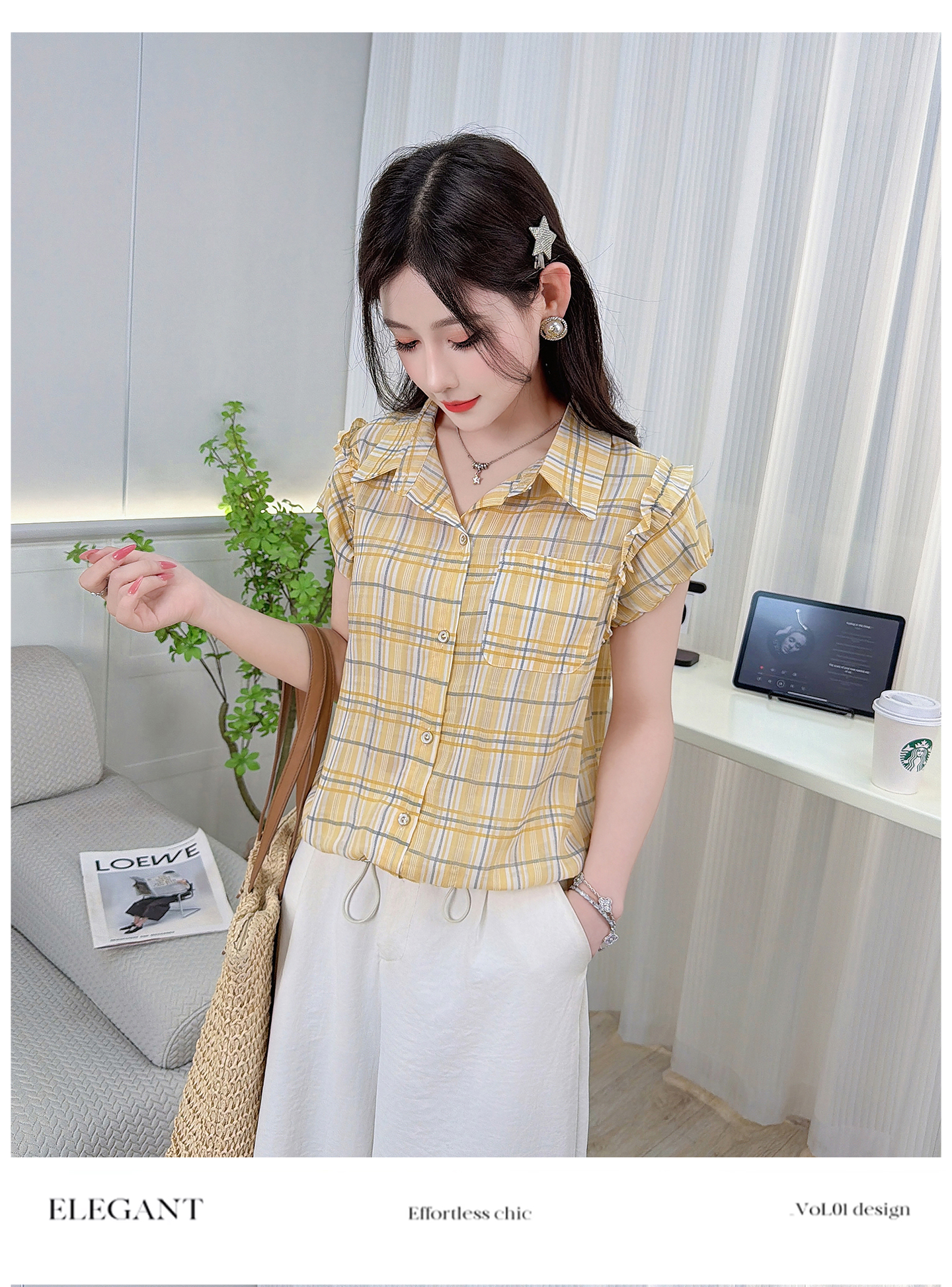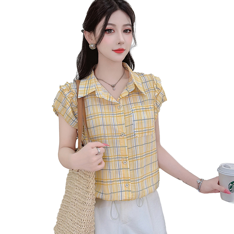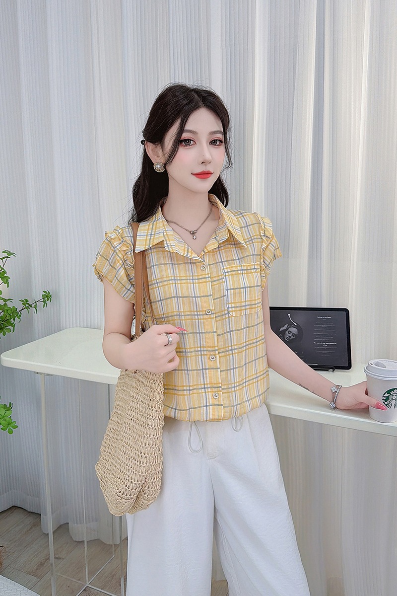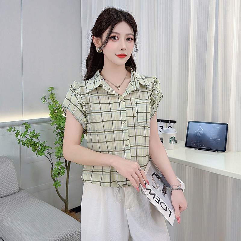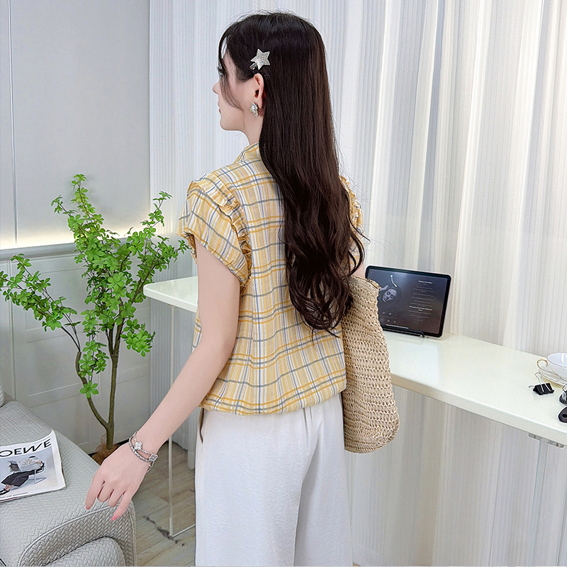 RY3451# 实拍时尚飞飞袖格子衬衫2026夏季新款减龄显瘦遮肚宽松上衣女
