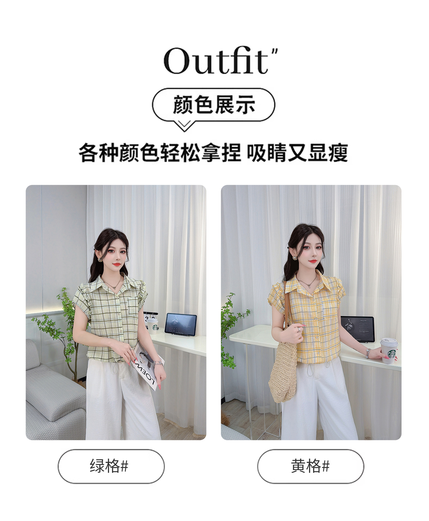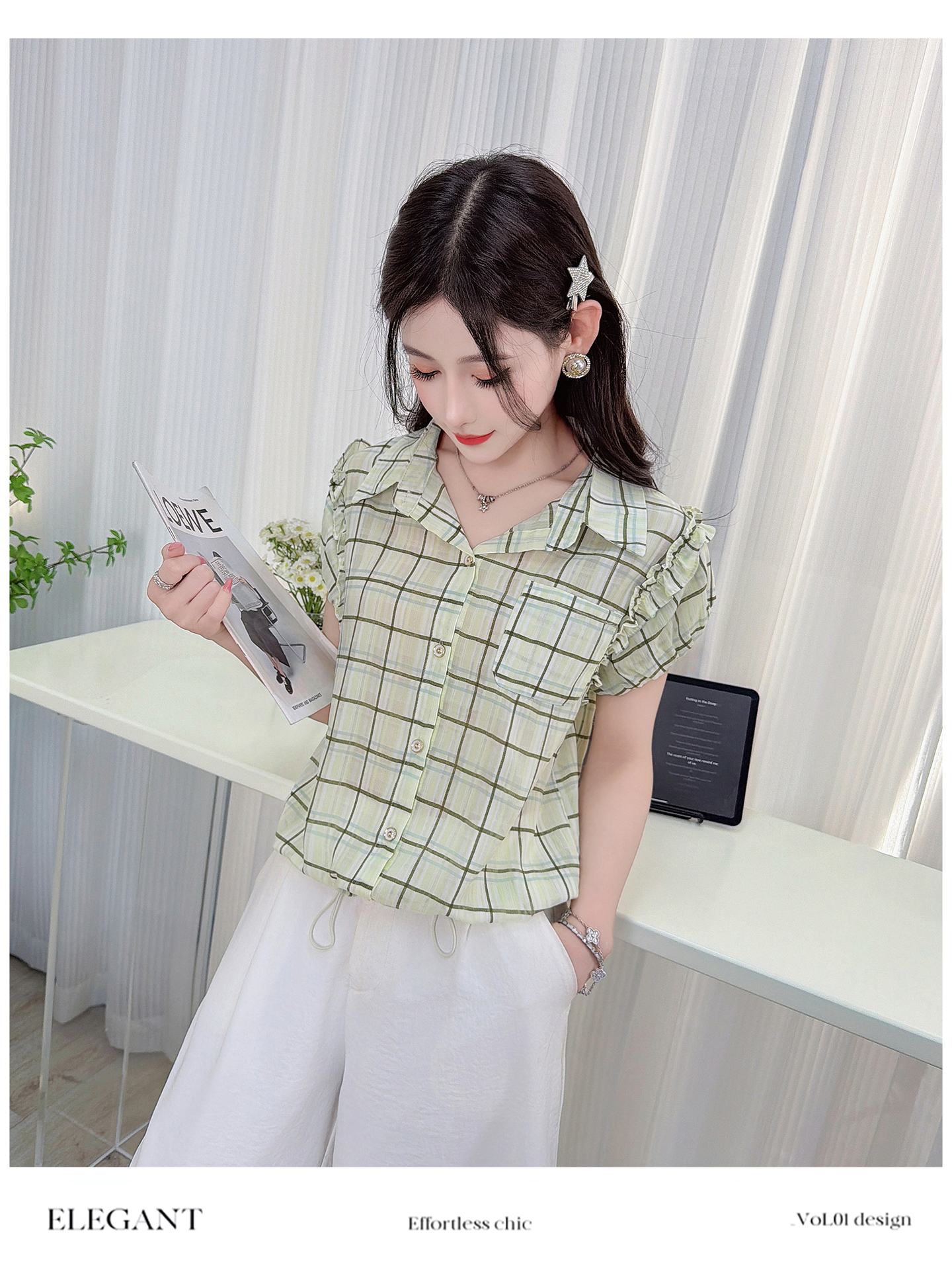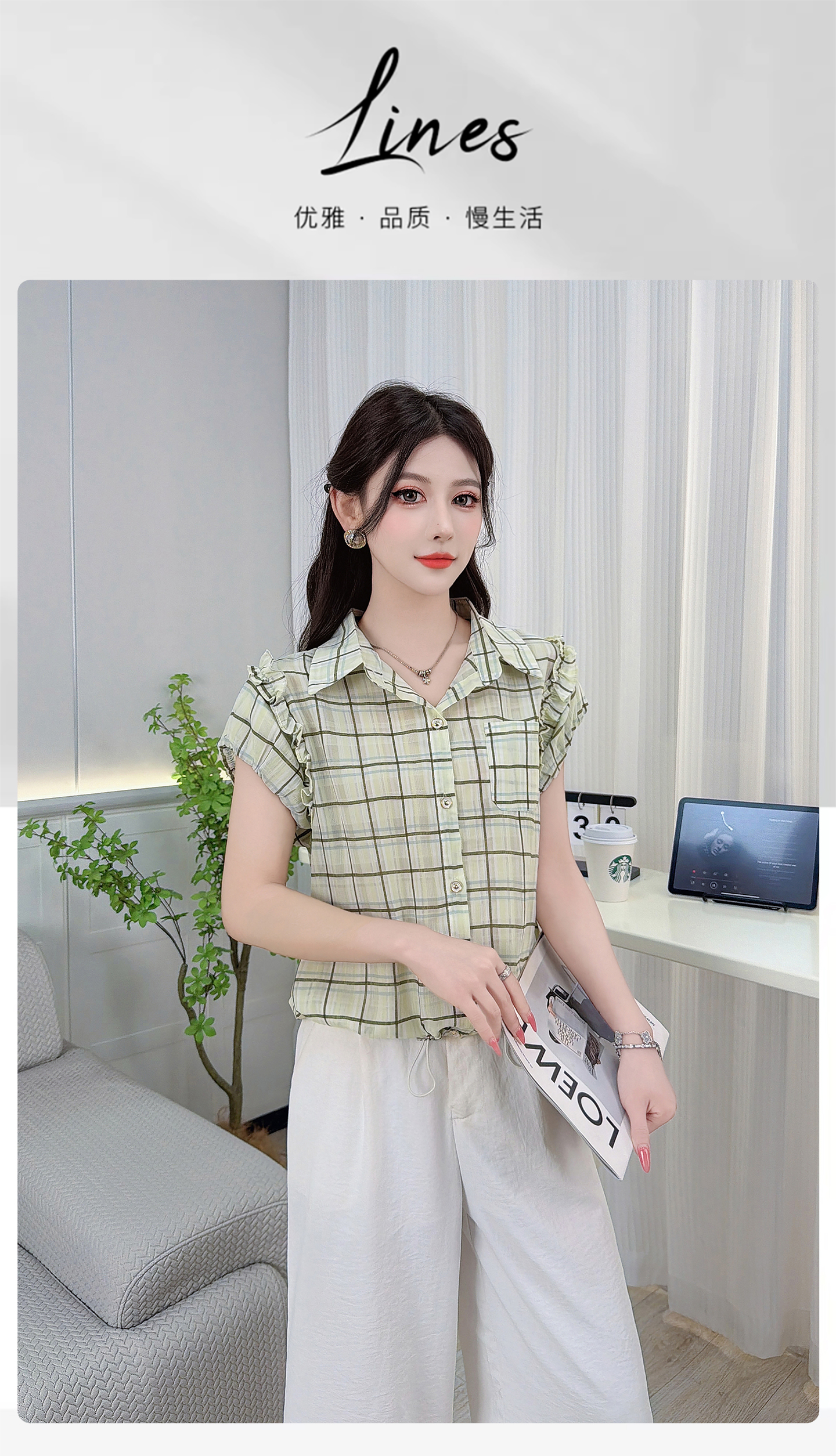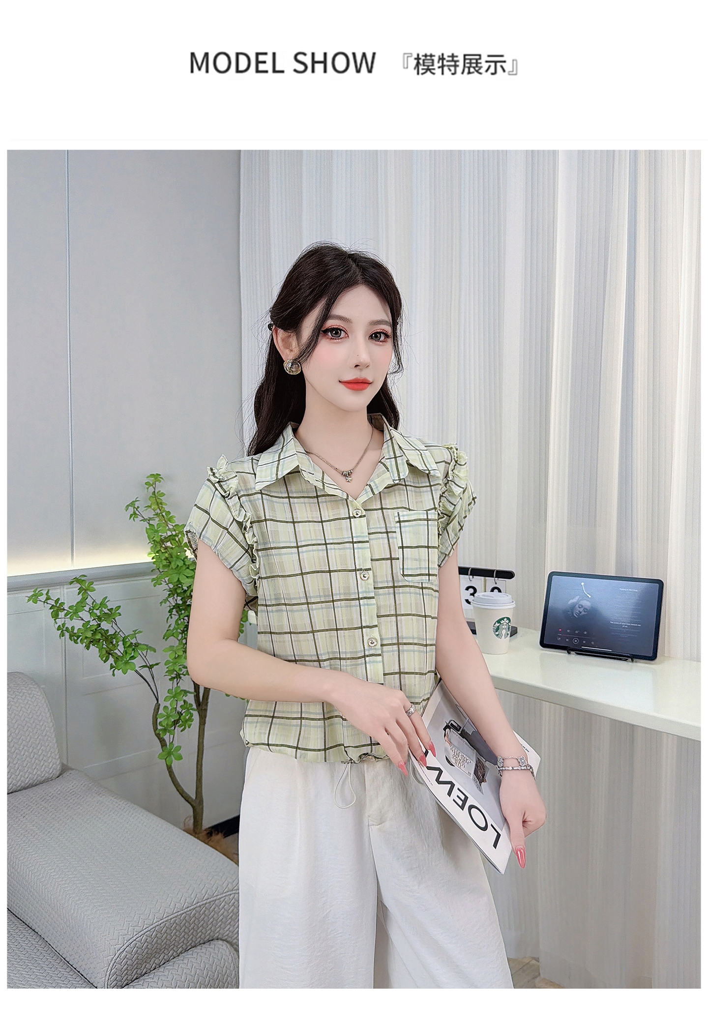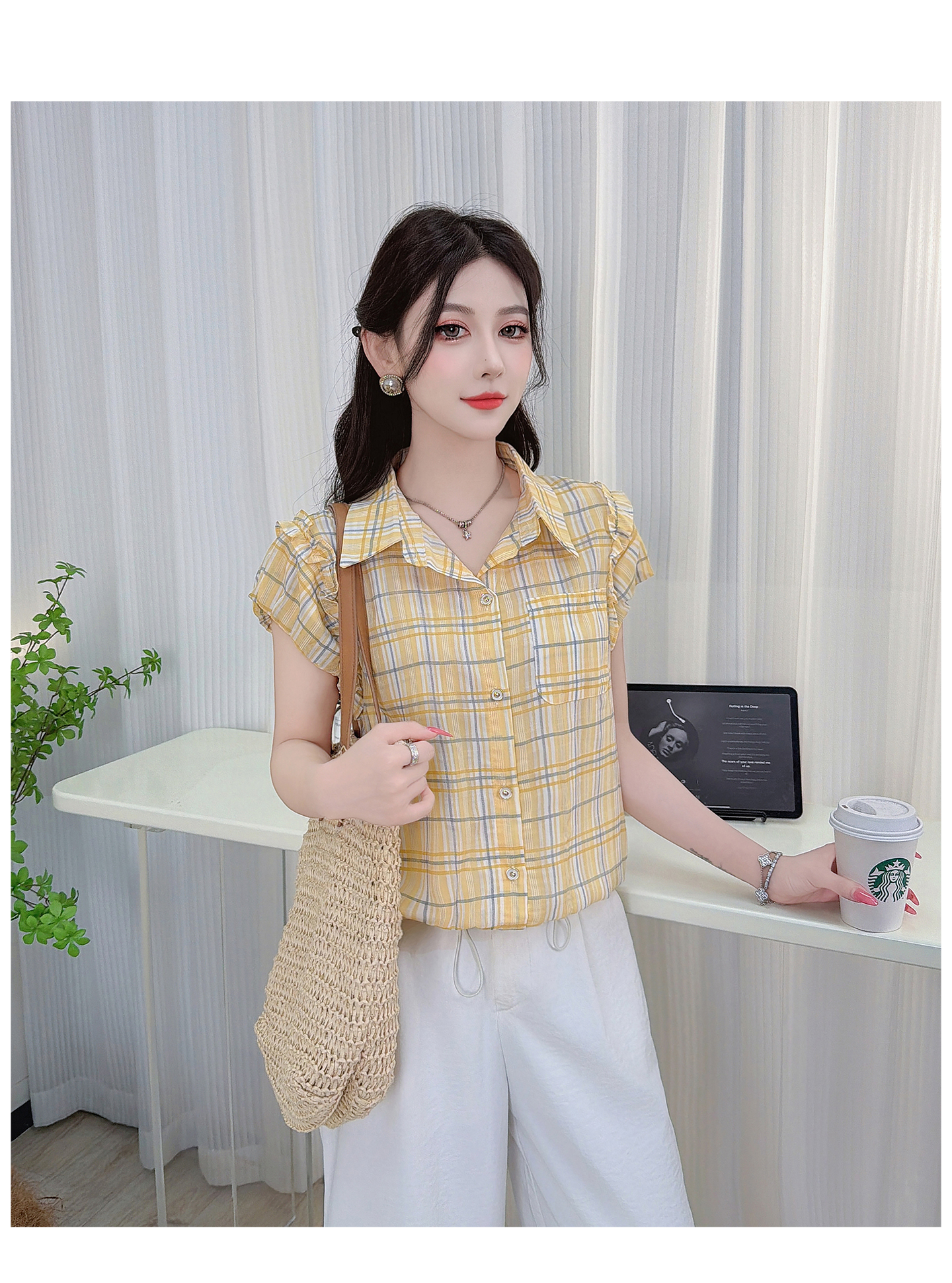 RY3451# 实拍时尚飞飞袖格子衬衫2026夏季新款减龄显瘦遮肚宽松上衣女