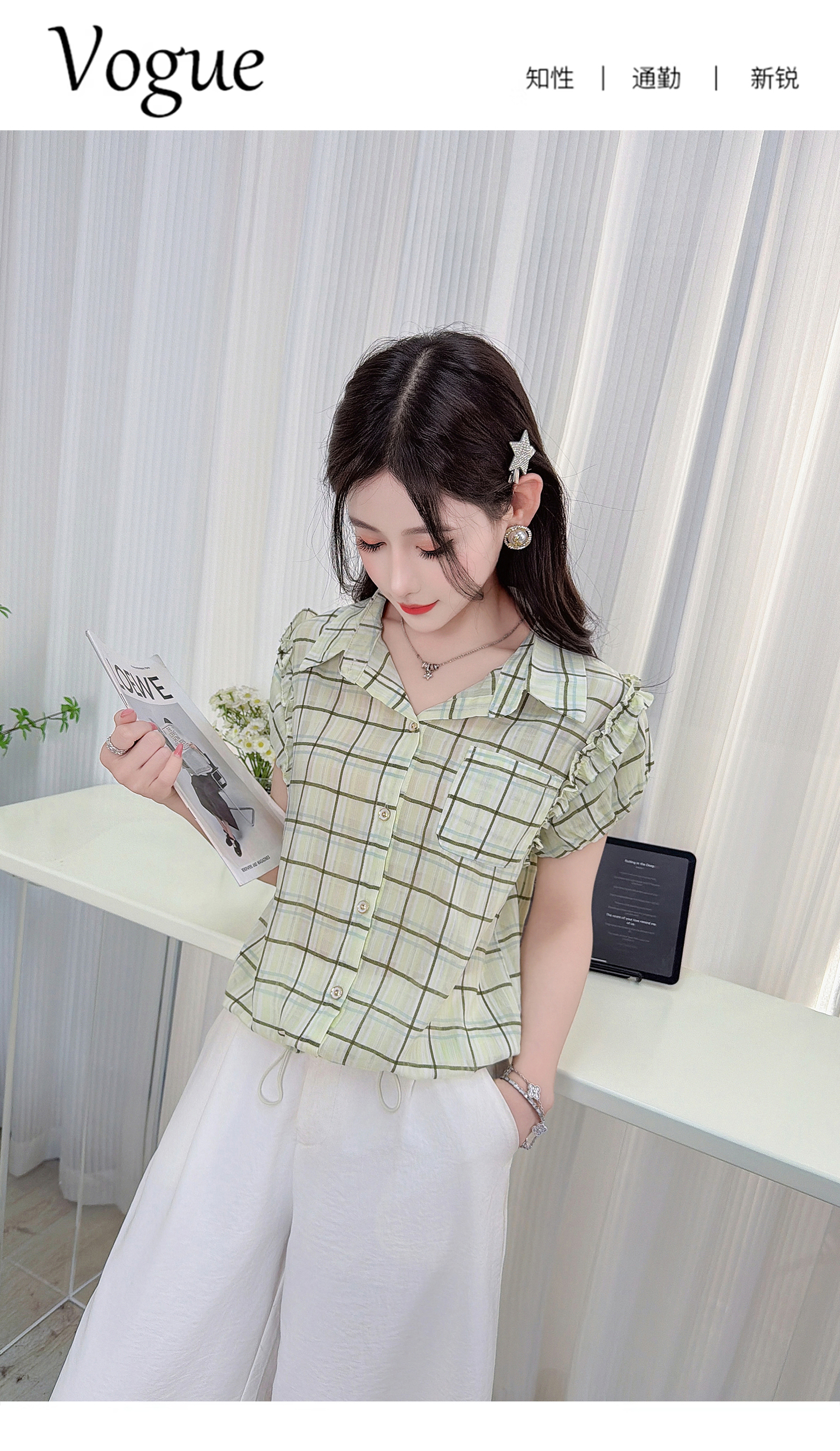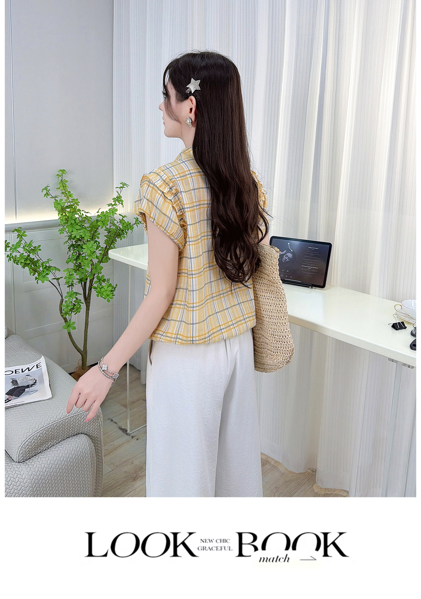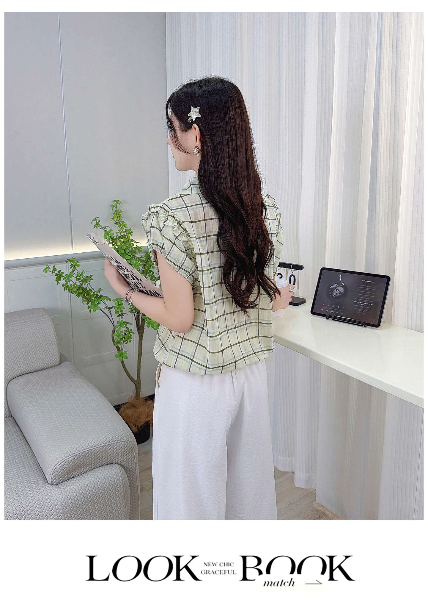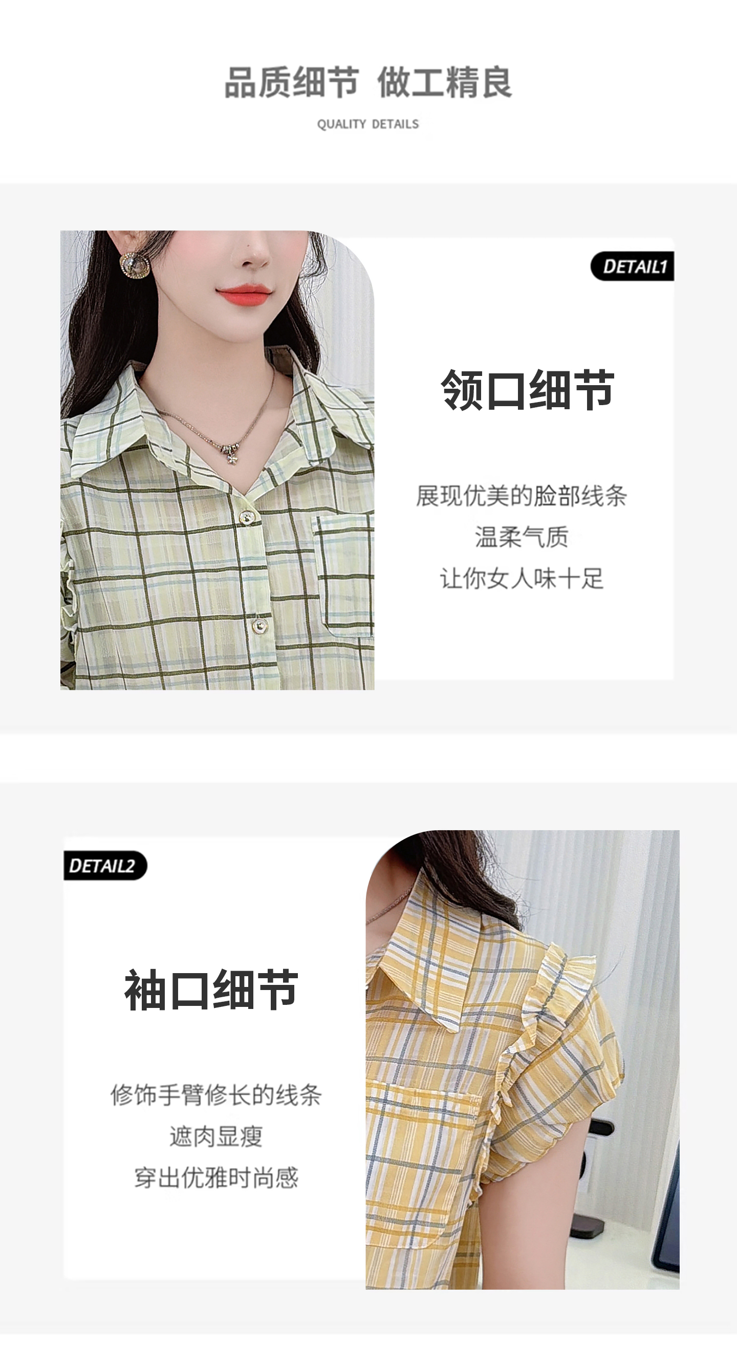 RY3451# 实拍时尚飞飞袖格子衬衫2026夏季新款减龄显瘦遮肚宽松上衣女