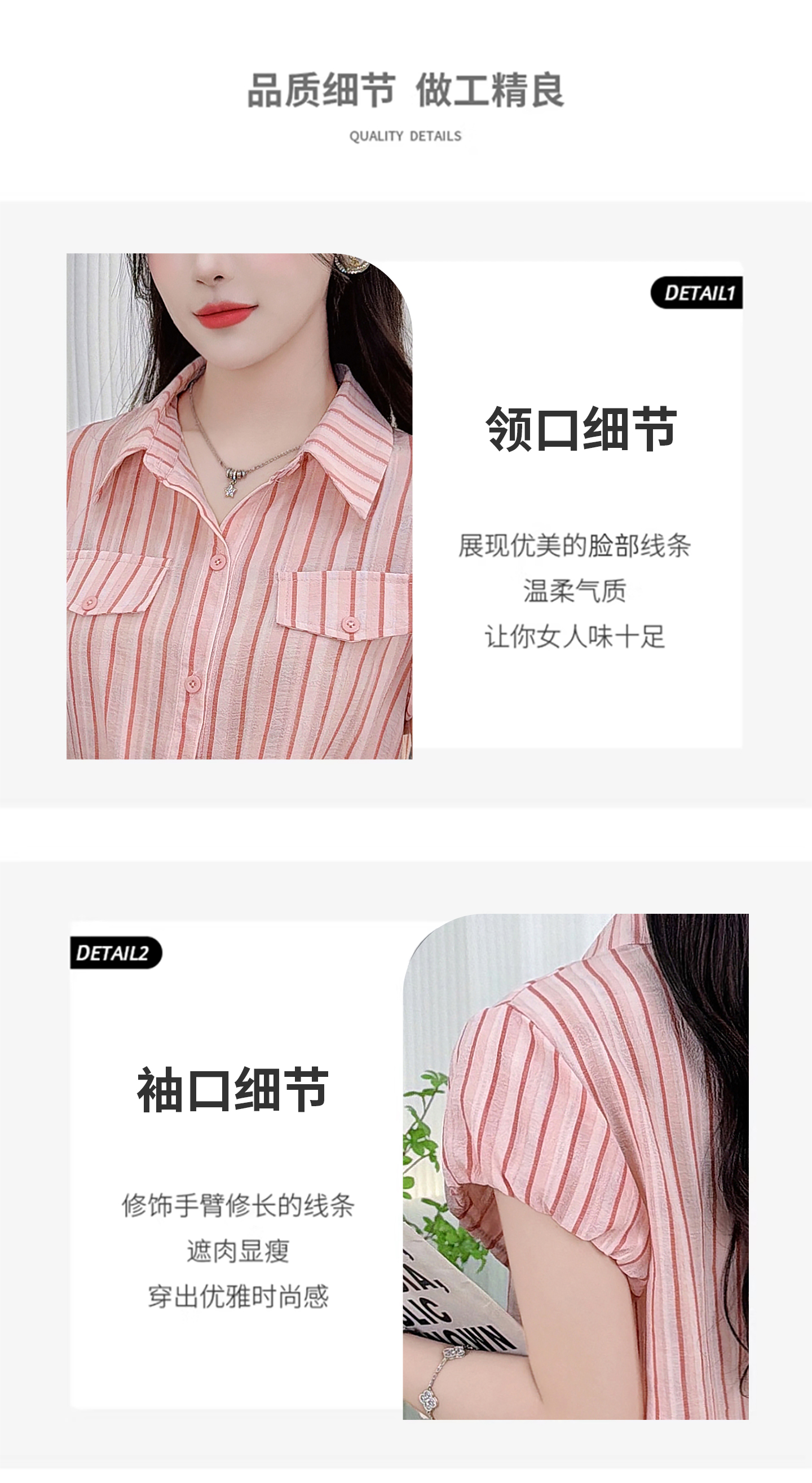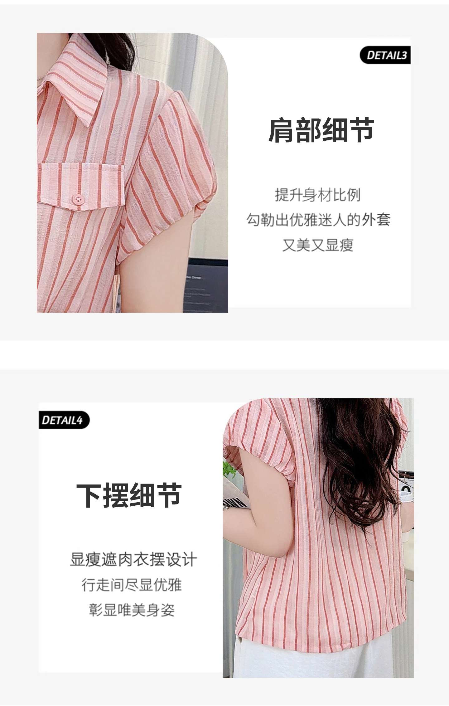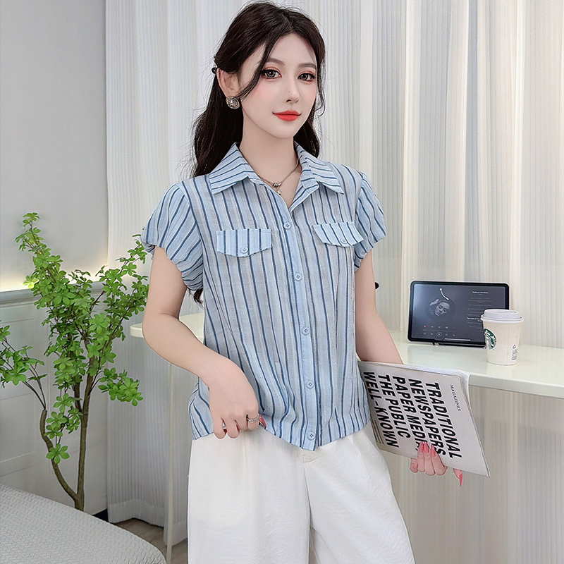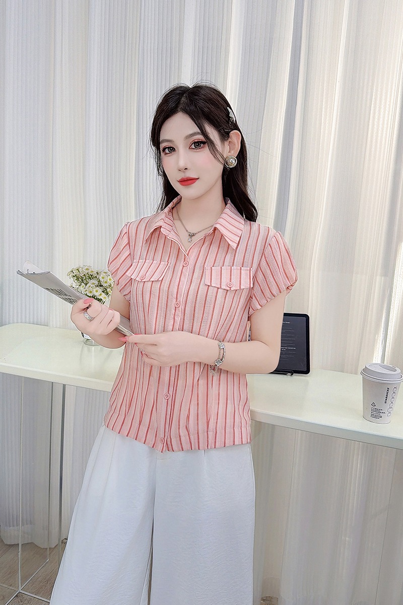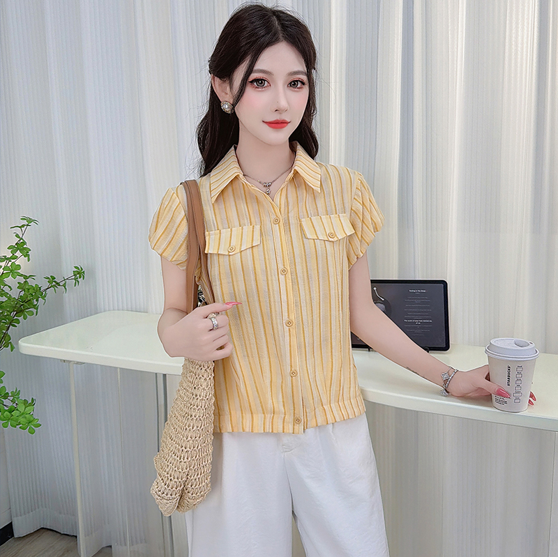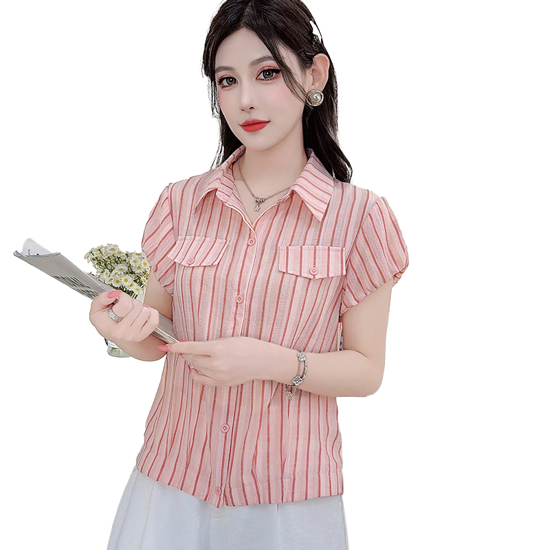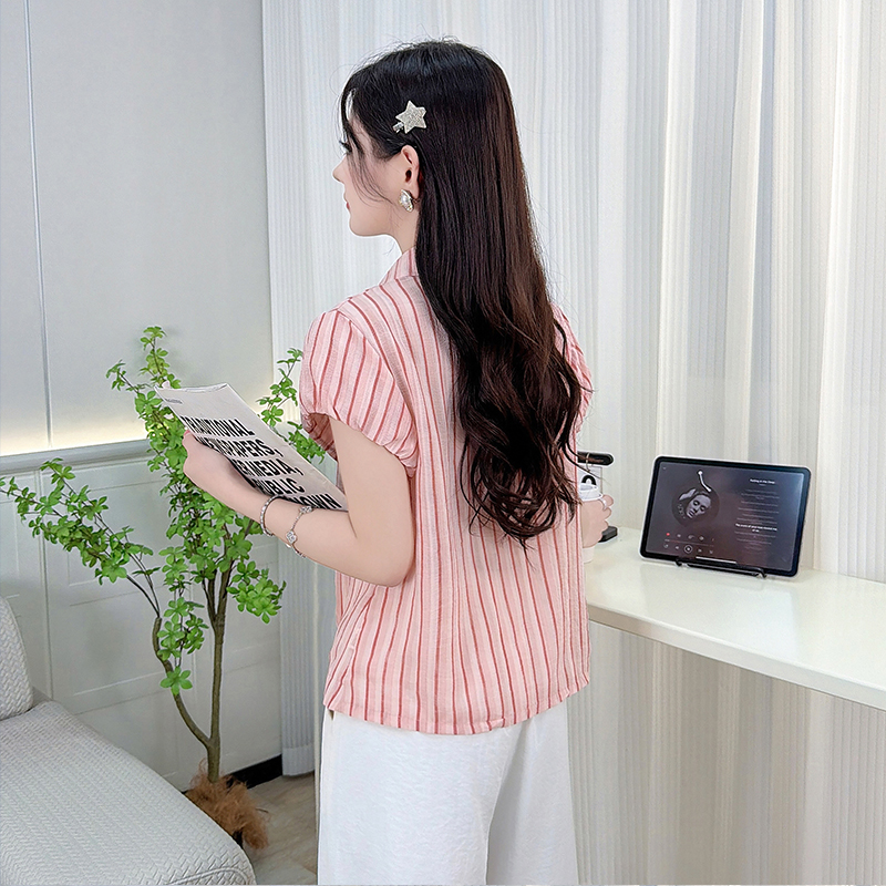 RY3453# 实拍2026夏季新款复古条纹设计感泡泡短袖衬衫气质遮肚百搭上衣