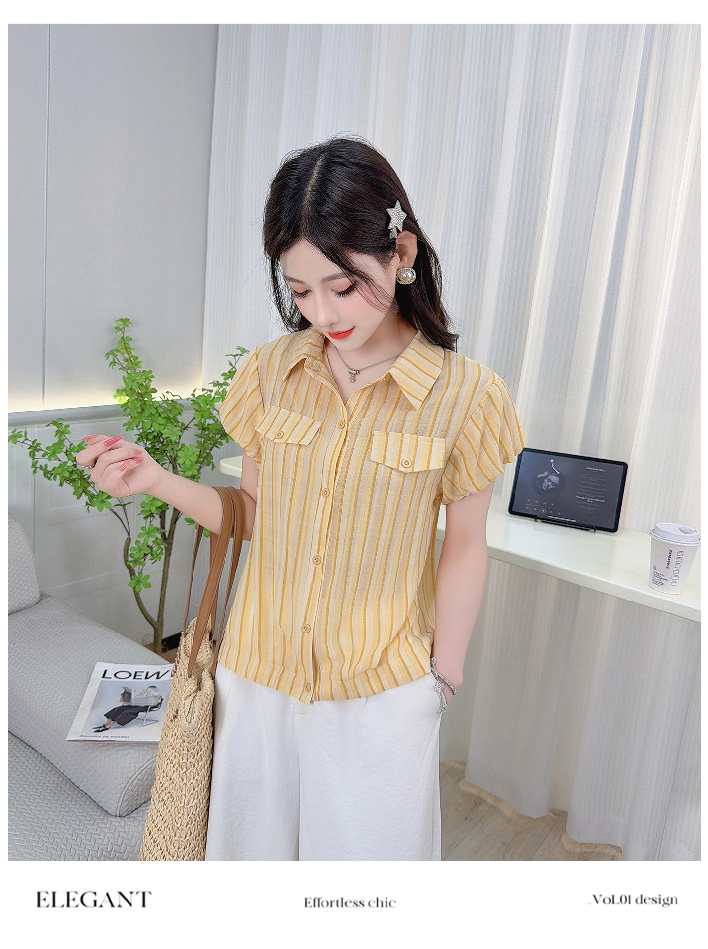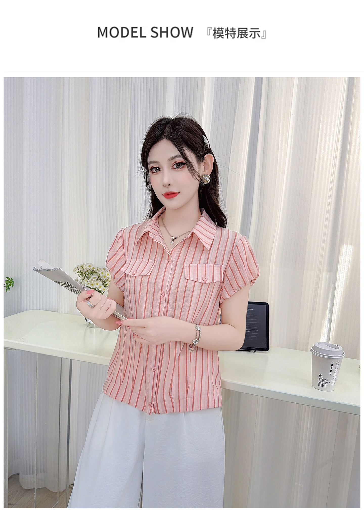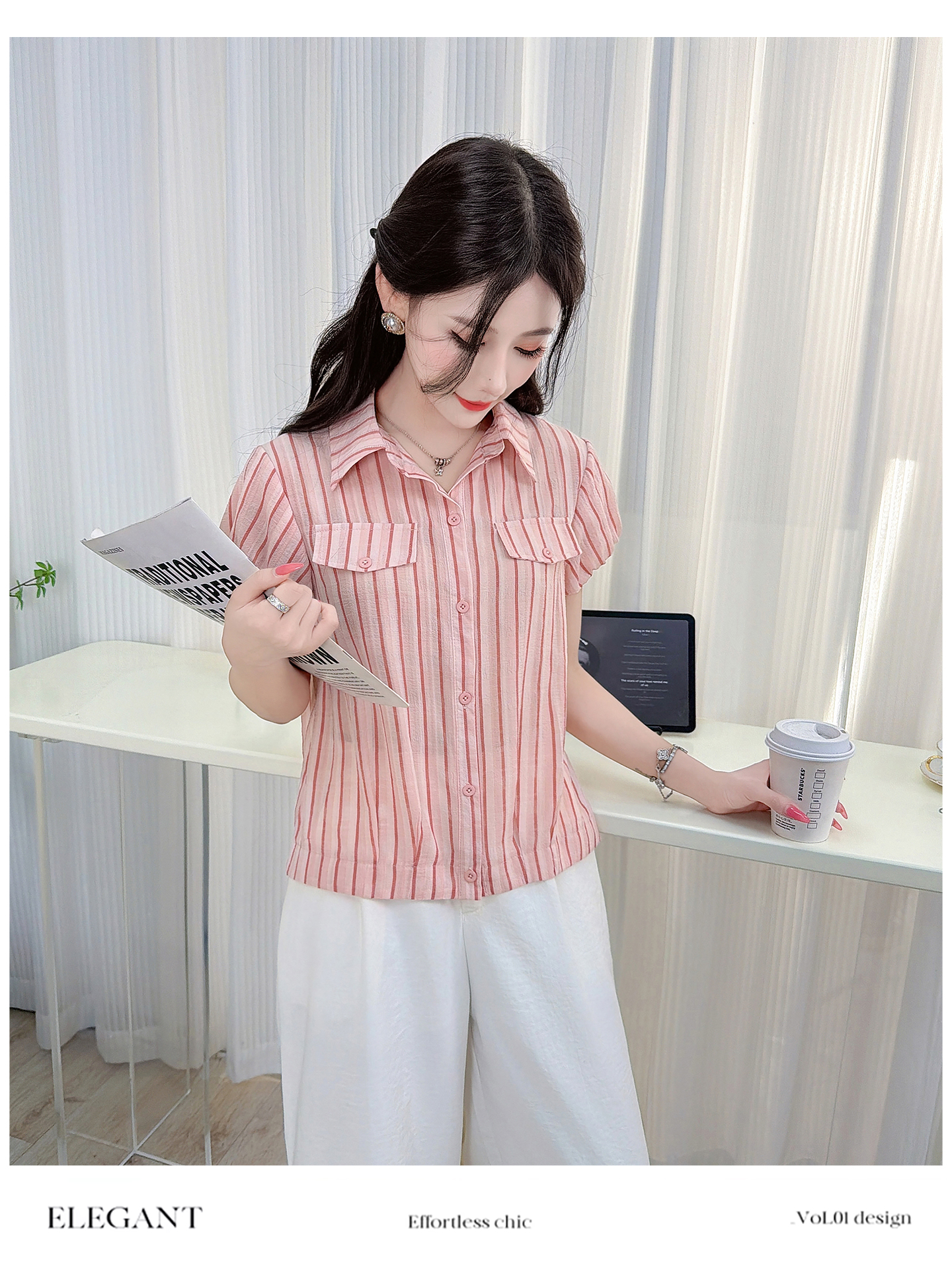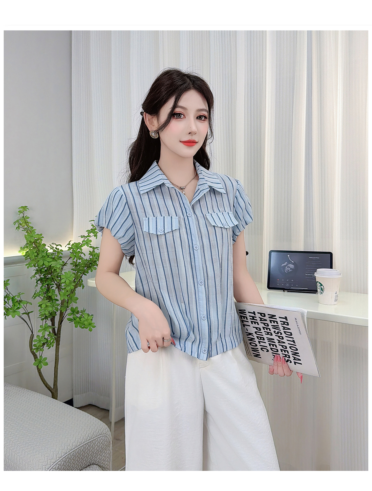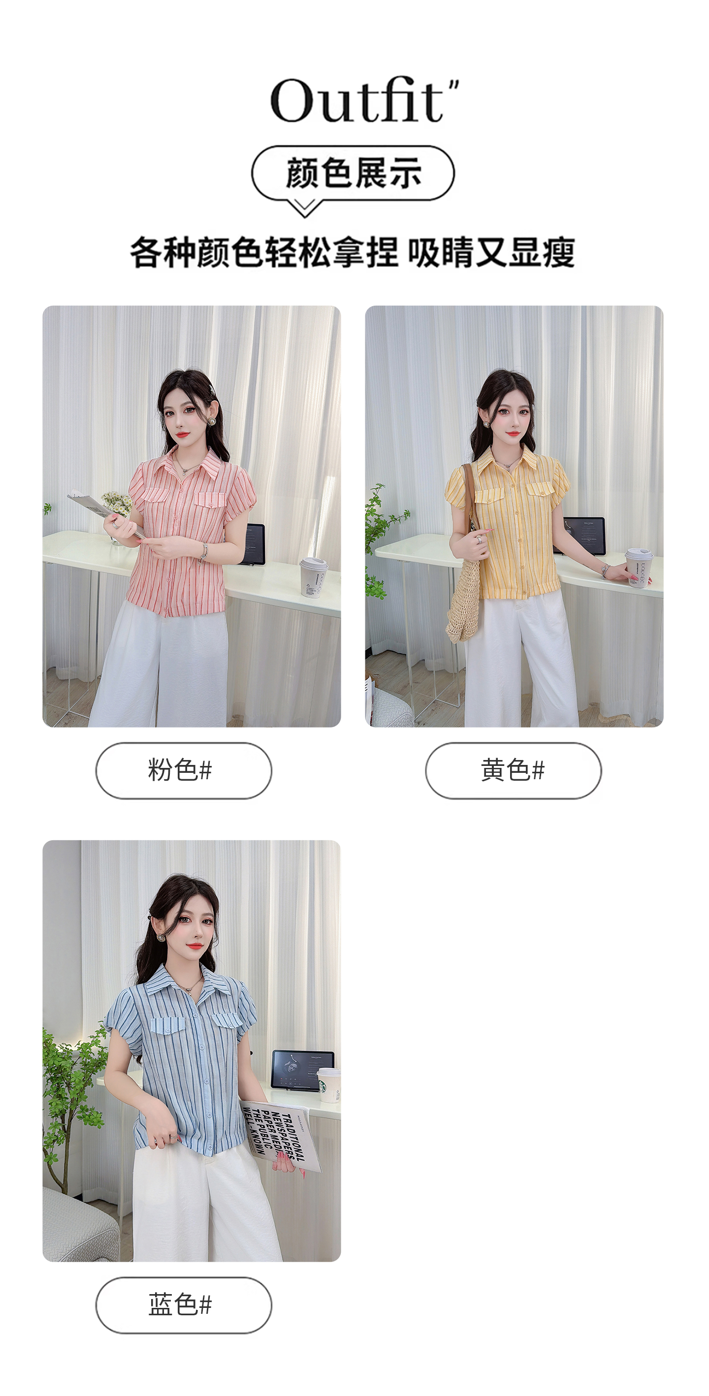 RY3453# 实拍2026夏季新款复古条纹设计感泡泡短袖衬衫气质遮肚百搭上衣