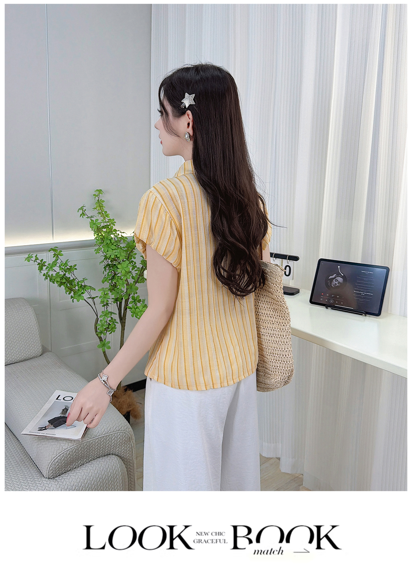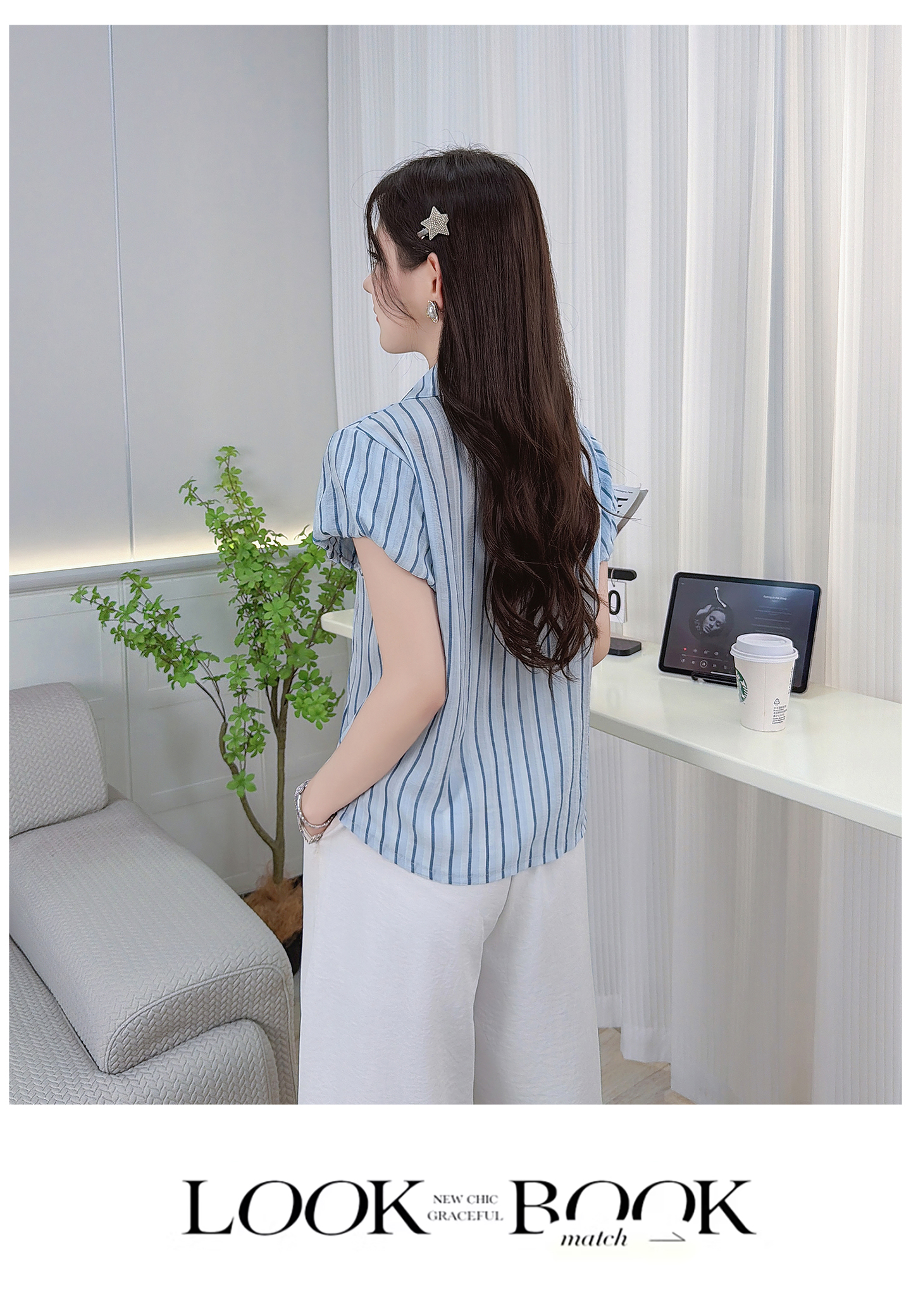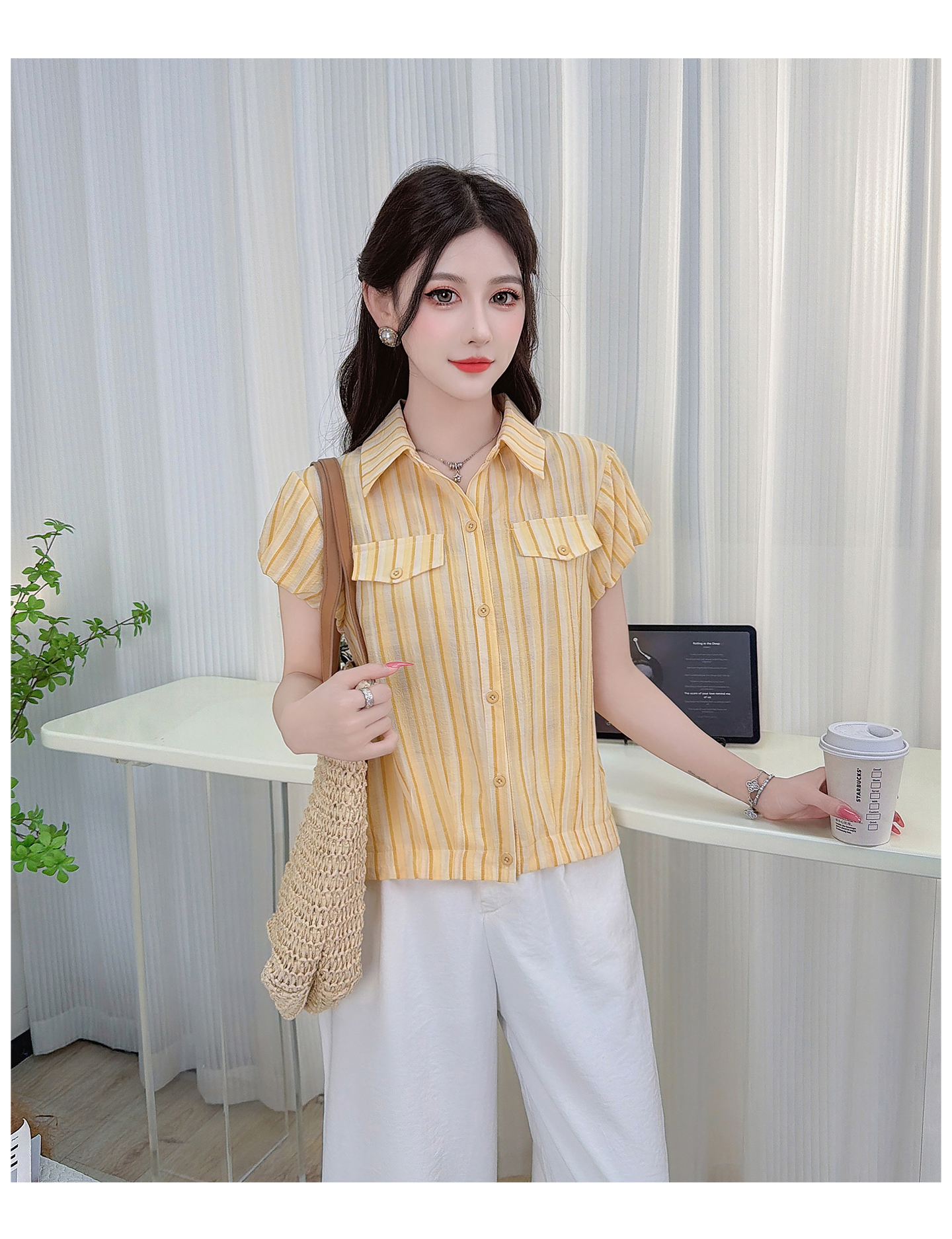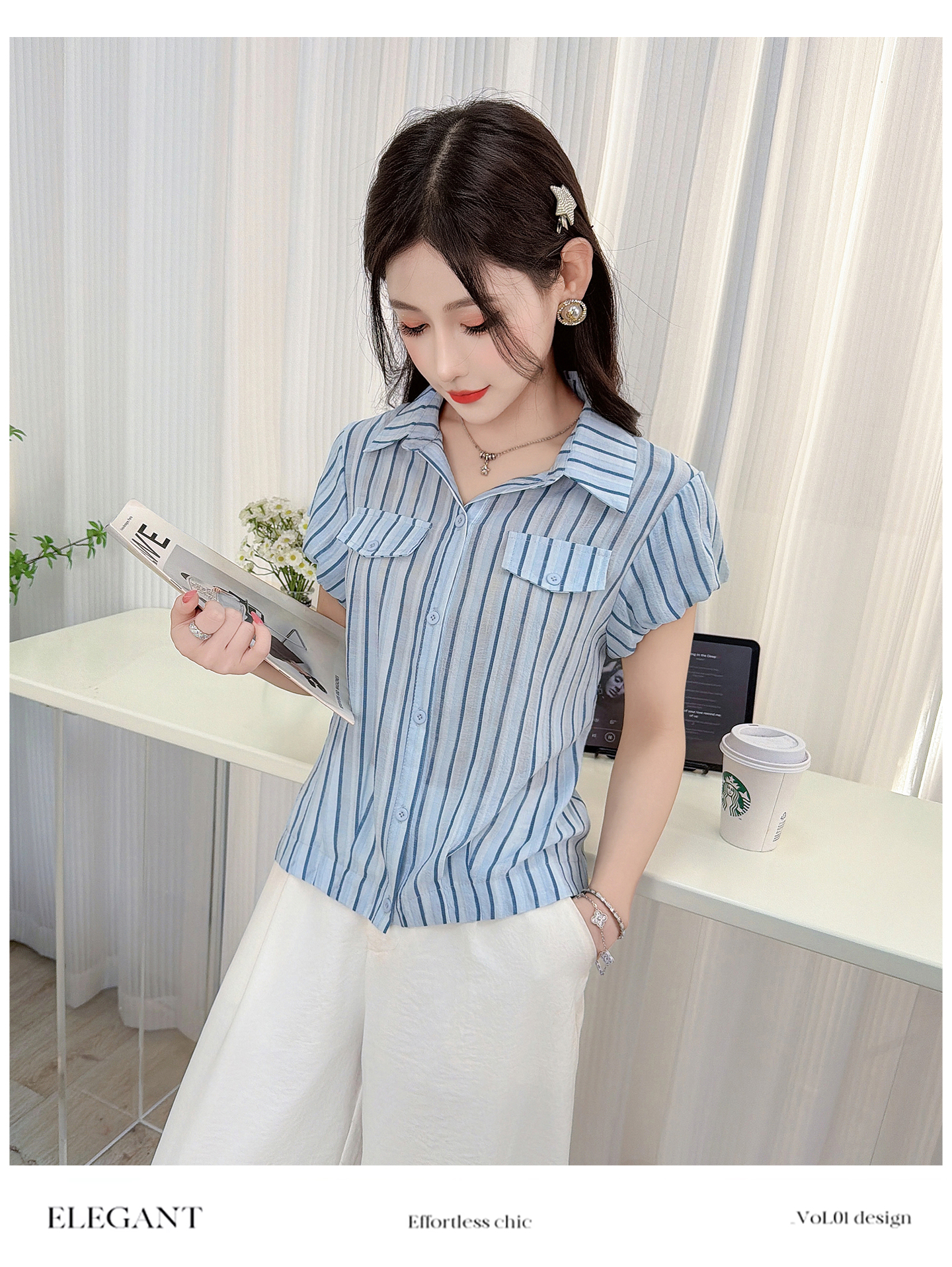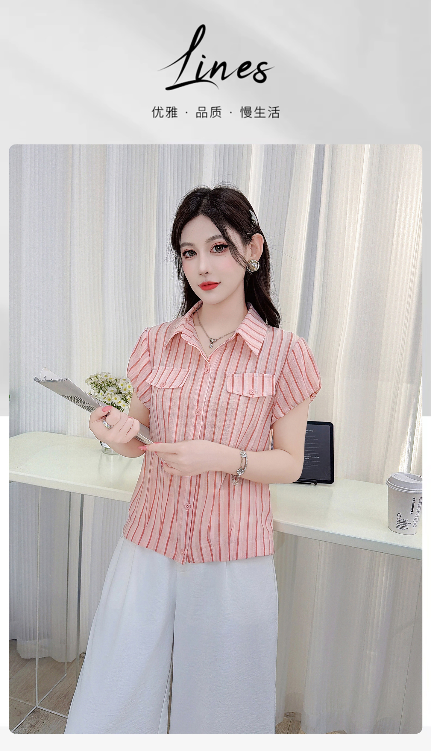 RY3453# 实拍2026夏季新款复古条纹设计感泡泡短袖衬衫气质遮肚百搭上衣