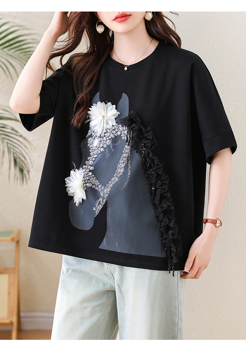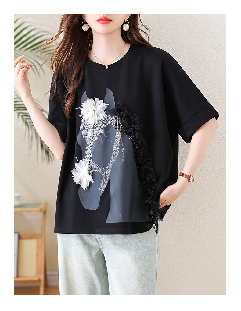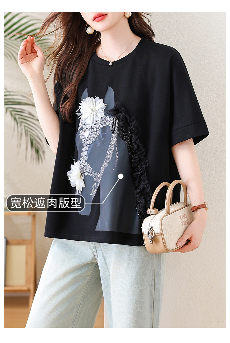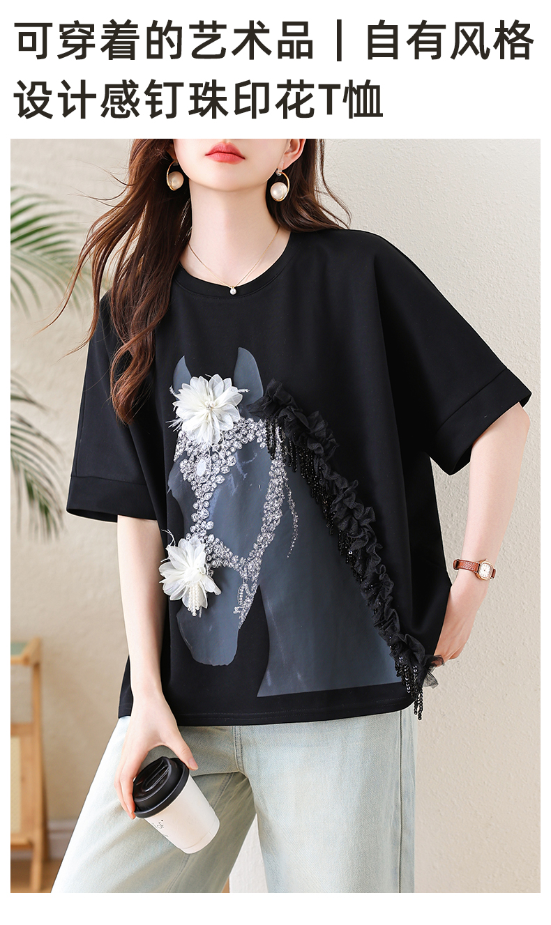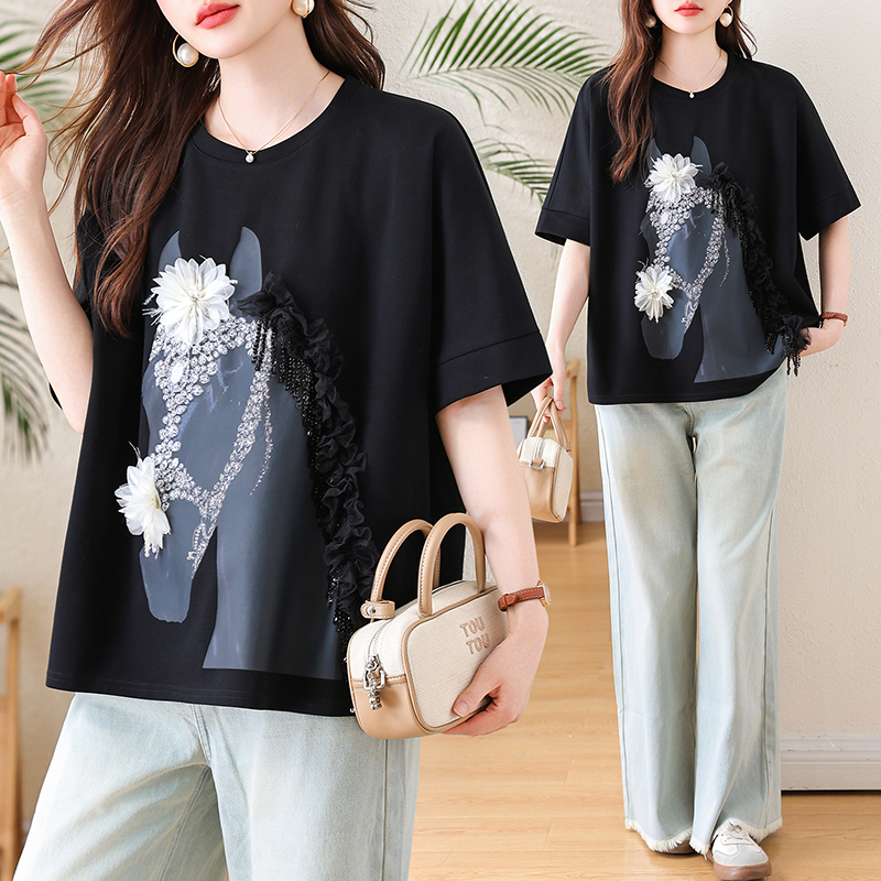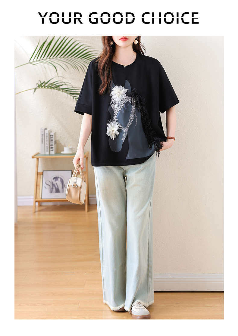 RY3461# 实拍 蝙蝠袖流苏印花T恤2026夏季慵懒休闲百搭宽松时尚大码女装