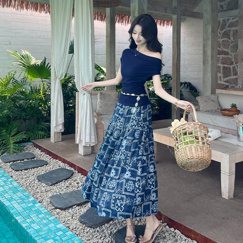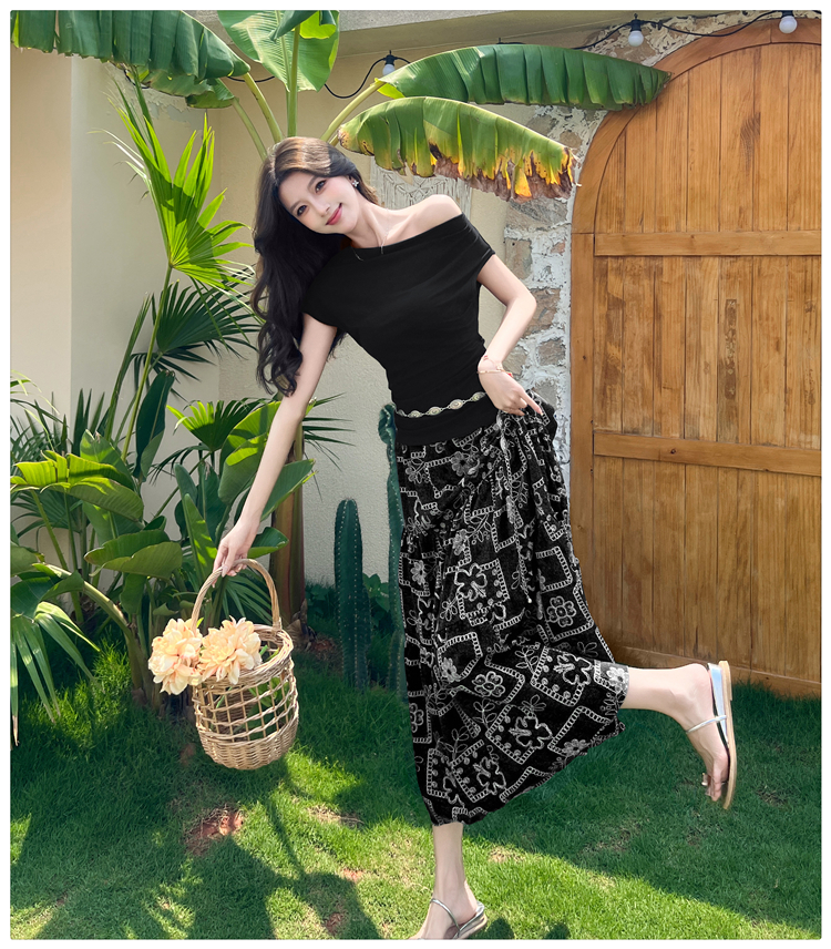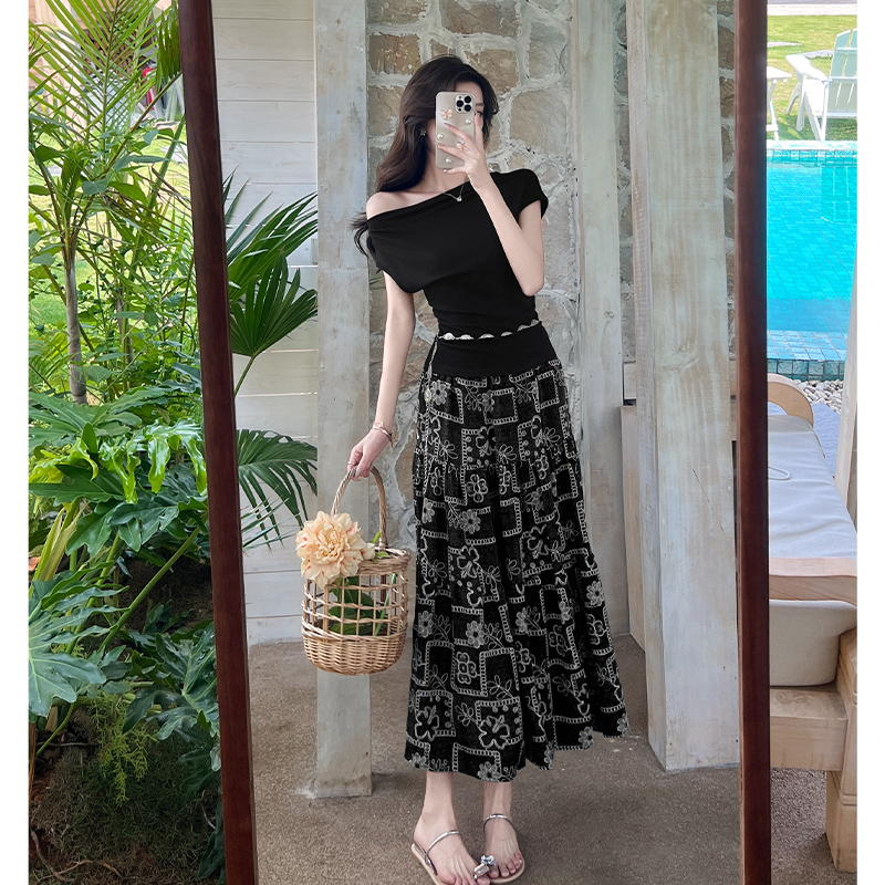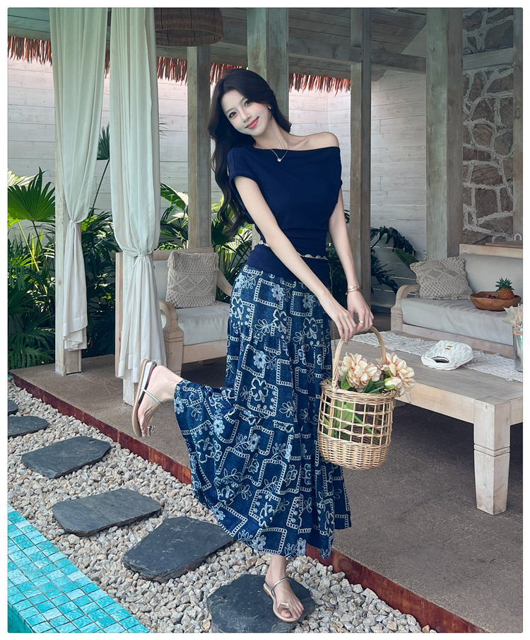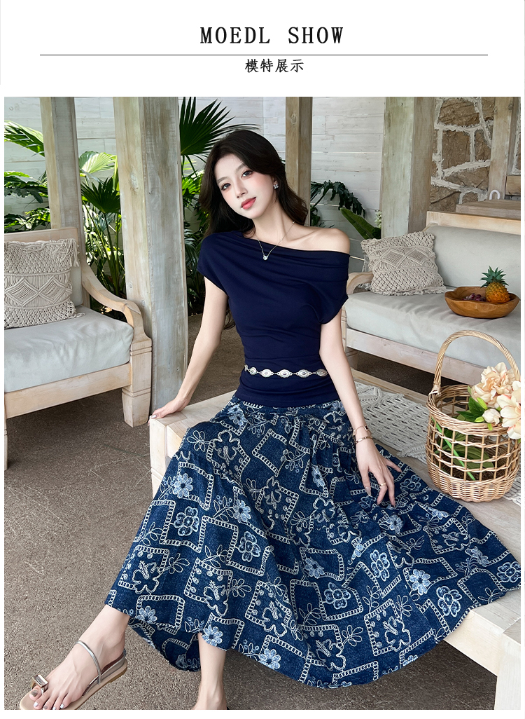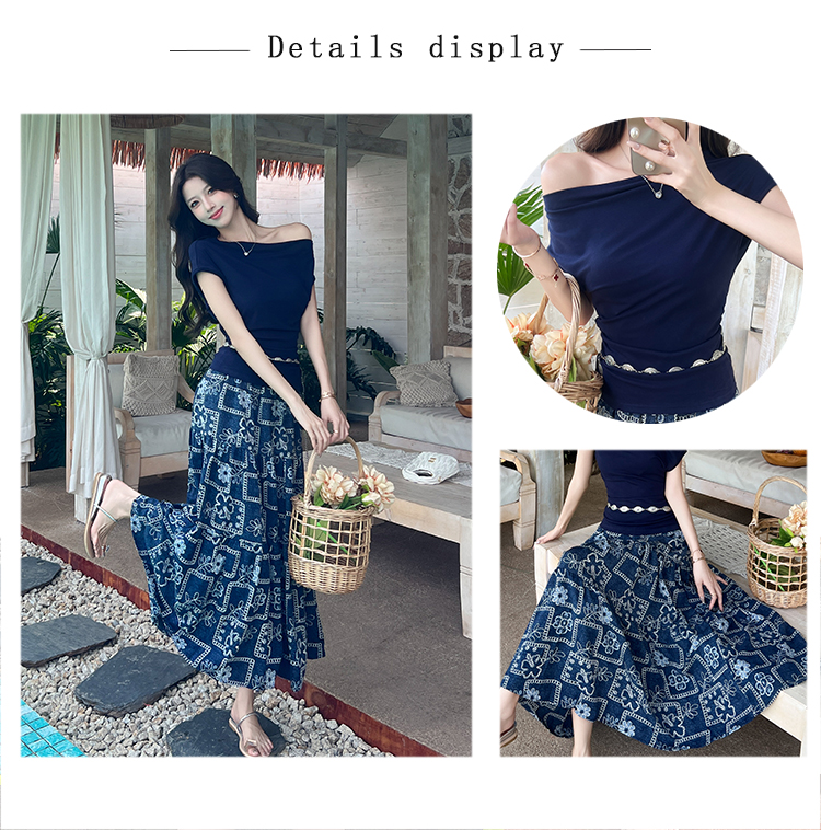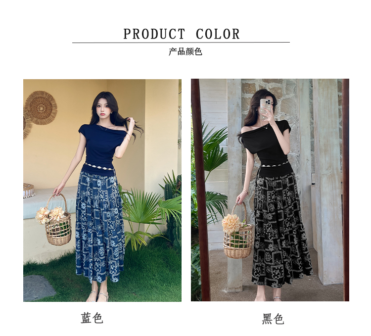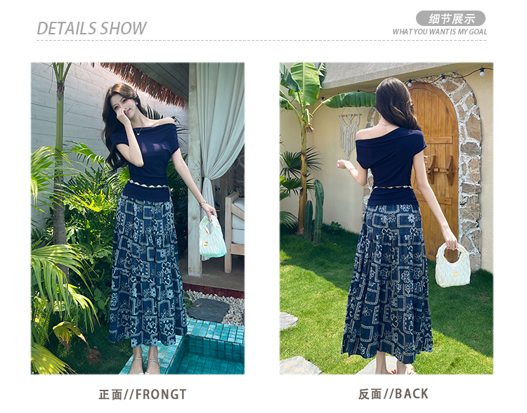 RY3463# 实拍爱西里浪漫南法度假风斜肩一字领上衣印花半身裙长裙套装