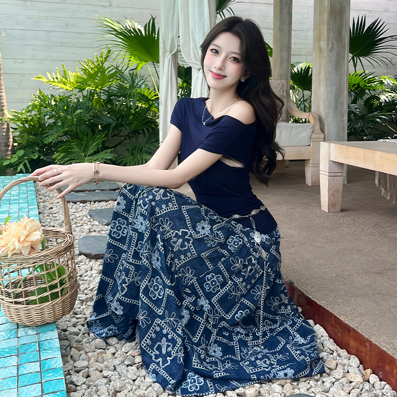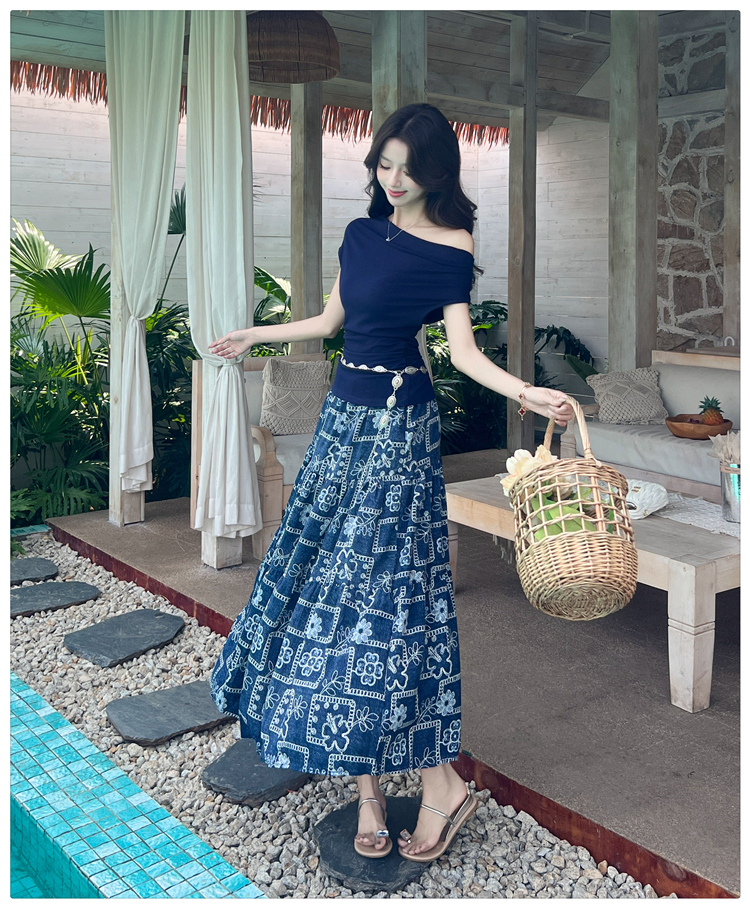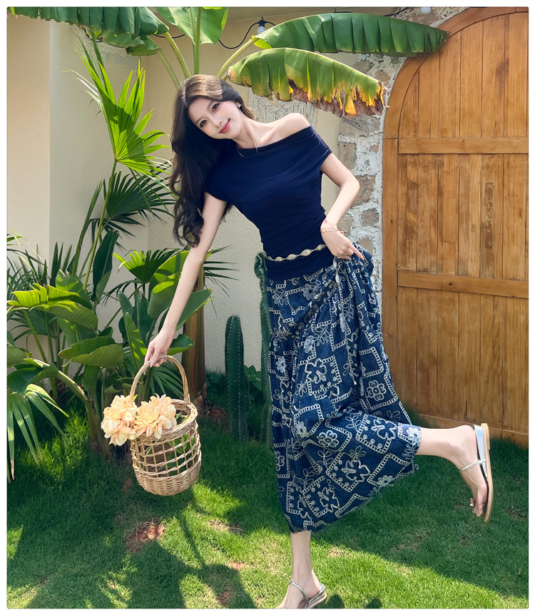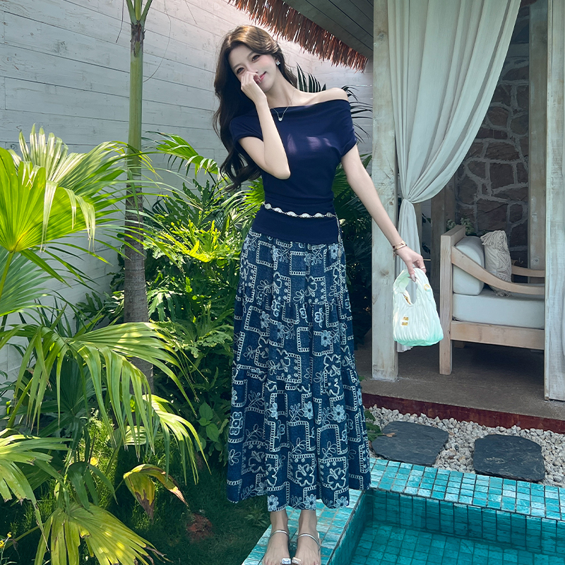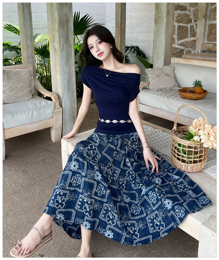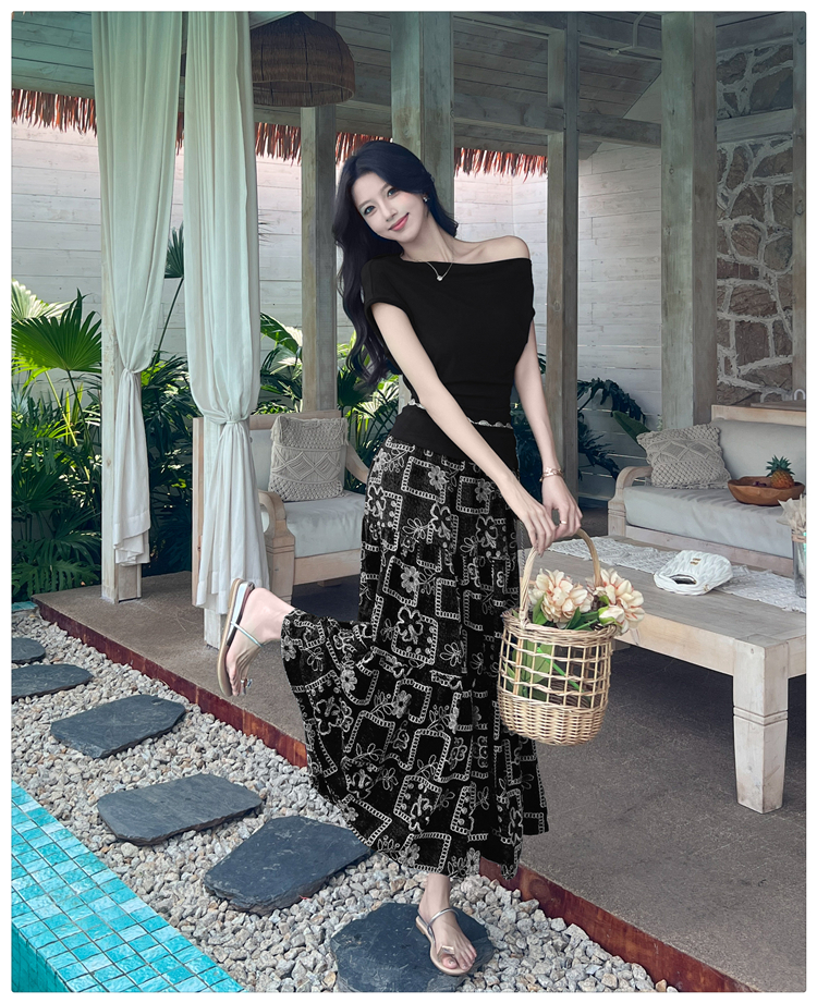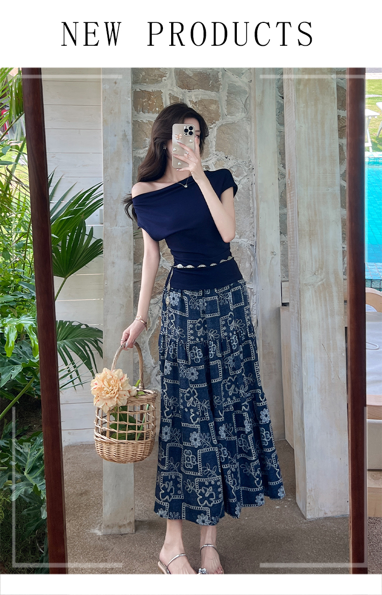 RY3463# 实拍爱西里浪漫南法度假风斜肩一字领上衣印花半身裙长裙套装
