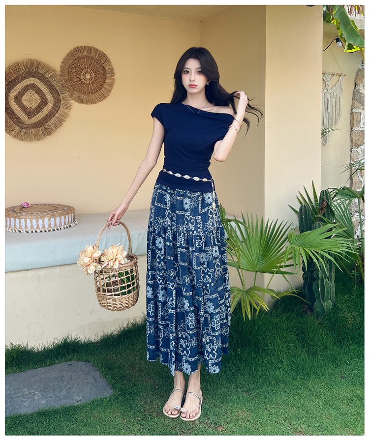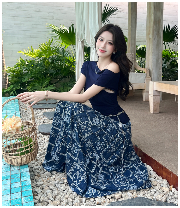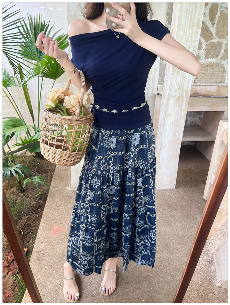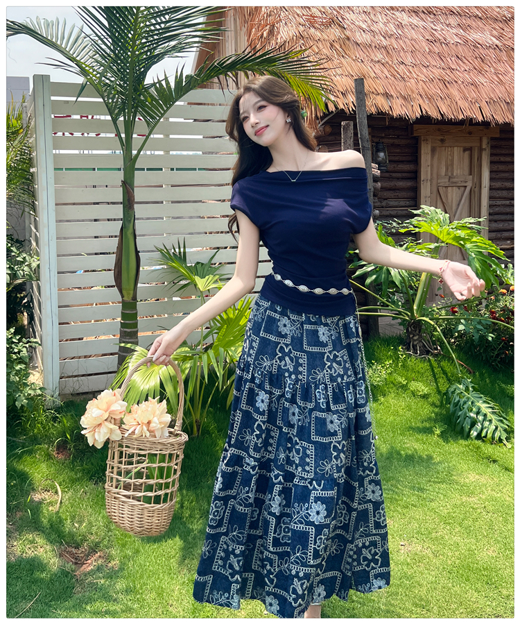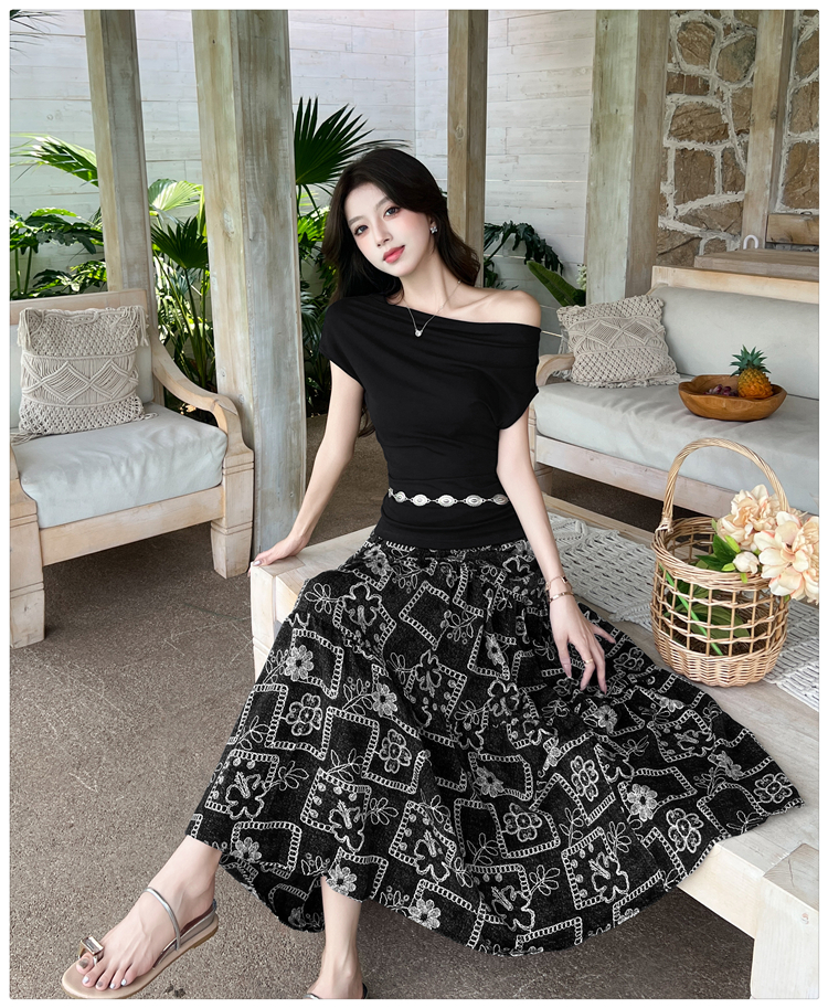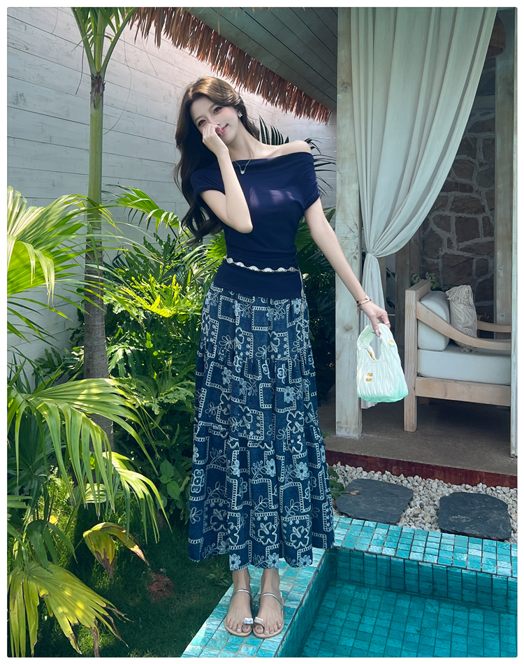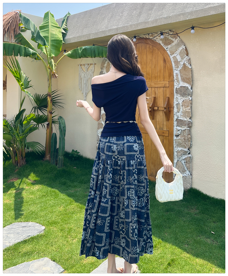 RY3463# 实拍爱西里浪漫南法度假风斜肩一字领上衣印花半身裙长裙套装