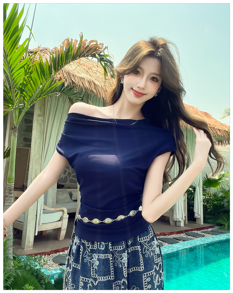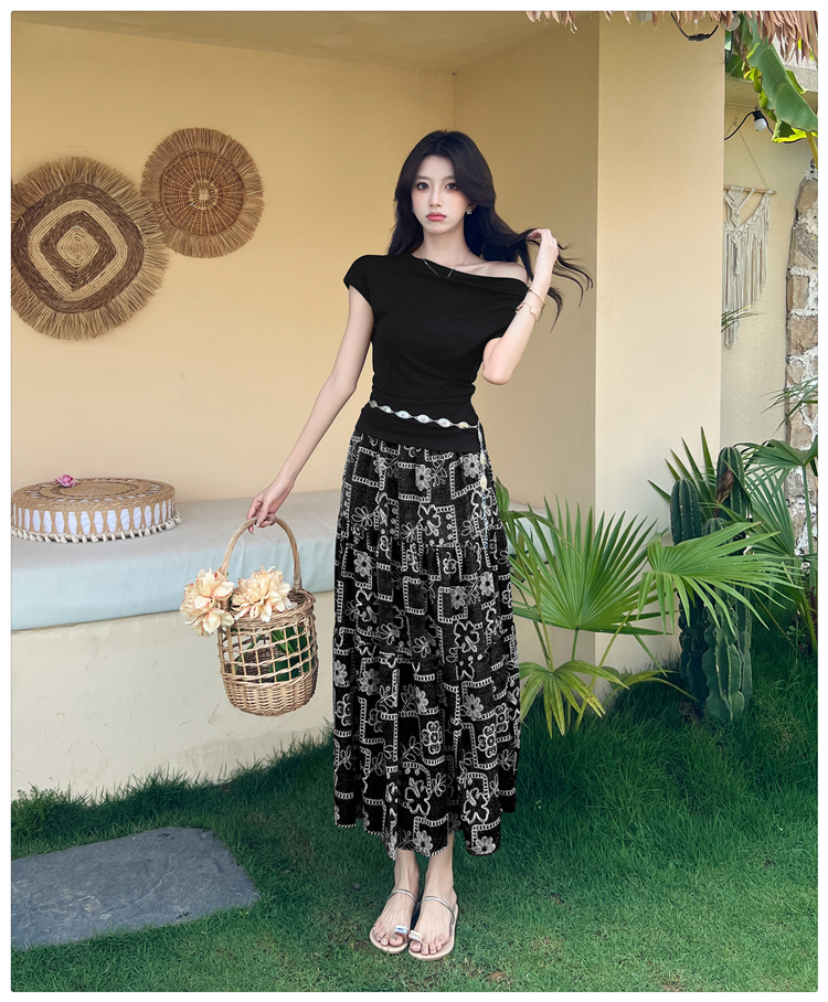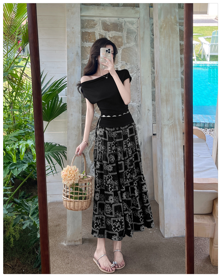 RY3464# 实拍法式斜肩套装一字肩显瘦小个子女不规则下摆上衣T半身裙