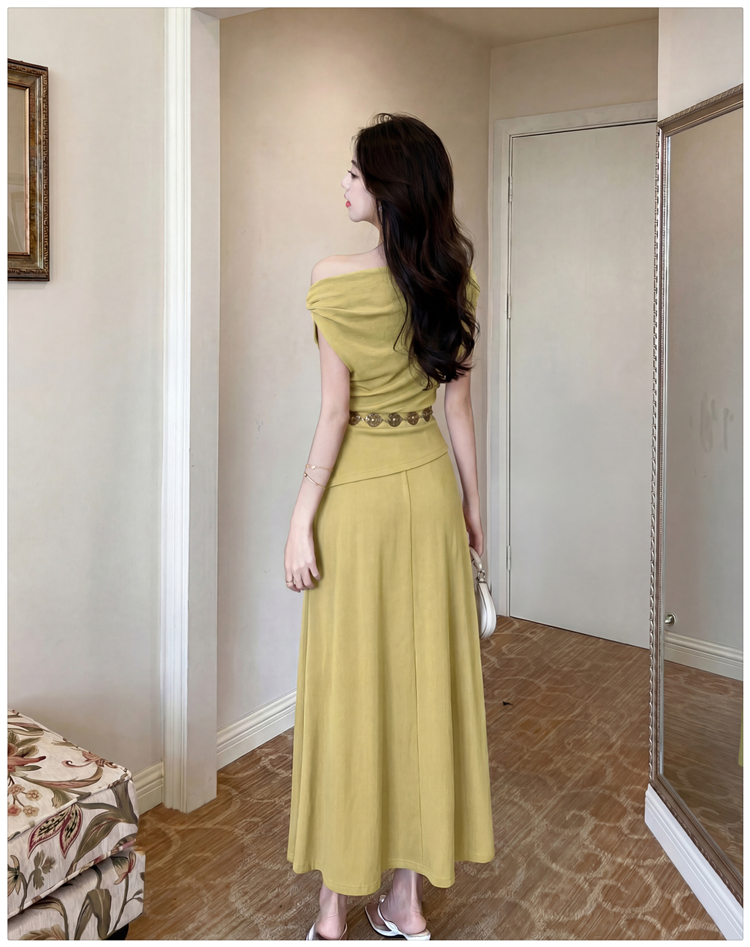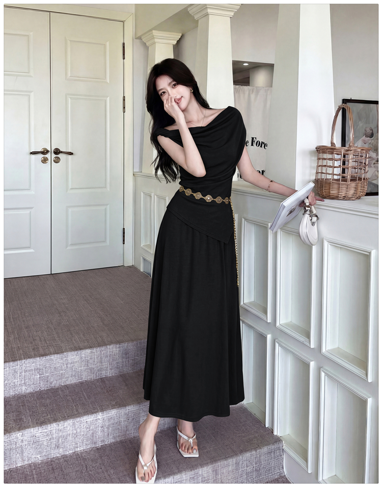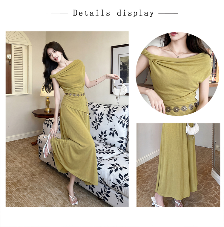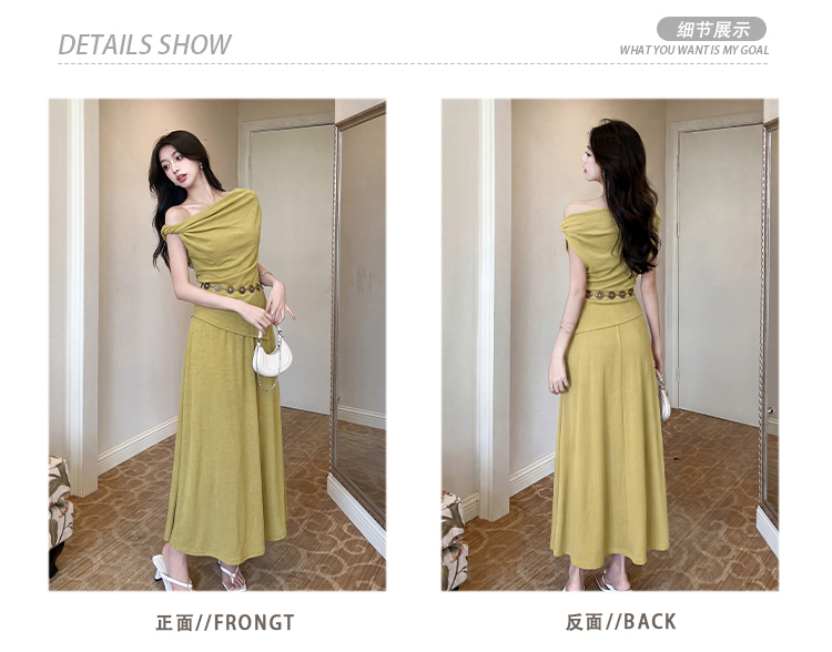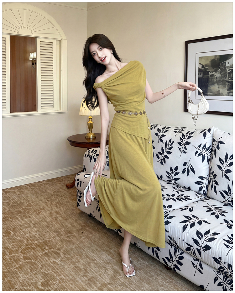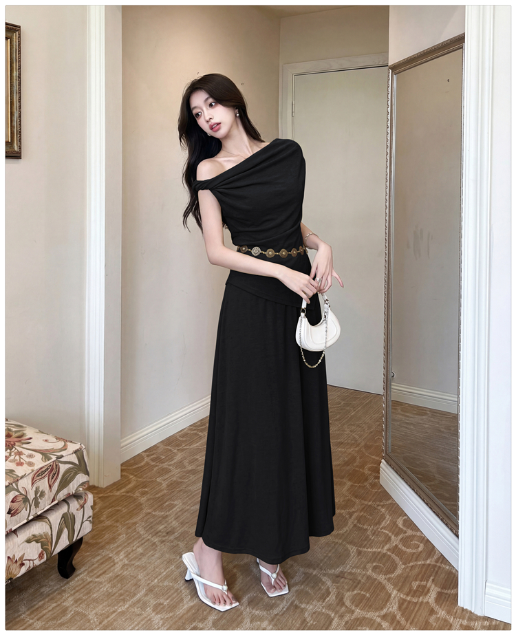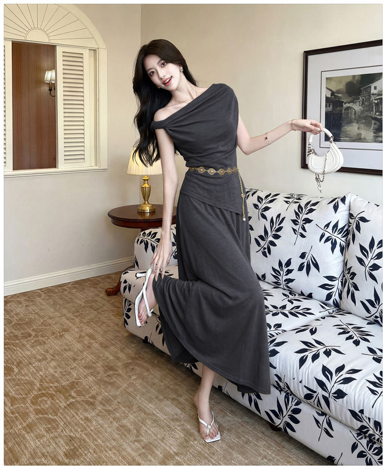RY3464# 实拍法式斜肩套装一字肩显瘦小个子女不规则下摆上衣T半身裙