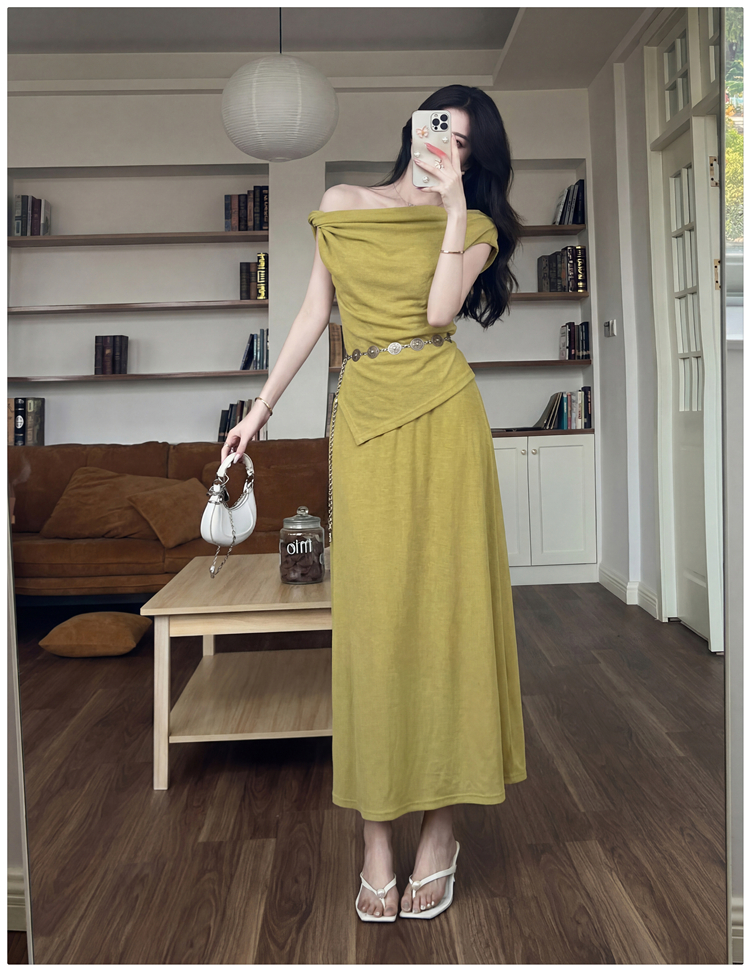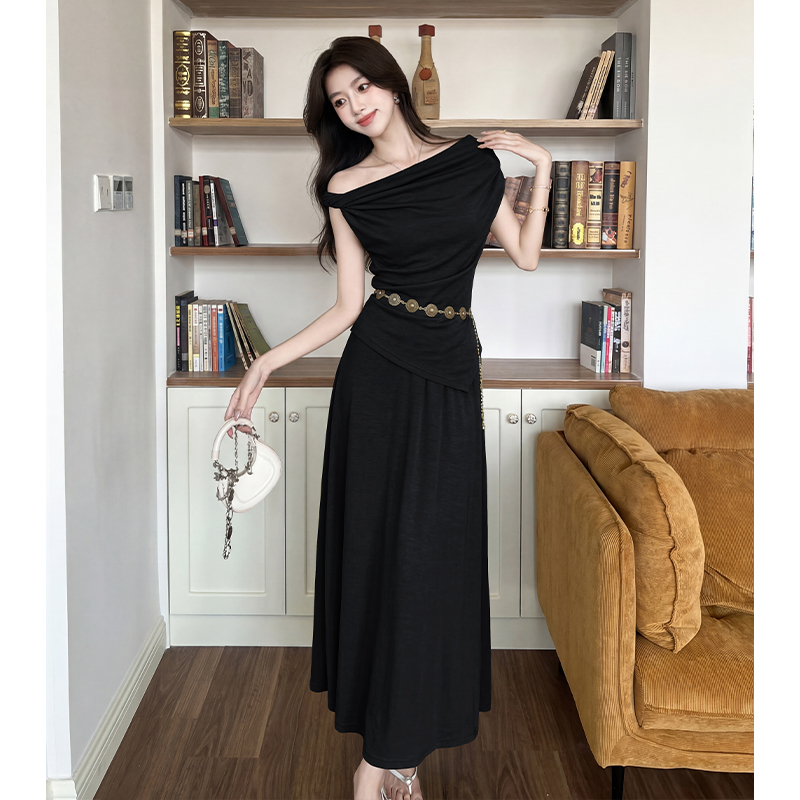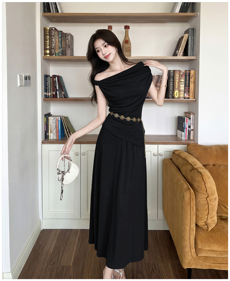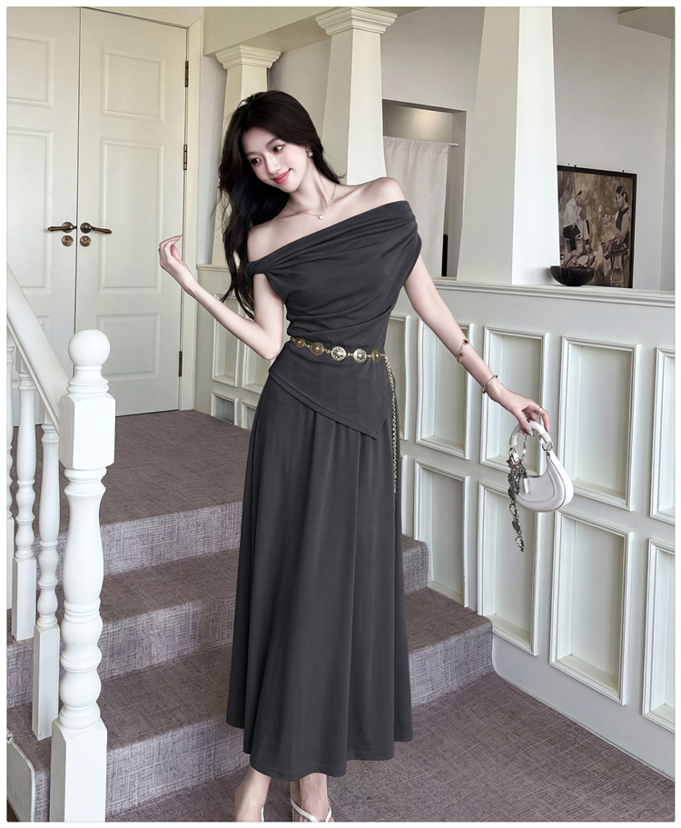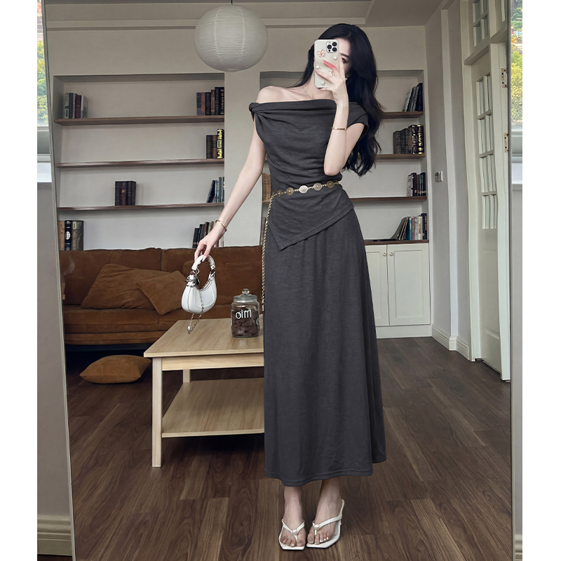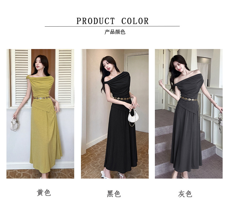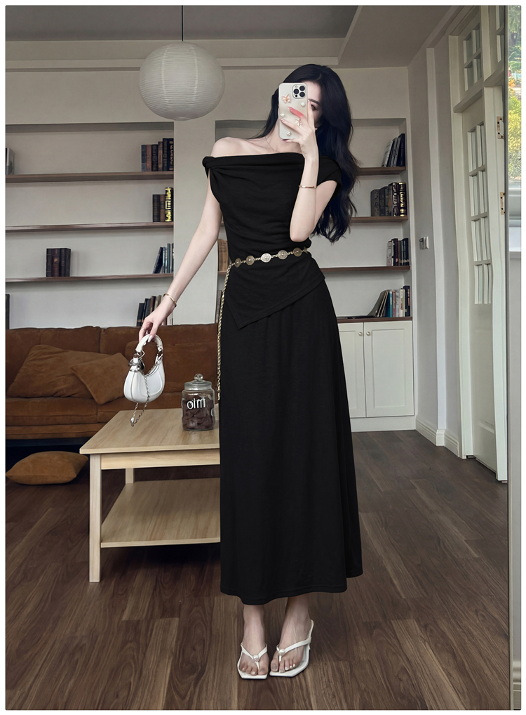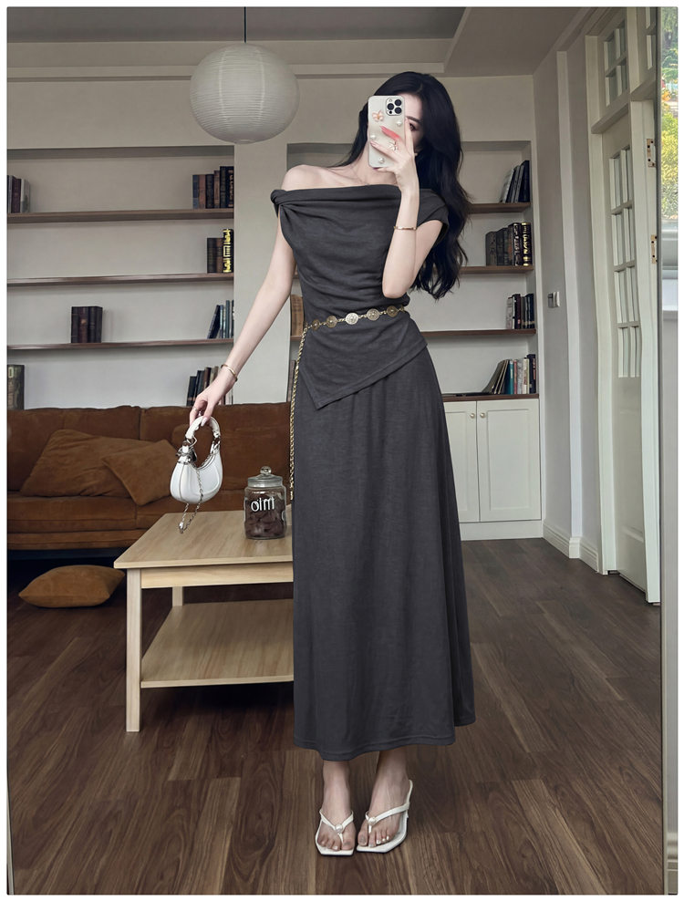 RY3464# 实拍法式斜肩套装一字肩显瘦小个子女不规则下摆上衣T半身裙
