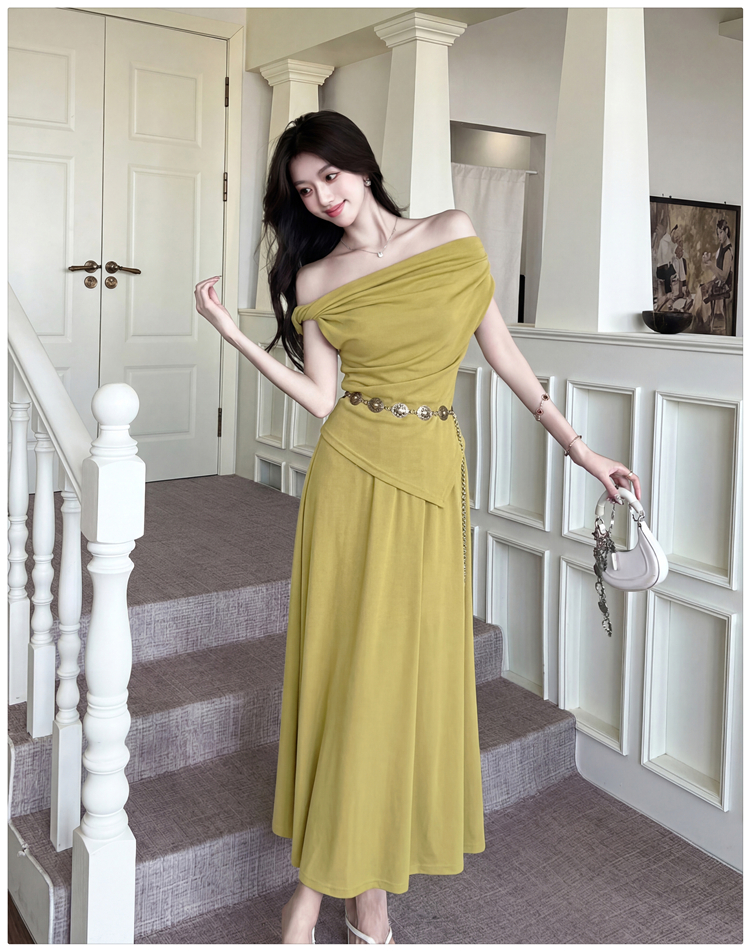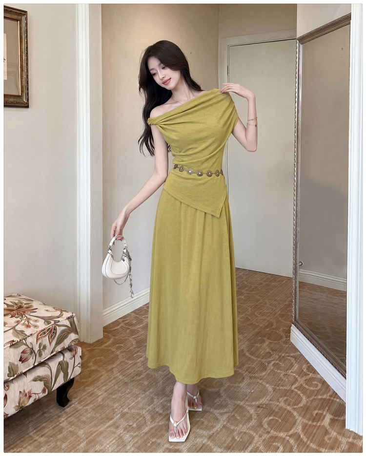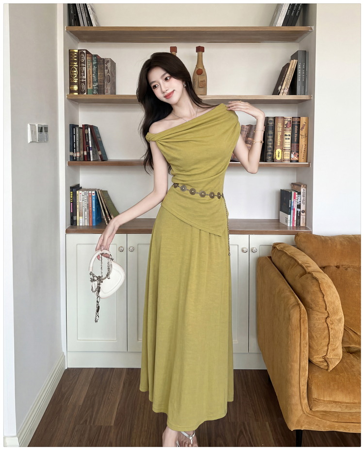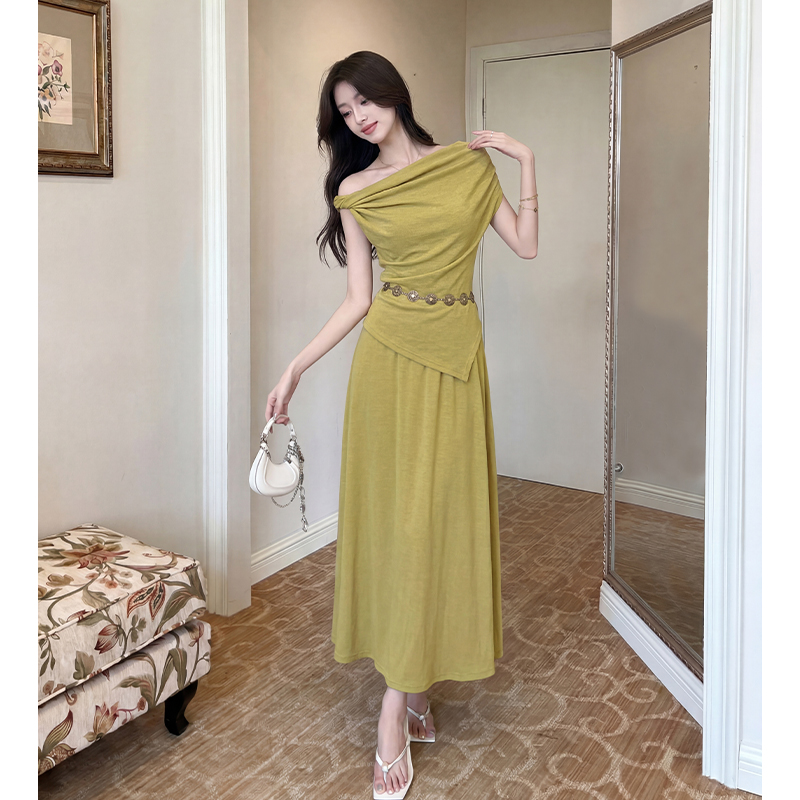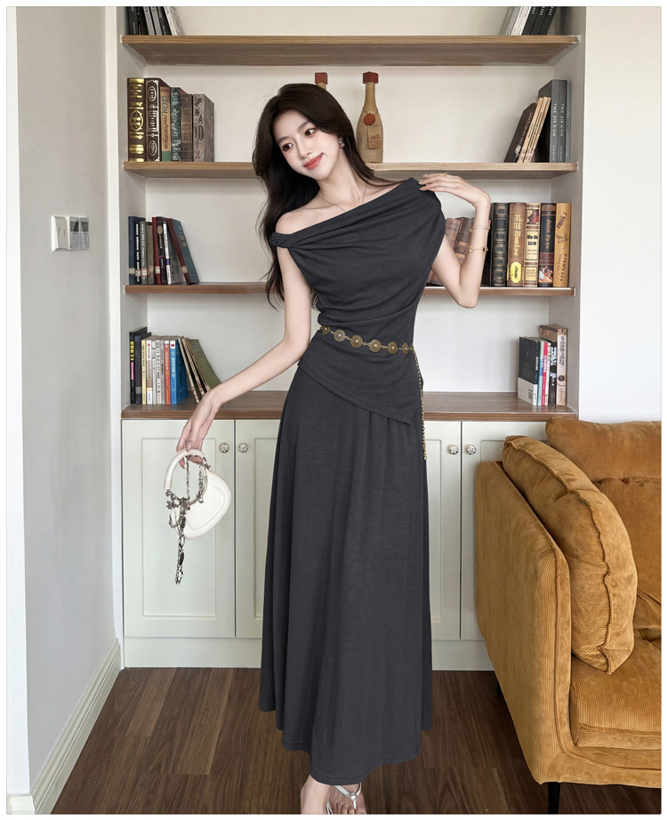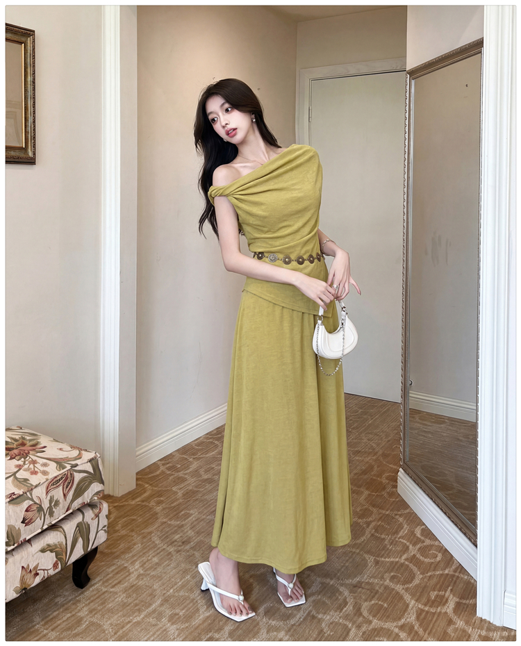 RY3464# 实拍法式斜肩套装一字肩显瘦小个子女不规则下摆上衣T半身裙