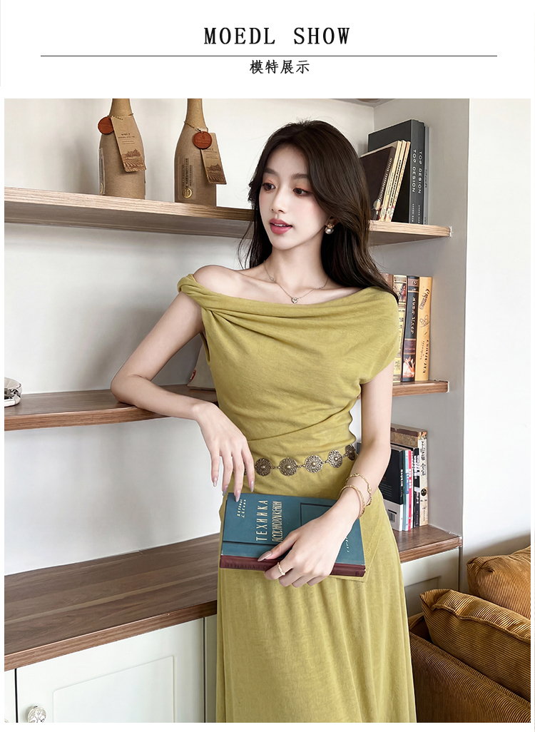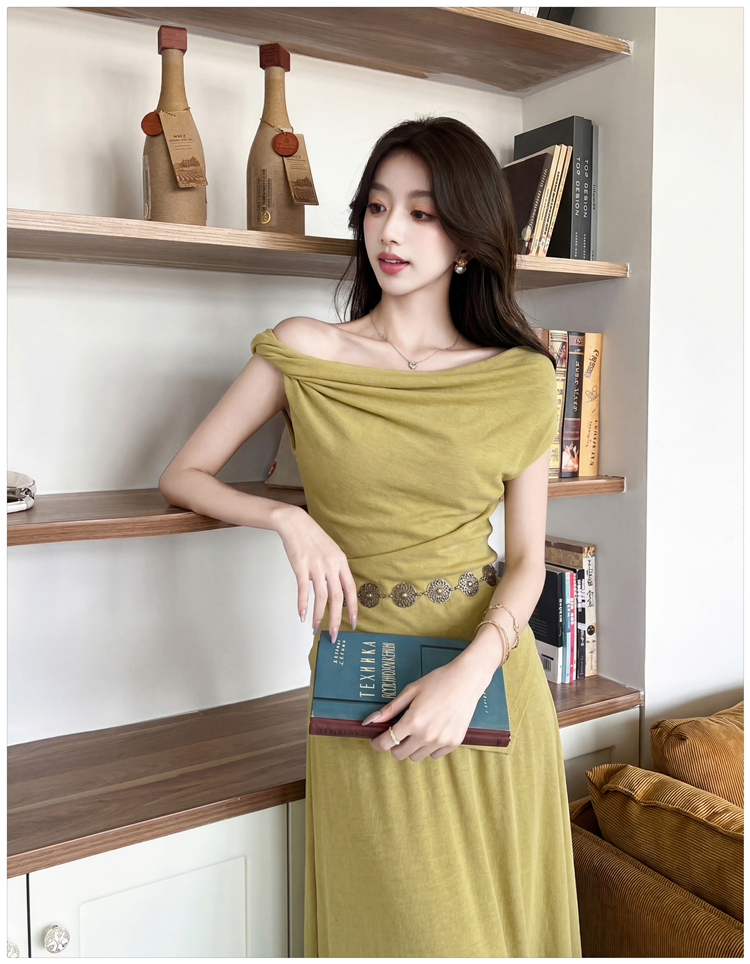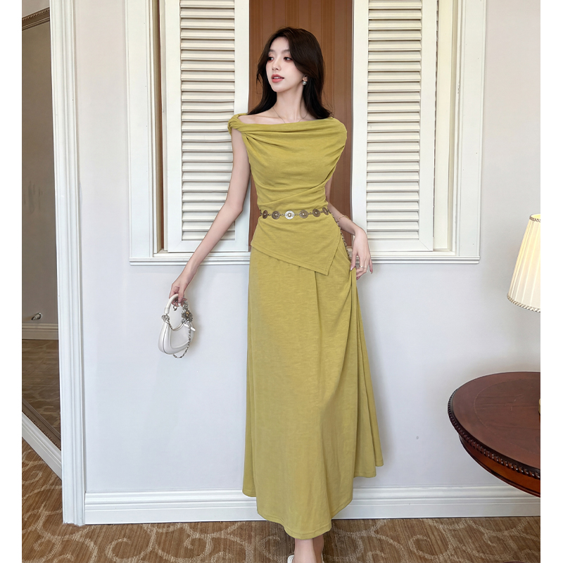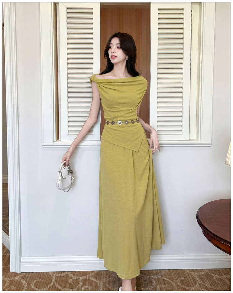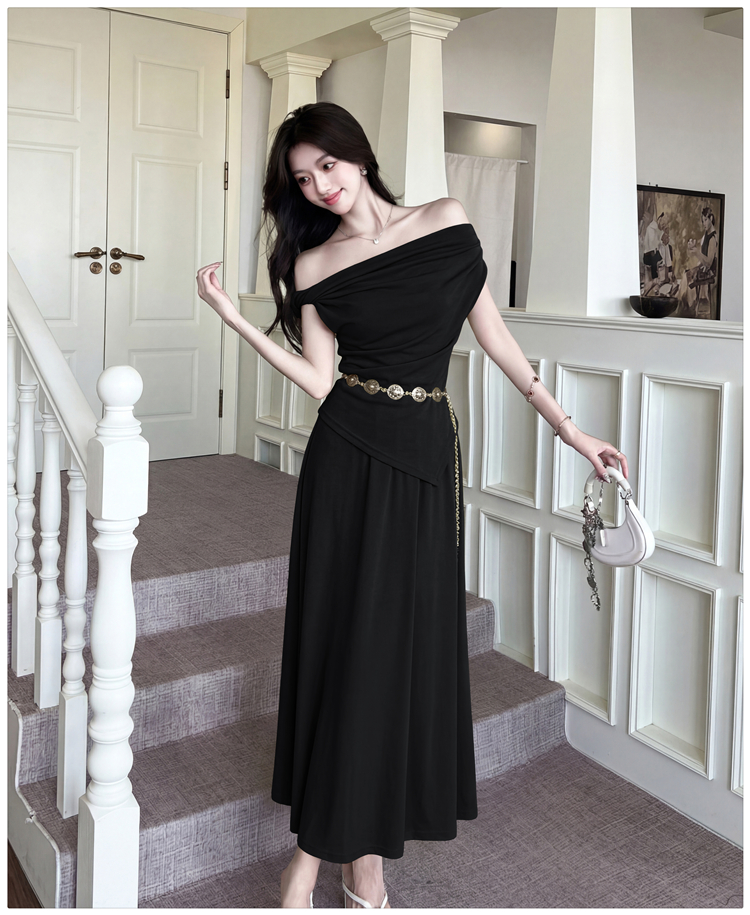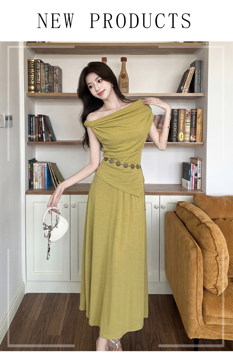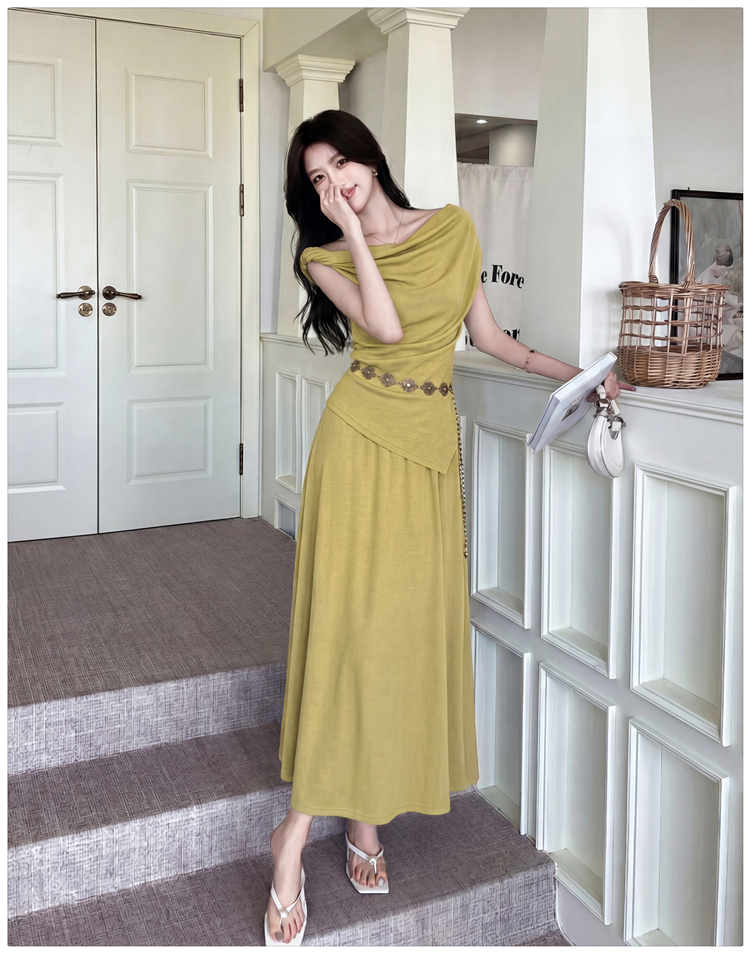 RY3464# 实拍法式斜肩套装一字肩显瘦小个子女不规则下摆上衣T半身裙