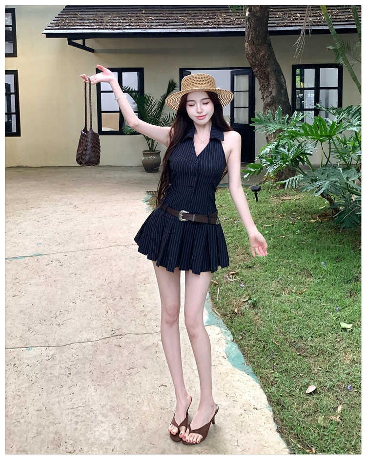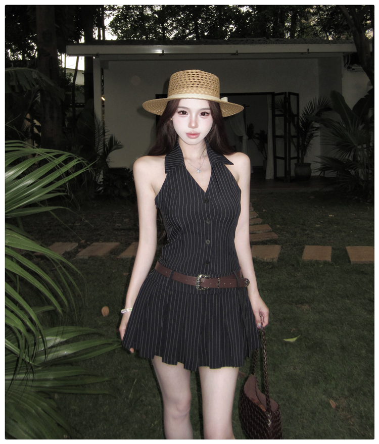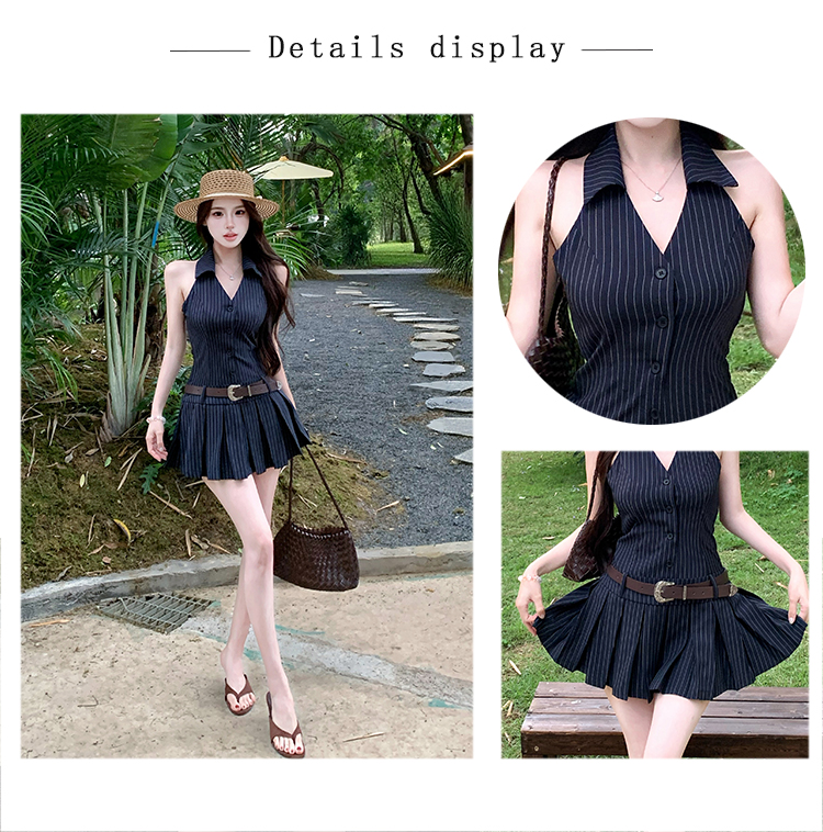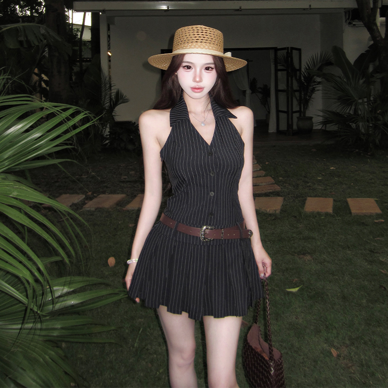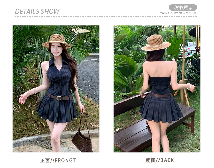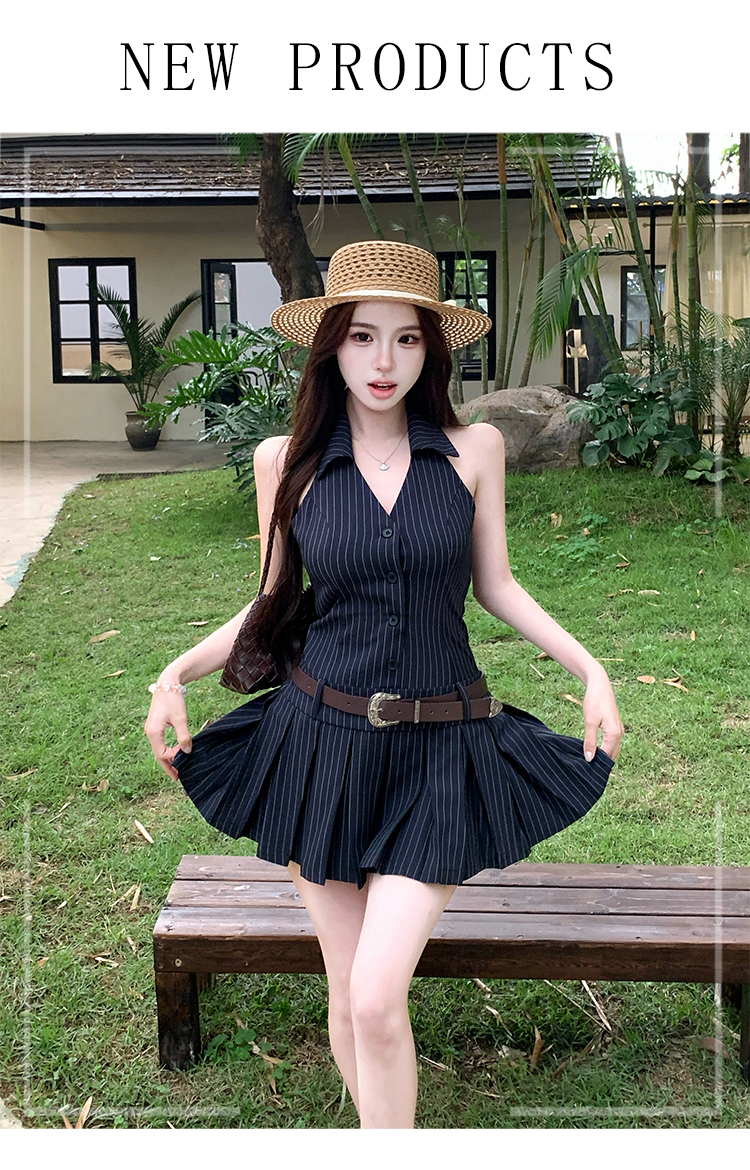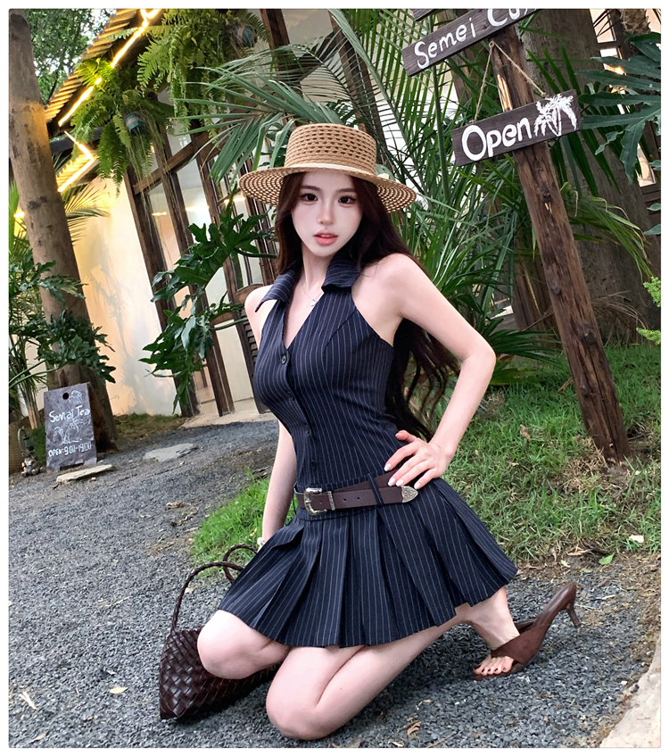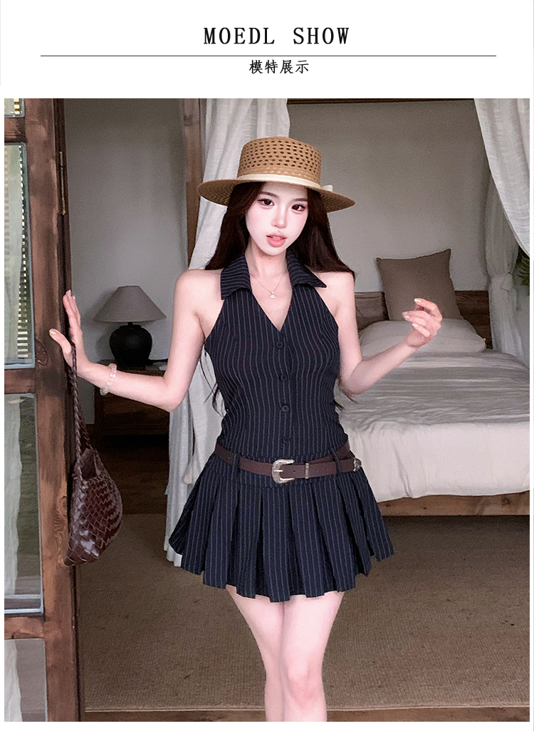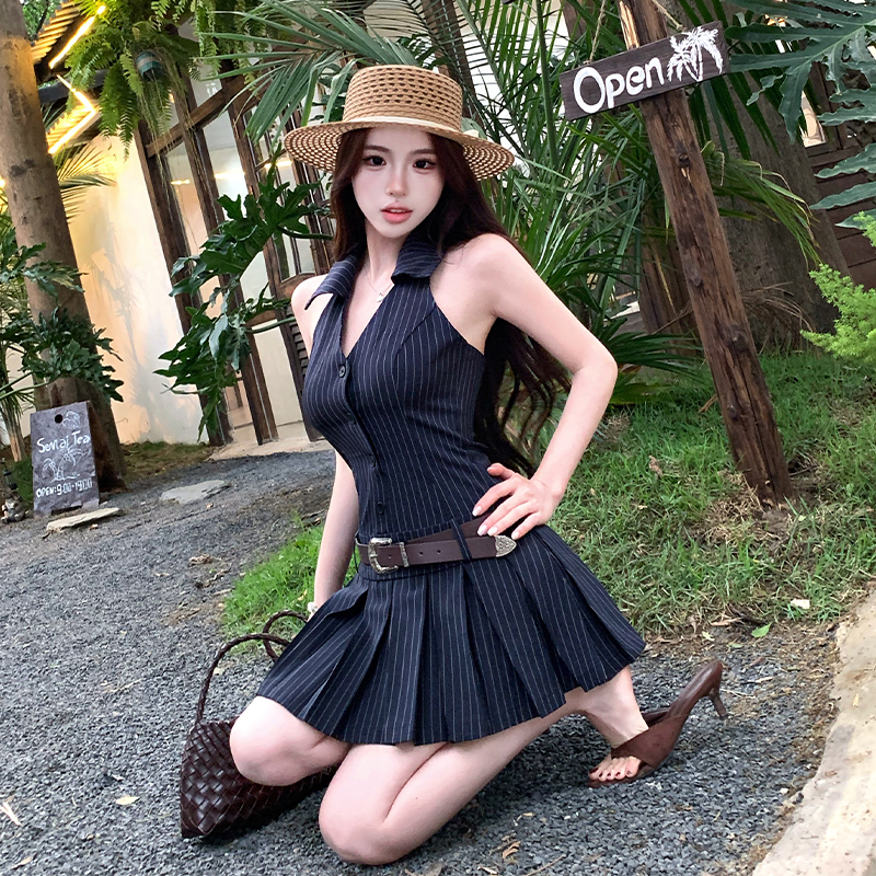 RY3468# 实拍纯欲辣妹无袖V领挂脖条纹连衣裙气质性感御姐风a字百褶裙