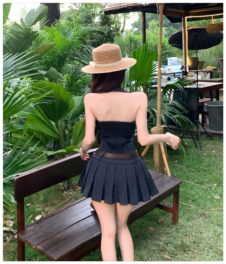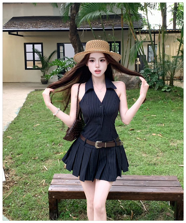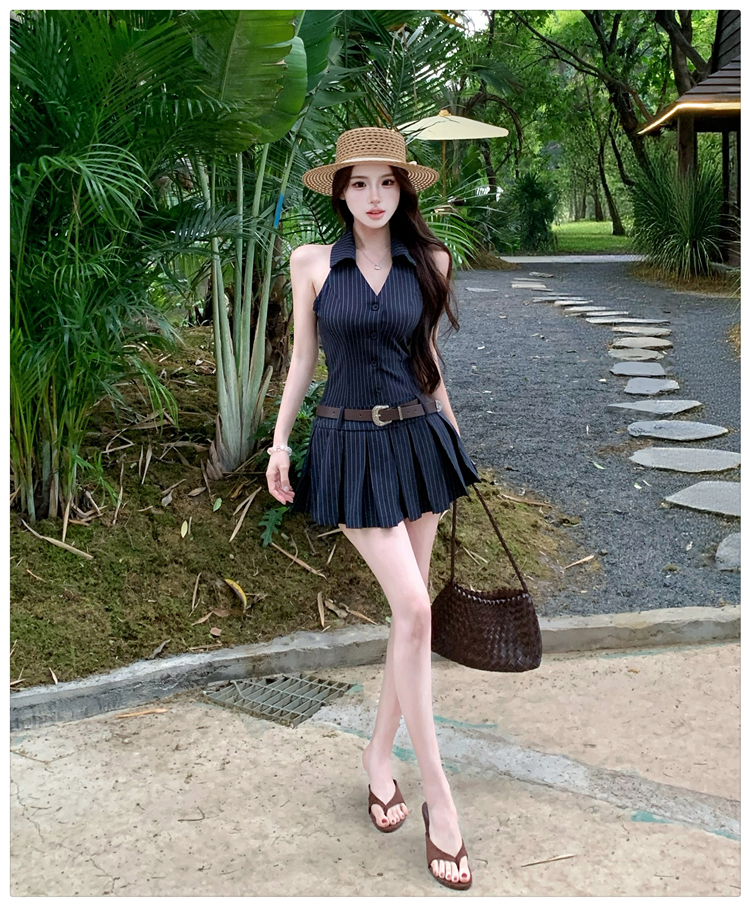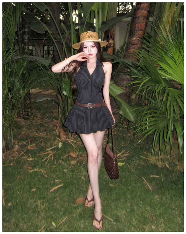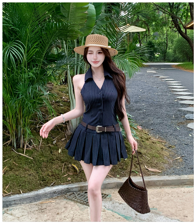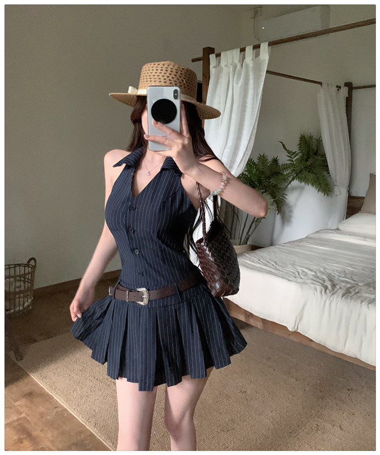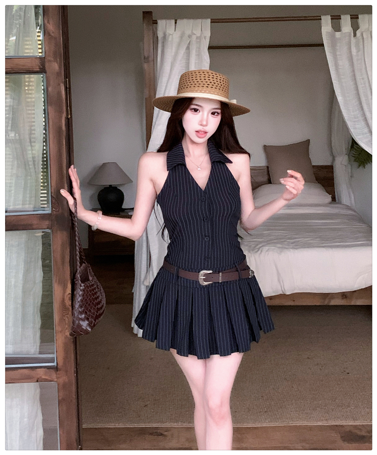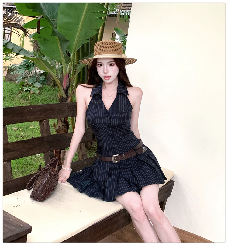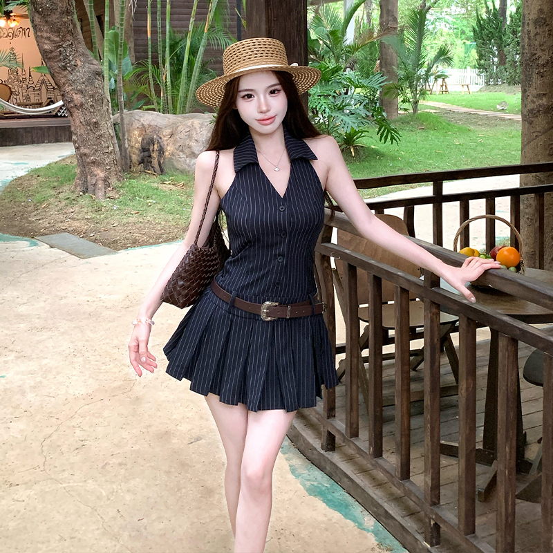 RY3468# 实拍纯欲辣妹无袖V领挂脖条纹连衣裙气质性感御姐风a字百褶裙