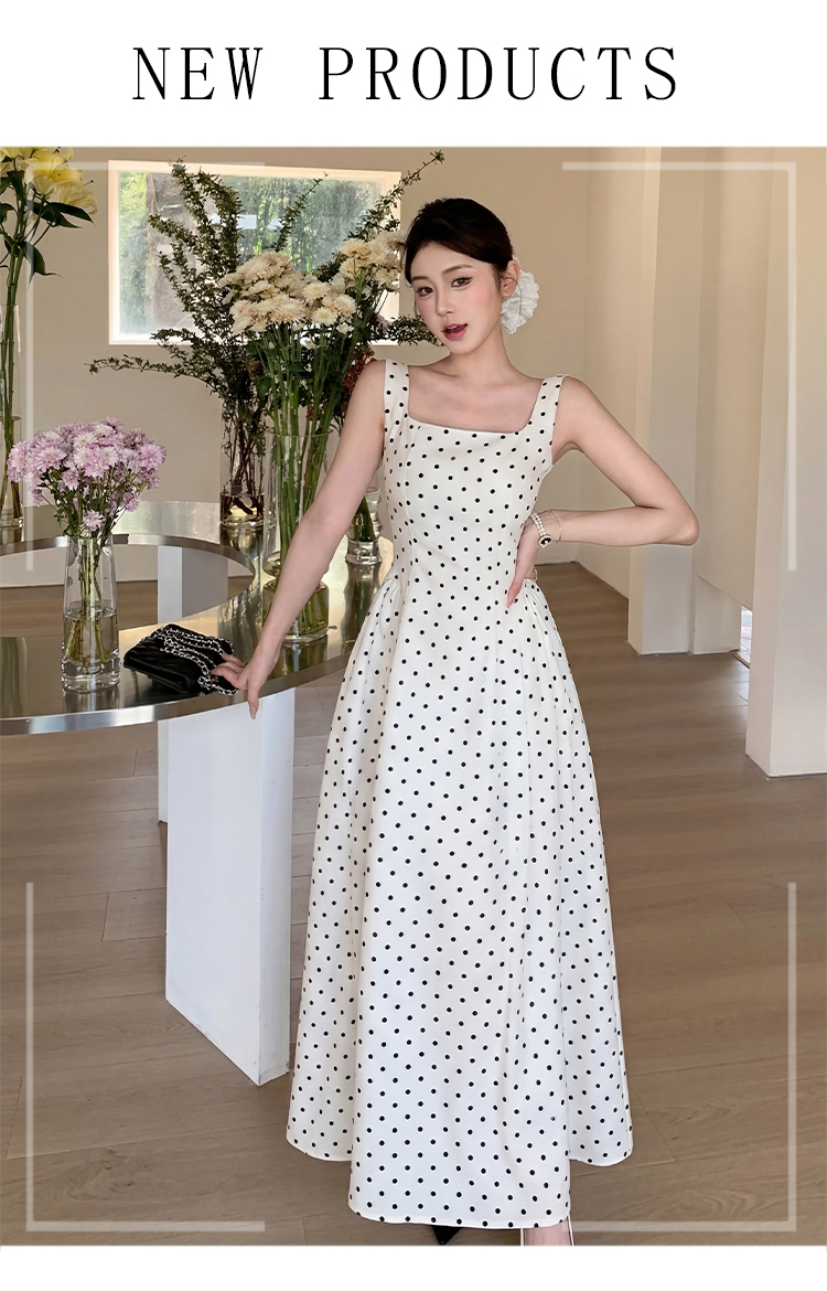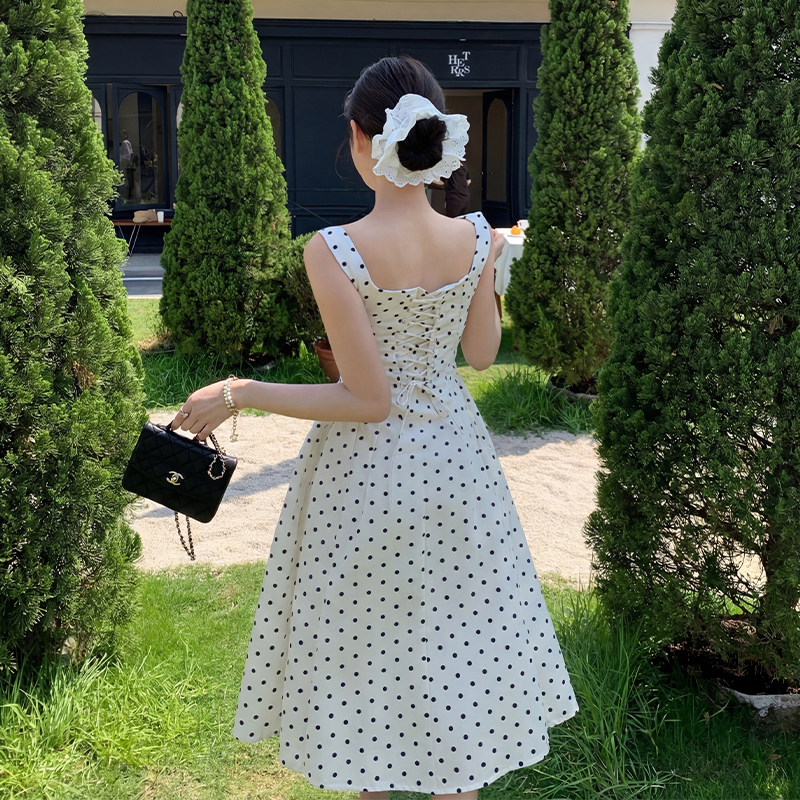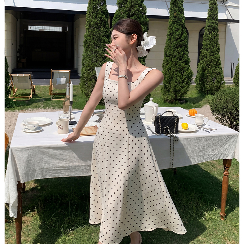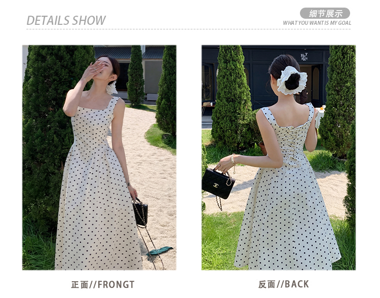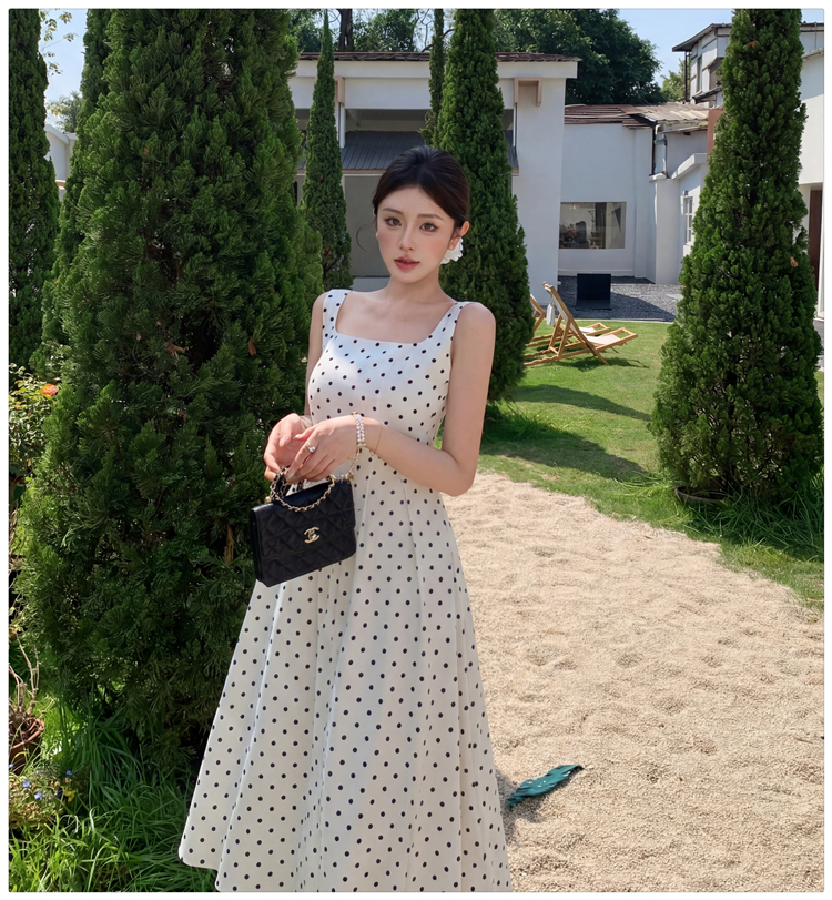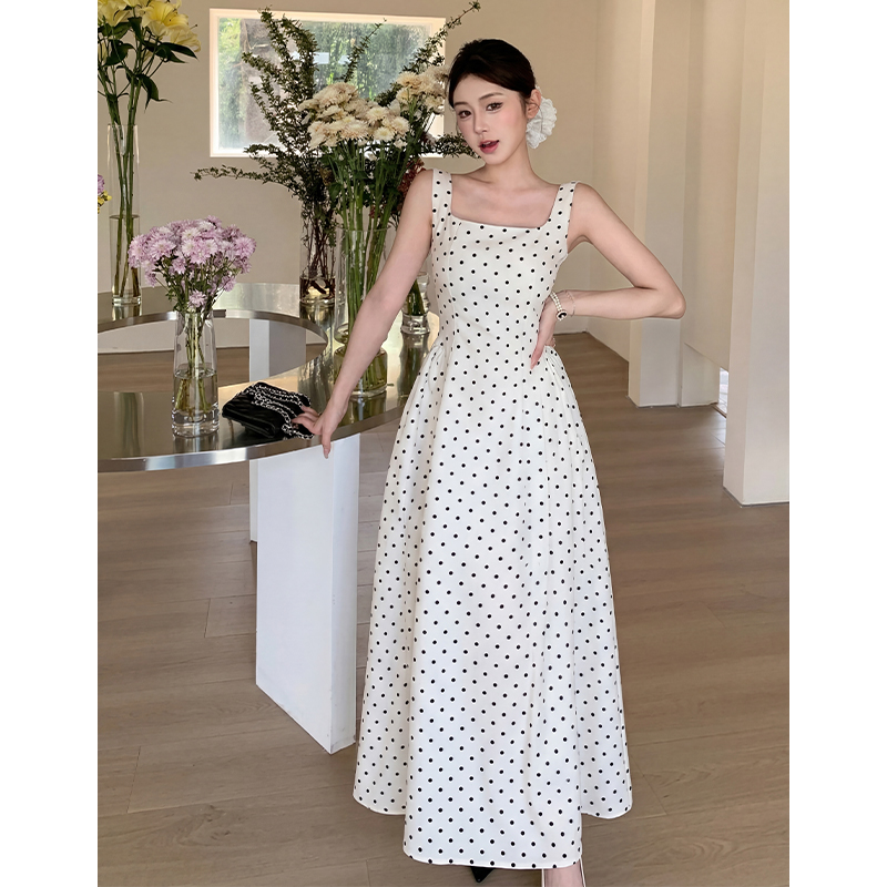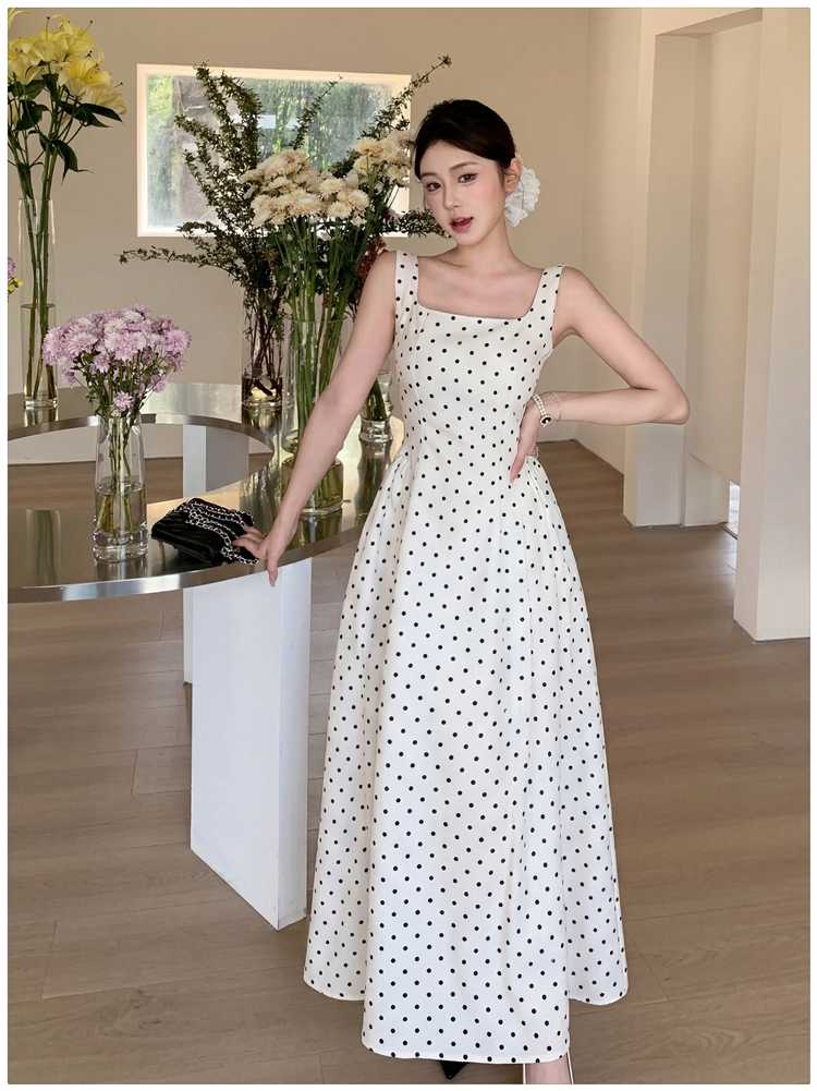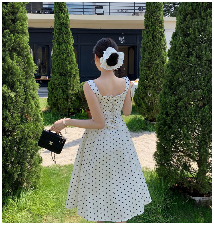 RY3469# 实拍复古赫本连衣裙波点白色气质收腰显瘦长裙子高级掐腰礼服