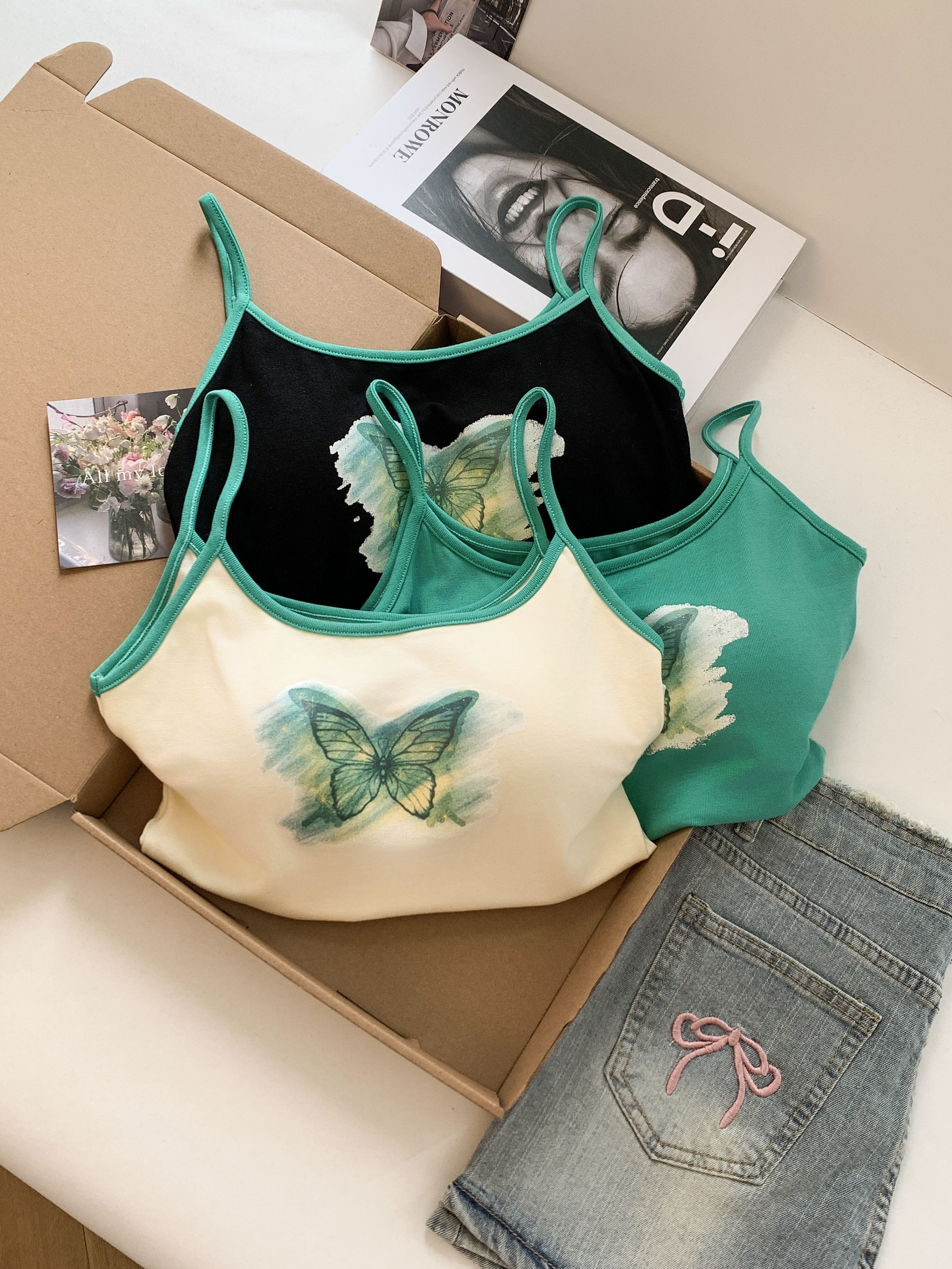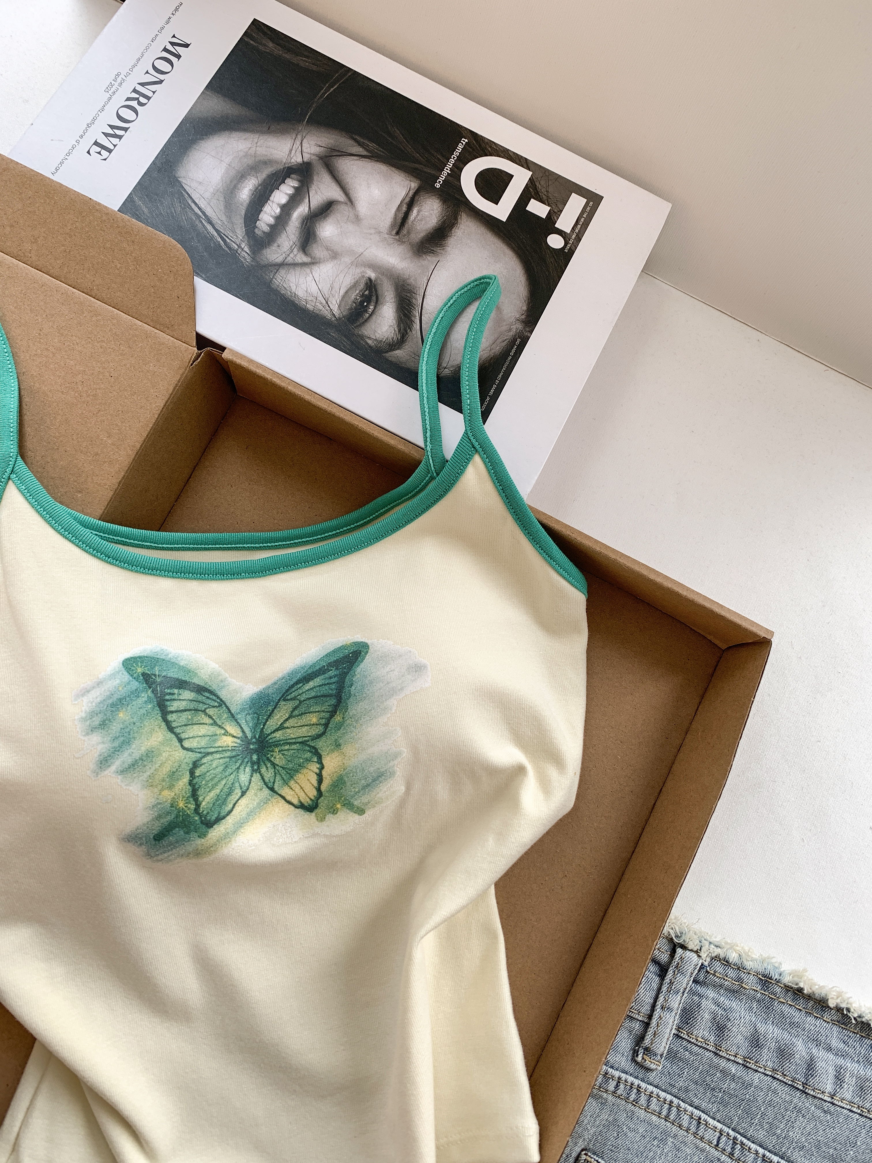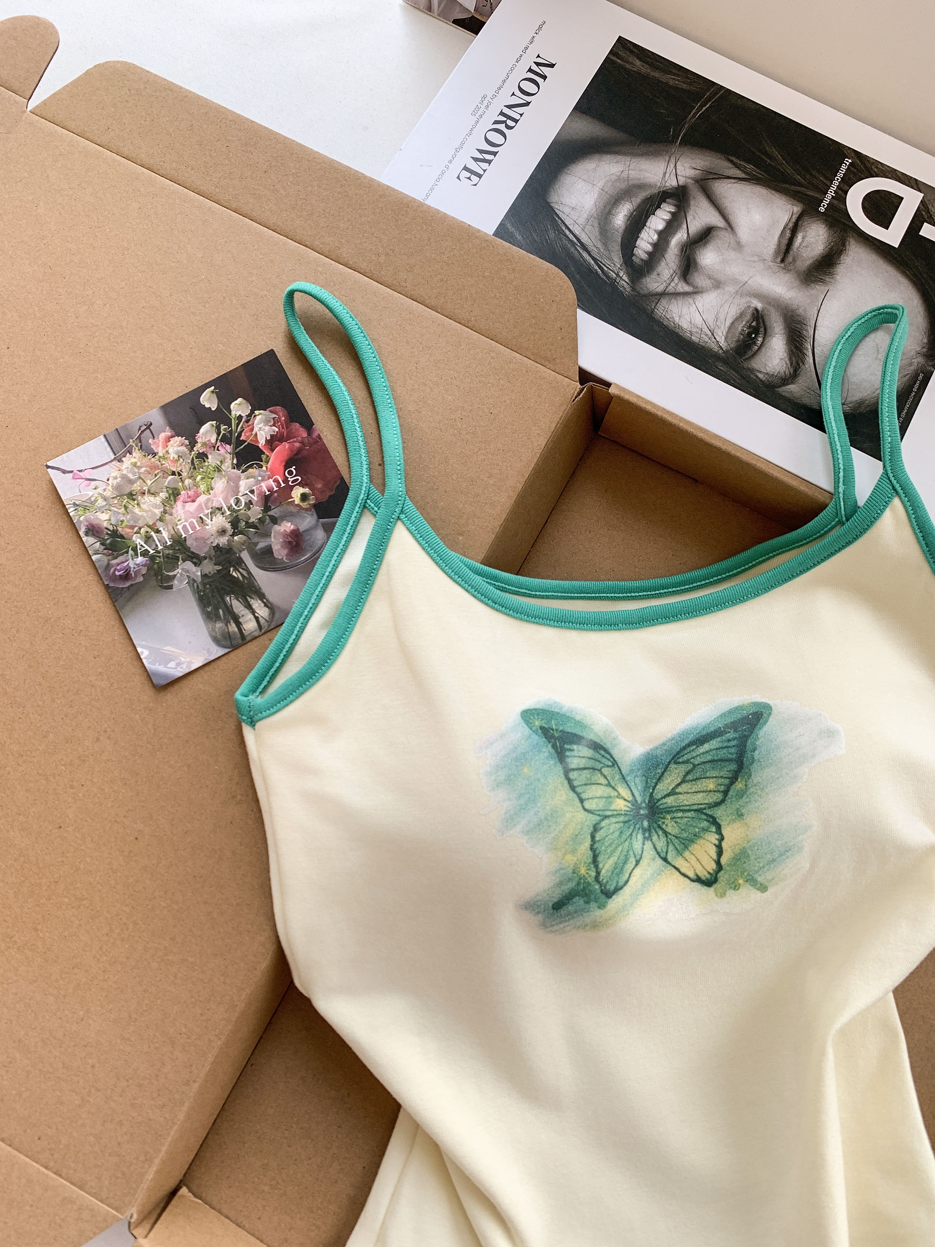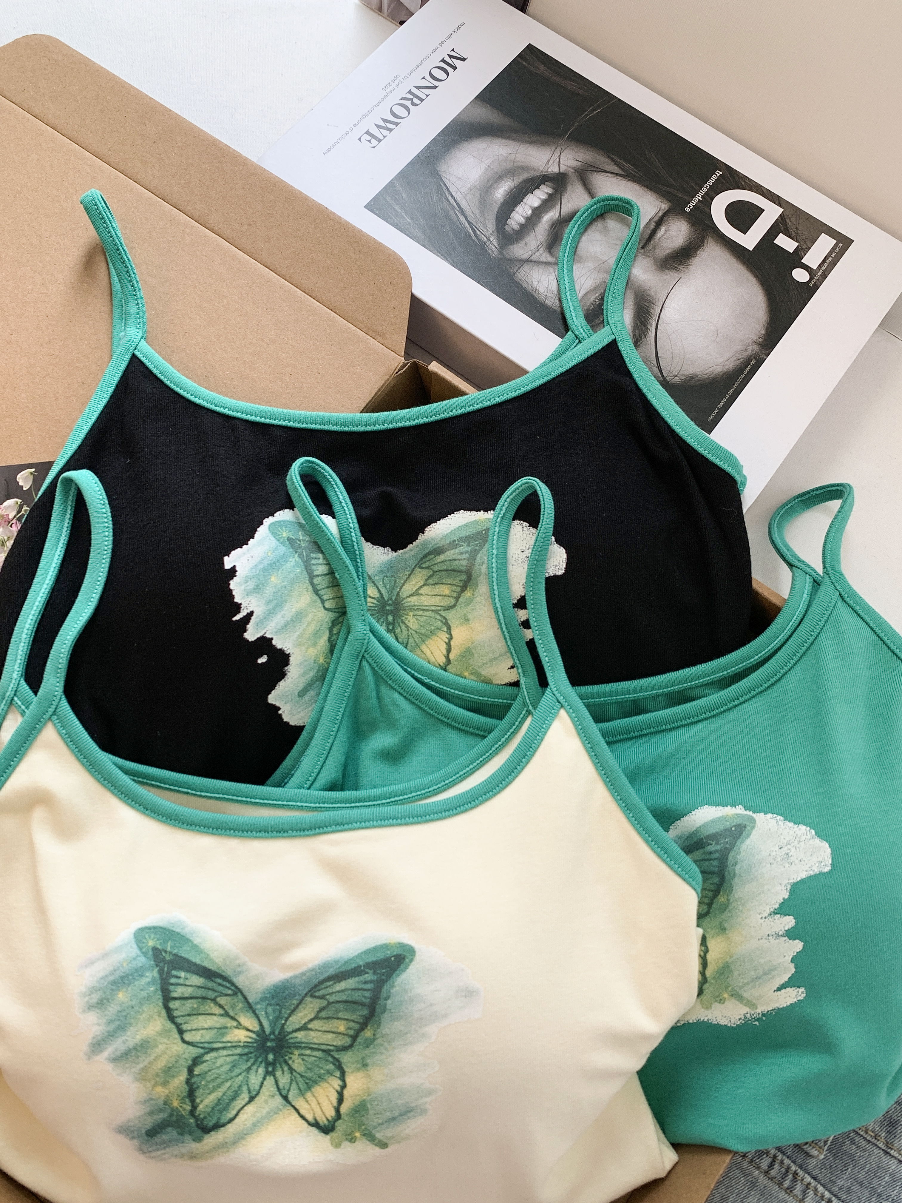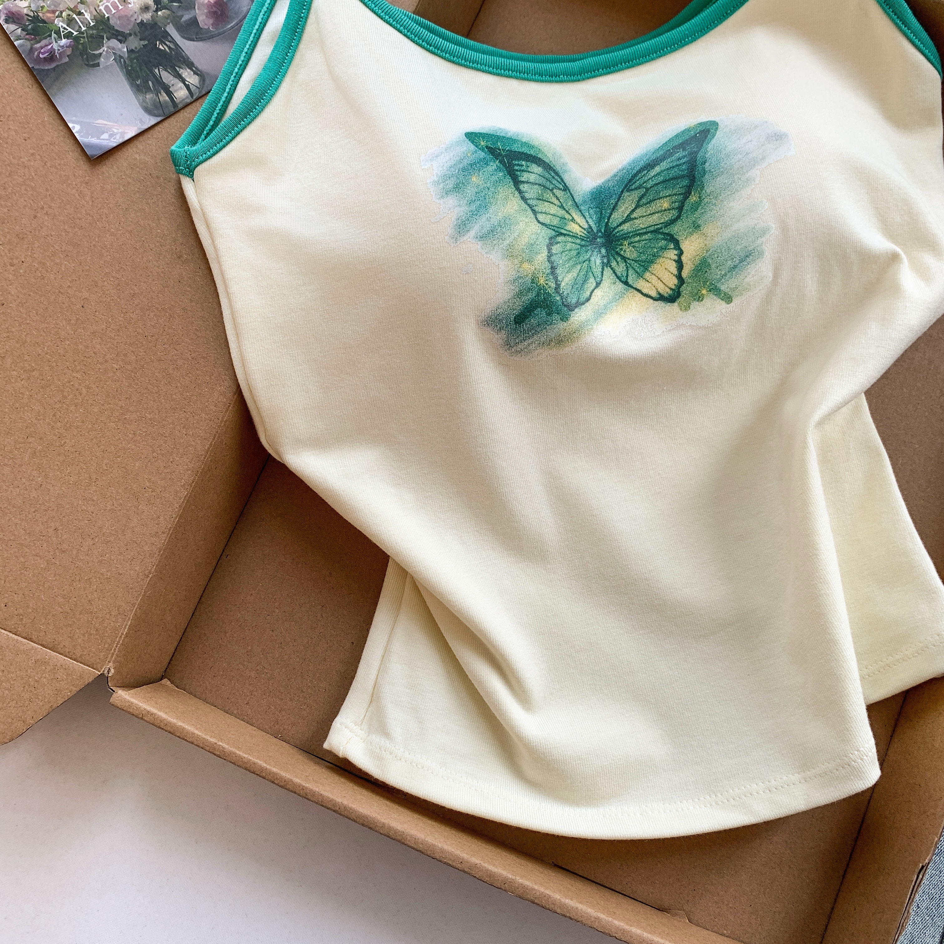 RY3473# 实拍~设计感甜辣妹蝴蝶印花背心女内搭夏季外穿带胸垫短款上衣
