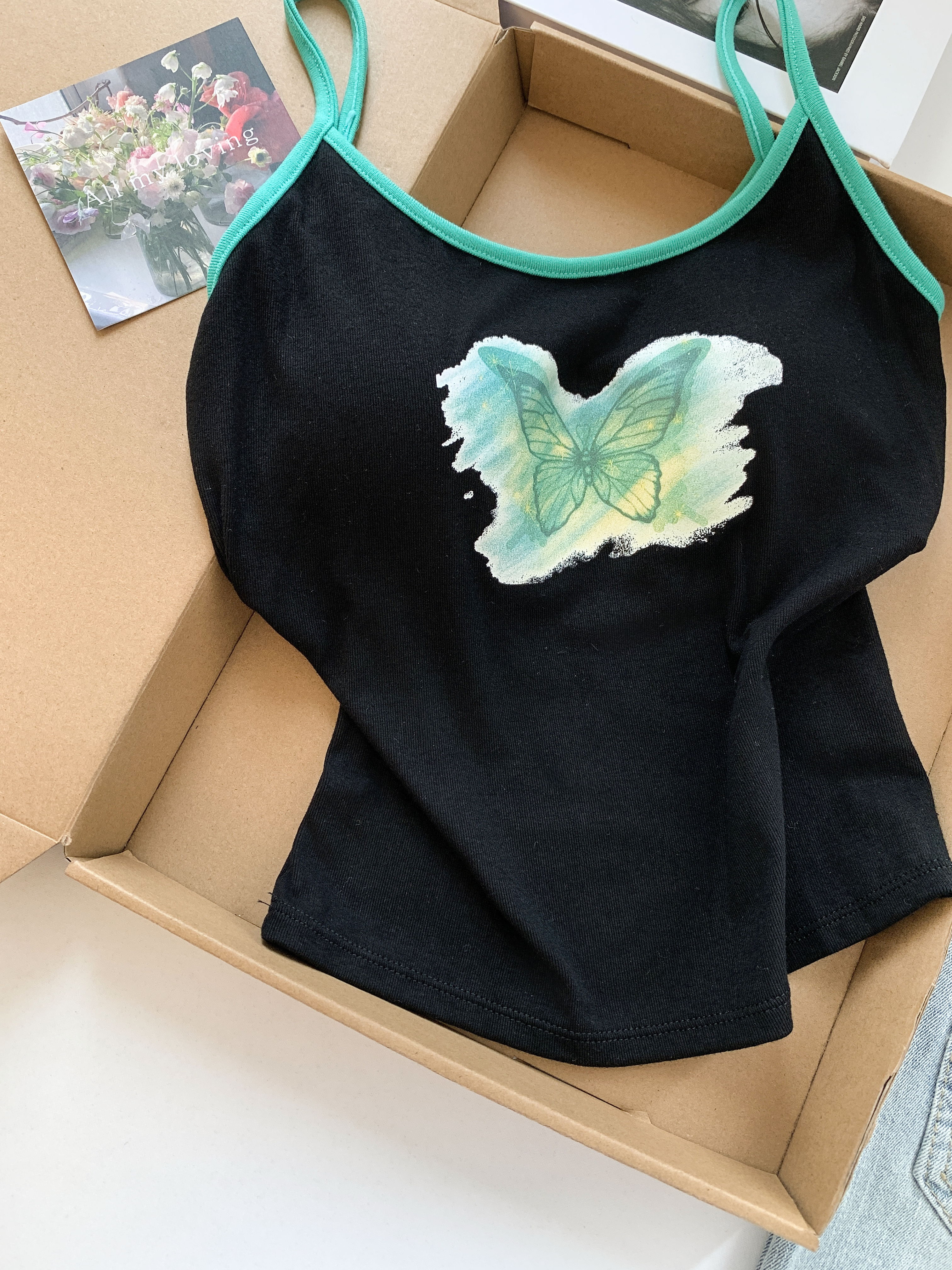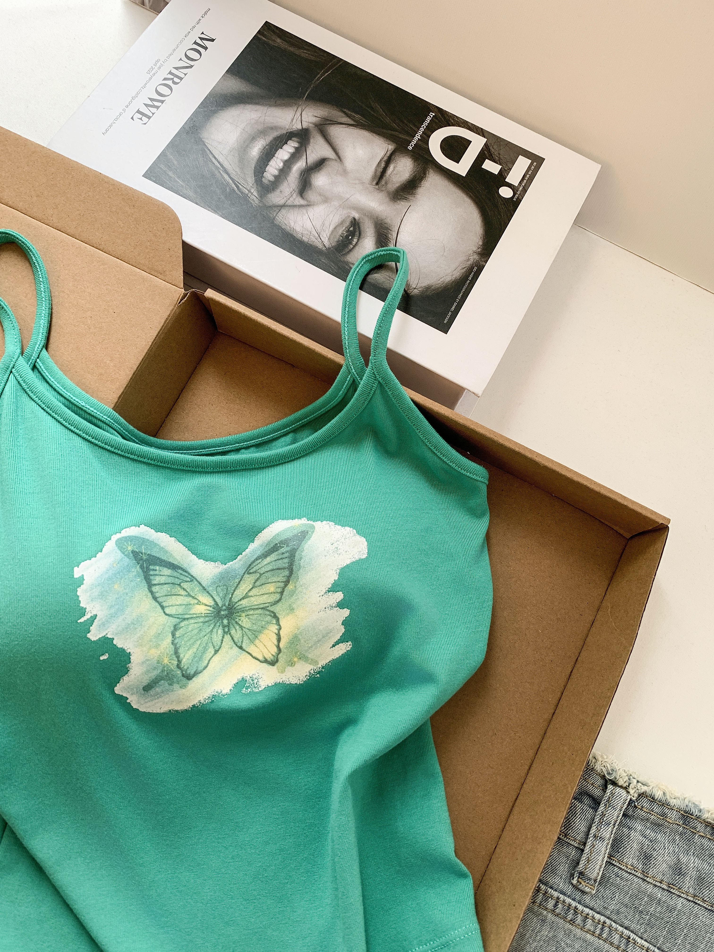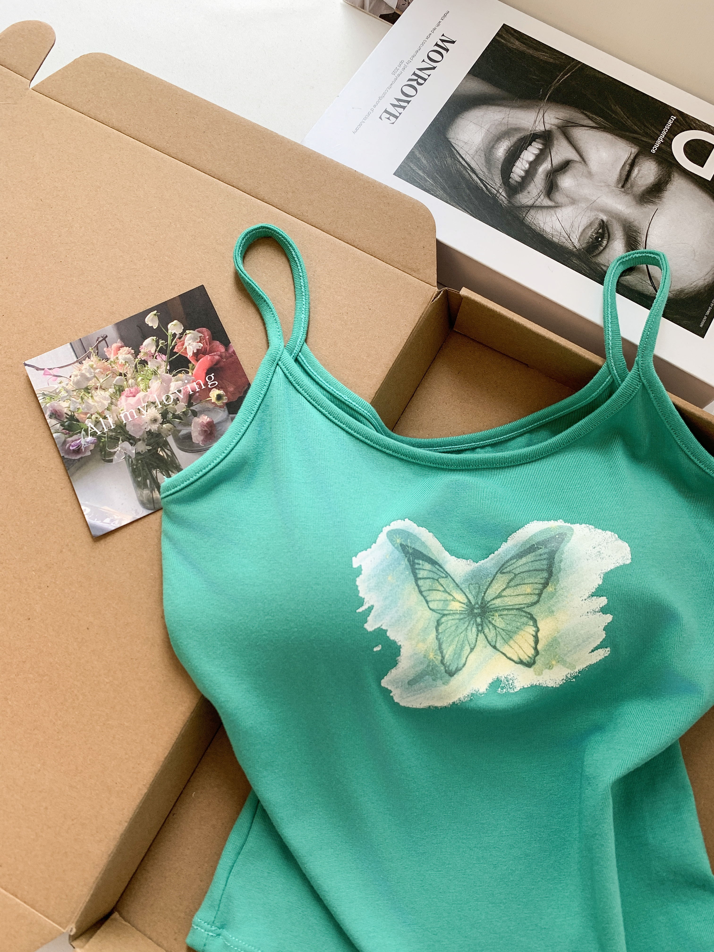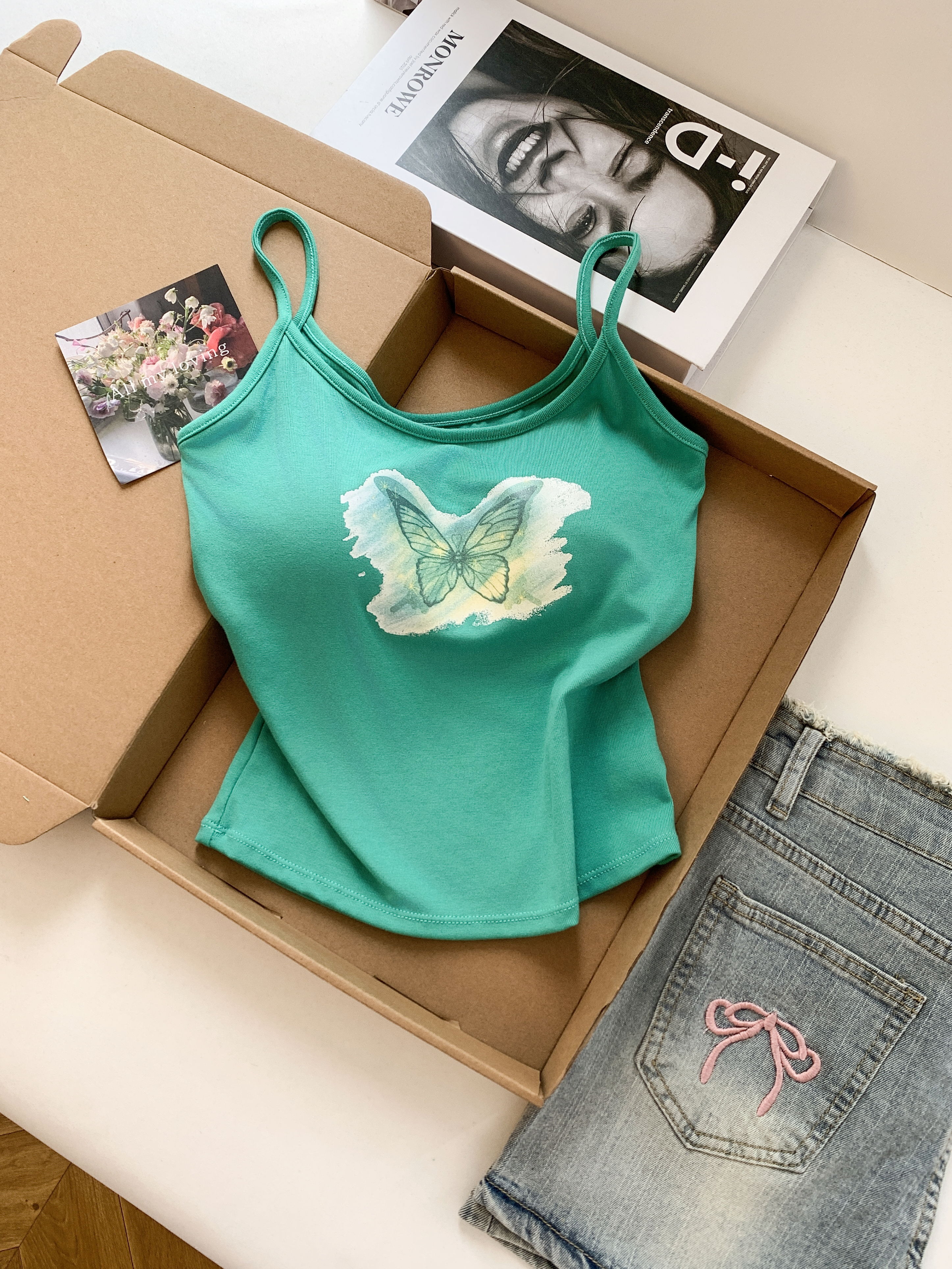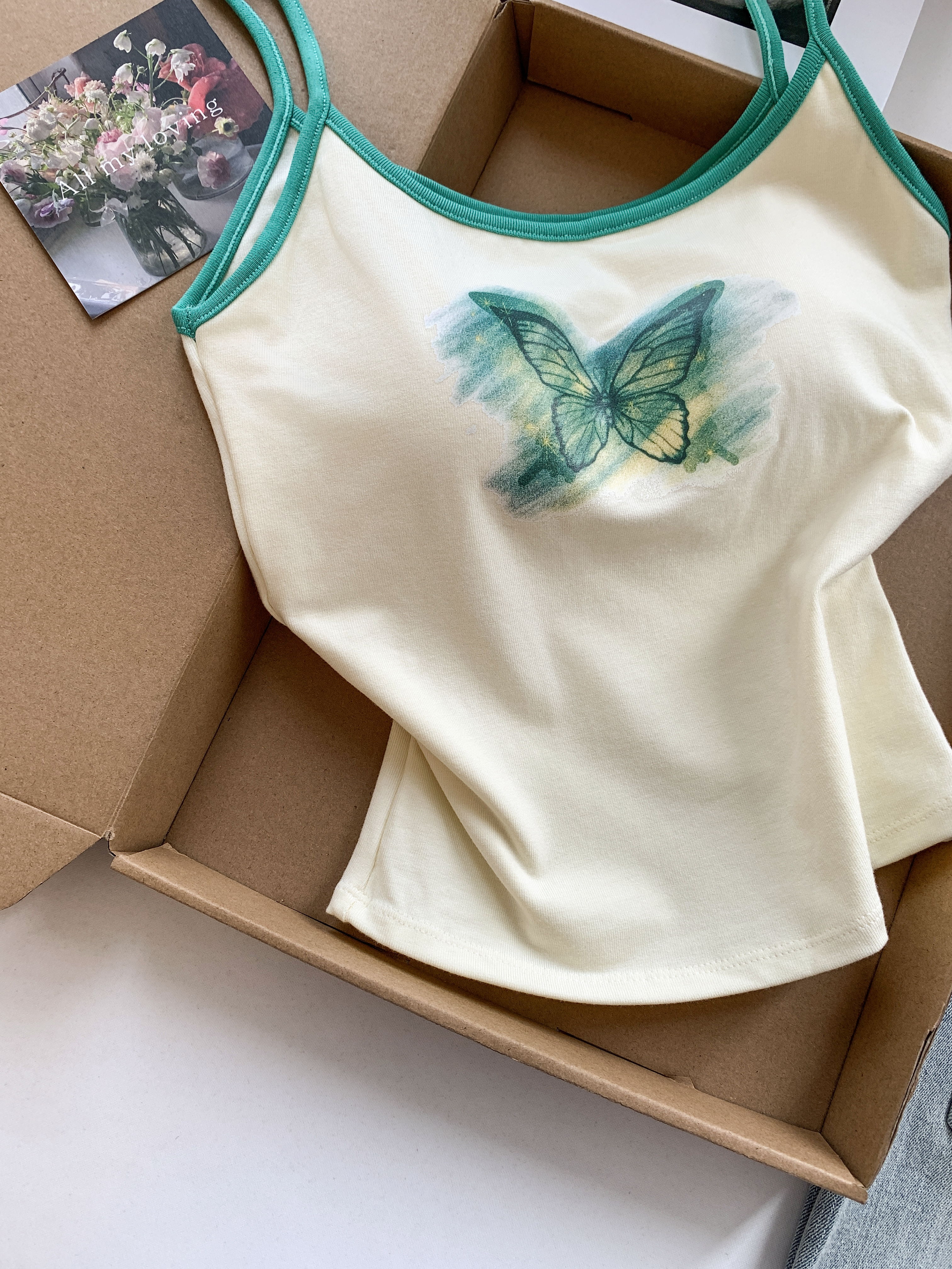 RY3473# 实拍~设计感甜辣妹蝴蝶印花背心女内搭夏季外穿带胸垫短款上衣