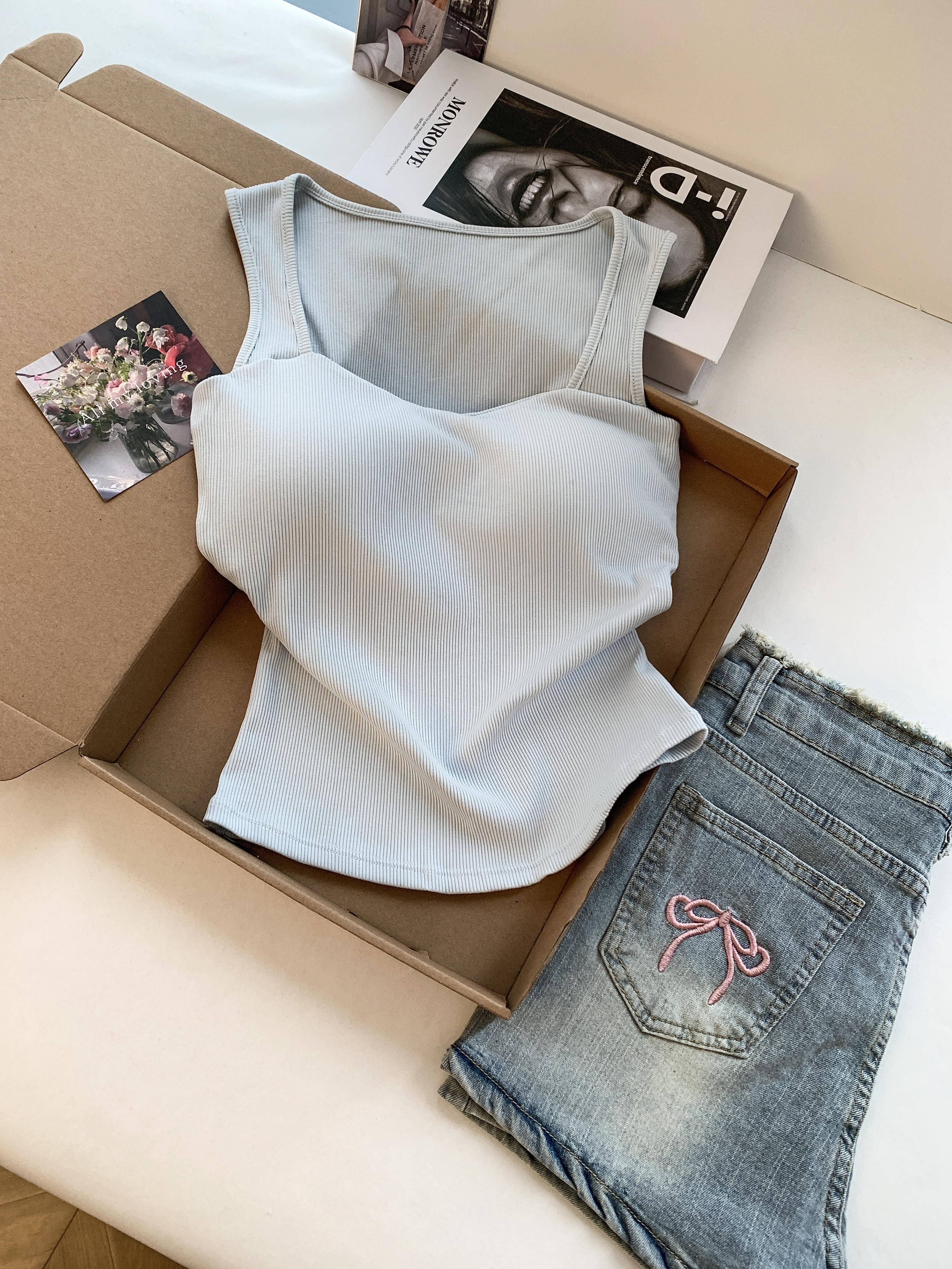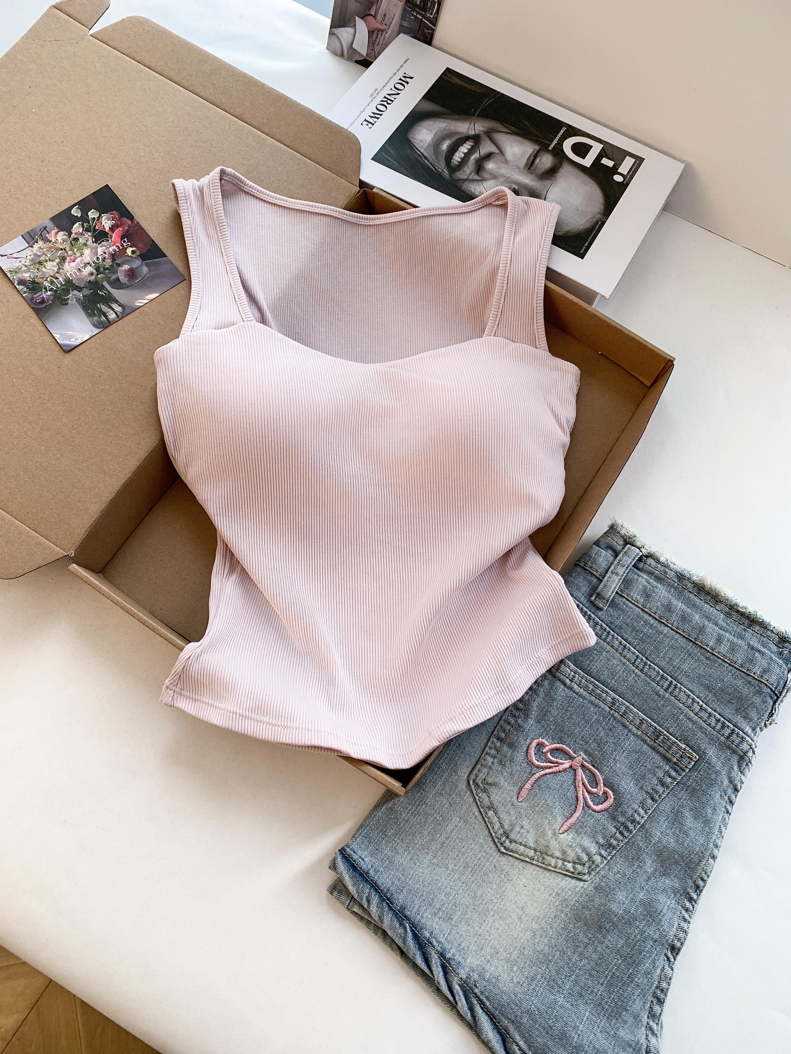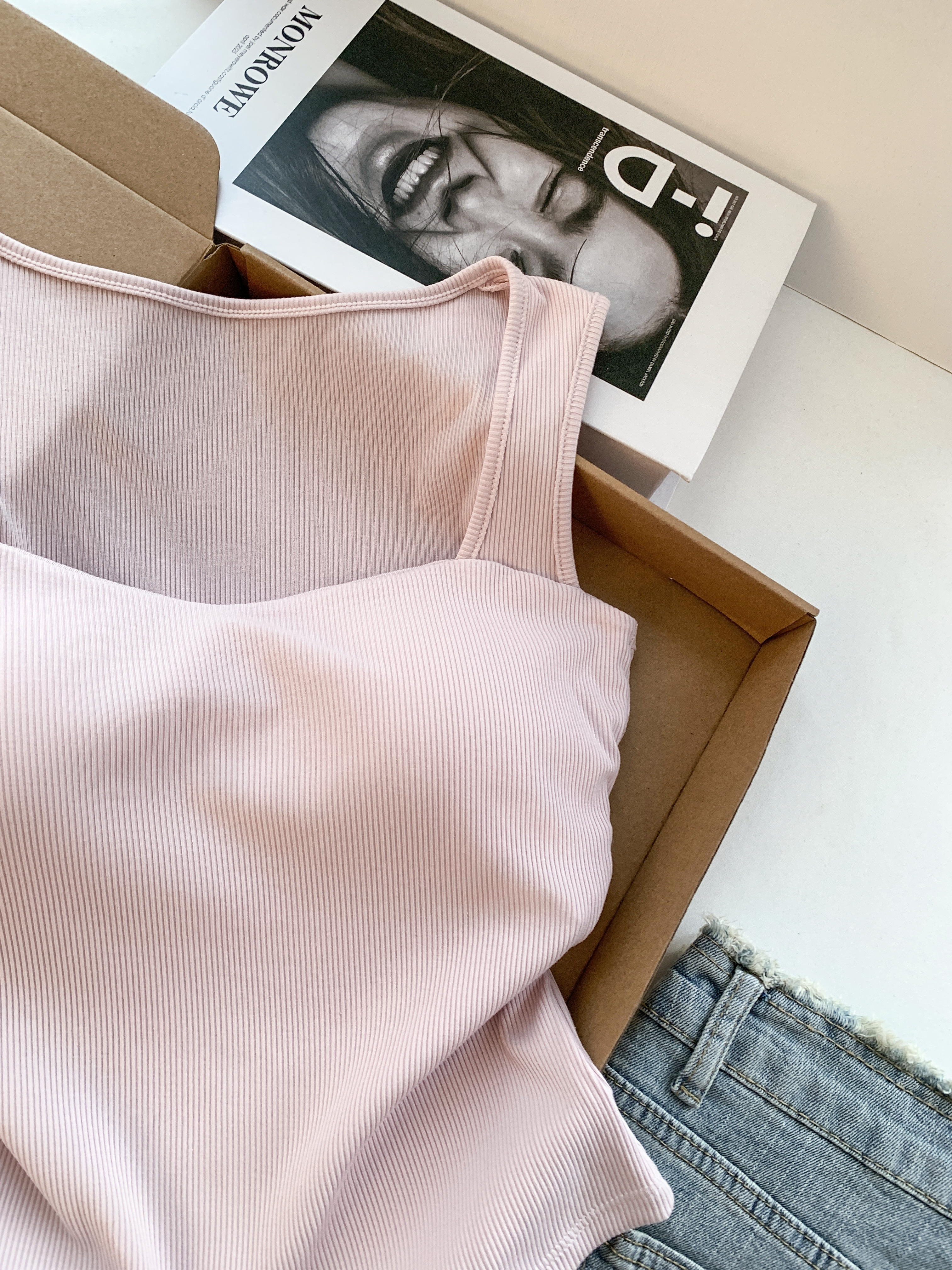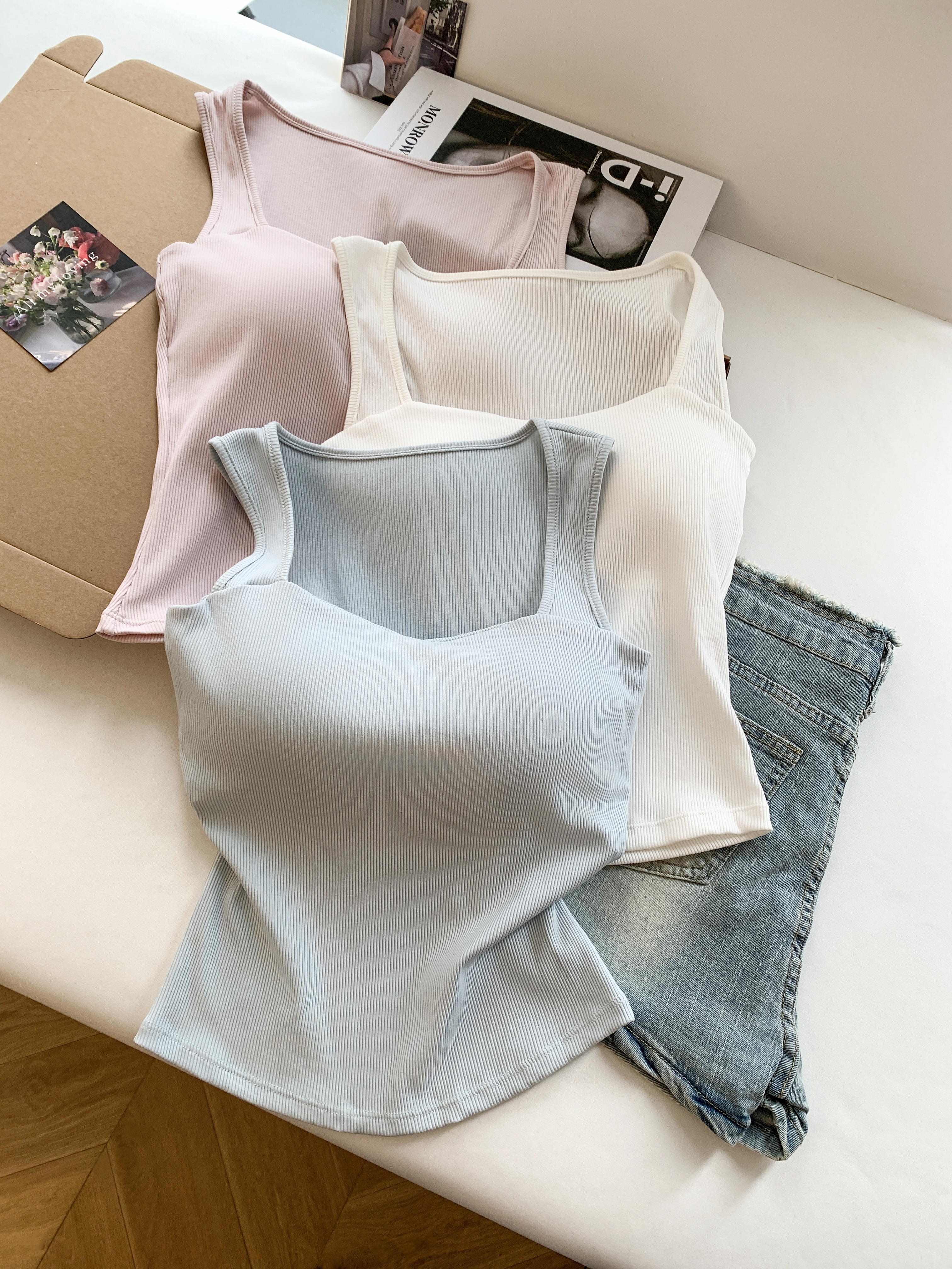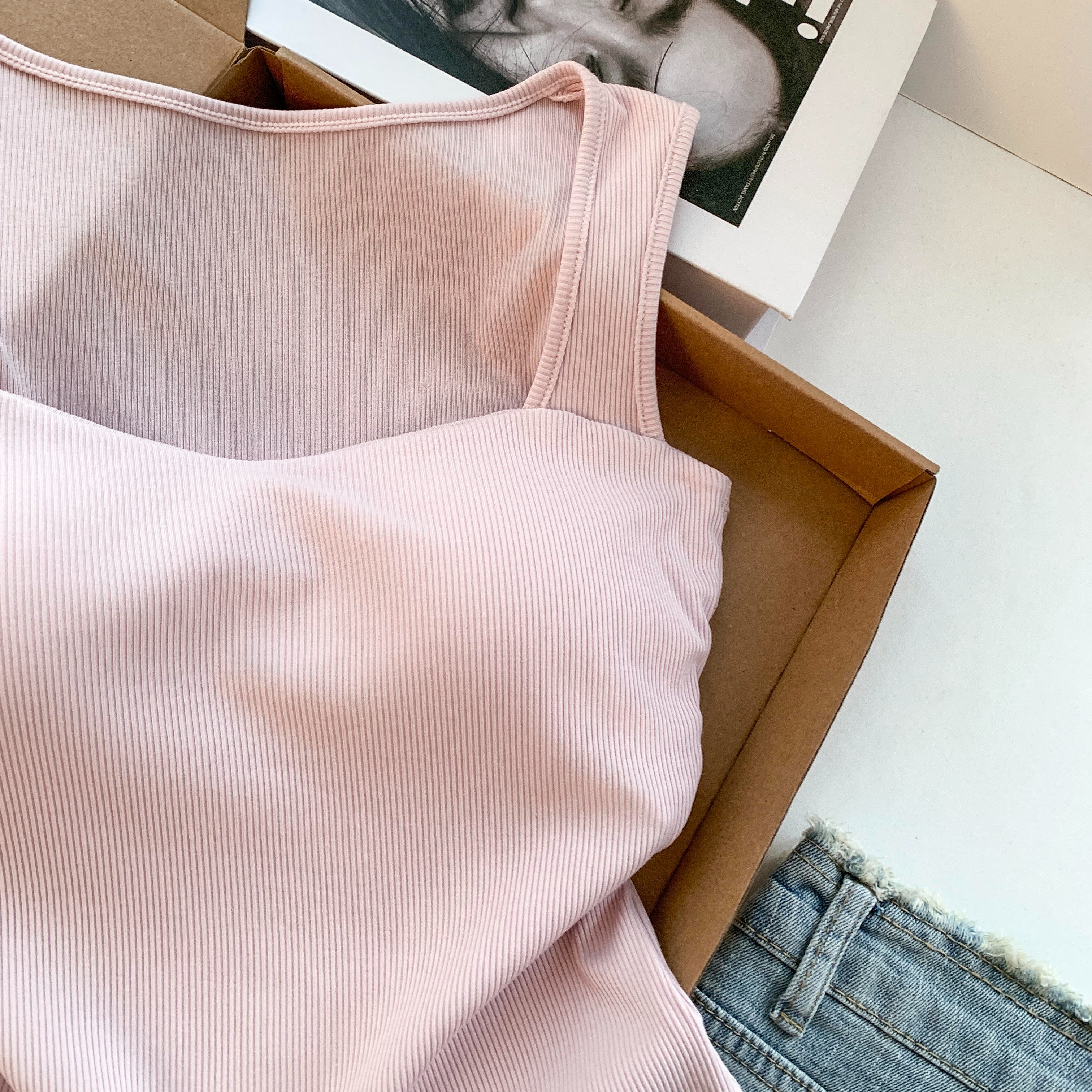 RY3476# 实拍 韩系方领 吊带背心女 夏季外穿带胸垫内搭显瘦抹胸 无袖上衣