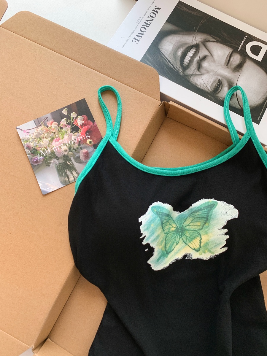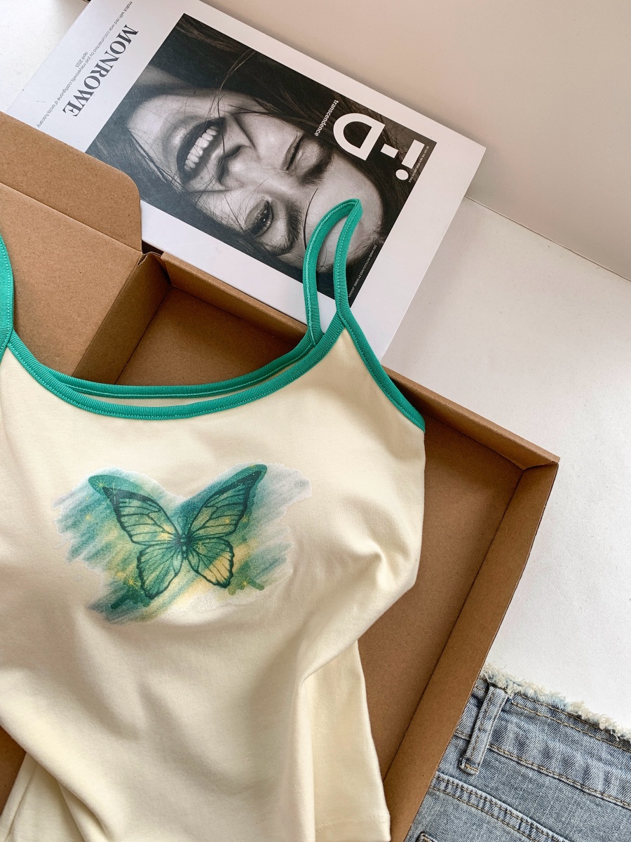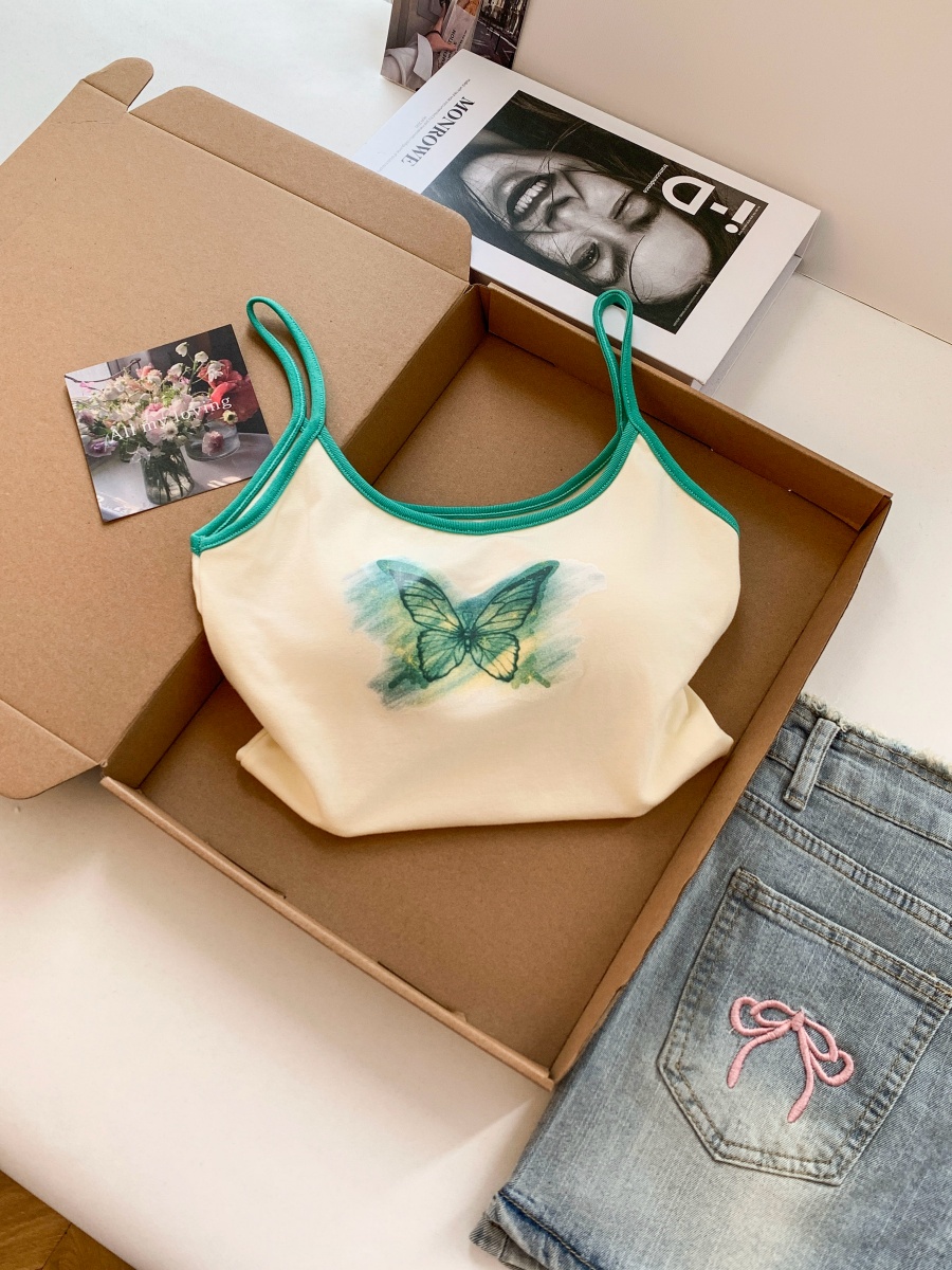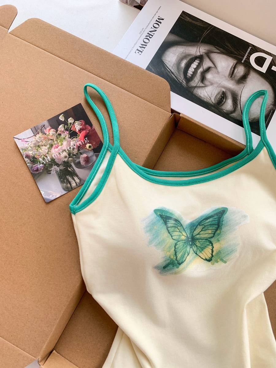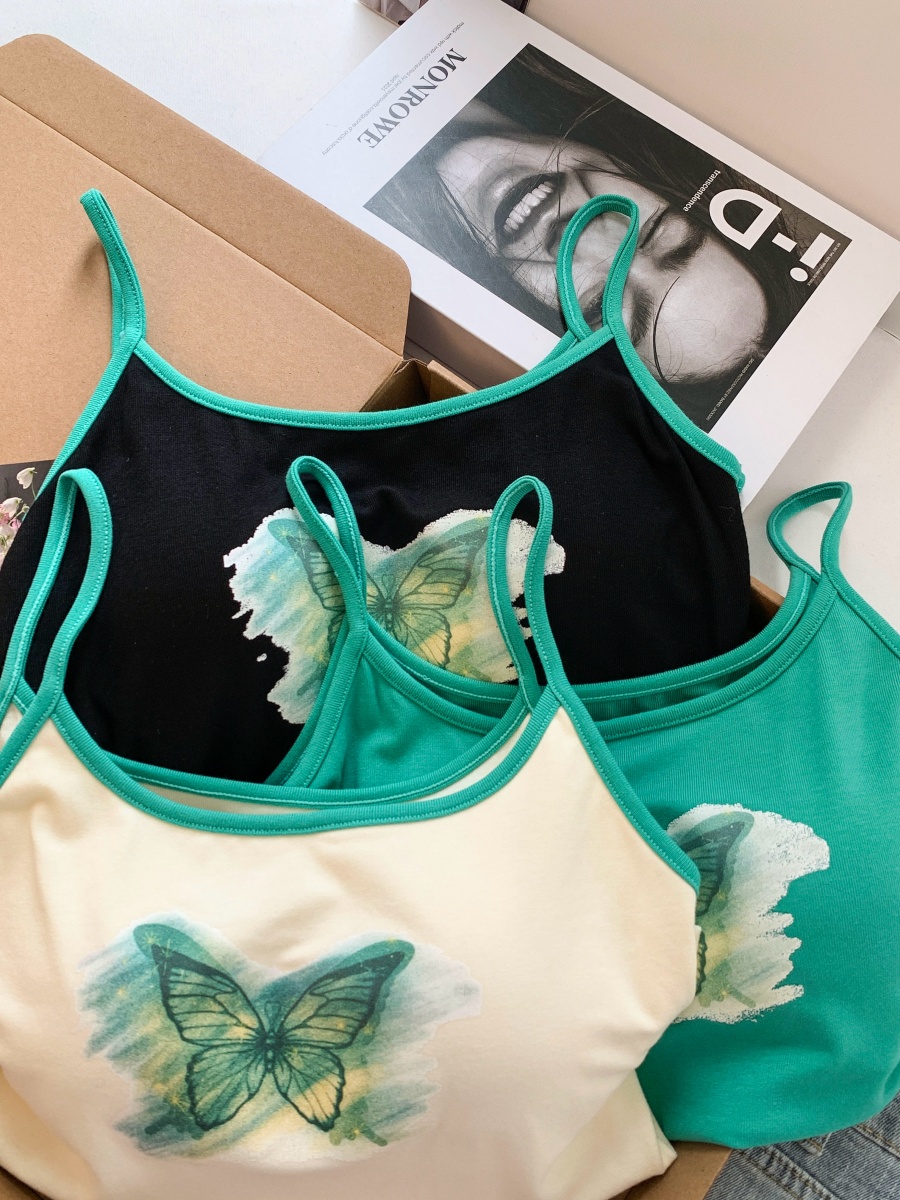RY3478# 实拍~设计感甜辣妹蝴蝶印花背心女内搭夏季外穿带胸垫短款上衣