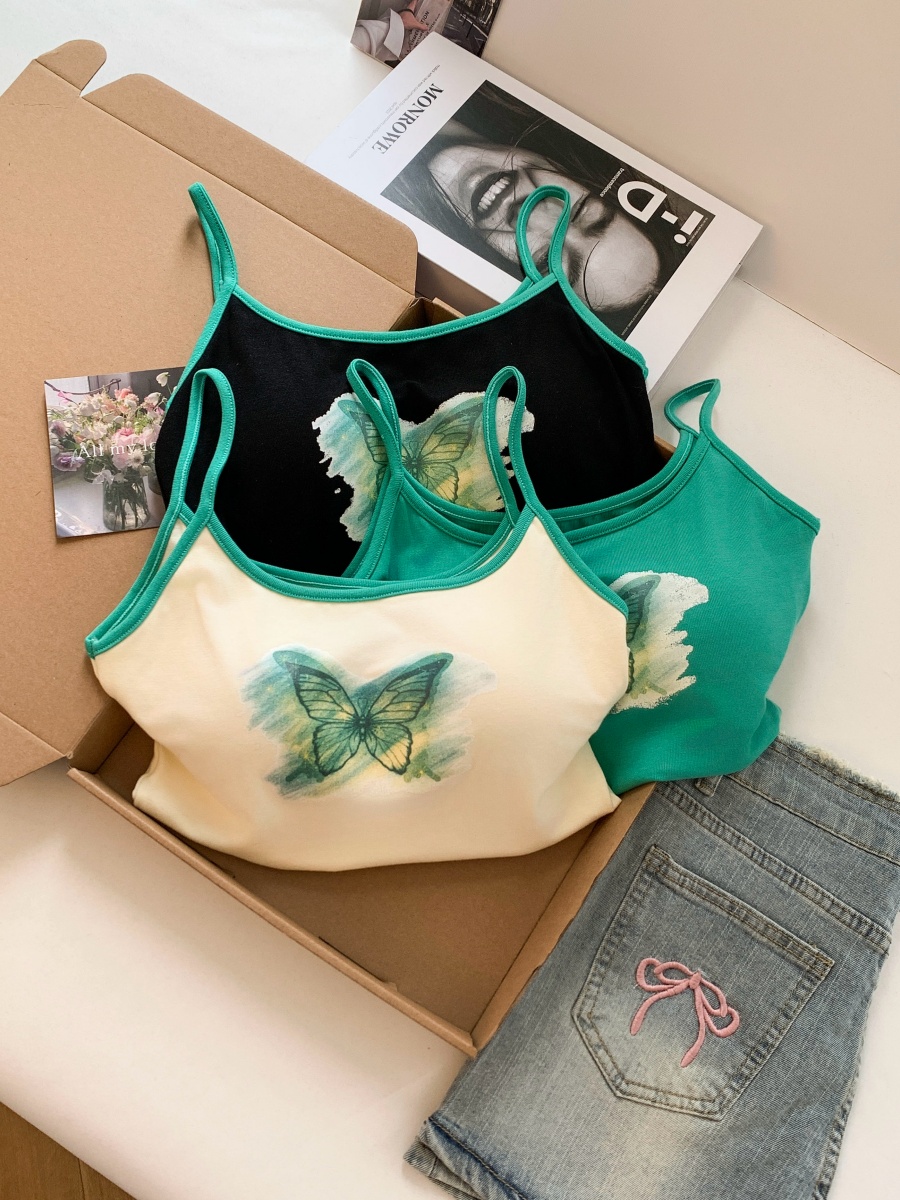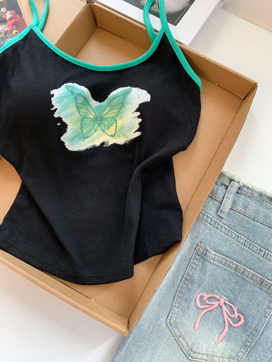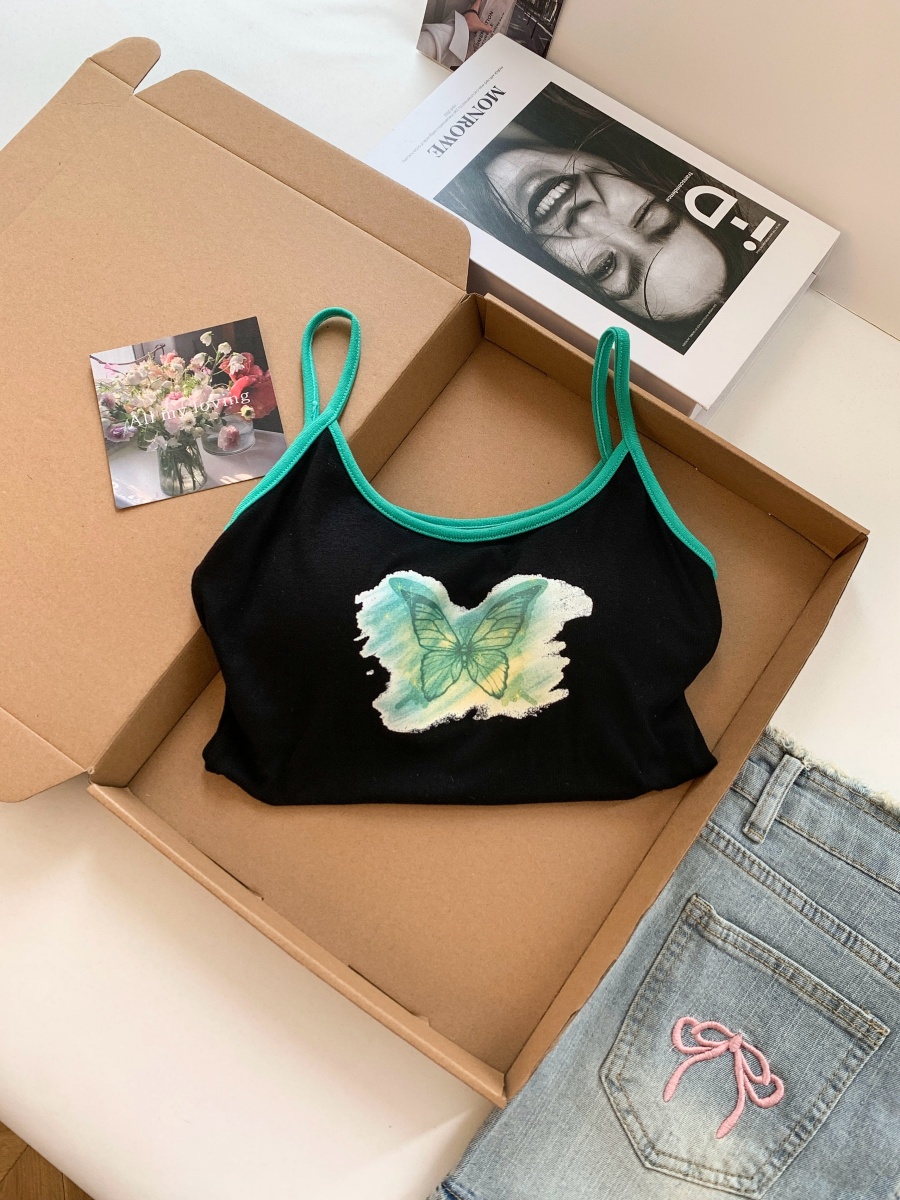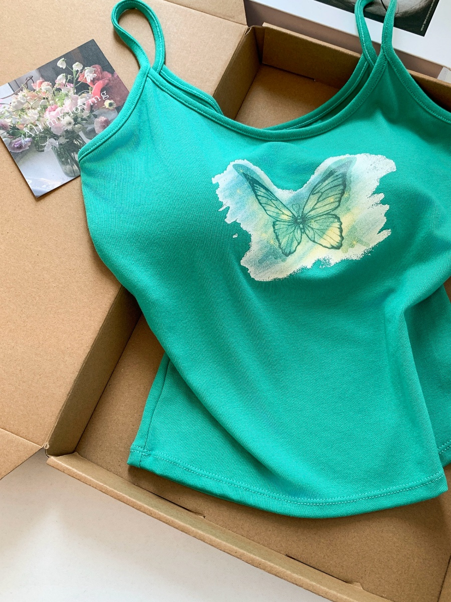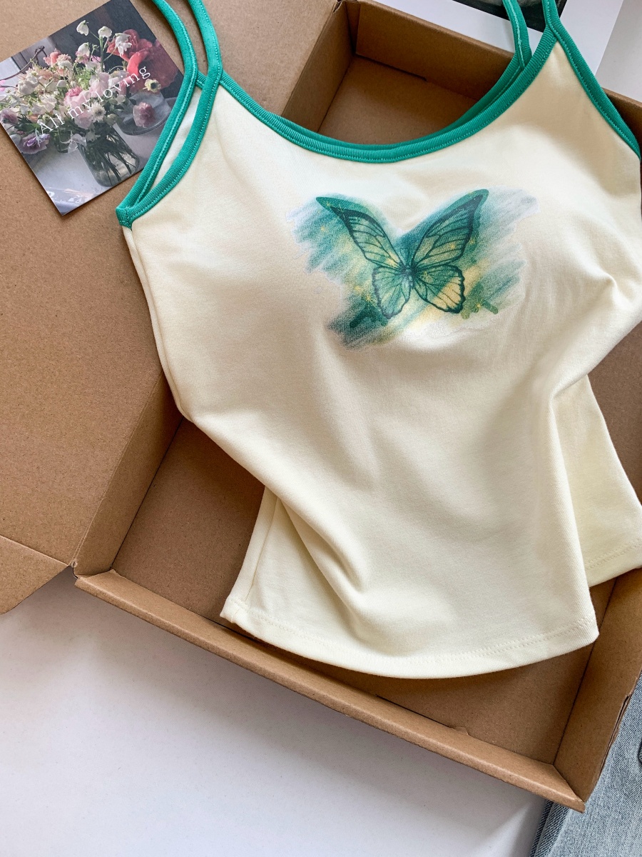 RY3478# 实拍~设计感甜辣妹蝴蝶印花背心女内搭夏季外穿带胸垫短款上衣