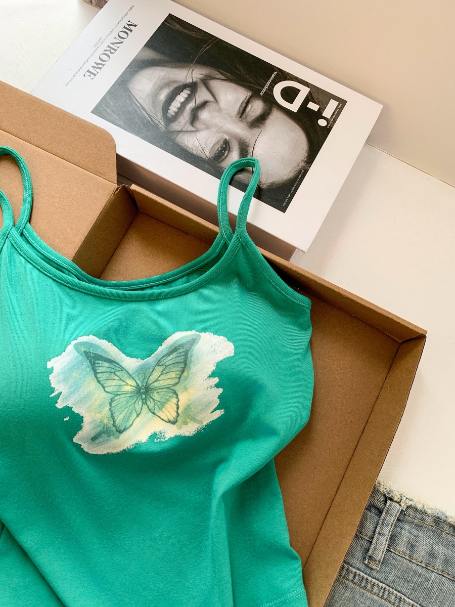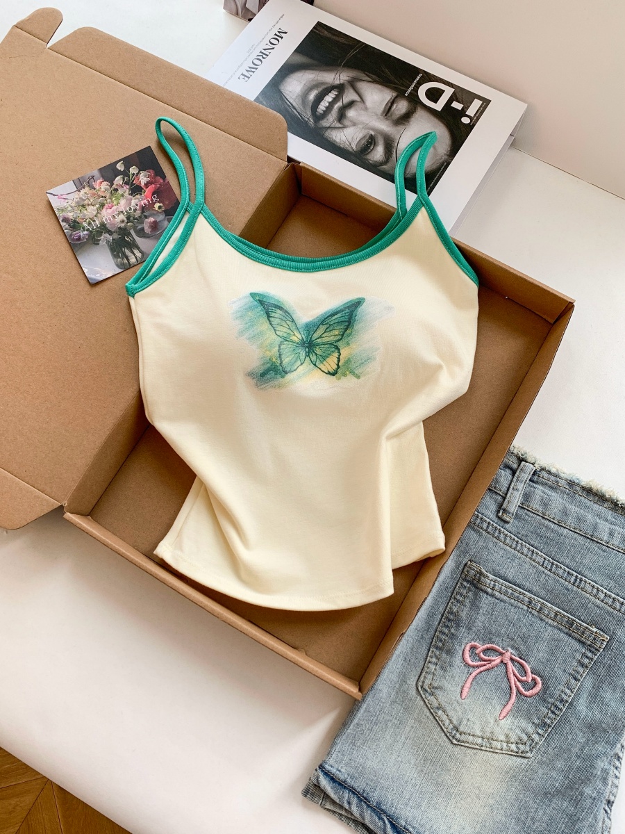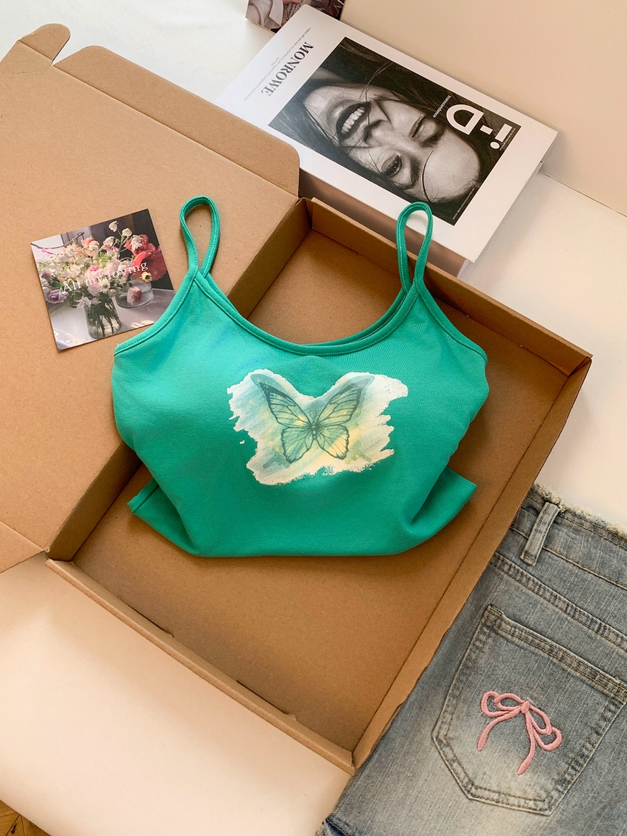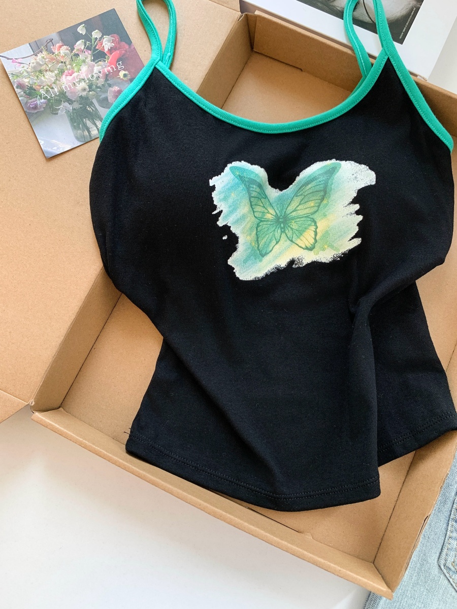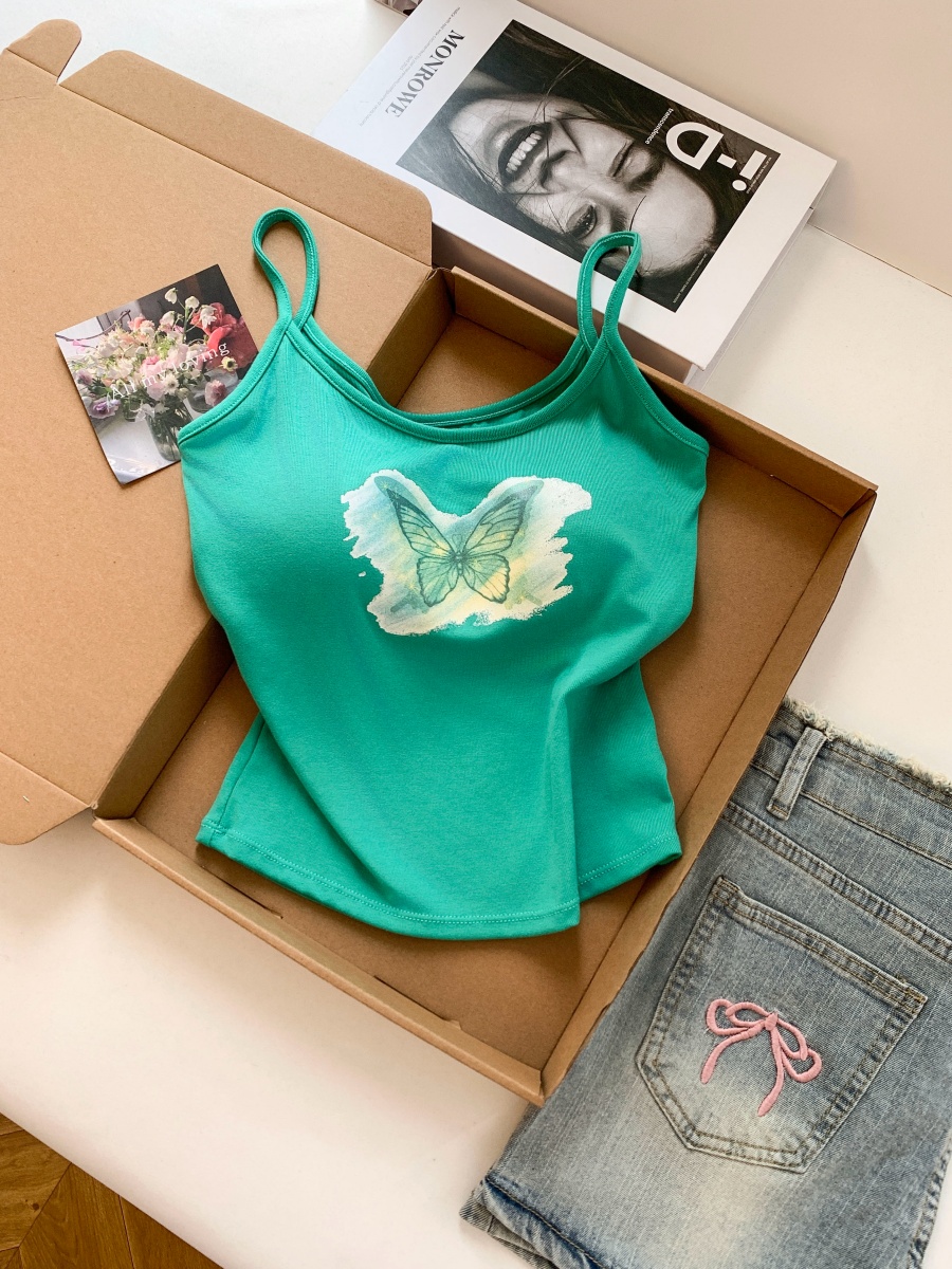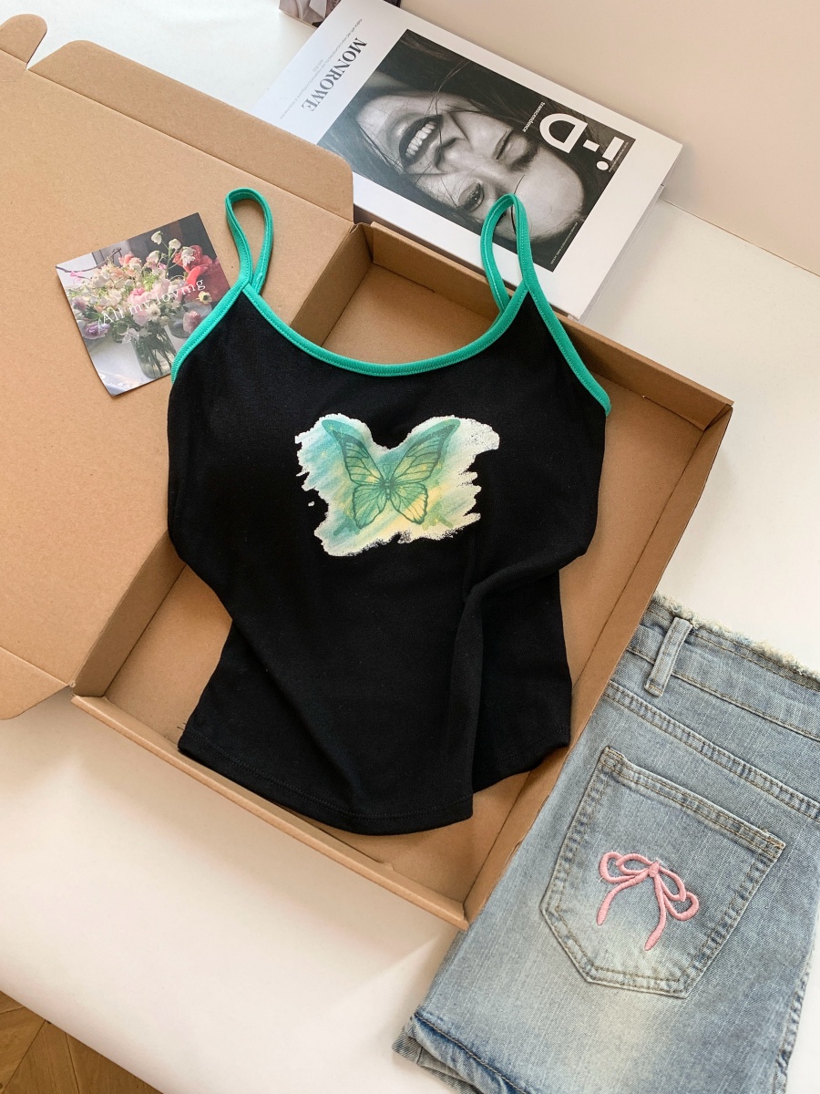 RY3478# 实拍~设计感甜辣妹蝴蝶印花背心女内搭夏季外穿带胸垫短款上衣