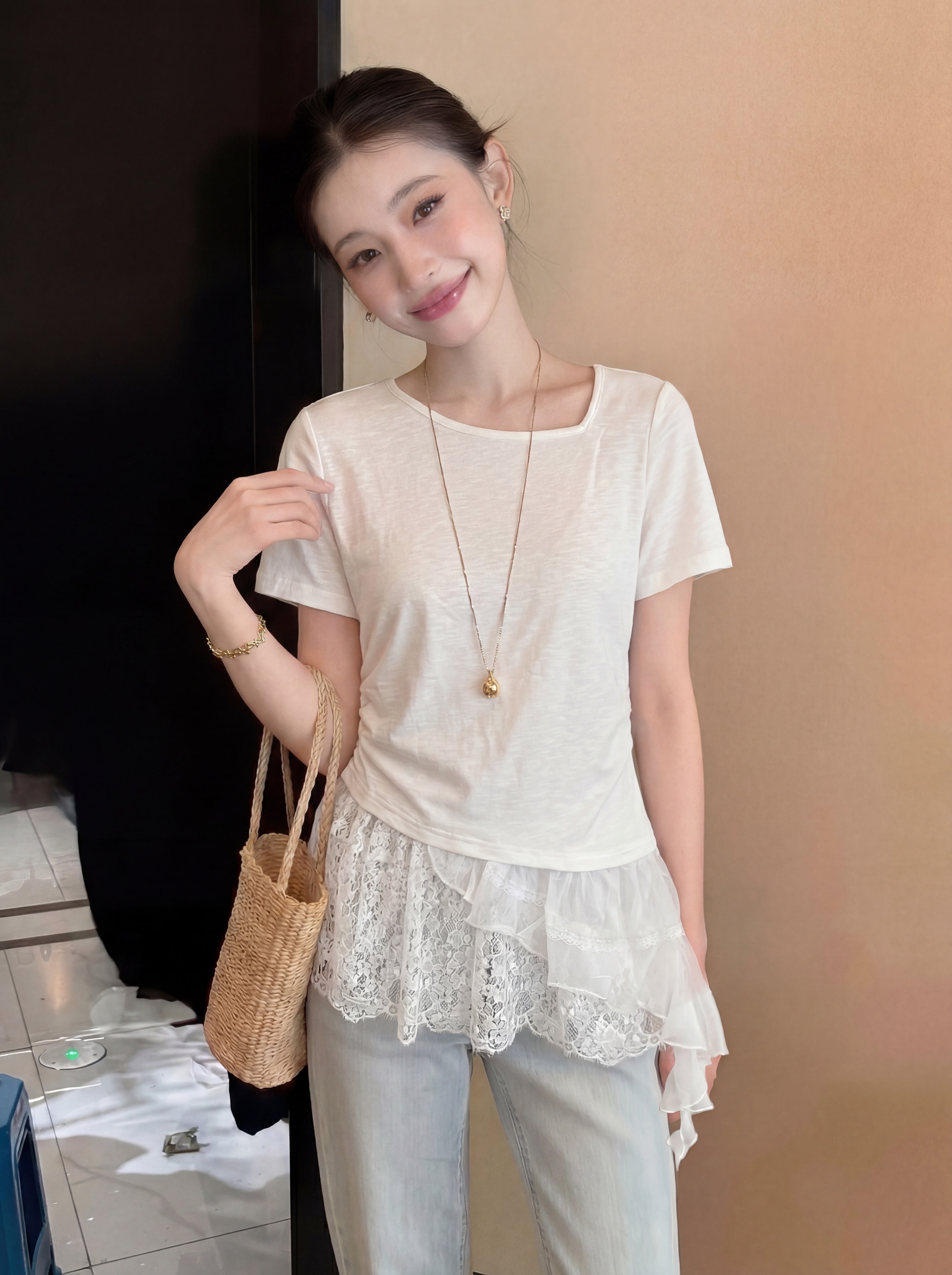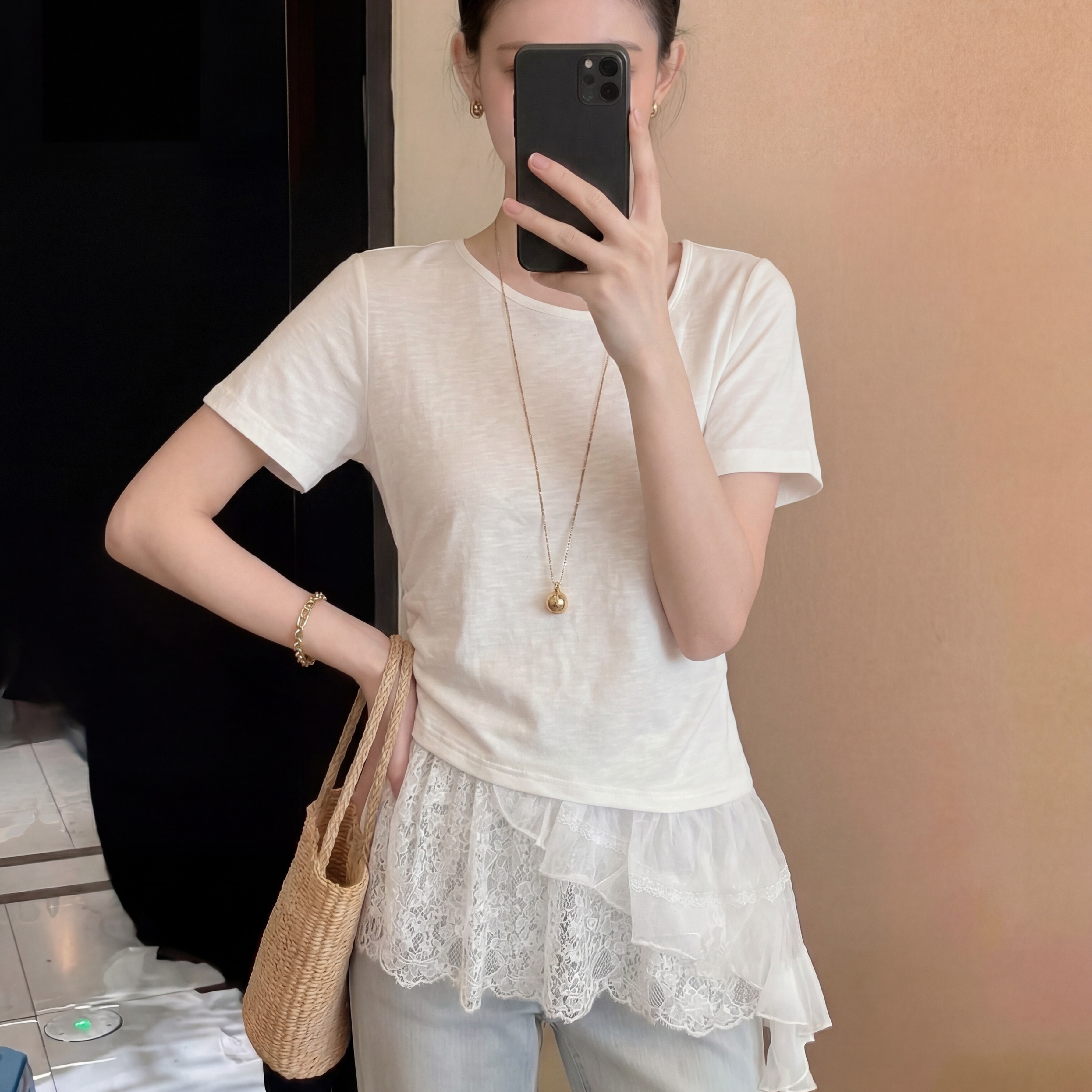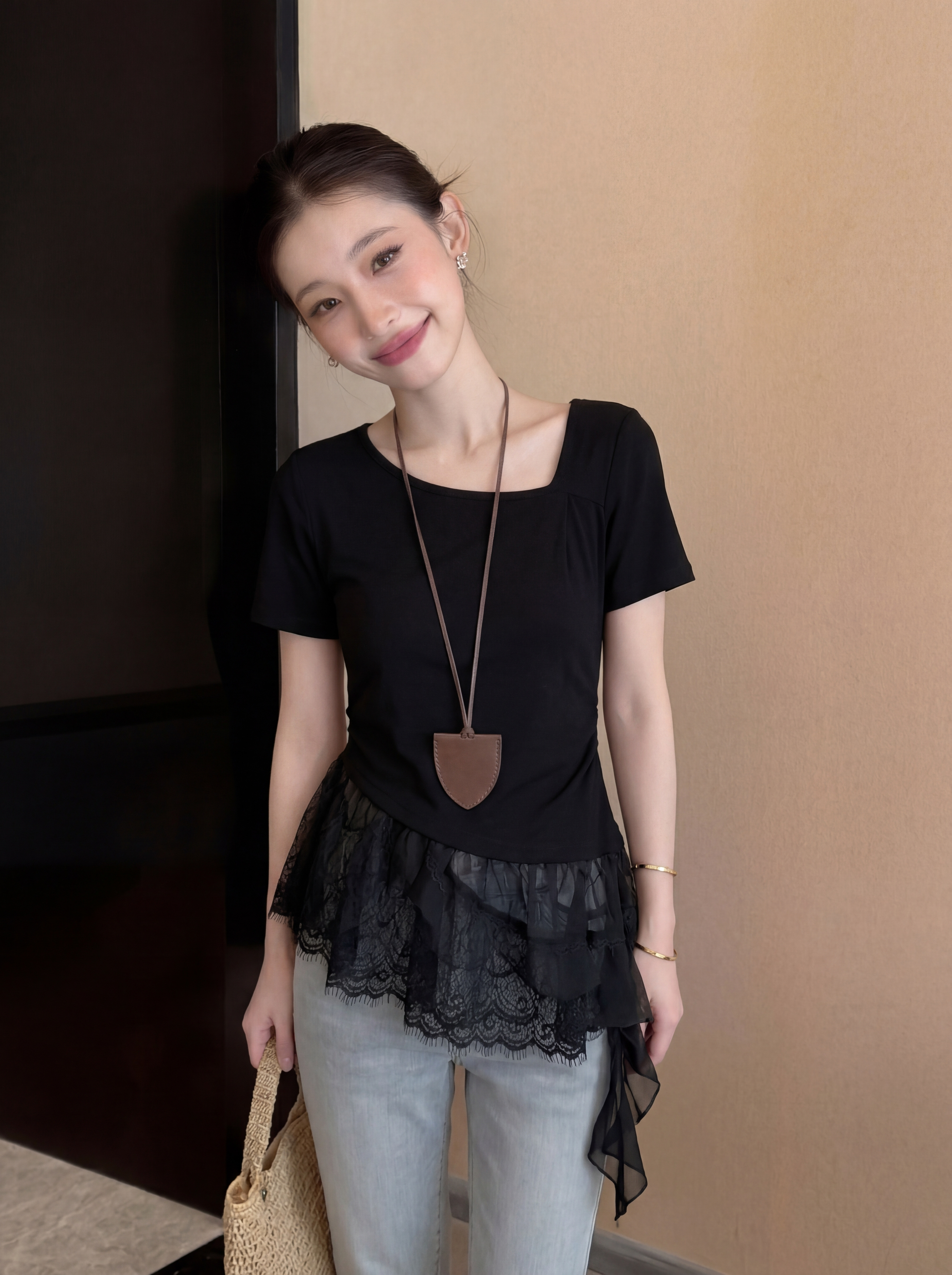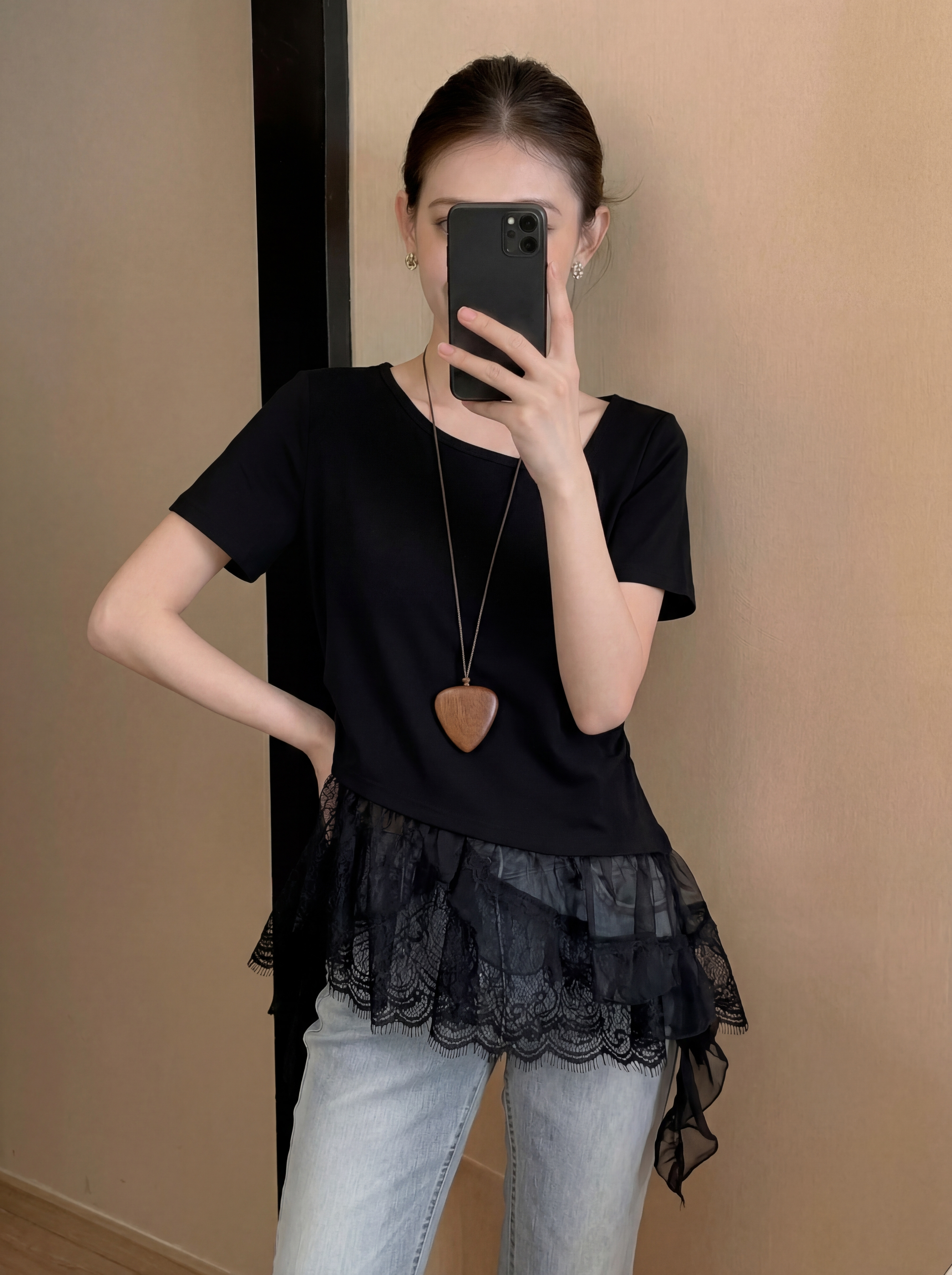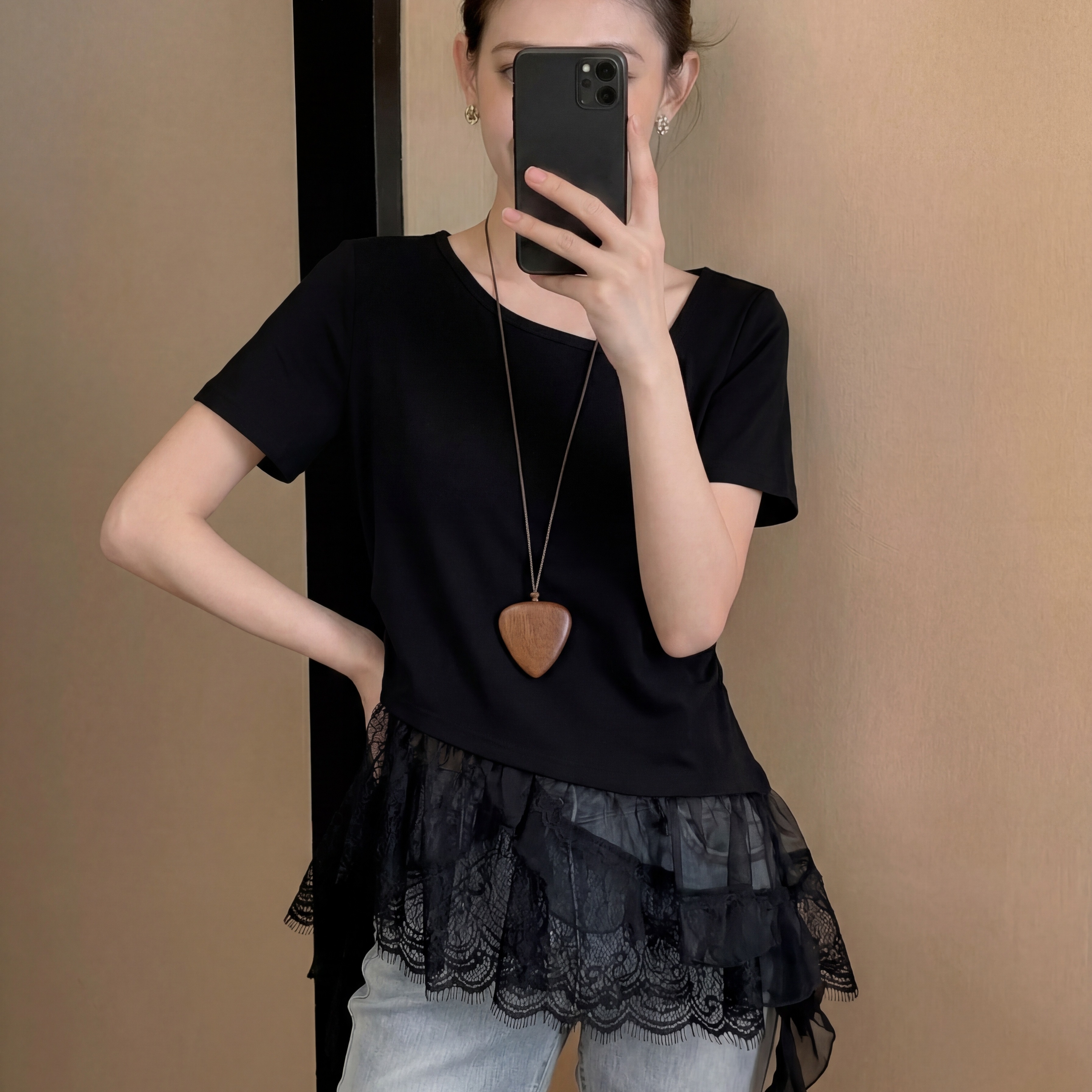 RY3483# 实拍~大码新款设计感胖MM蕾丝下摆不规则拼接上衣显瘦百搭T恤女