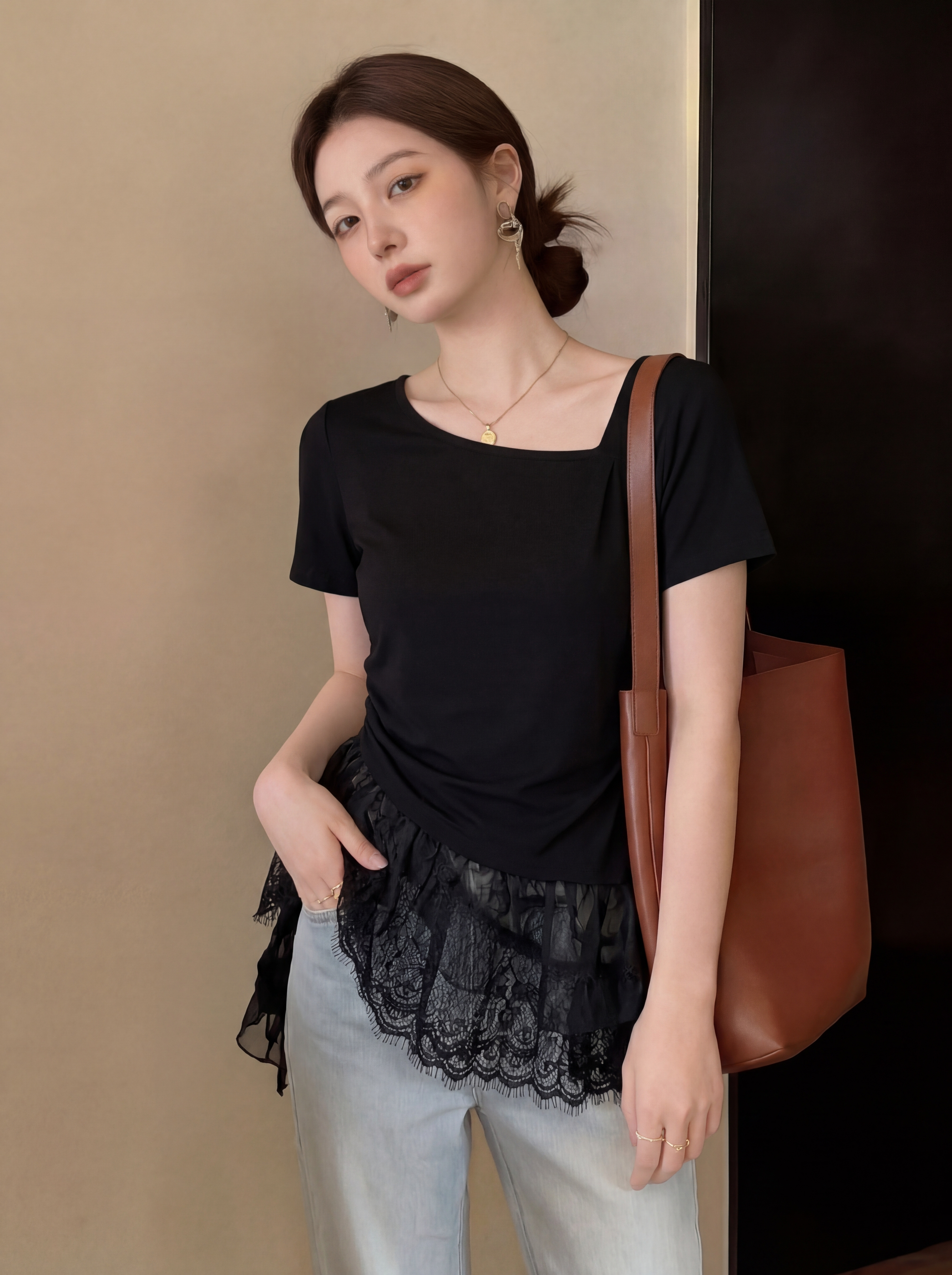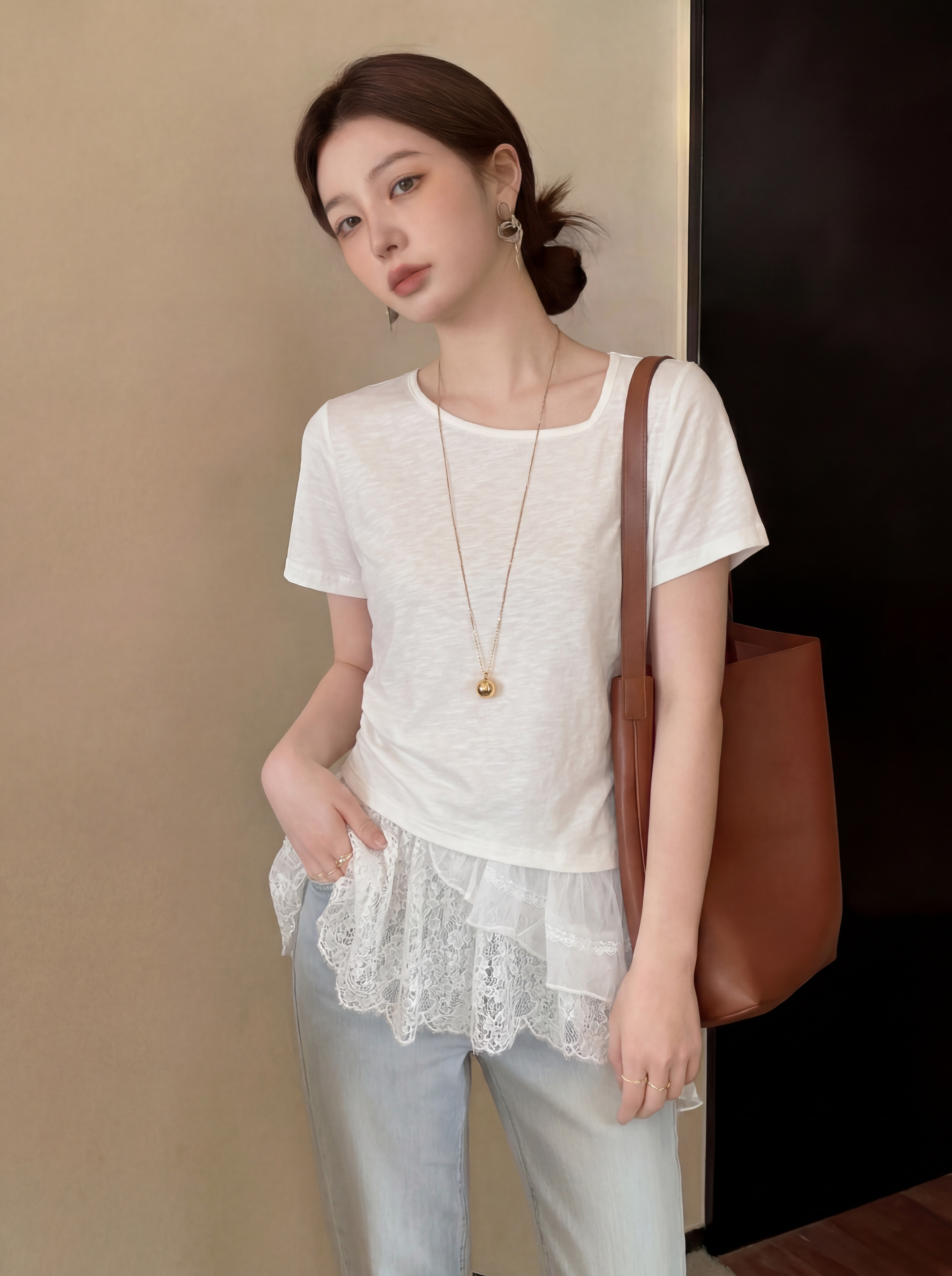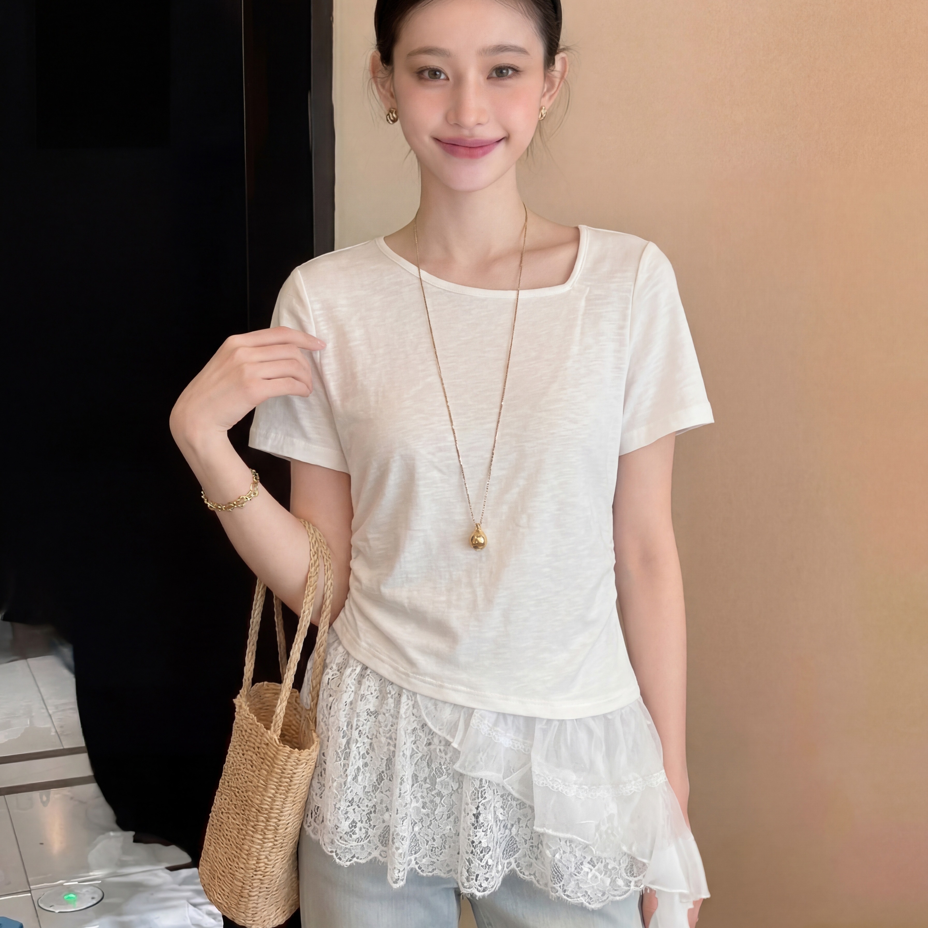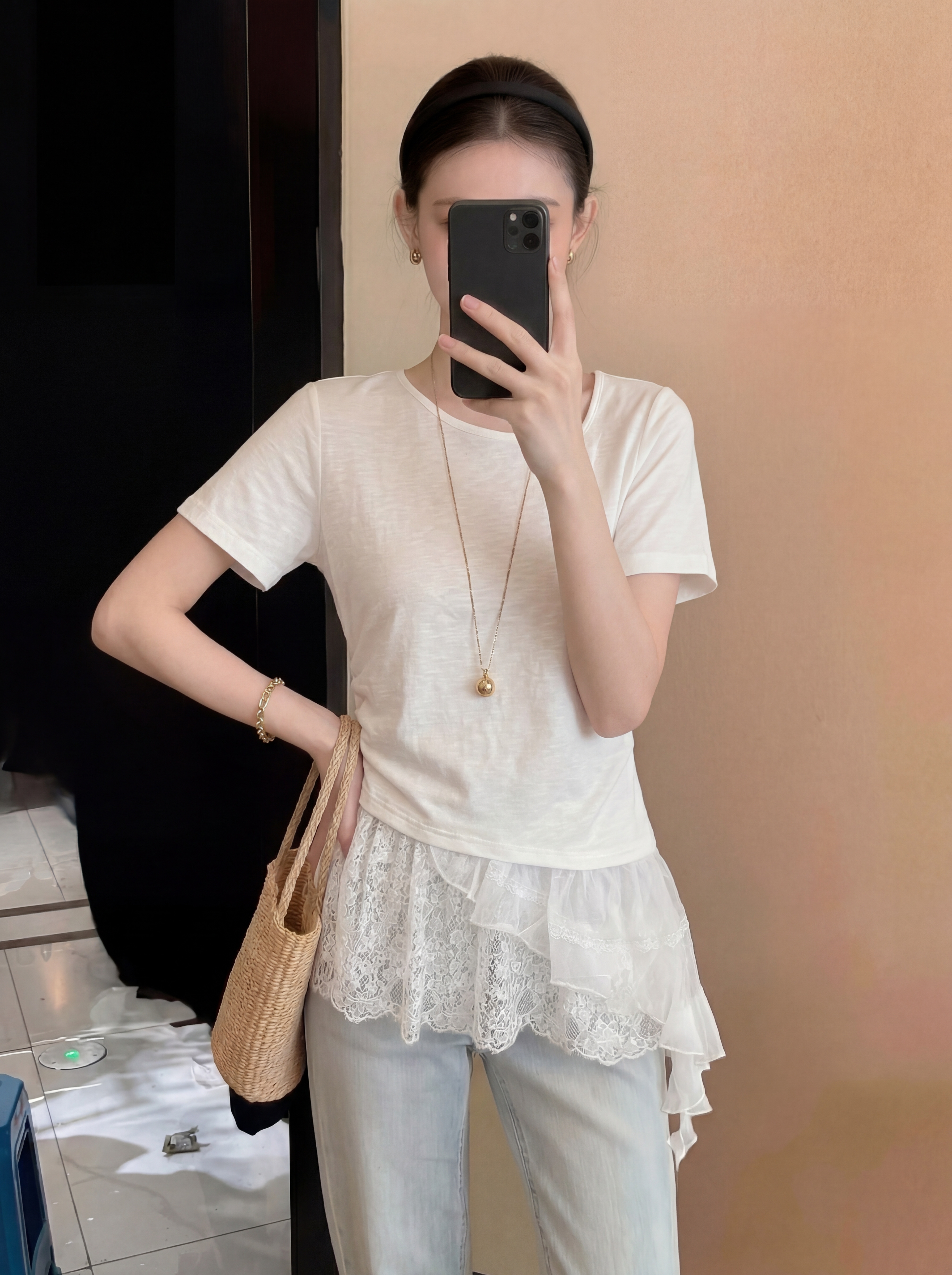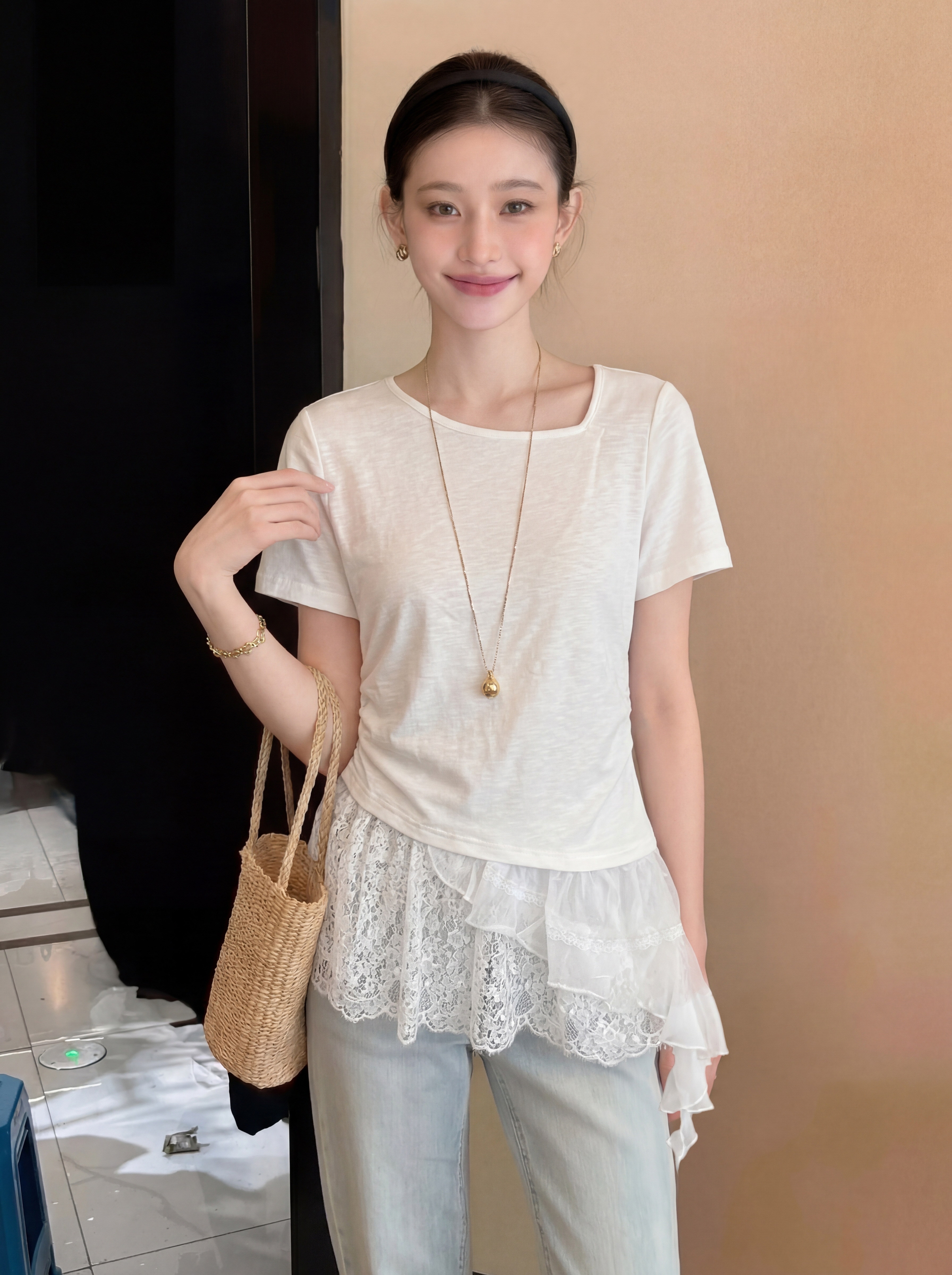 RY3483# 实拍~大码新款设计感胖MM蕾丝下摆不规则拼接上衣显瘦百搭T恤女