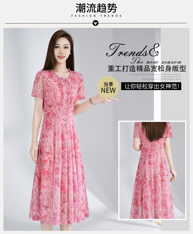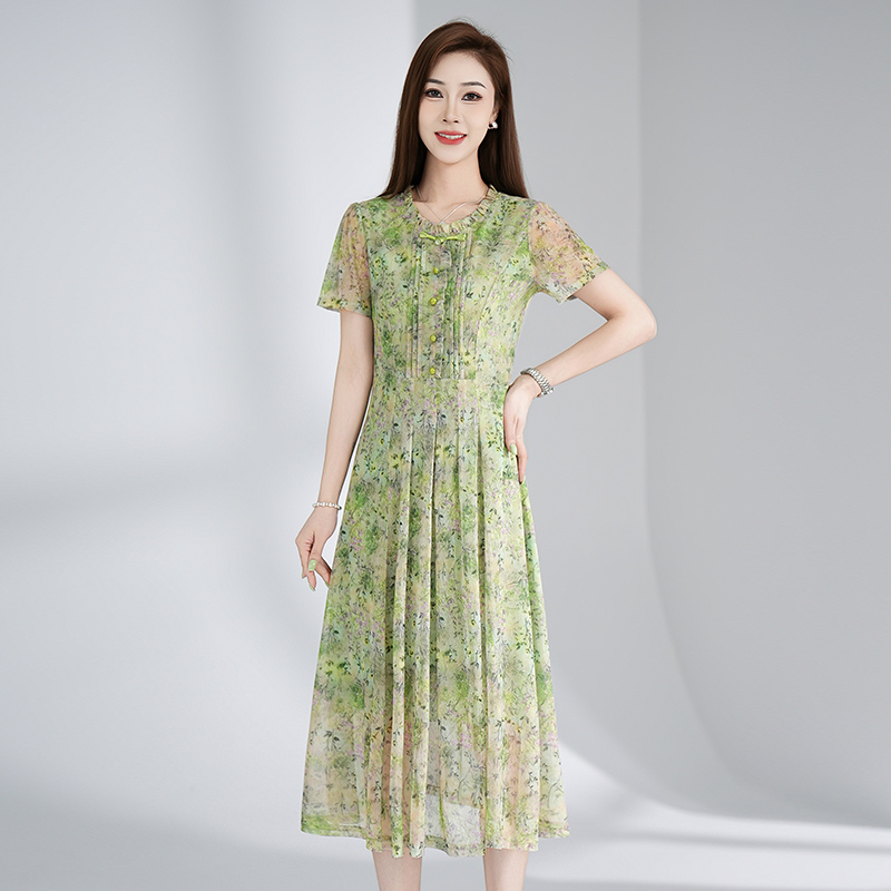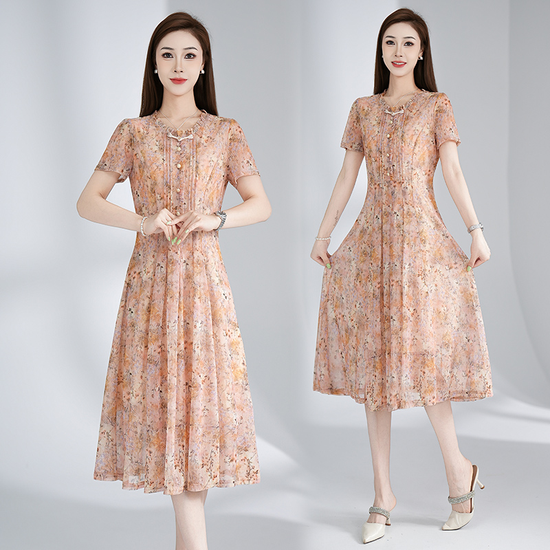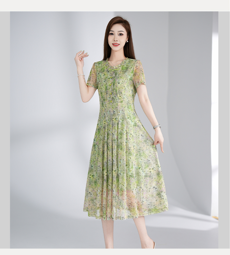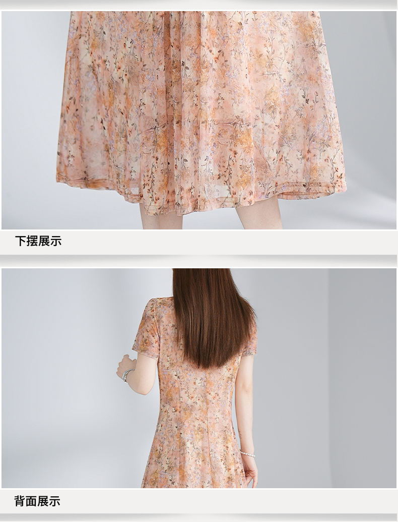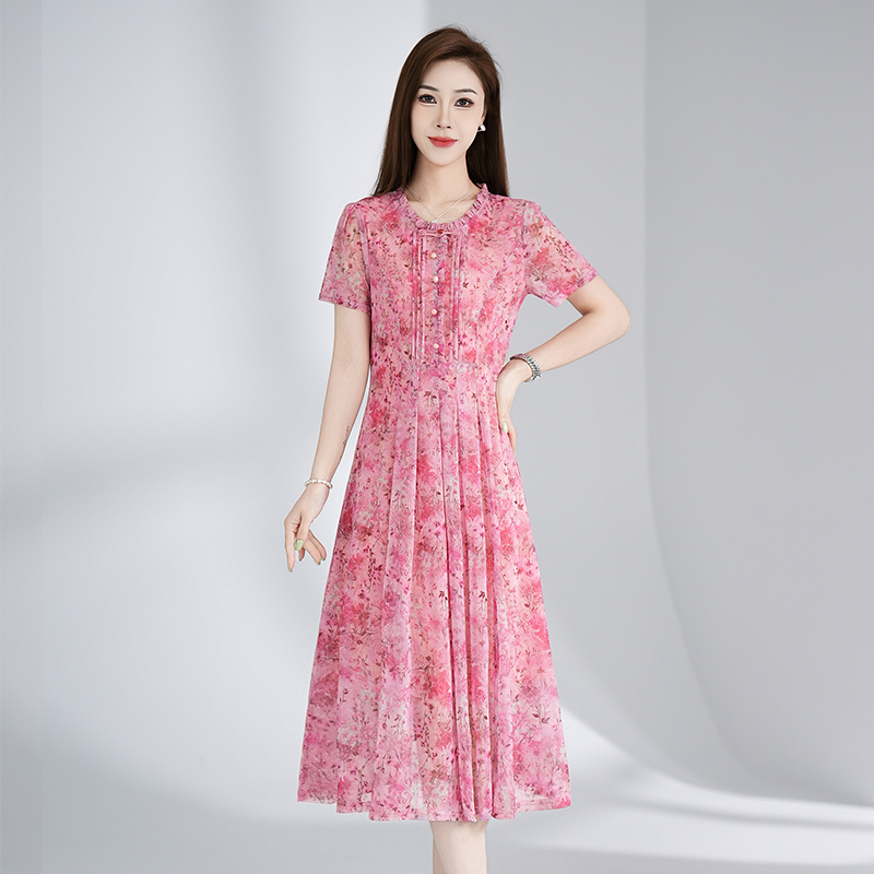 RY3495#夏季新款短袖连衣裙网纱印花裙子收腰显瘦透气